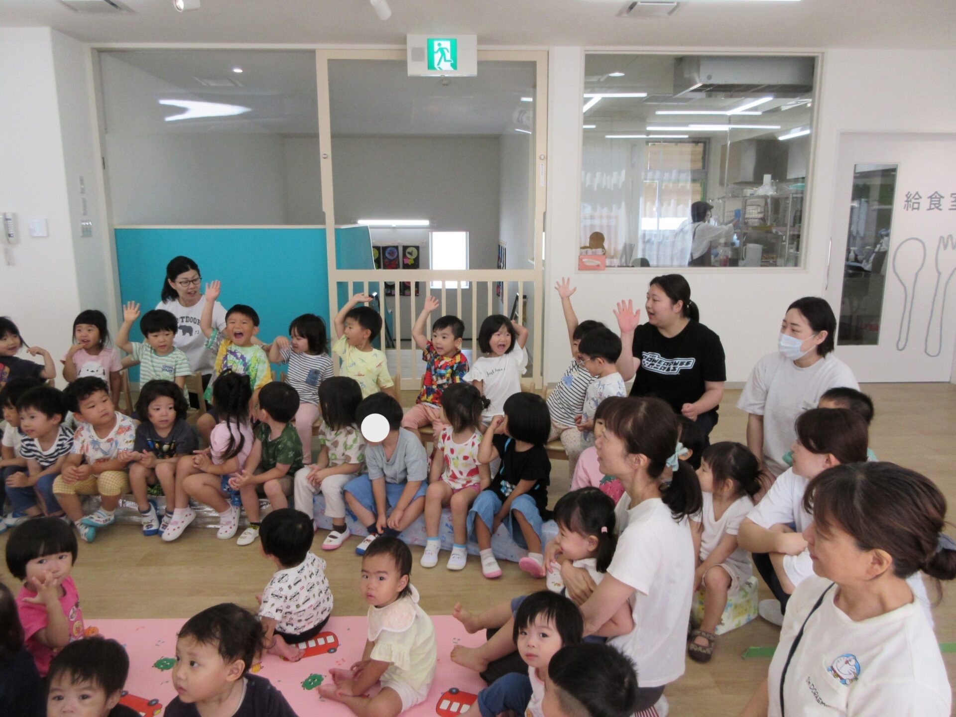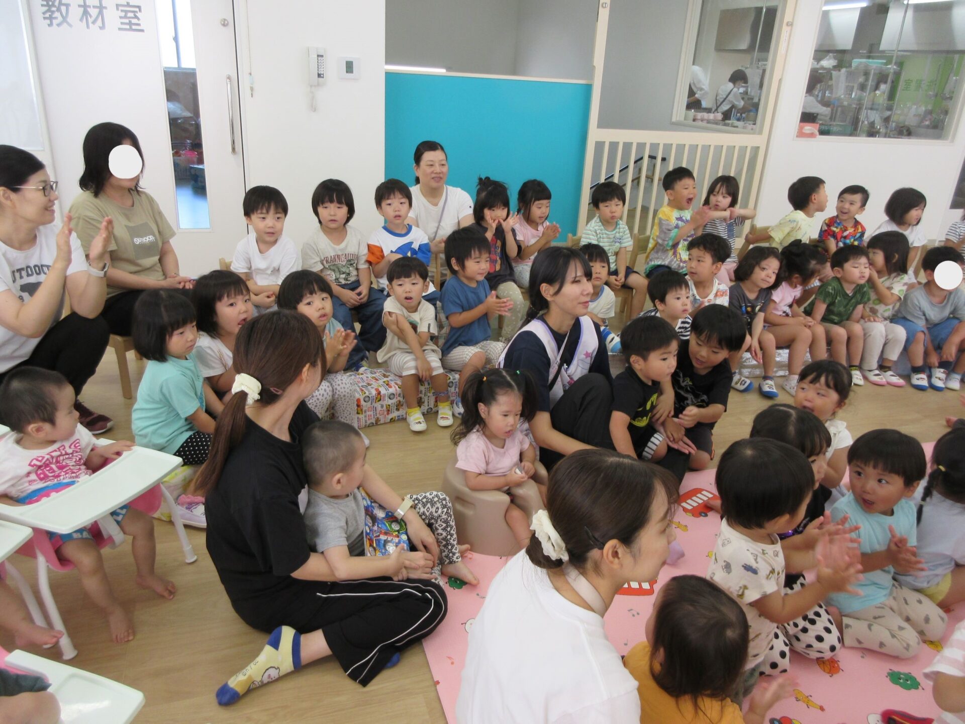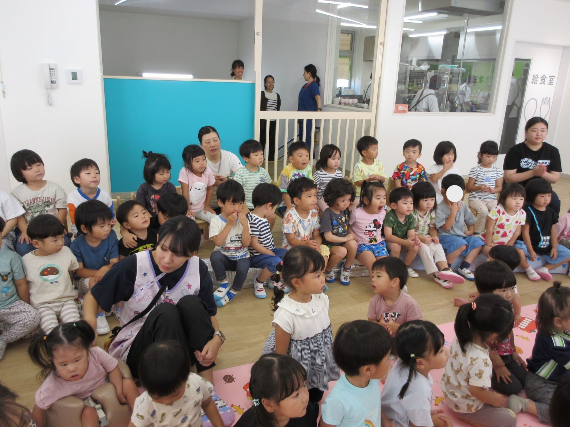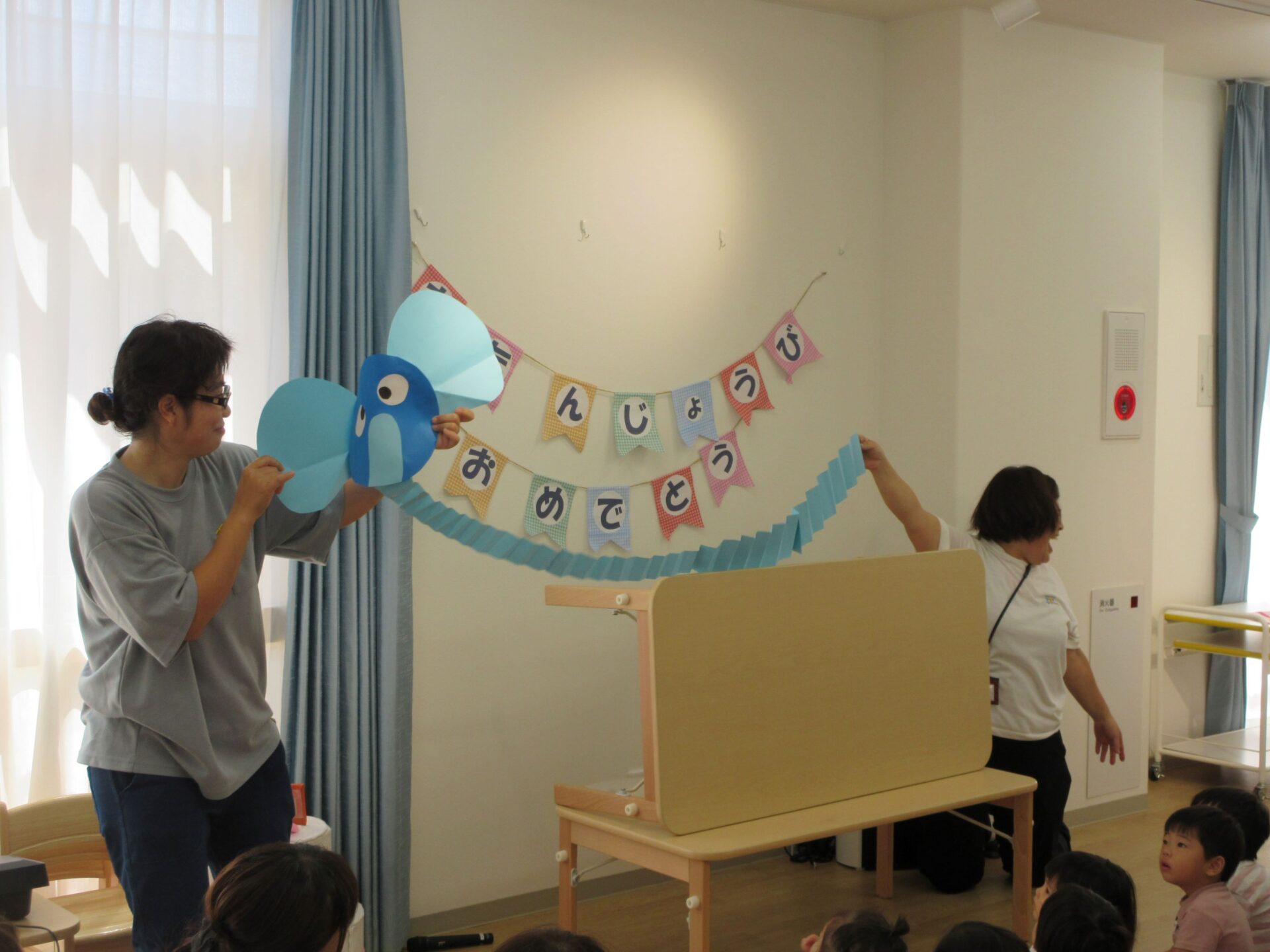 2024.09.04 お知らせ ブログ 8月の誕生会 8月22日(木)2階ランチルームに集まり、誕生会を行いました。 0歳うみ組から4歳そら組までが集まりました。はじめに先生からのお話です。 「今日はどんなお話があるんだろう?」 誕生月のお友だちの紹介です。 うみ組さんも泣いていませんね。 冠をかぶせてもらってから、記念のしおりを受け取ります。 ひとりずつ、インタビューもありました。「好きな食べ物はなにですか?」 誕生日ケーキのろうそくの炎を消しましょう。「フゥー!」 次は、先生の出し物。今月は、ペープサート。 「これは何かな?」「ライオンでした。」 最後は、お鼻のながーいゾウさんでした。 一覧へ戻る
