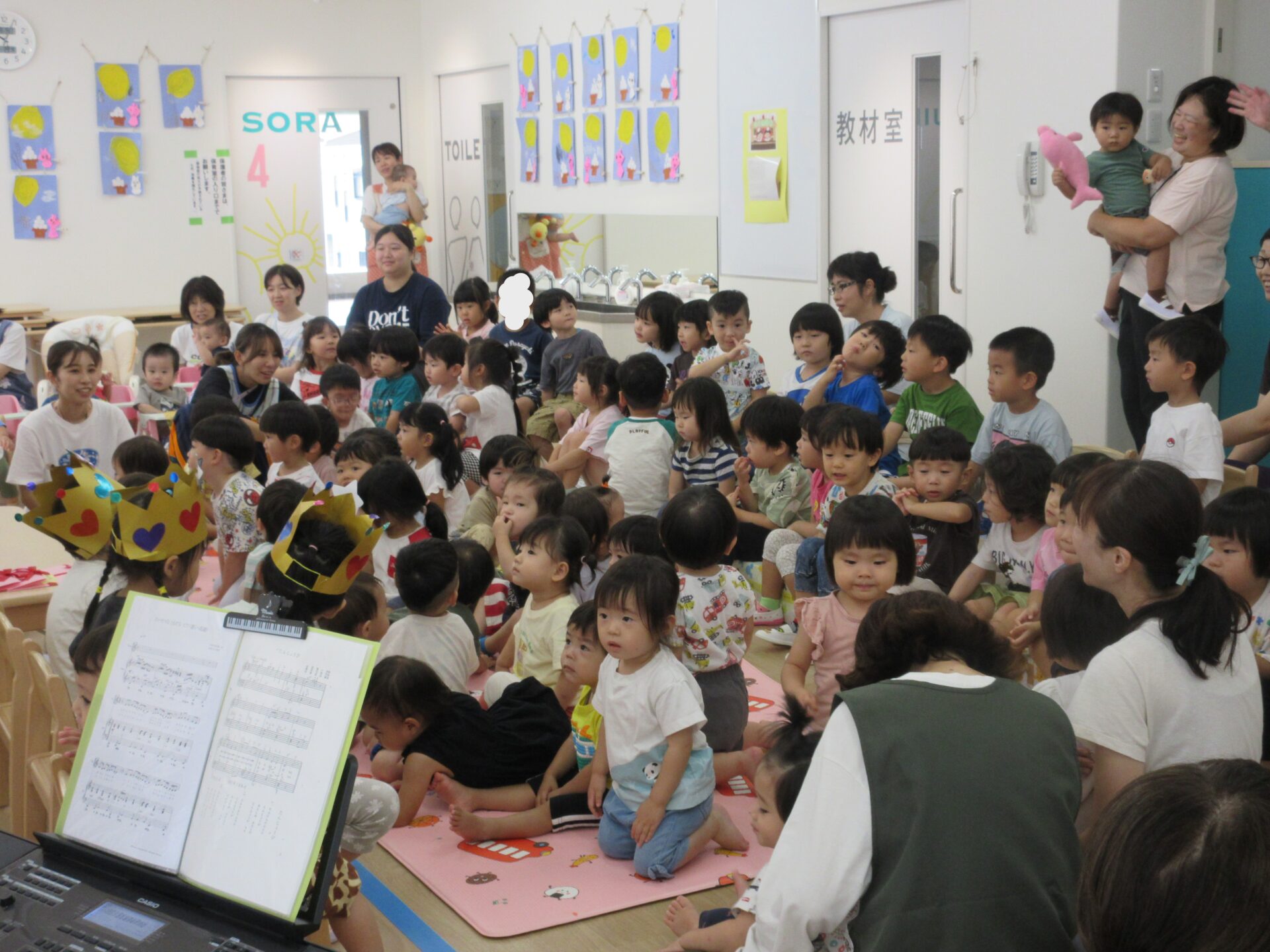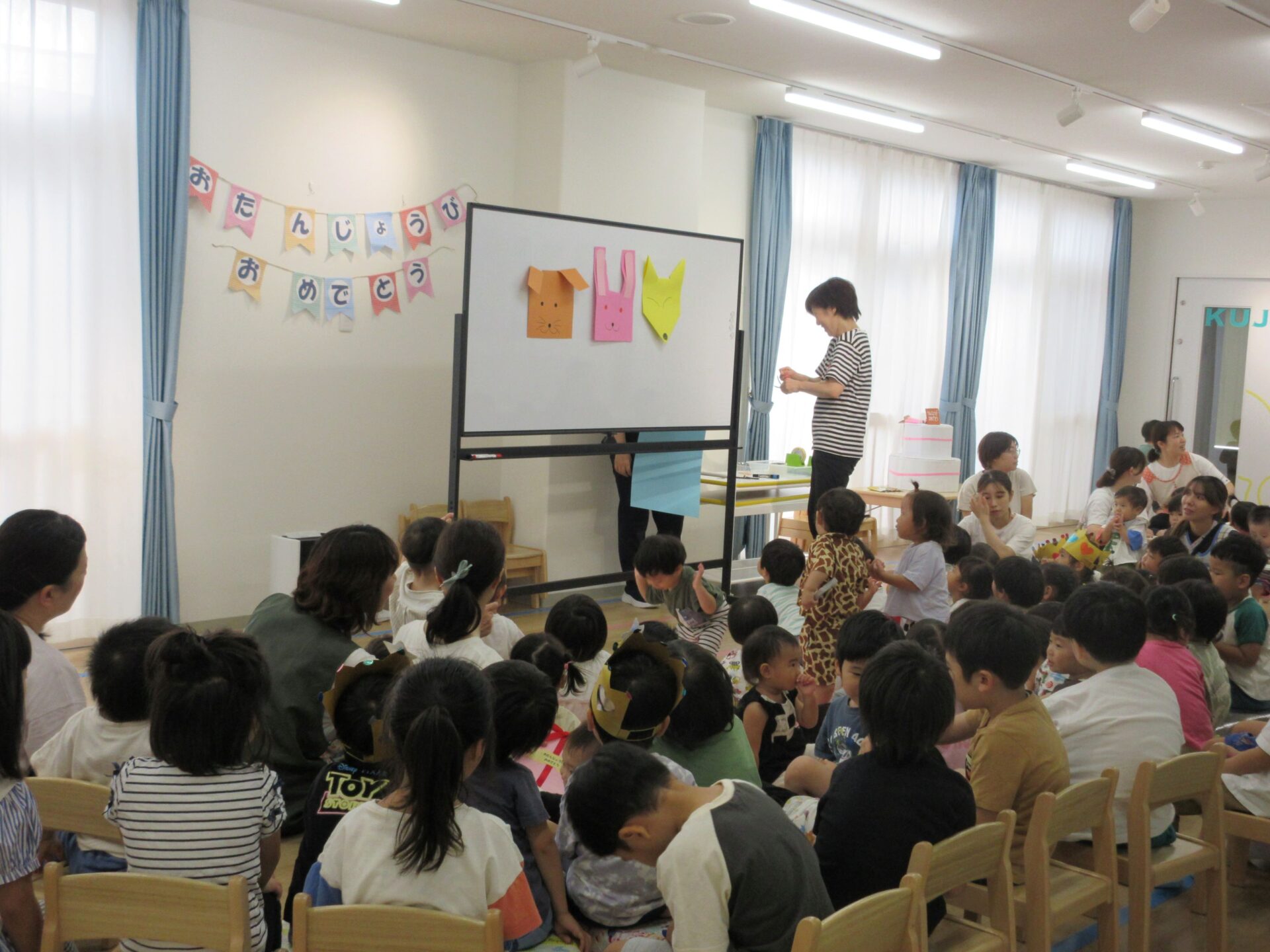 9月19日、全クラスで二階のランチルームに集まり9月のお誕生会をしました。