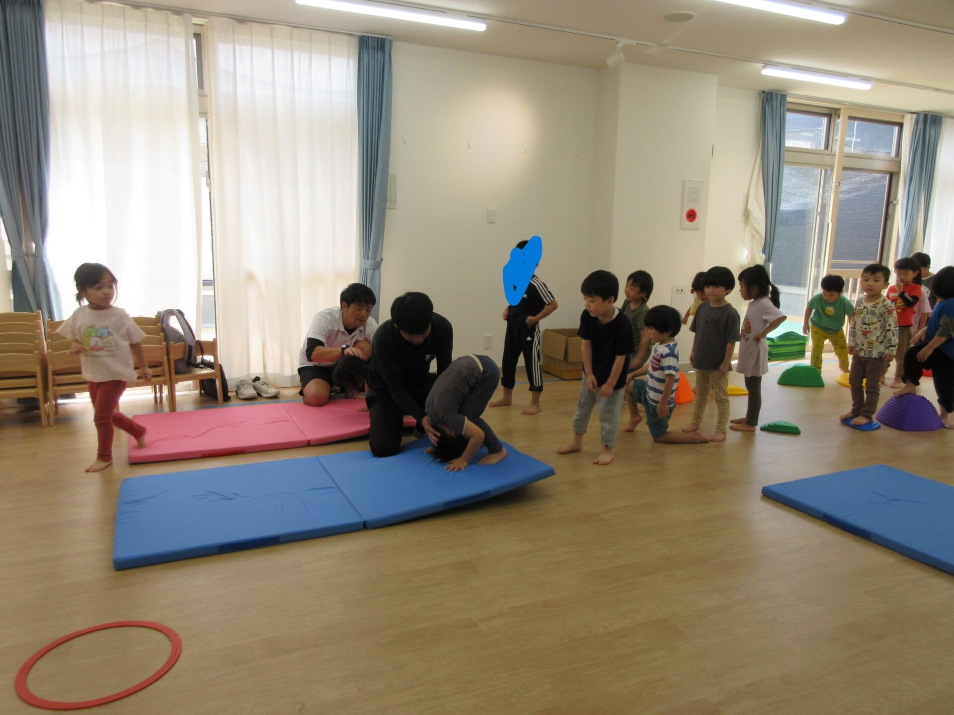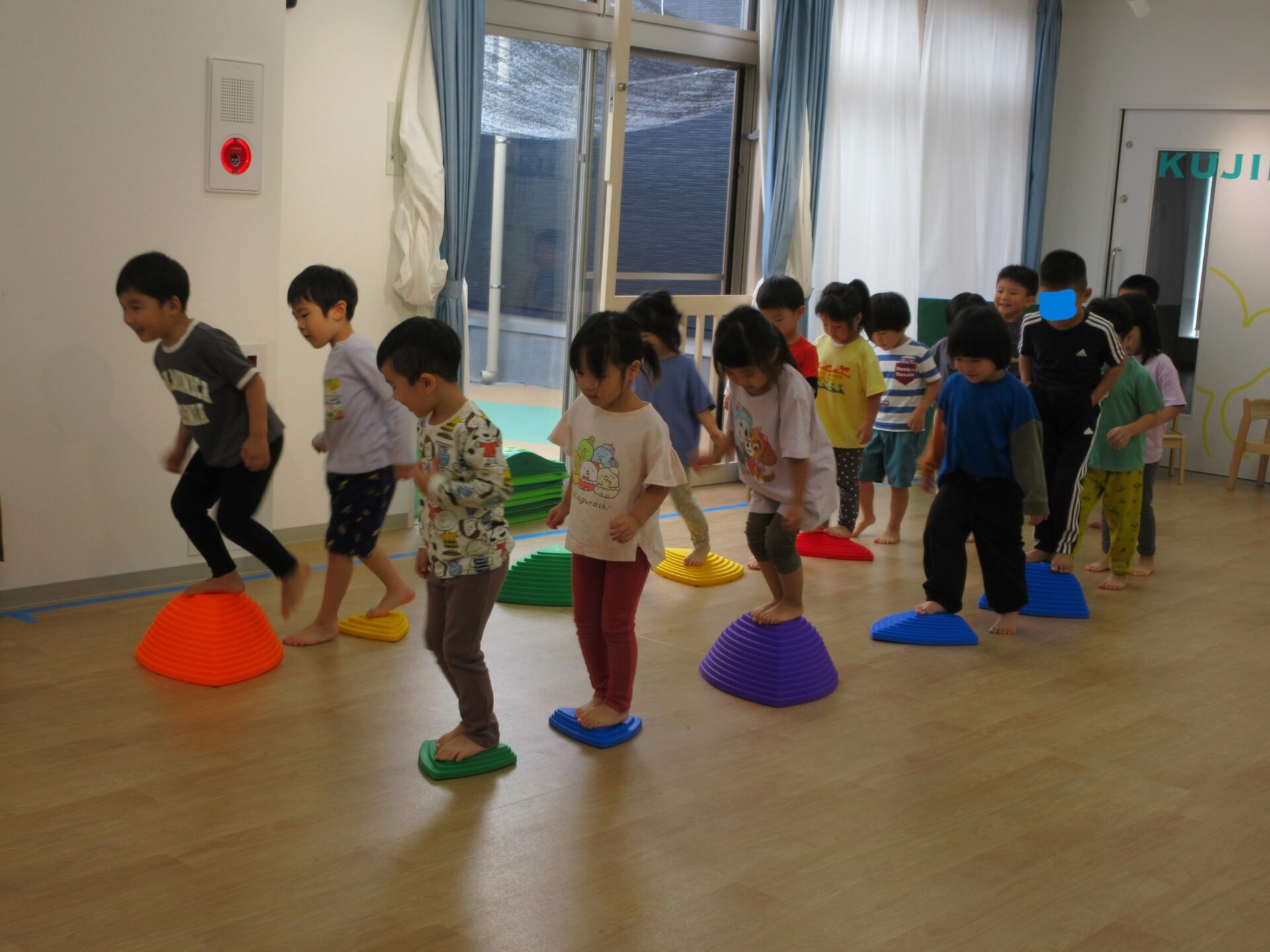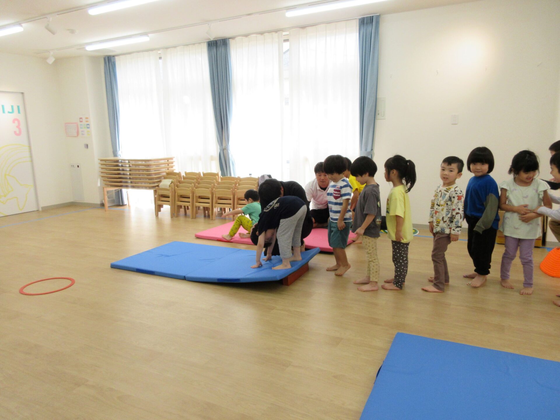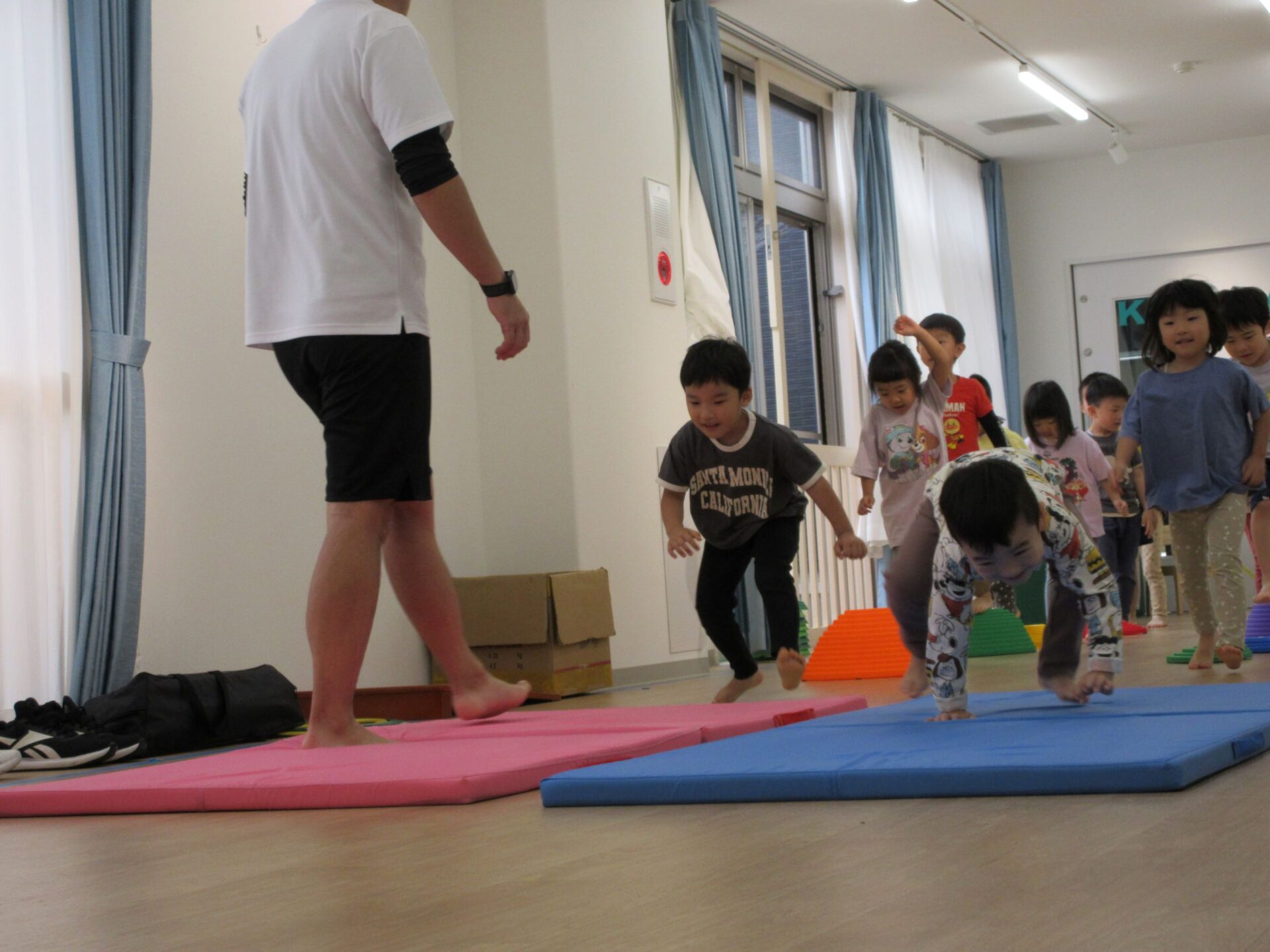 2024.10.15 お知らせ ブログ 運動遊び教室2回目(そら組) 今日はドキドキ二回目の運動遊びです。体操の先生と一緒に体を動かしますよ~。ケンケンしたり、かた足立ちをしまーす。 でこぼこ小山を歩きますよ。楽しいな! 高い山と低い山がありますね。上手にあるけたかな? マットのところで左ケンケンと右ケンケンを交代です。できたかな?ちょっと難しい! ここで前転です。くるり。みんな、上手に回ってました。すごいですね! 今日はこれでおしまいです。また来月をお楽しみに! 一覧へ戻る