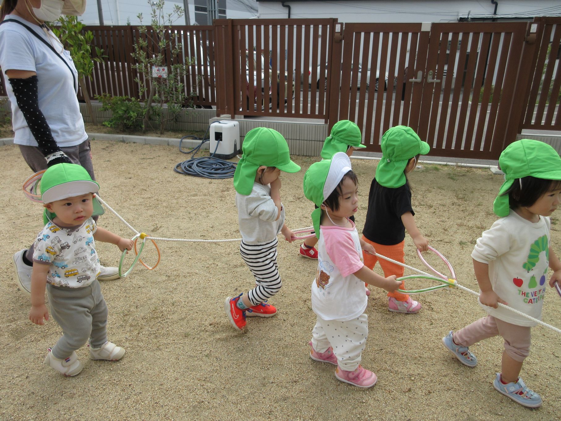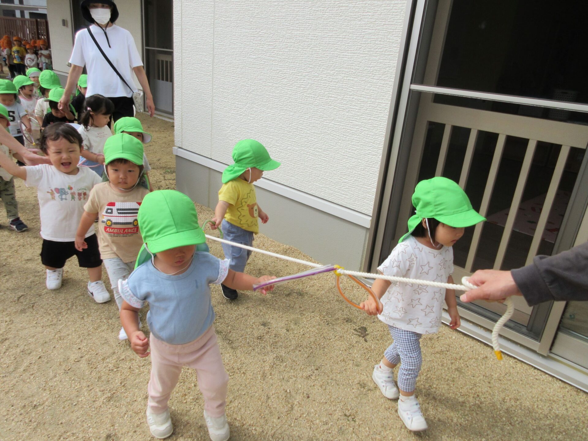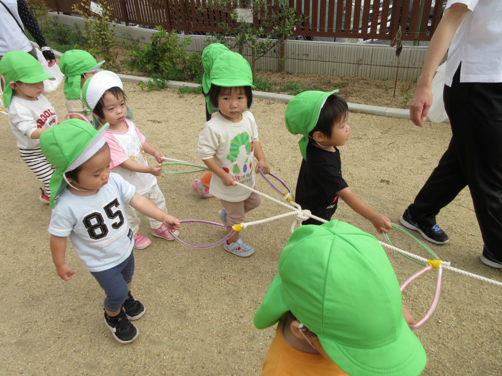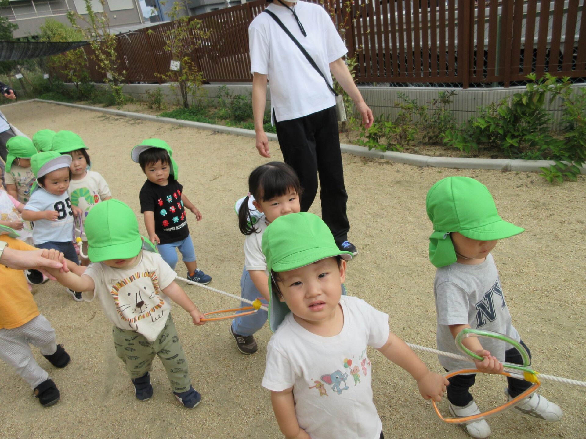 10月15日、だいち組のみんなは園庭でお散歩遠足に向けて歩く練習の真っ最中です!輪っかが付いた長いお散歩ロープを皆で持って歩きますよ。
