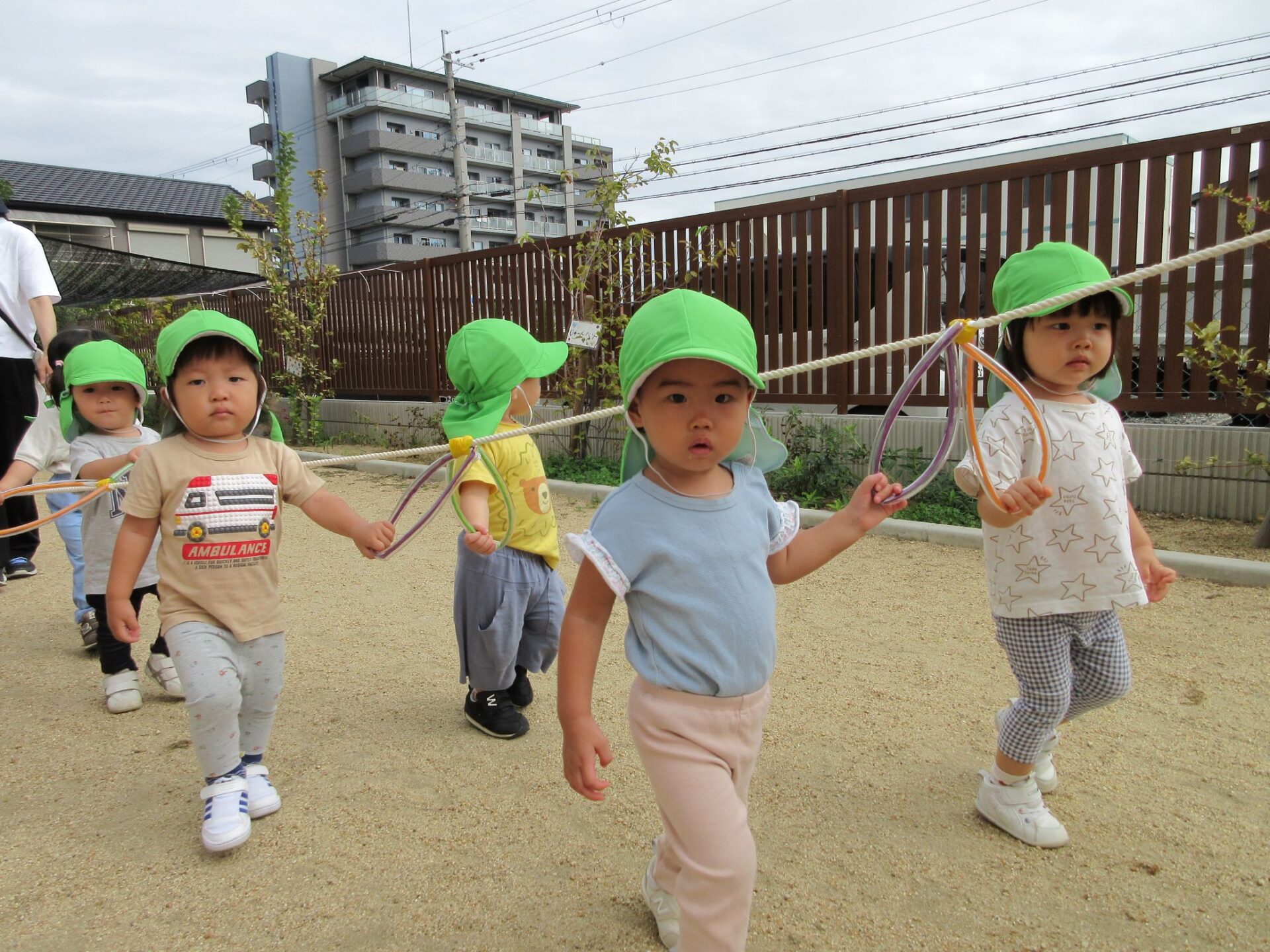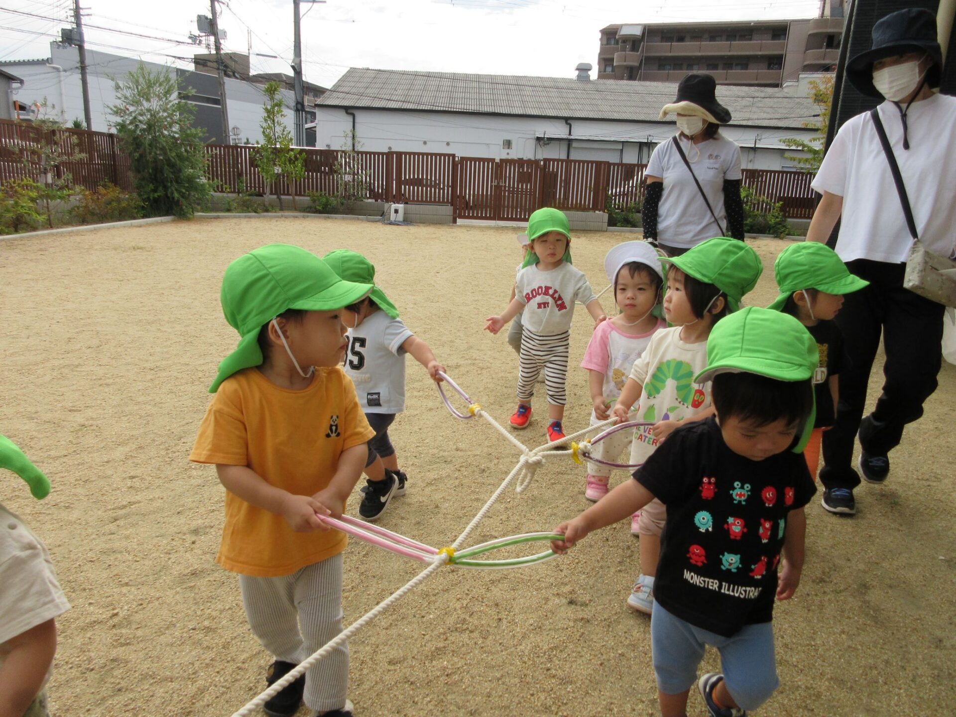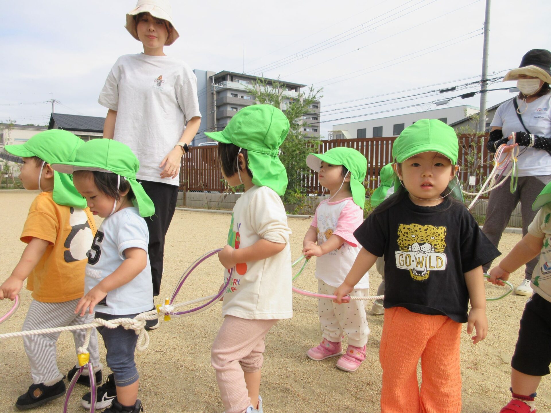 10月15日、だいち組のみんなは園庭でお散歩遠足に向けて歩く練習の真っ最中です!輪っかが付いた長いお散歩ロープを皆で持って歩きますよ。