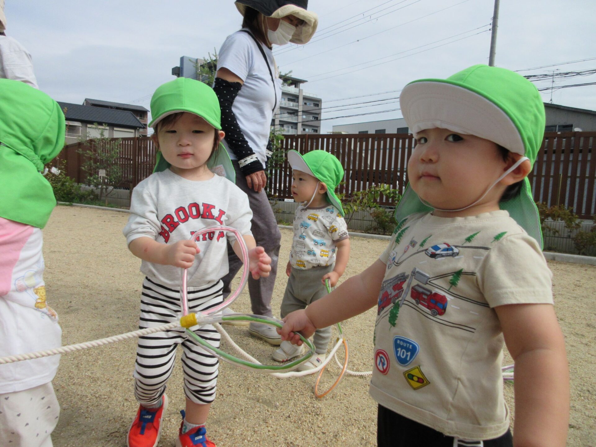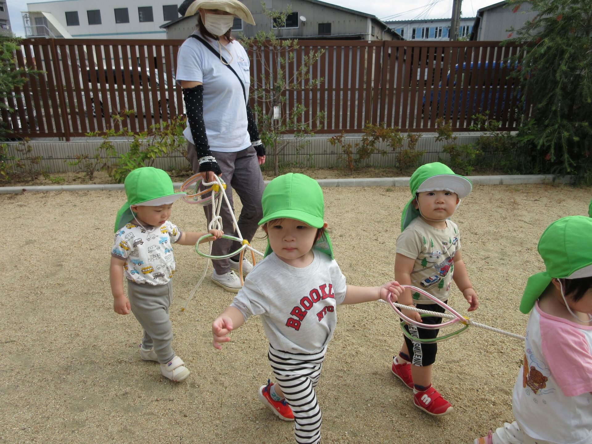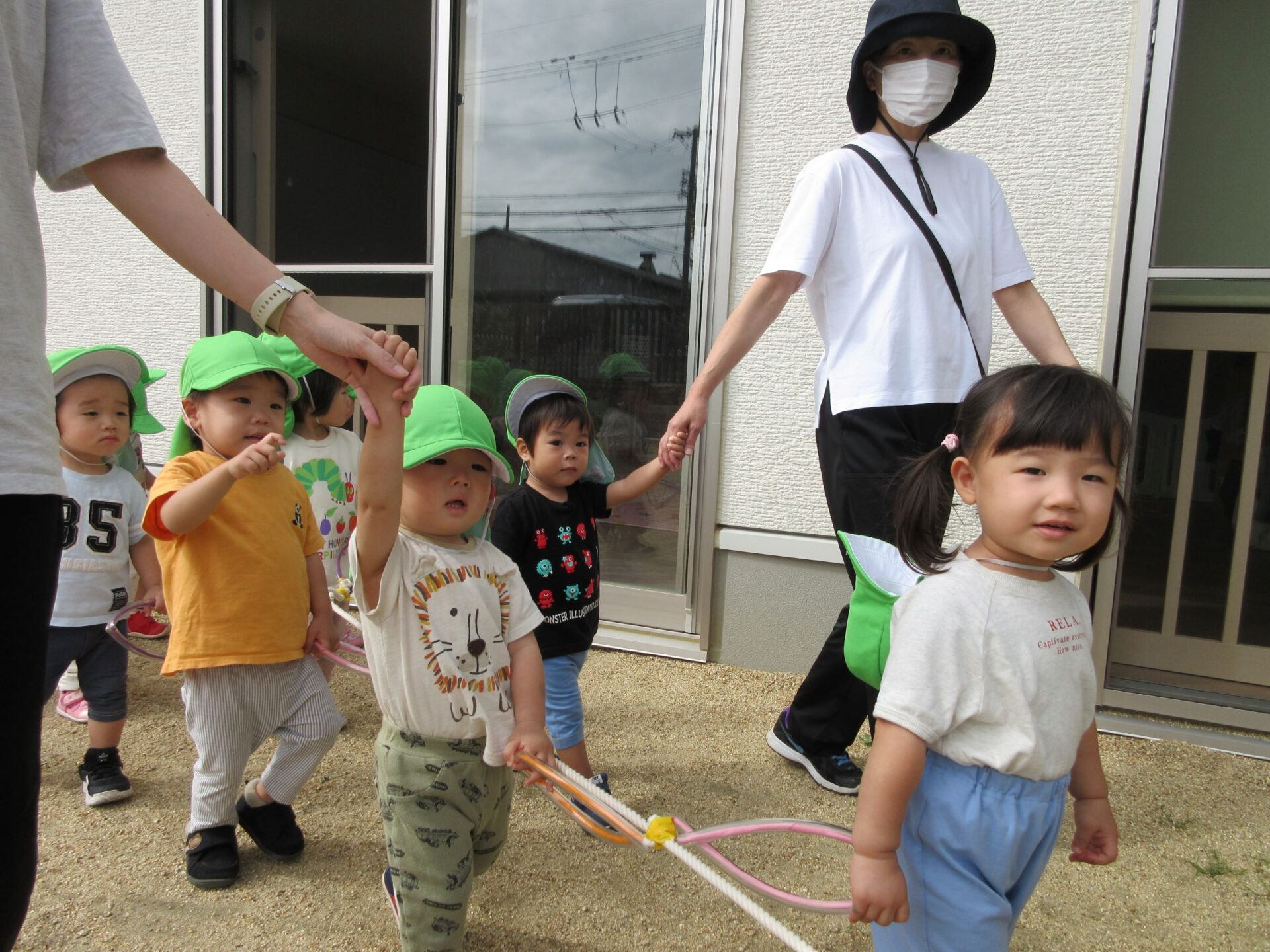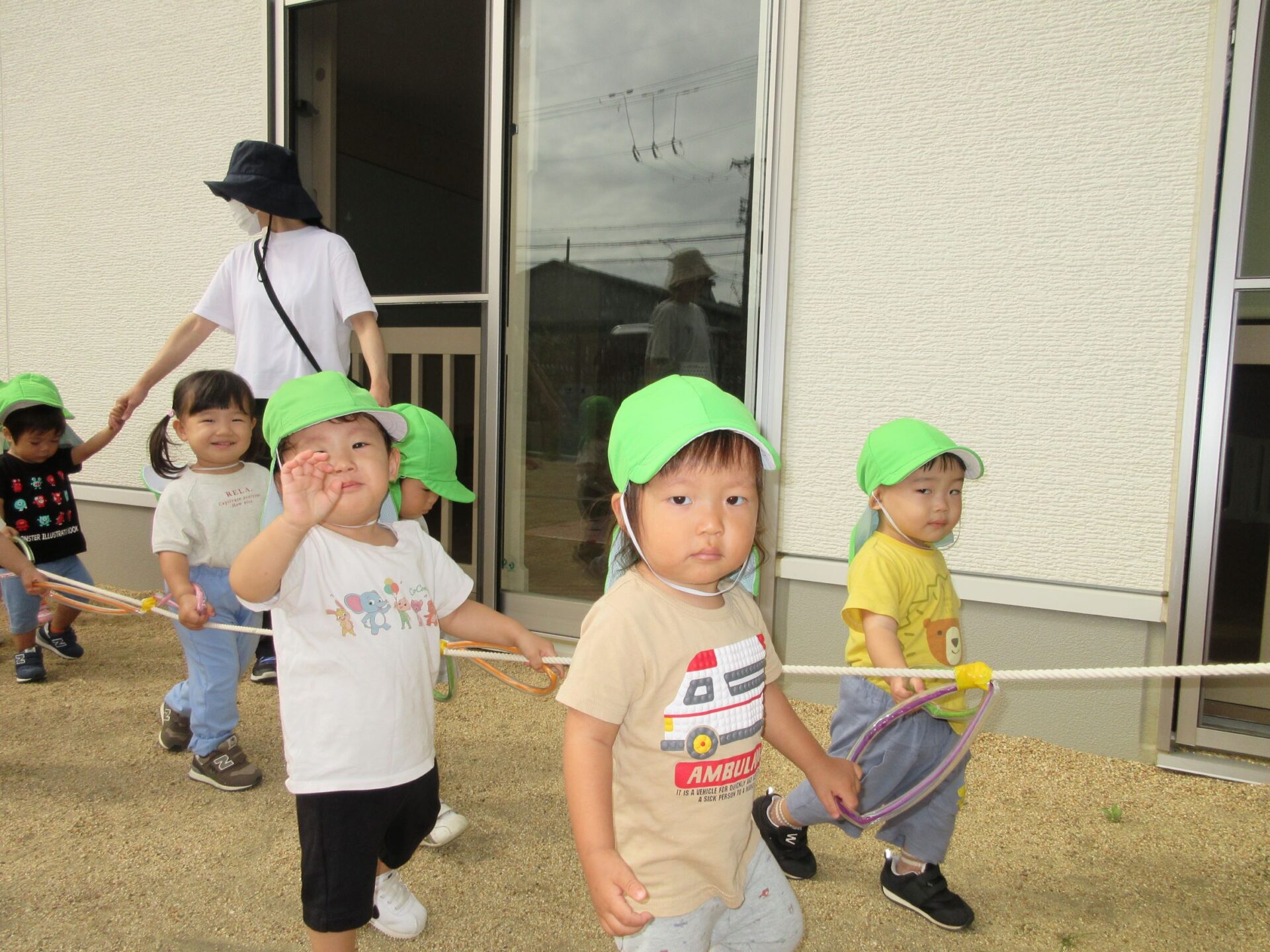 10月15日、だいち組のみんなは園庭でお散歩遠足に向けて歩く練習の真っ最中です!輪っかが付いた長いお散歩ロープを皆で持って歩きますよ。