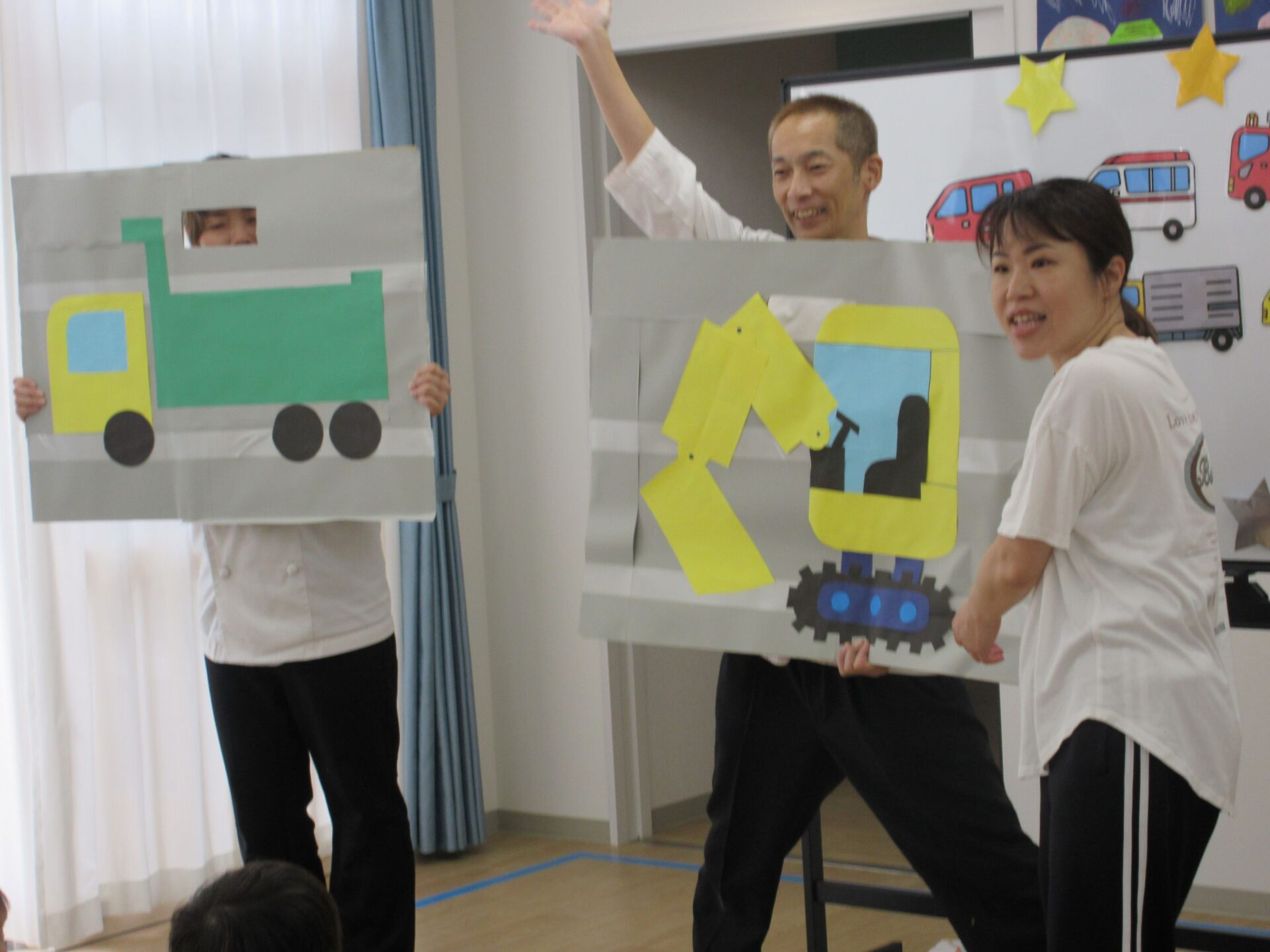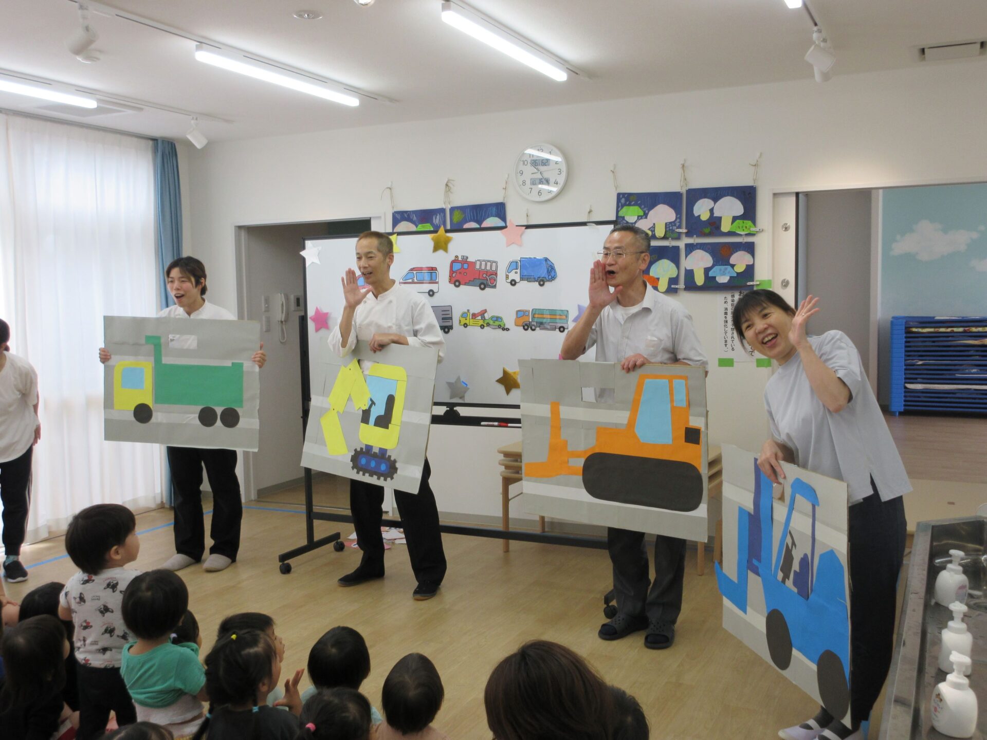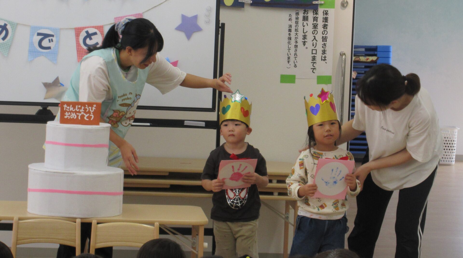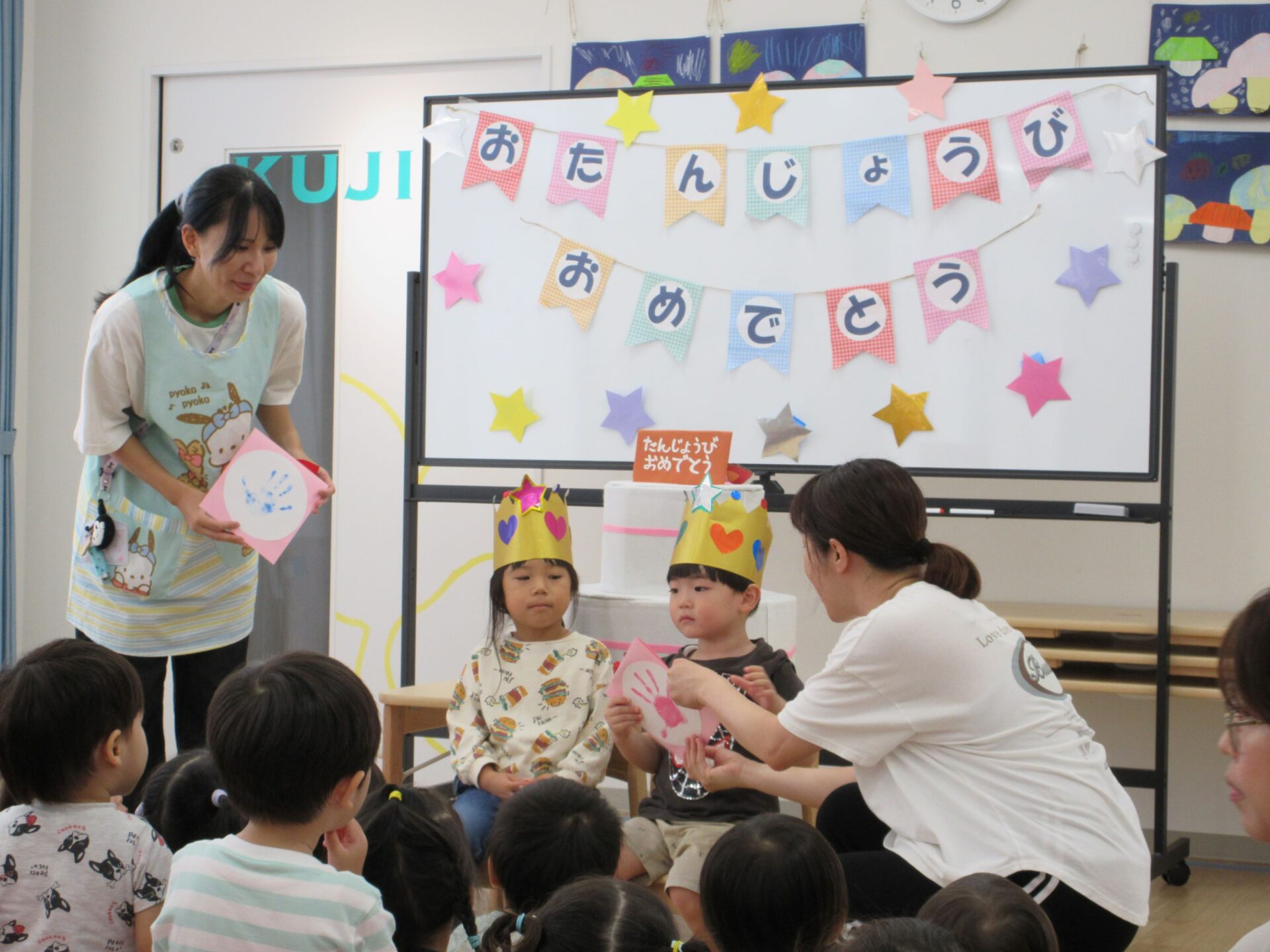 2024.10.17 お知らせ ブログ 10月の誕生会🎂 10/16(水)10月生まれのお友だちの誕生会がありました。10月は3名のお友だちが誕生日を迎えます✨(1名欠席) みんなの前に出て少しドキドキしたけれど、インタビューにもこたえられましたよ! おたんじょうびおめでとうございます!! 「はたらくくるま」のペープサートがはじまりました🚙色々な車が次々に出てきます♪ みんなも音楽に合わせてノリノリです♪ 大きい車も出てきましたよ!こちらもノリノリです♪ お顔が少し見えます!誰が運転していたのかな??みんなにクイズです。 給食の先生も出てきました!!お名前分かったかな!? 「10月生まれのみんな!おたんじょうびおめでとう!!」 一覧へ戻る