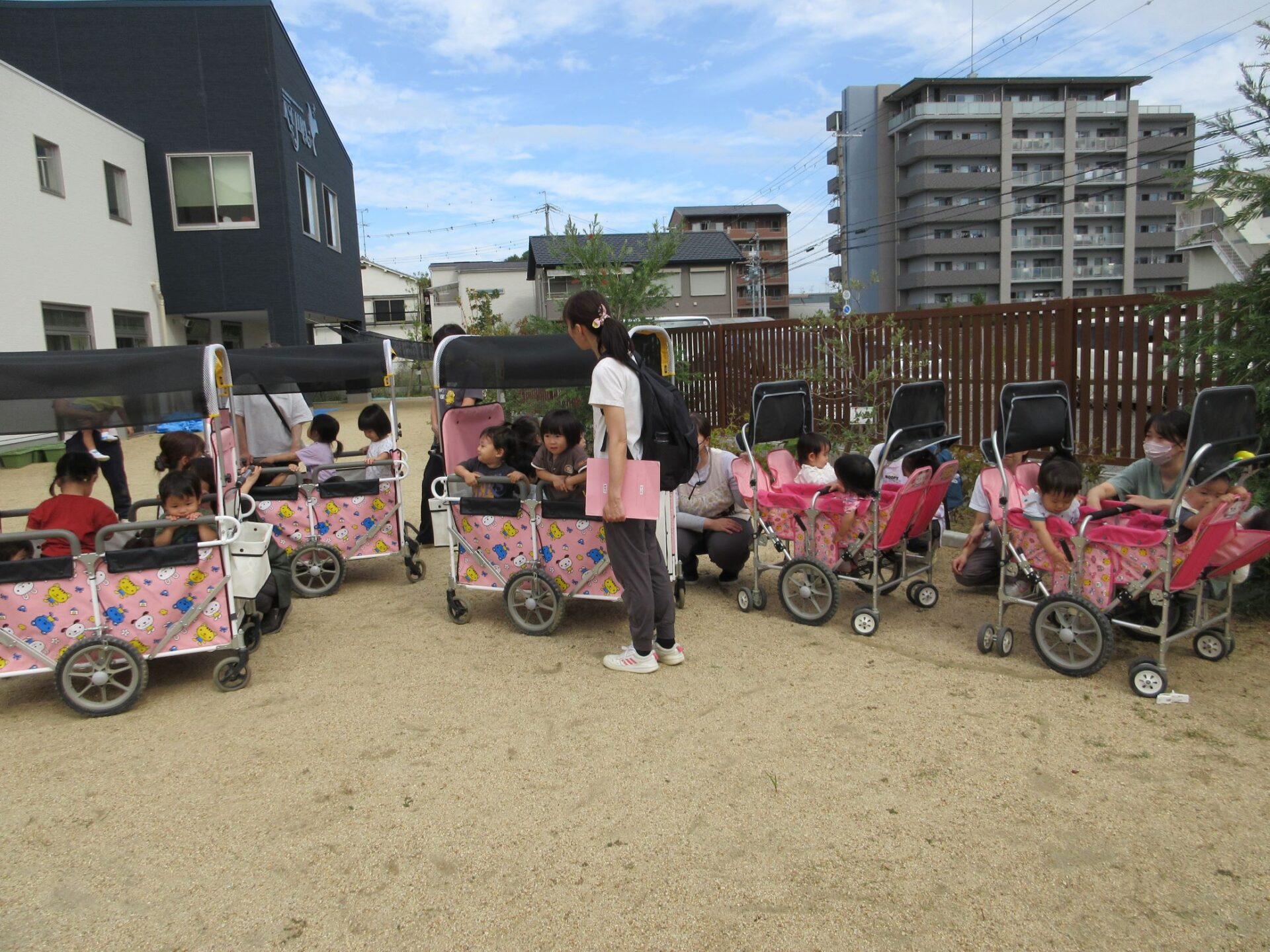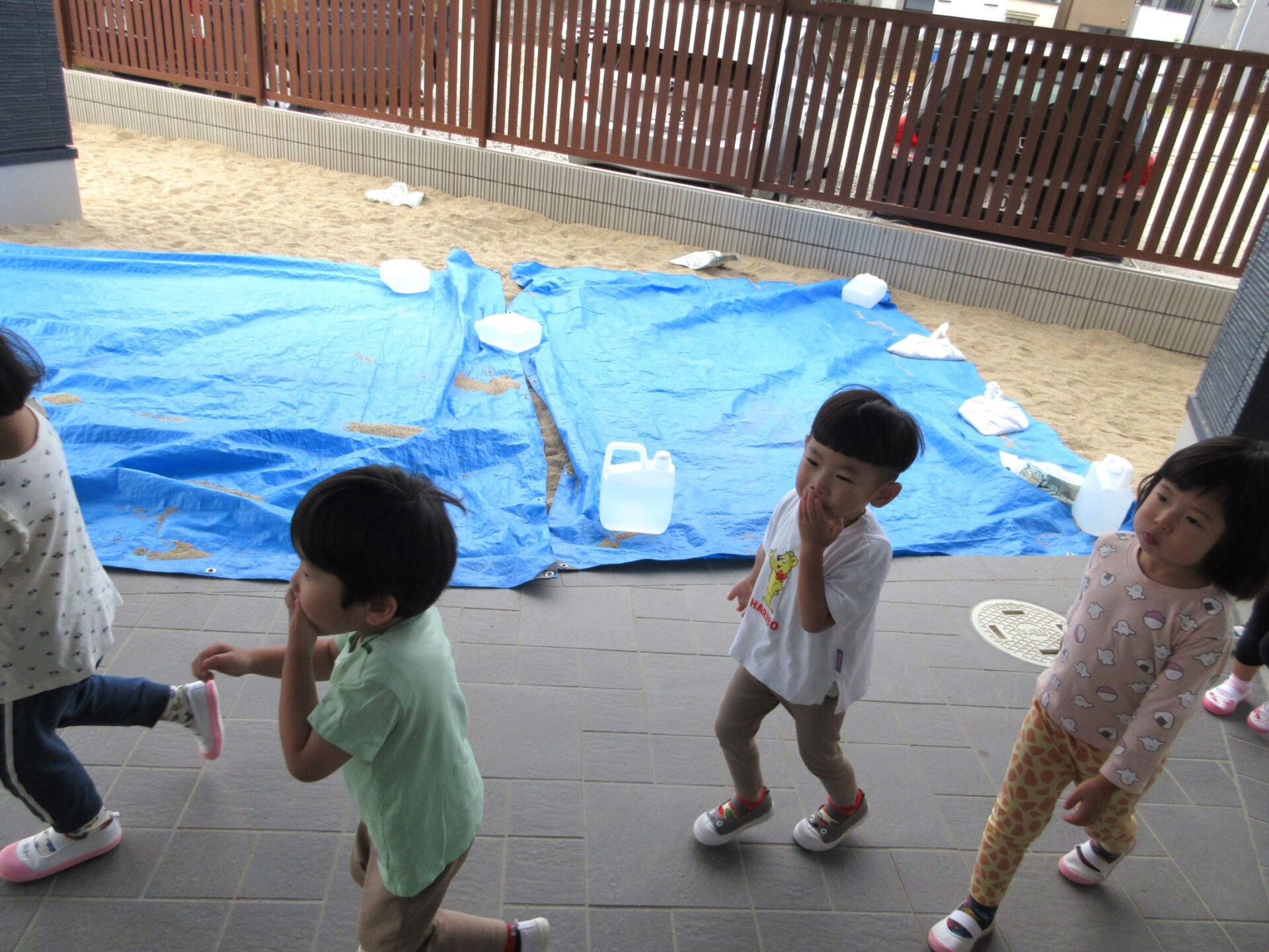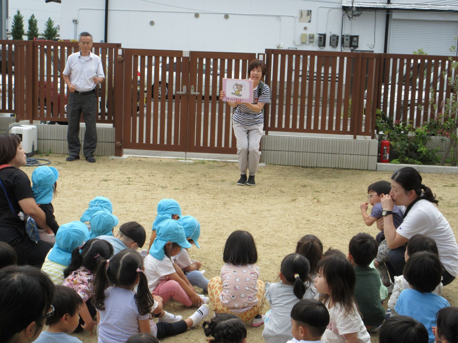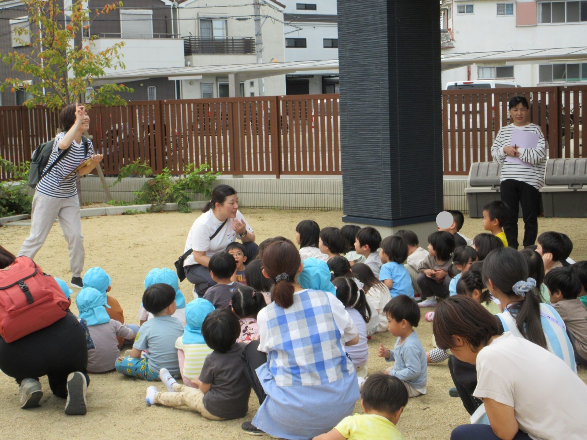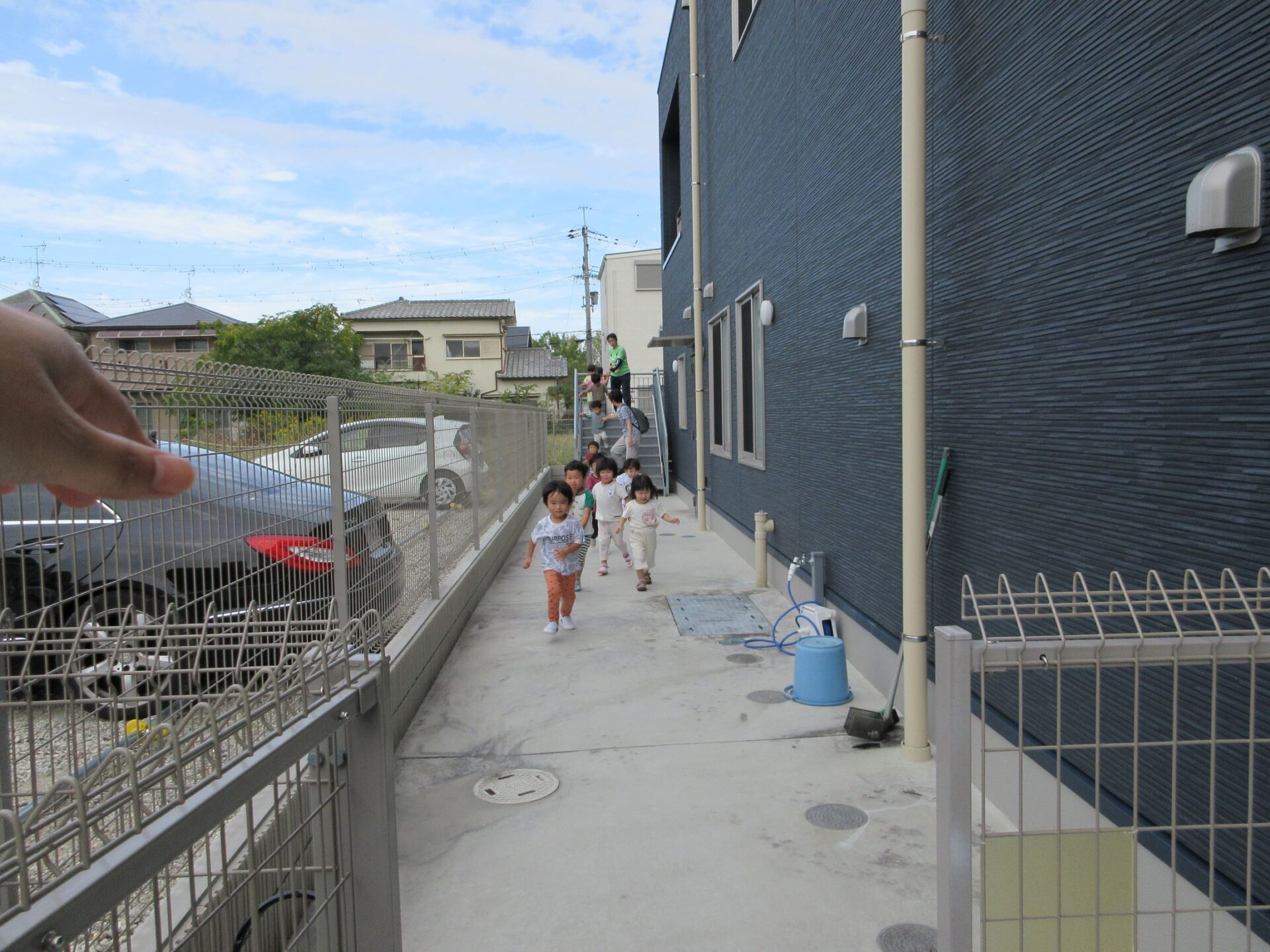 2024.11.11 お知らせ ブログ 避難訓練をしました 10月24日(木)、10時より避難訓練をしました。3歳にじ組と4歳そら組は、2階から非常階段を下ります。少し高いところがあるので、気をつけて。 非常階段を下りて、園庭に向かいます。 園庭では、1階のうみ組だいち組が先に到着していました。 先生が人数を点呼します。 先生から、避難の時の注意について話がありました。11月27日(水)の避難訓練には、八尾市消防本部から消防士さんが消防車で来てくれますよ。 一覧へ戻る