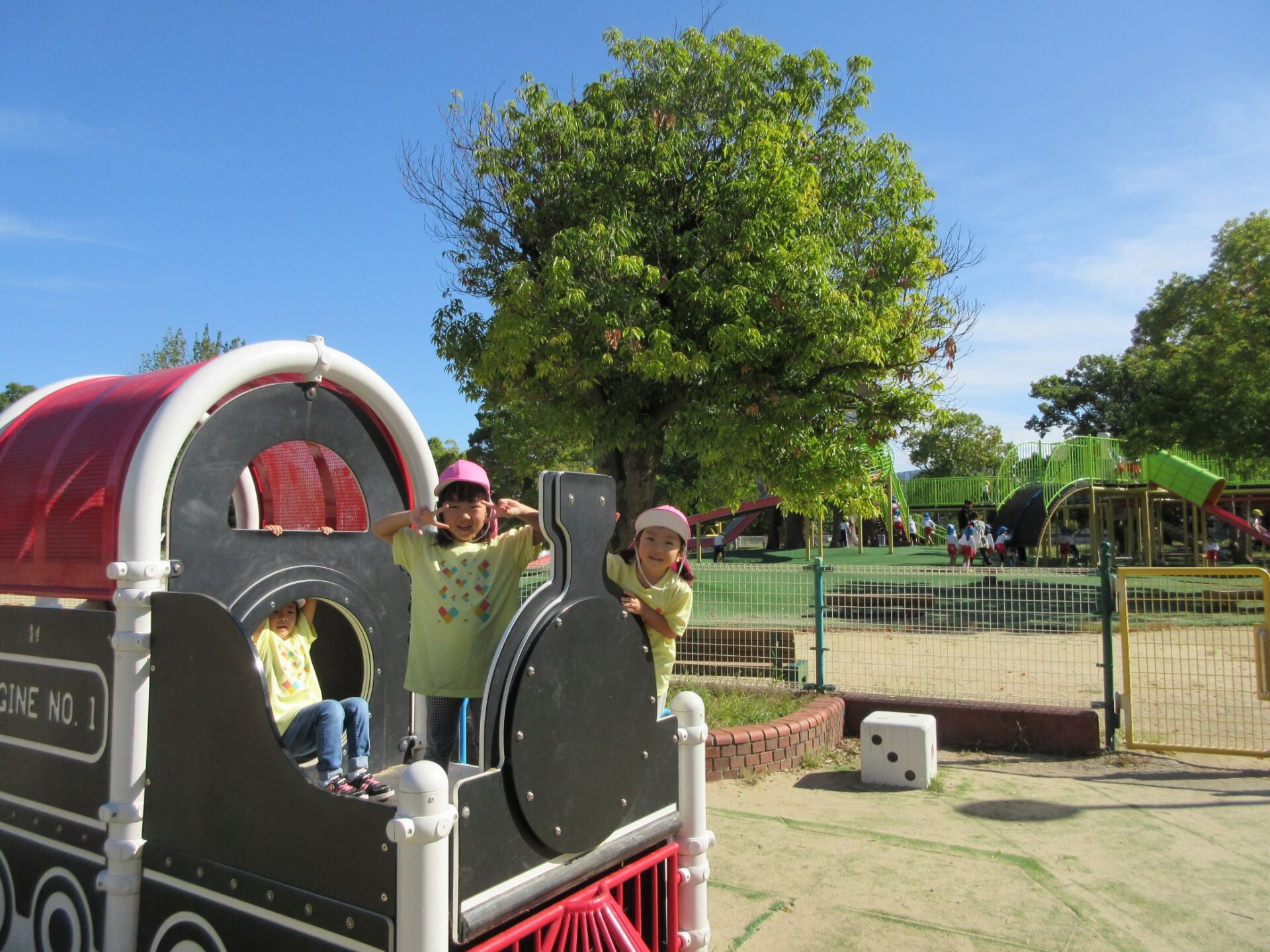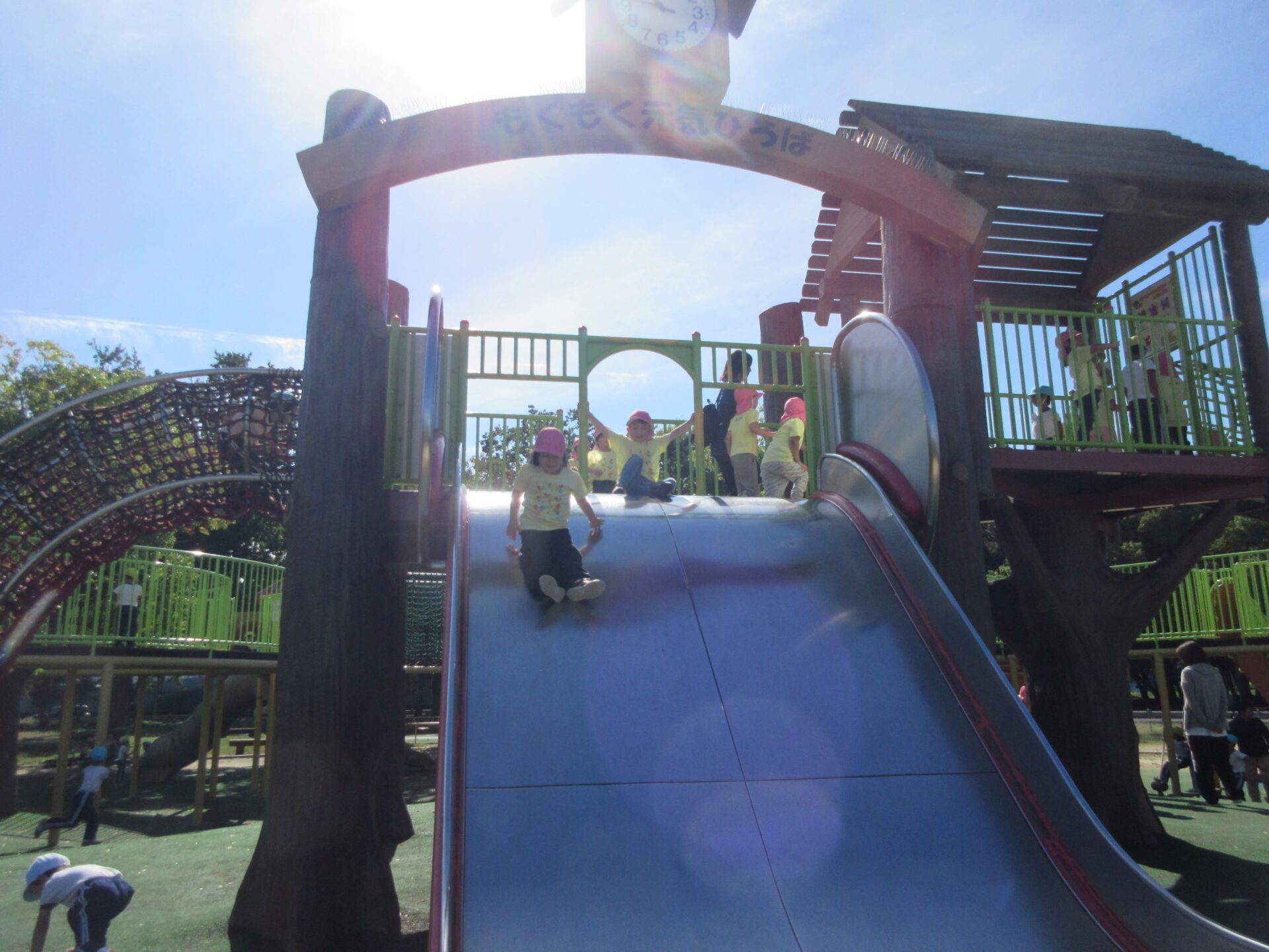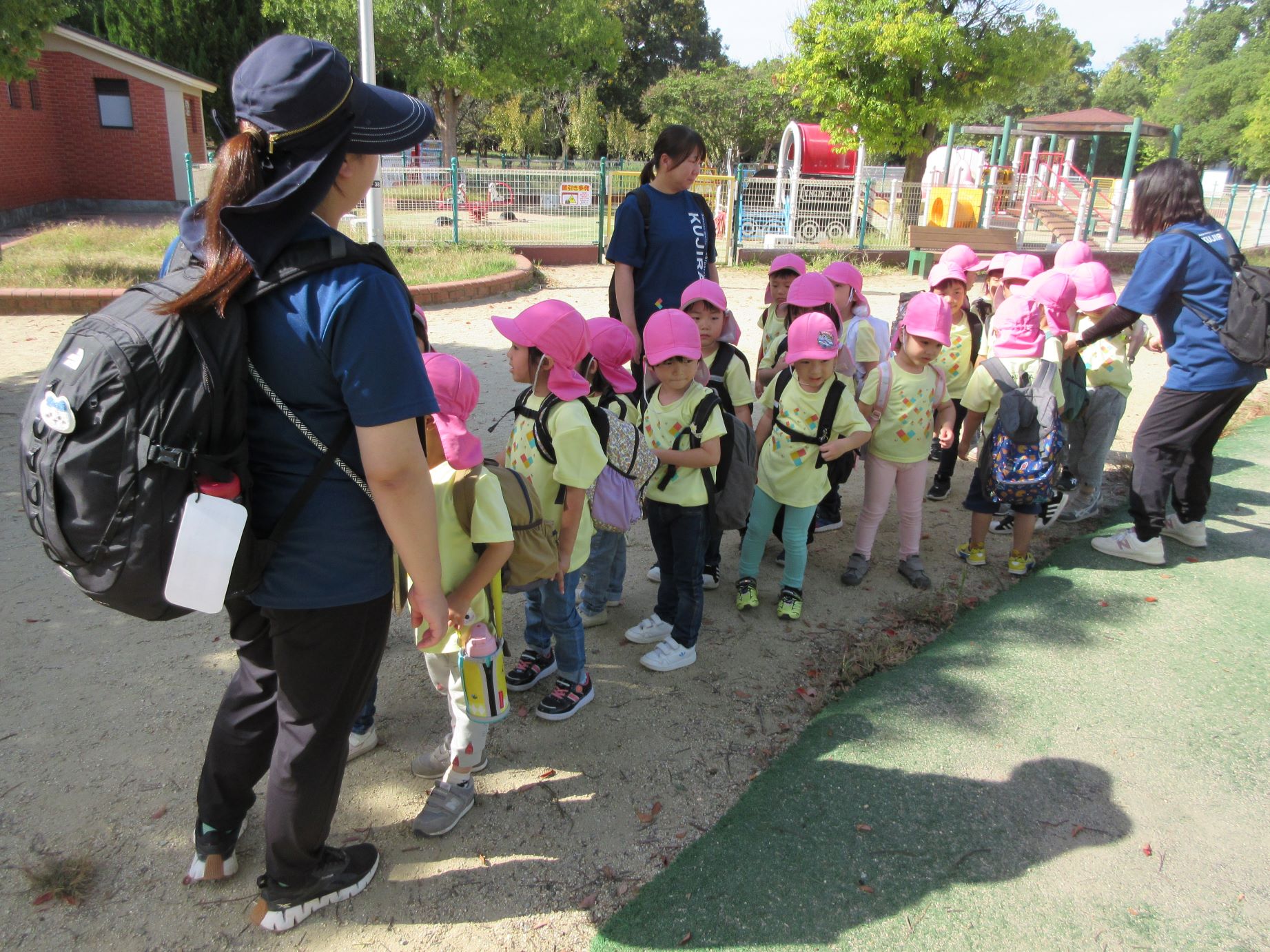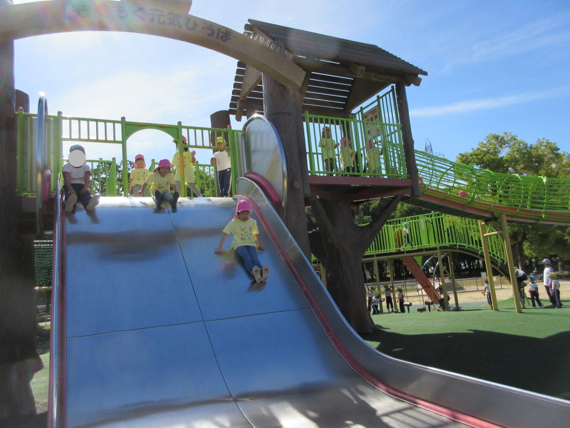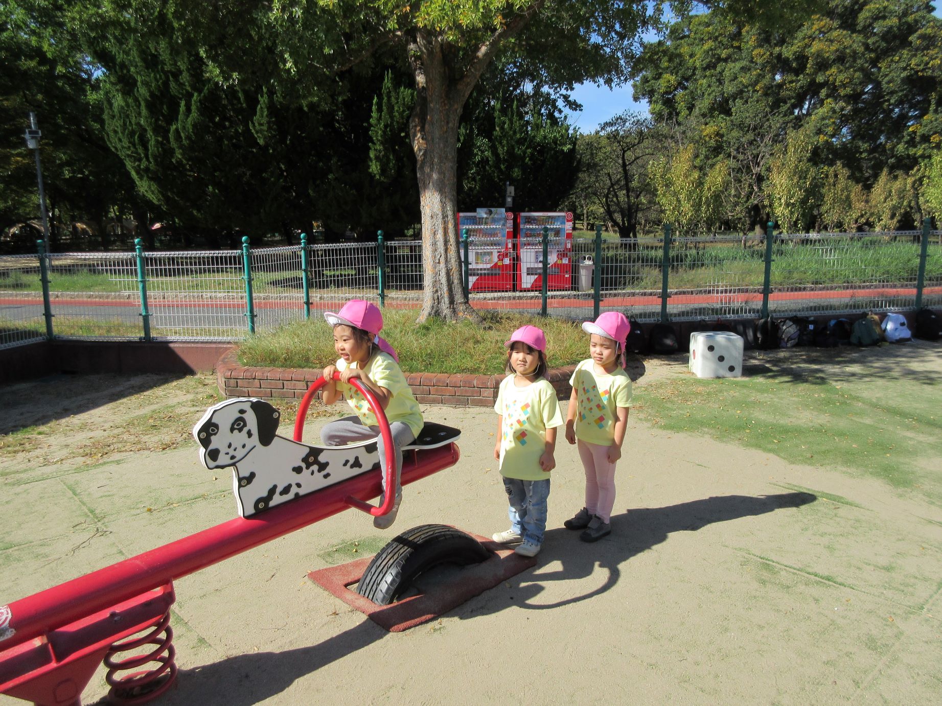 2024.10.31 お知らせ ブログ 久宝寺緑地まで歩いたよ(そら組) 10月25日(金)、4歳そら組の遠足の日を迎えました。2歳あめ組さんが、お見送りです。 そら組の部屋の窓には、みんなの作った「てるてる坊主」がお見送りです。 これから約40分の道のりです。 大きな歩道橋もわたりました。風が気持ちよくて、いい眺めです。 久宝寺緑地のもくもく元気広場に到着。 先生から、大事なお約束のお話がありました。 それっ。遊びに行こう! これは、シーソーですね。 SL(蒸気機関車) 自分の遊びたい遊具に走っていきました。 ジャングルジムにもたくさん集まりました。 大きな滑り台です。 なんども何度も滑りました。 木陰に移動して、これから楽しみにしていたお弁当の時間です。 お弁当を食べる準備です。 「おいしそう!」「作ってくれて、ありがとう。」 お弁当が終わったら、おやつの時間です。 なぜだか、木の周りに集まって、小さな枝でパチパチパチ! 何をしていたんでしょう? お弁当のあと、もう一度、滑り台で遊びました。 いよいよ園に帰ります。最後まで、元気にあるくぞ~!お~! 少し疲れましたが、最後まで歩いて帰ってきました。楽しかったです。また行きたいね。 一覧へ戻る