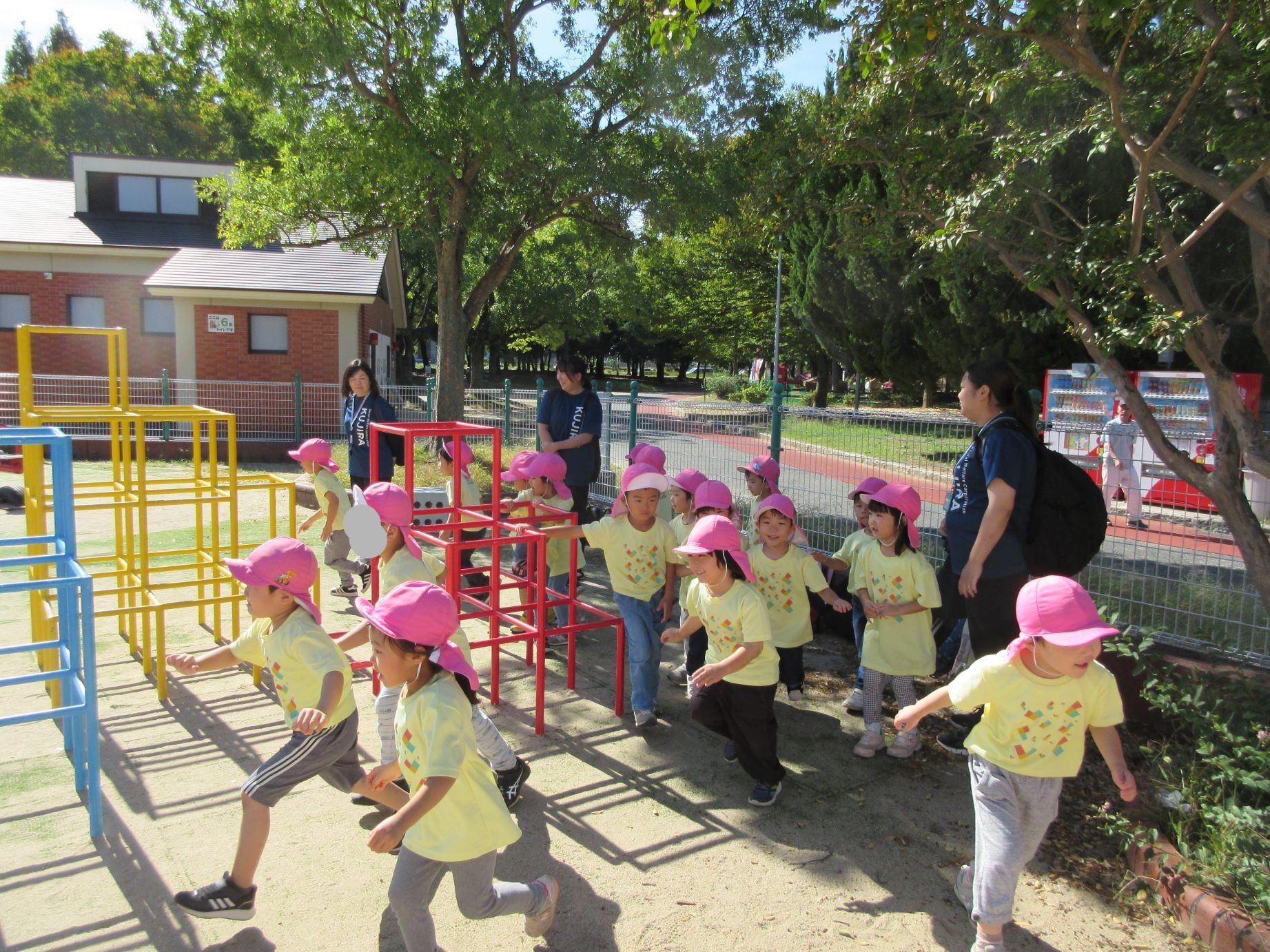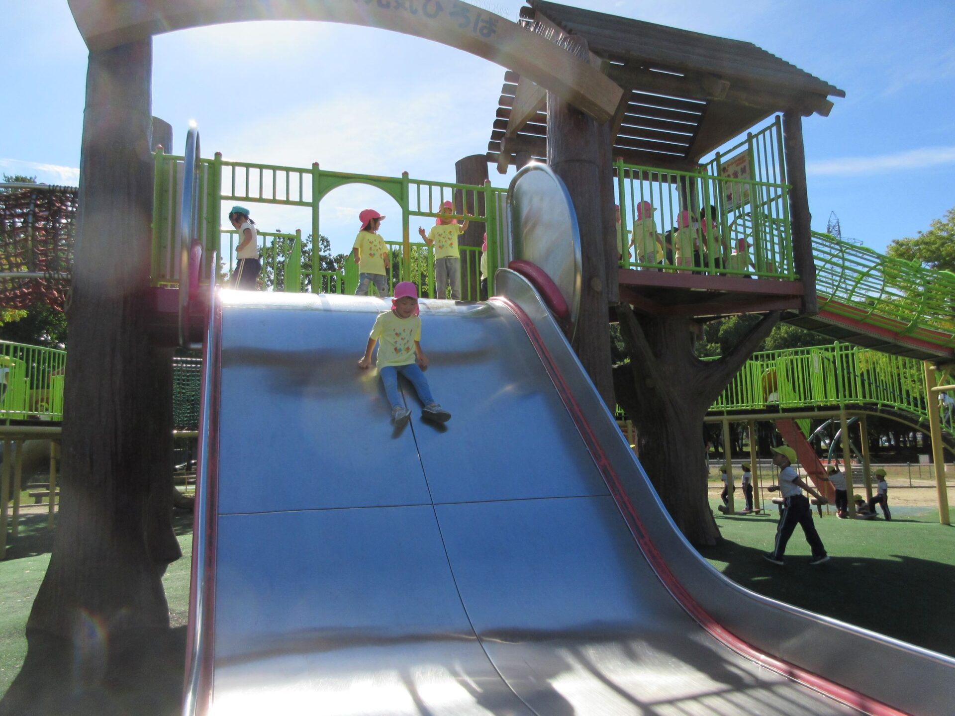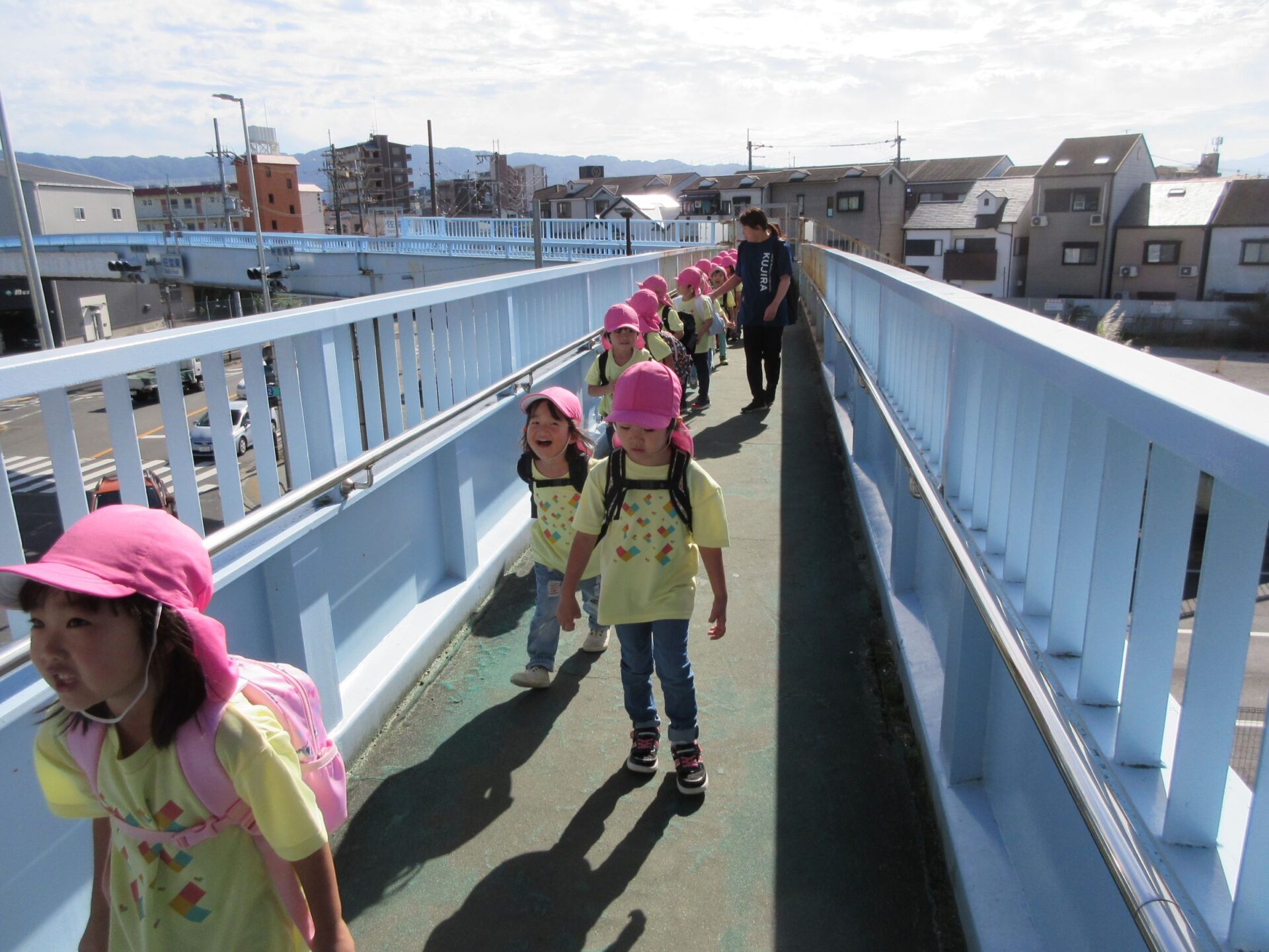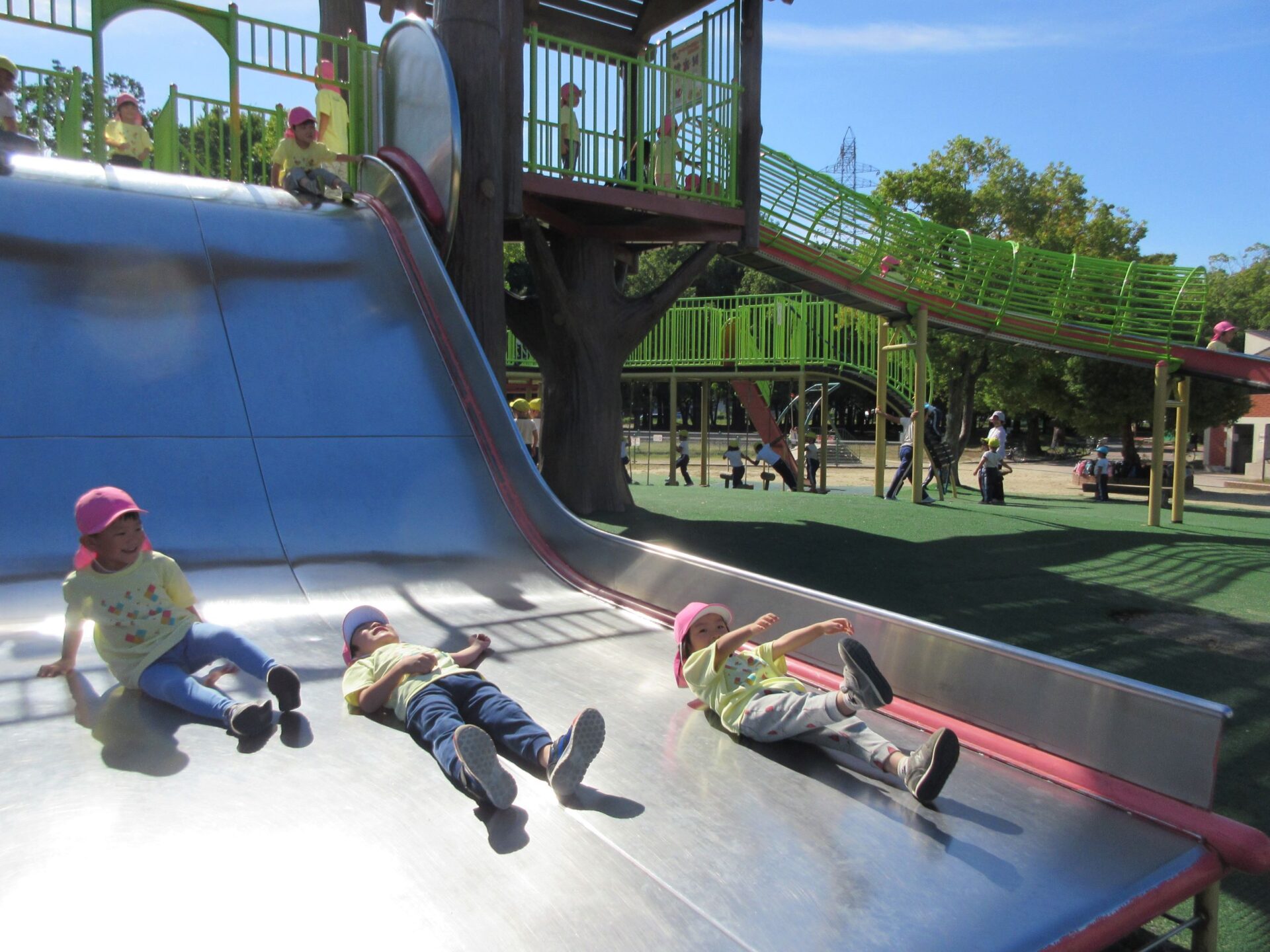 2024.10.31 お知らせ ブログ 久宝寺緑地まで歩いたよ(そら組) 10月25日(金)、4歳そら組の遠足の日を迎えました。2歳あめ組さんが、お見送りです。 そら組の部屋の窓には、みんなの作った「てるてる坊主」がお見送りです。 これから約40分の道のりです。 大きな歩道橋もわたりました。風が気持ちよくて、いい眺めです。 久宝寺緑地のもくもく元気広場に到着。 先生から、大事なお約束のお話がありました。 それっ。遊びに行こう! これは、シーソーですね。 SL(蒸気機関車) 自分の遊びたい遊具に走っていきました。 ジャングルジムにもたくさん集まりました。 大きな滑り台です。 なんども何度も滑りました。 木陰に移動して、これから楽しみにしていたお弁当の時間です。 お弁当を食べる準備です。 「おいしそう!」「作ってくれて、ありがとう。」 お弁当が終わったら、おやつの時間です。 なぜだか、木の周りに集まって、小さな枝でパチパチパチ! 何をしていたんでしょう? お弁当のあと、もう一度、滑り台で遊びました。 いよいよ園に帰ります。最後まで、元気にあるくぞ~!お~! 少し疲れましたが、最後まで歩いて帰ってきました。楽しかったです。また行きたいね。 一覧へ戻る