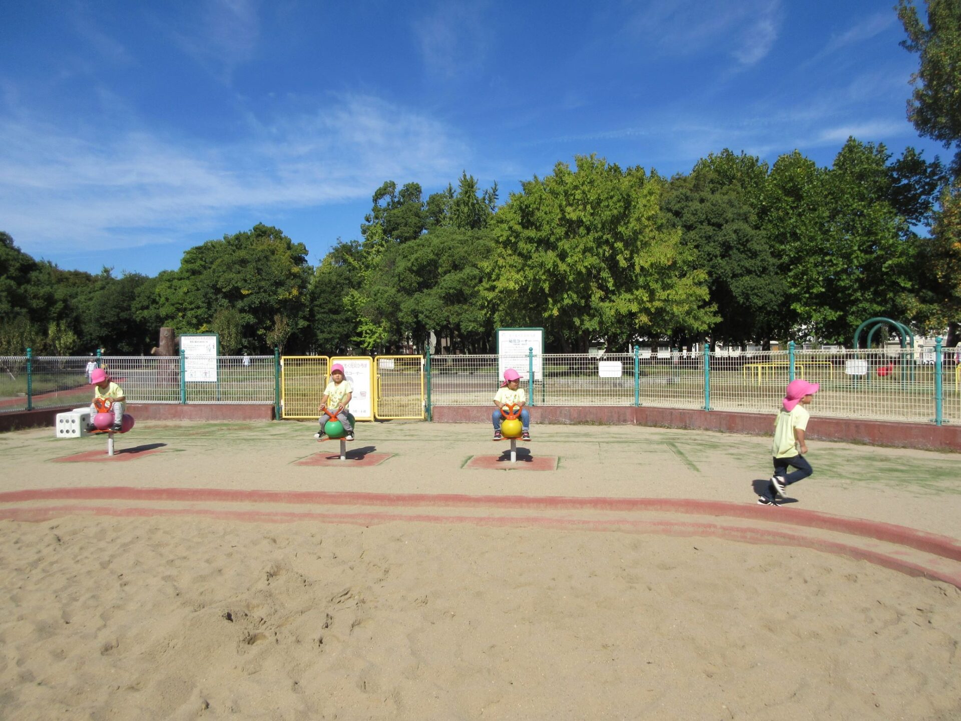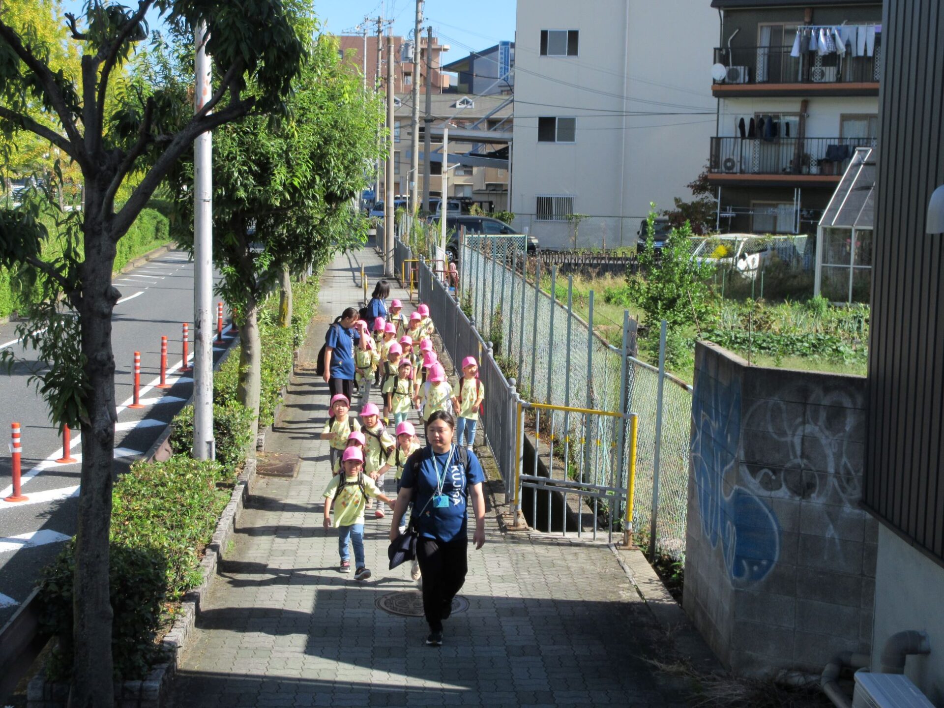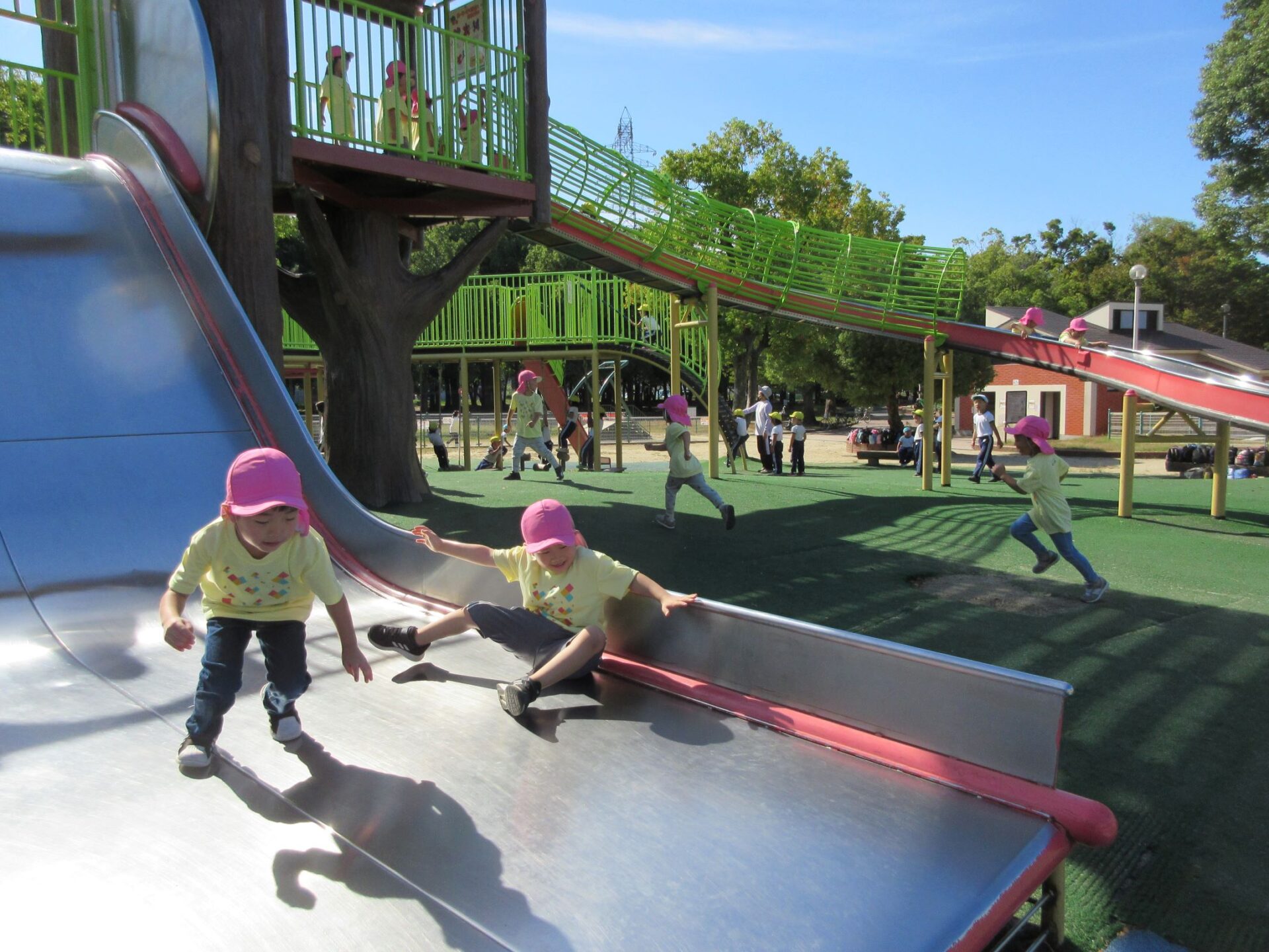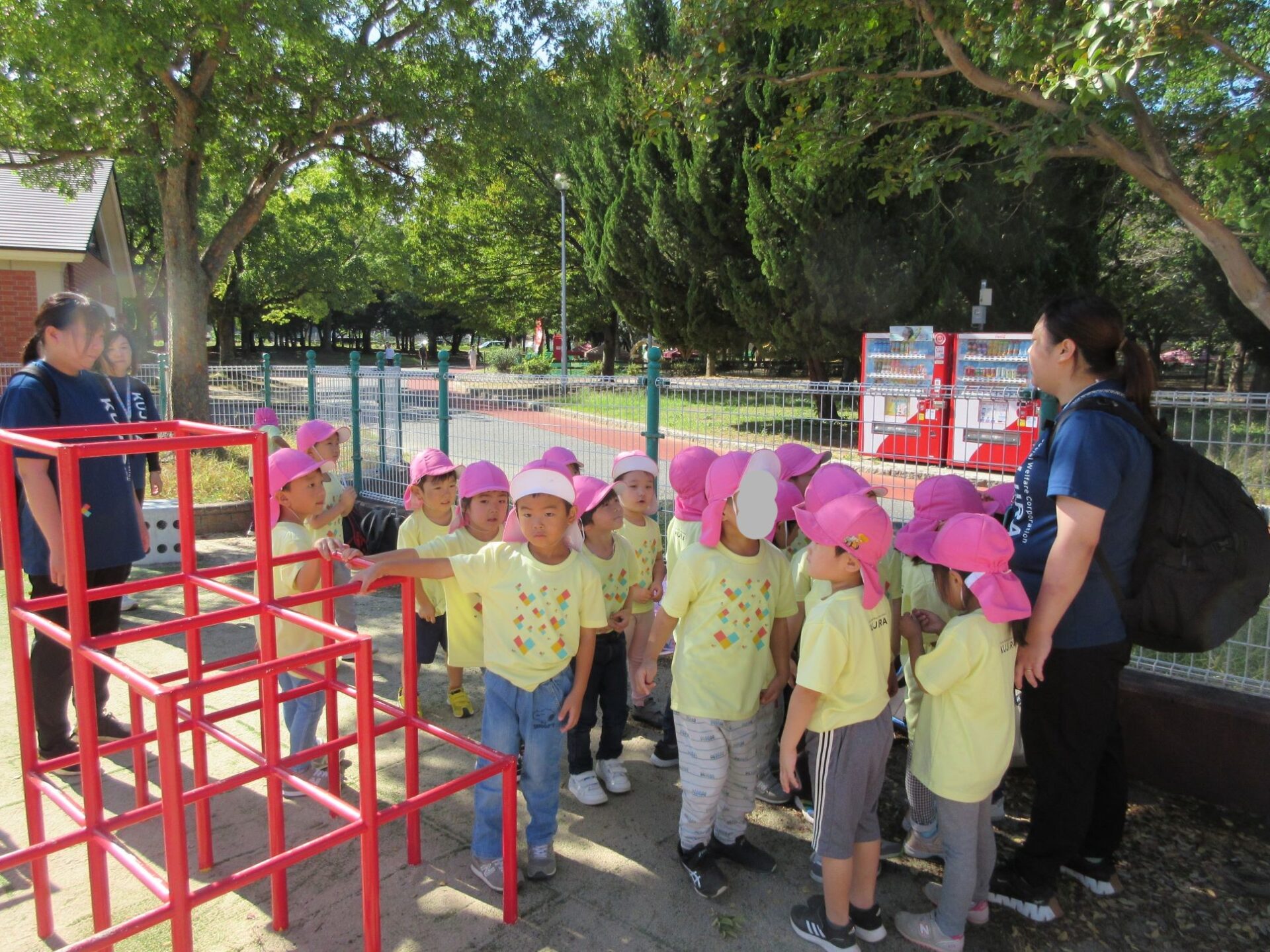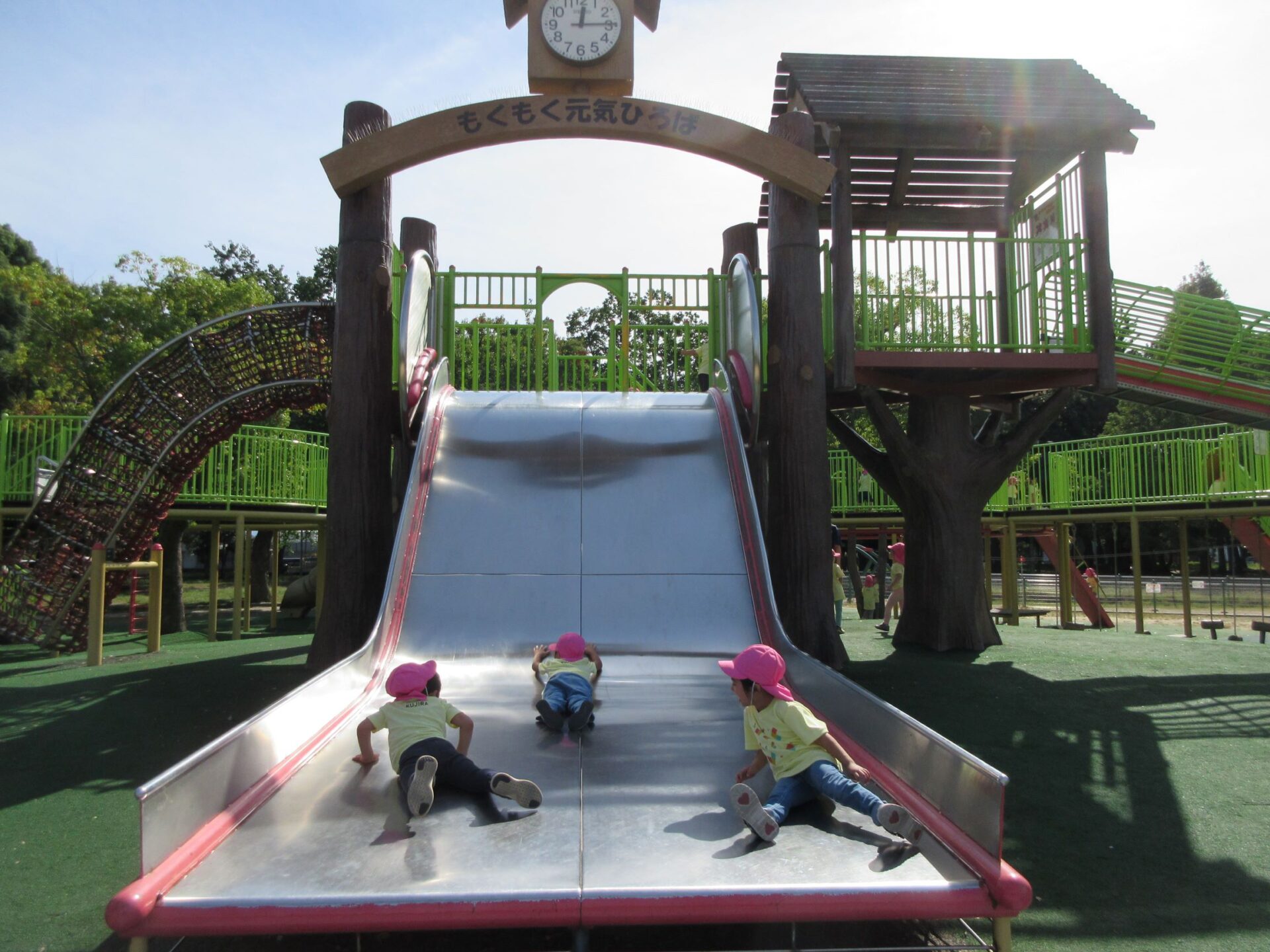 2024.10.31 お知らせ ブログ 久宝寺緑地まで歩いたよ(そら組) 10月25日(金)、4歳そら組の遠足の日を迎えました。2歳あめ組さんが、お見送りです。 そら組の部屋の窓には、みんなの作った「てるてる坊主」がお見送りです。 これから約40分の道のりです。 大きな歩道橋もわたりました。風が気持ちよくて、いい眺めです。 久宝寺緑地のもくもく元気広場に到着。 先生から、大事なお約束のお話がありました。 それっ。遊びに行こう! これは、シーソーですね。 SL(蒸気機関車) 自分の遊びたい遊具に走っていきました。 ジャングルジムにもたくさん集まりました。 大きな滑り台です。 なんども何度も滑りました。 木陰に移動して、これから楽しみにしていたお弁当の時間です。 お弁当を食べる準備です。 「おいしそう!」「作ってくれて、ありがとう。」 お弁当が終わったら、おやつの時間です。 なぜだか、木の周りに集まって、小さな枝でパチパチパチ! 何をしていたんでしょう? お弁当のあと、もう一度、滑り台で遊びました。 いよいよ園に帰ります。最後まで、元気にあるくぞ~!お~! 少し疲れましたが、最後まで歩いて帰ってきました。楽しかったです。また行きたいね。 一覧へ戻る