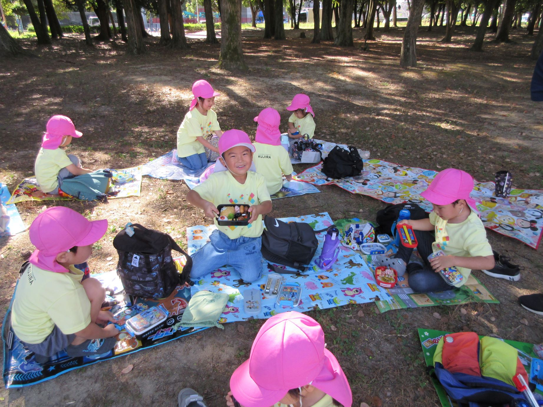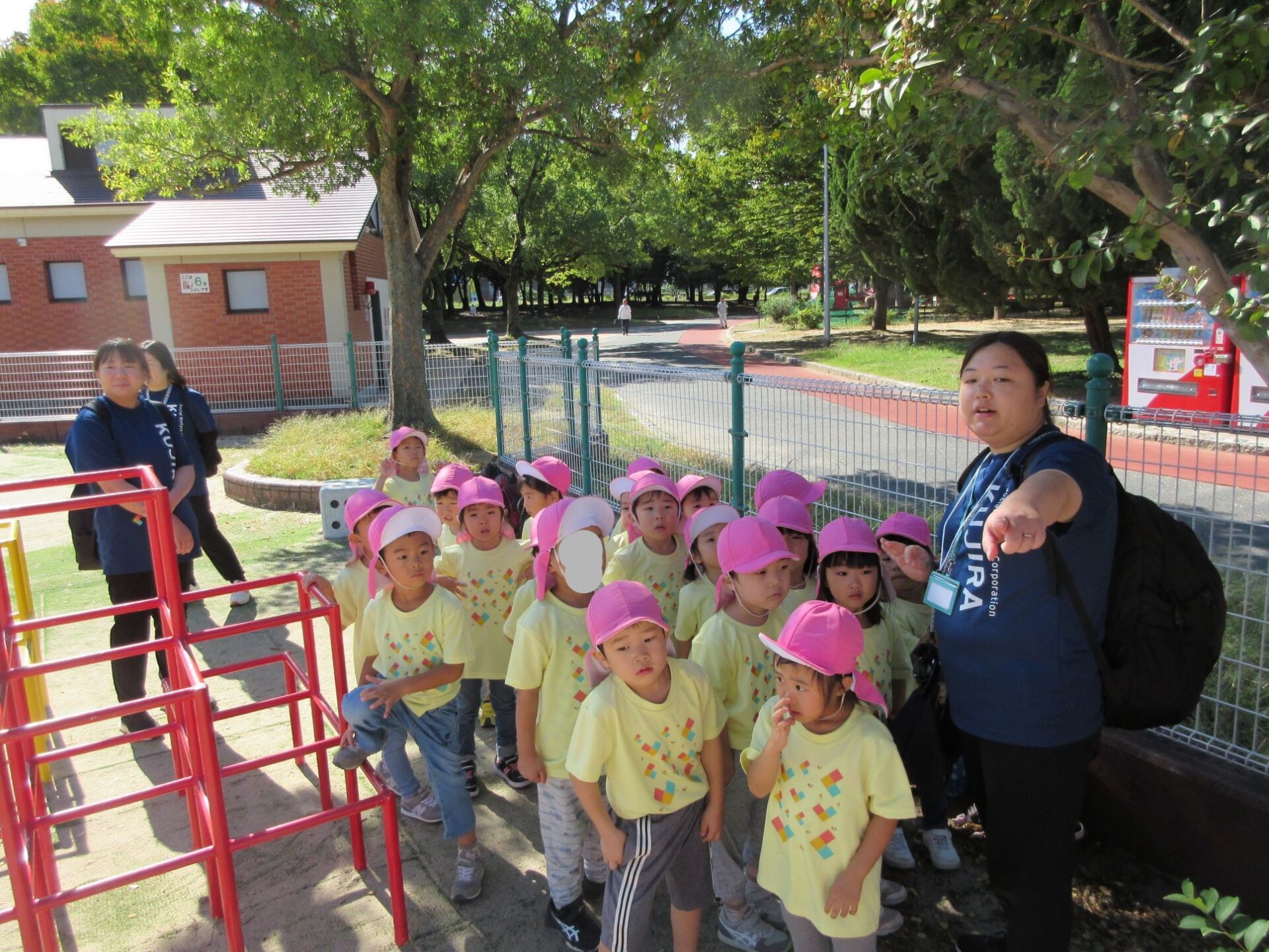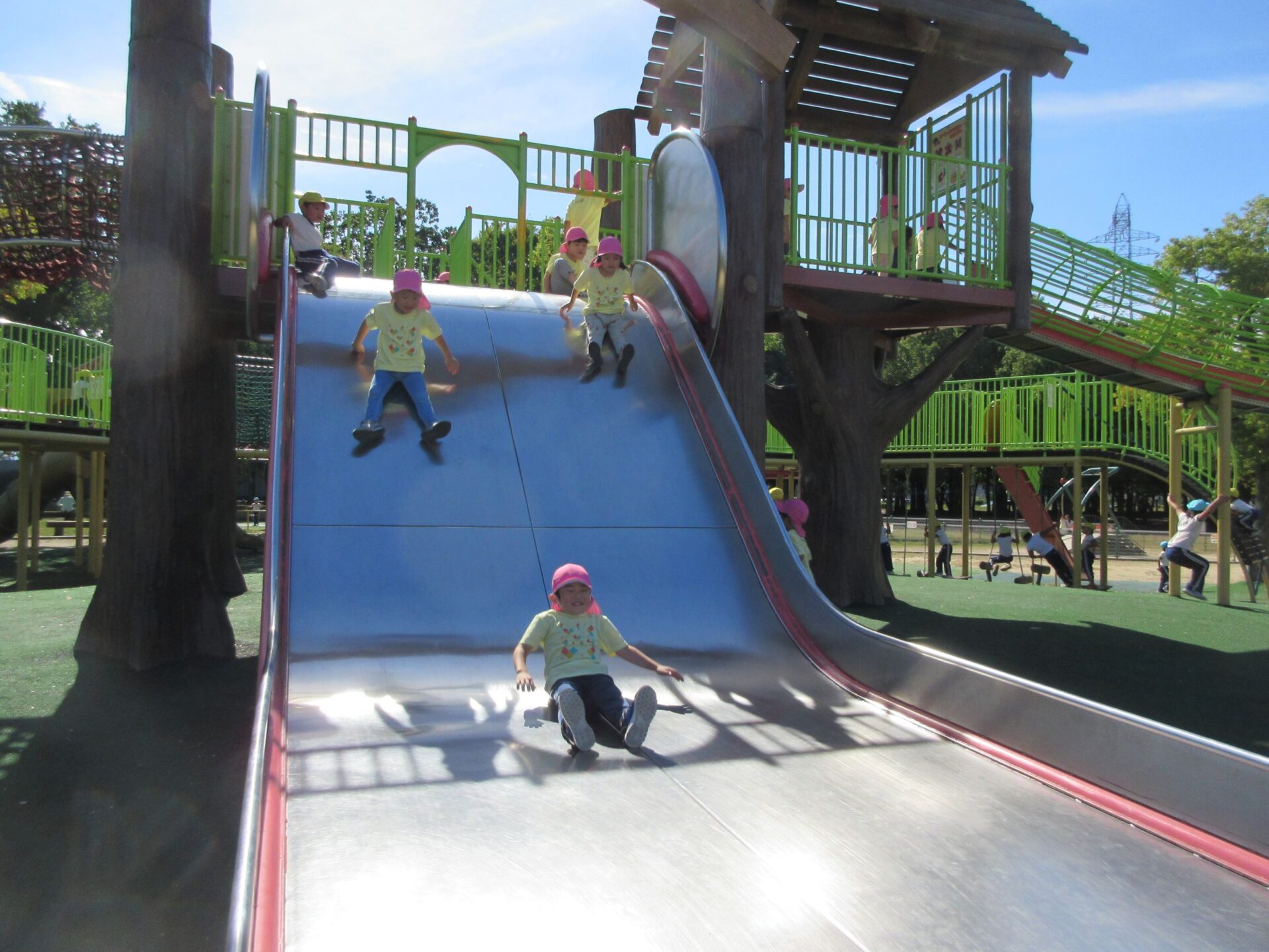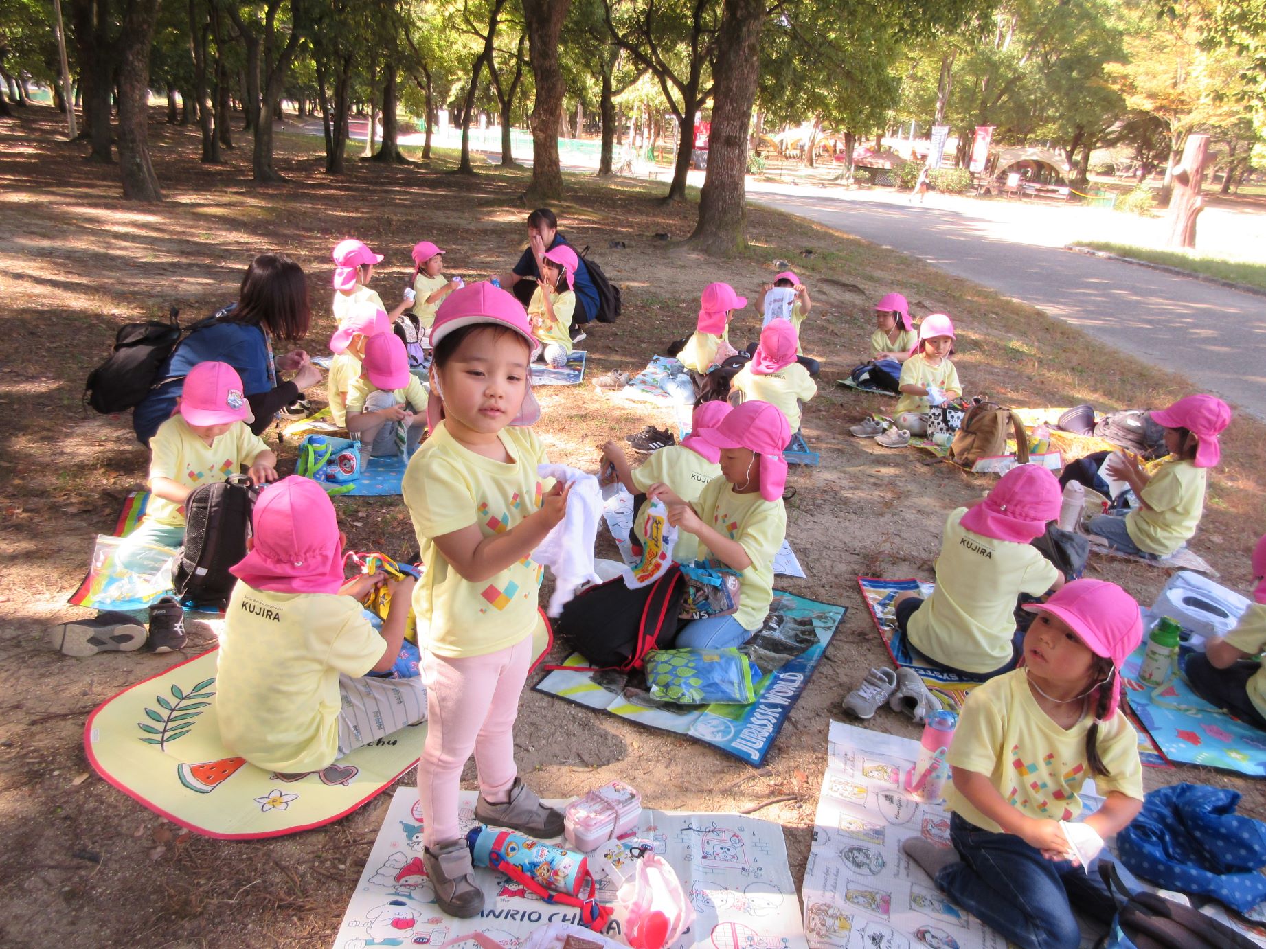 2024.10.31 お知らせ ブログ 久宝寺緑地まで歩いたよ(そら組) 10月25日(金)、4歳そら組の遠足の日を迎えました。2歳あめ組さんが、お見送りです。 そら組の部屋の窓には、みんなの作った「てるてる坊主」がお見送りです。 これから約40分の道のりです。 大きな歩道橋もわたりました。風が気持ちよくて、いい眺めです。 久宝寺緑地のもくもく元気広場に到着。 先生から、大事なお約束のお話がありました。 それっ。遊びに行こう! これは、シーソーですね。 SL(蒸気機関車) 自分の遊びたい遊具に走っていきました。 ジャングルジムにもたくさん集まりました。 大きな滑り台です。 なんども何度も滑りました。 木陰に移動して、これから楽しみにしていたお弁当の時間です。 お弁当を食べる準備です。 「おいしそう!」「作ってくれて、ありがとう。」 お弁当が終わったら、おやつの時間です。 なぜだか、木の周りに集まって、小さな枝でパチパチパチ! 何をしていたんでしょう? お弁当のあと、もう一度、滑り台で遊びました。 いよいよ園に帰ります。最後まで、元気にあるくぞ~!お~! 少し疲れましたが、最後まで歩いて帰ってきました。楽しかったです。また行きたいね。 一覧へ戻る