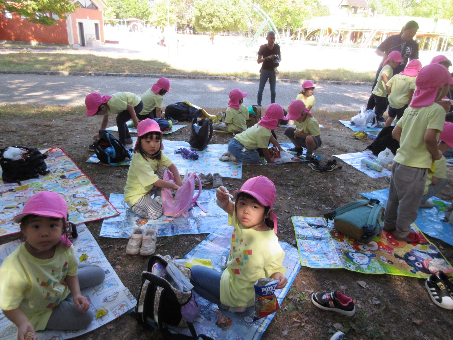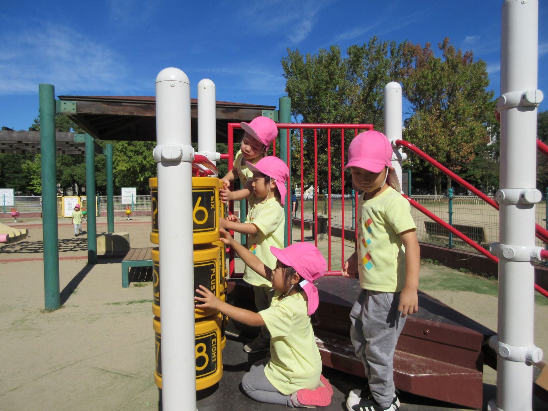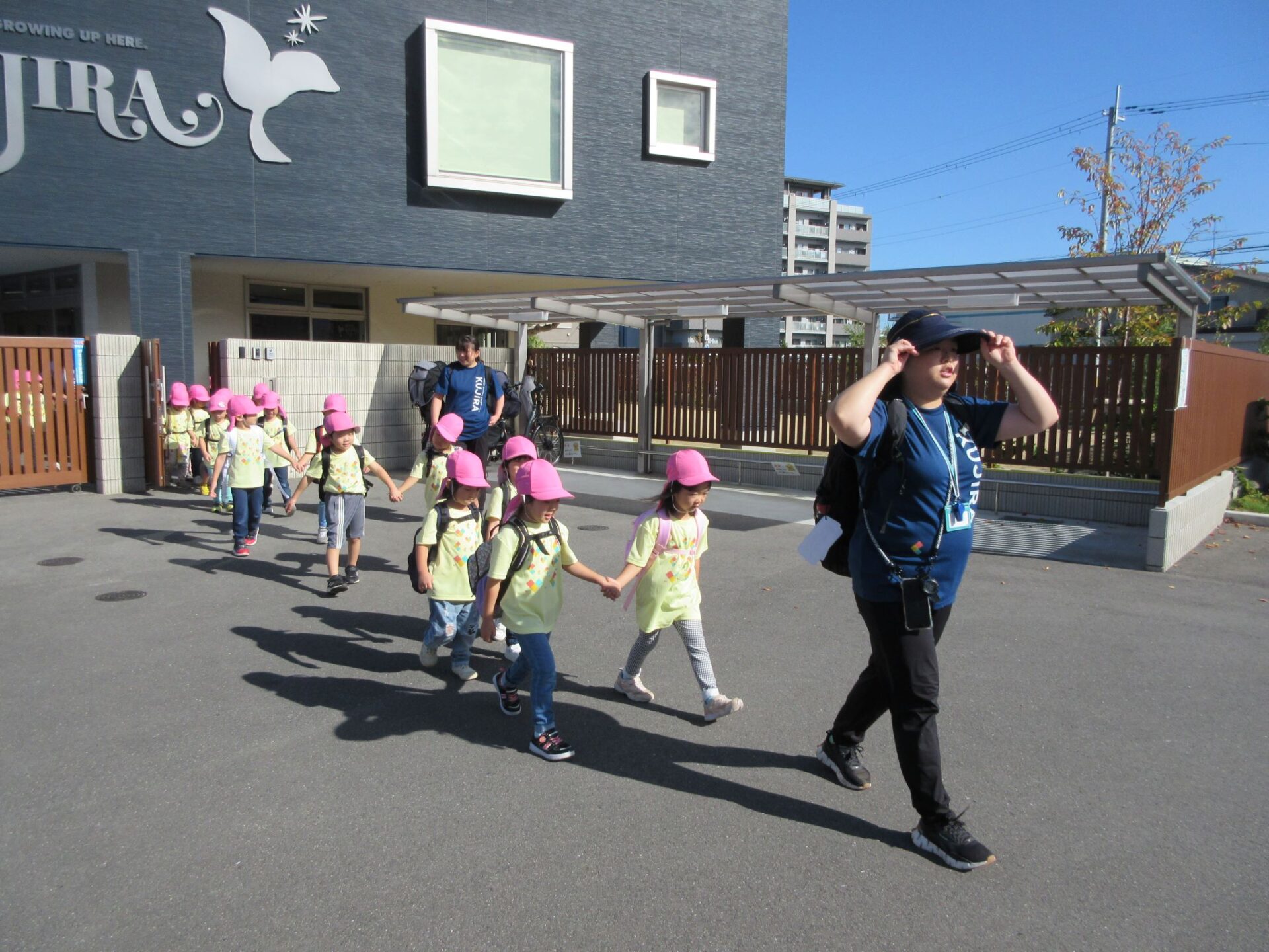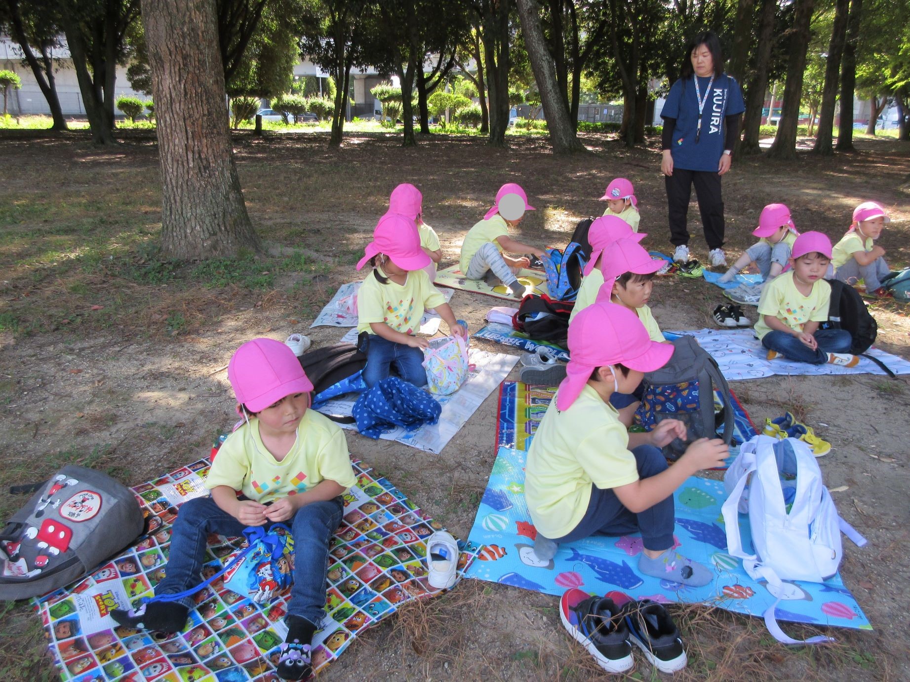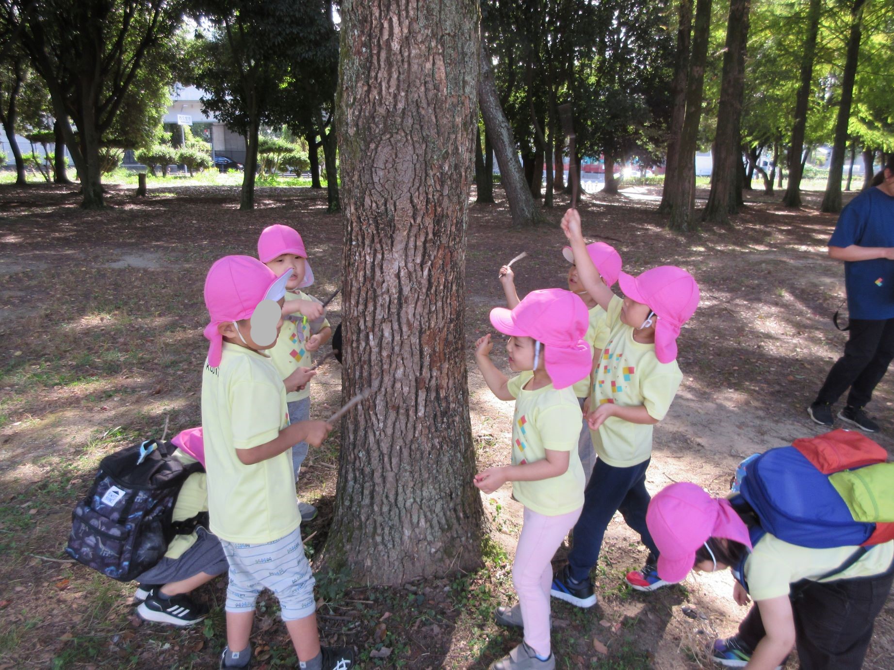 2024.10.31 お知らせ ブログ 久宝寺緑地まで歩いたよ(そら組) 10月25日(金)、4歳そら組の遠足の日を迎えました。2歳あめ組さんが、お見送りです。 そら組の部屋の窓には、みんなの作った「てるてる坊主」がお見送りです。 これから約40分の道のりです。 大きな歩道橋もわたりました。風が気持ちよくて、いい眺めです。 久宝寺緑地のもくもく元気広場に到着。 先生から、大事なお約束のお話がありました。 それっ。遊びに行こう! これは、シーソーですね。 SL(蒸気機関車) 自分の遊びたい遊具に走っていきました。 ジャングルジムにもたくさん集まりました。 大きな滑り台です。 なんども何度も滑りました。 木陰に移動して、これから楽しみにしていたお弁当の時間です。 お弁当を食べる準備です。 「おいしそう!」「作ってくれて、ありがとう。」 お弁当が終わったら、おやつの時間です。 なぜだか、木の周りに集まって、小さな枝でパチパチパチ! 何をしていたんでしょう? お弁当のあと、もう一度、滑り台で遊びました。 いよいよ園に帰ります。最後まで、元気にあるくぞ~!お~! 少し疲れましたが、最後まで歩いて帰ってきました。楽しかったです。また行きたいね。 一覧へ戻る
