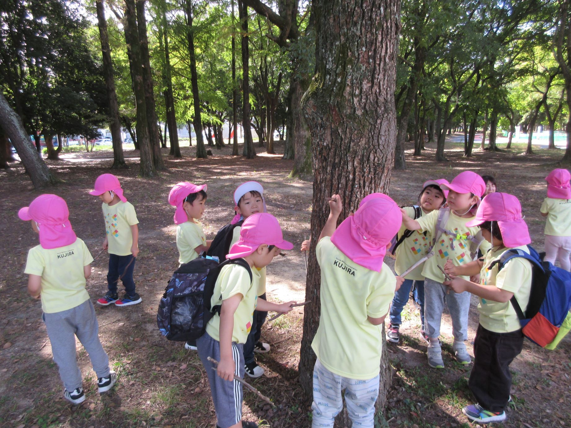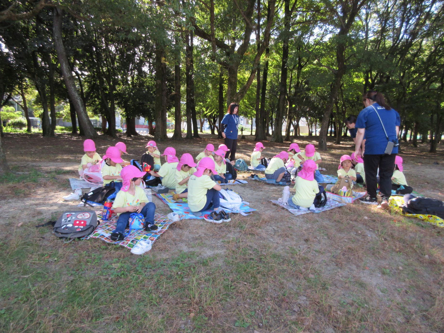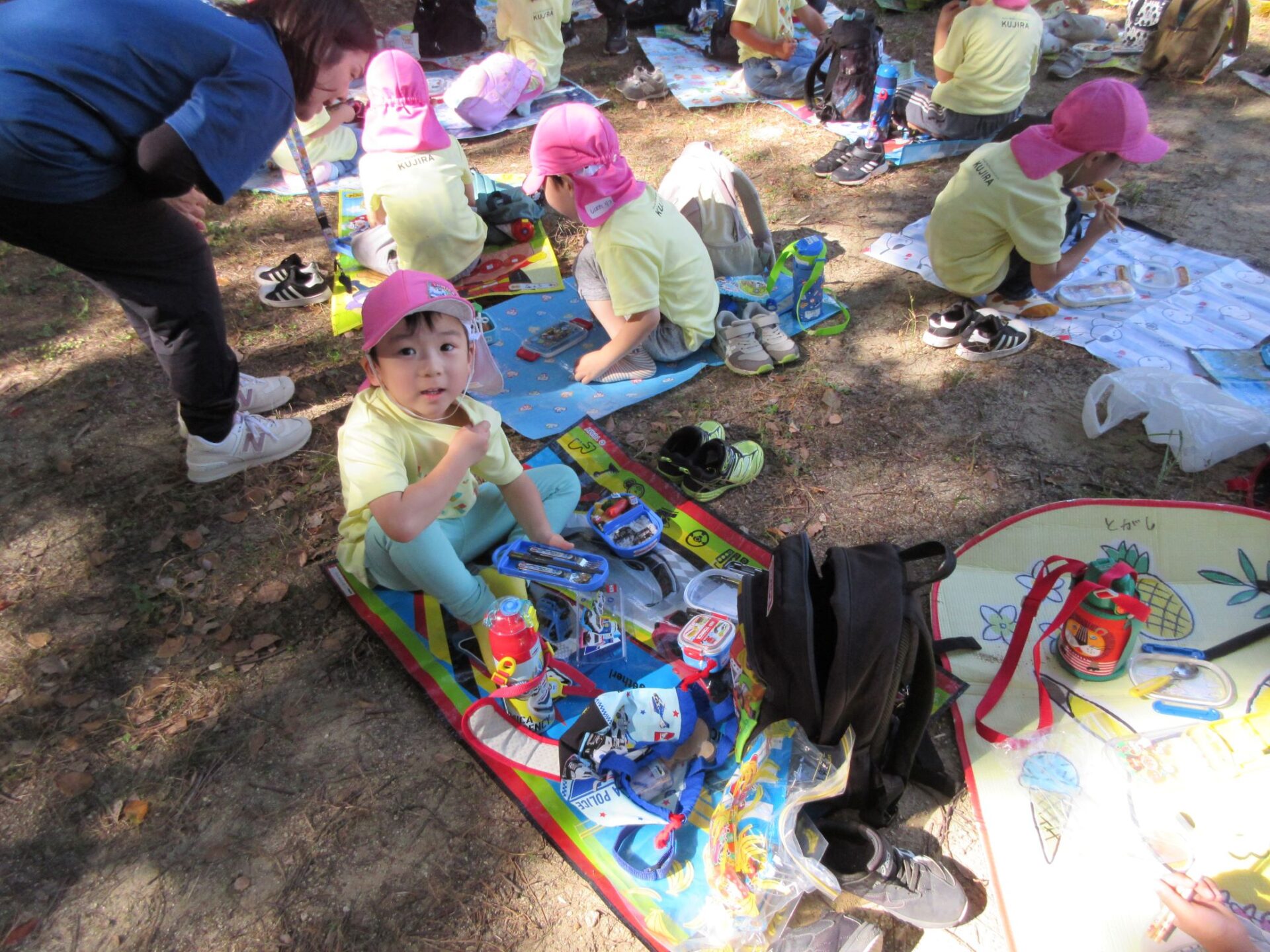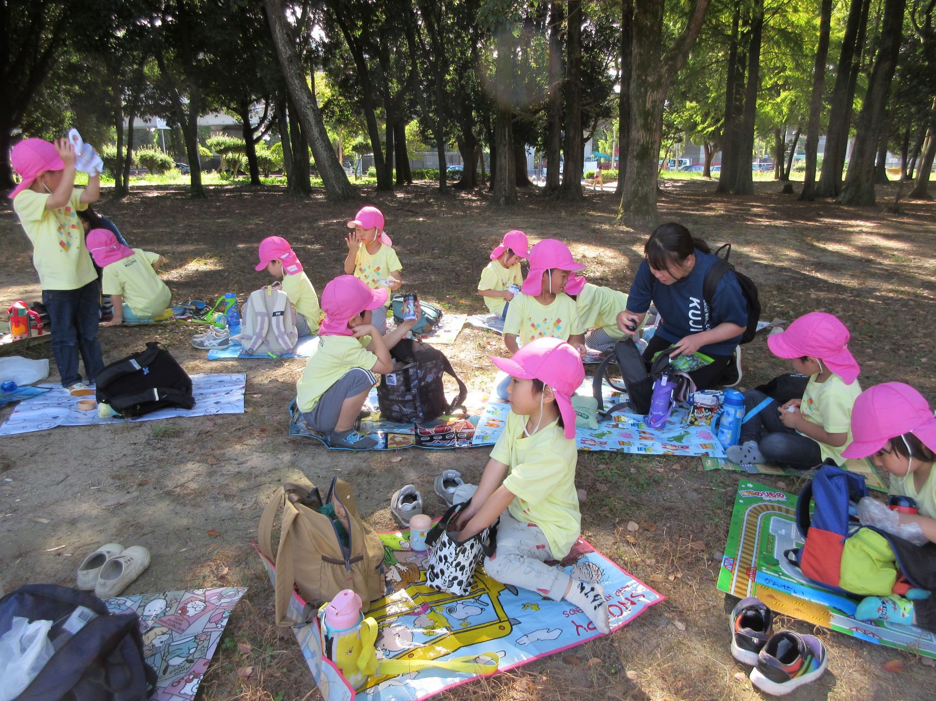 2024.10.31 お知らせ ブログ 久宝寺緑地まで歩いたよ(そら組) 10月25日(金)、4歳そら組の遠足の日を迎えました。2歳あめ組さんが、お見送りです。 そら組の部屋の窓には、みんなの作った「てるてる坊主」がお見送りです。 これから約40分の道のりです。 大きな歩道橋もわたりました。風が気持ちよくて、いい眺めです。 久宝寺緑地のもくもく元気広場に到着。 先生から、大事なお約束のお話がありました。 それっ。遊びに行こう! これは、シーソーですね。 SL(蒸気機関車) 自分の遊びたい遊具に走っていきました。 ジャングルジムにもたくさん集まりました。 大きな滑り台です。 なんども何度も滑りました。 木陰に移動して、これから楽しみにしていたお弁当の時間です。 お弁当を食べる準備です。 「おいしそう!」「作ってくれて、ありがとう。」 お弁当が終わったら、おやつの時間です。 なぜだか、木の周りに集まって、小さな枝でパチパチパチ! 何をしていたんでしょう? お弁当のあと、もう一度、滑り台で遊びました。 いよいよ園に帰ります。最後まで、元気にあるくぞ~!お~! 少し疲れましたが、最後まで歩いて帰ってきました。楽しかったです。また行きたいね。 一覧へ戻る