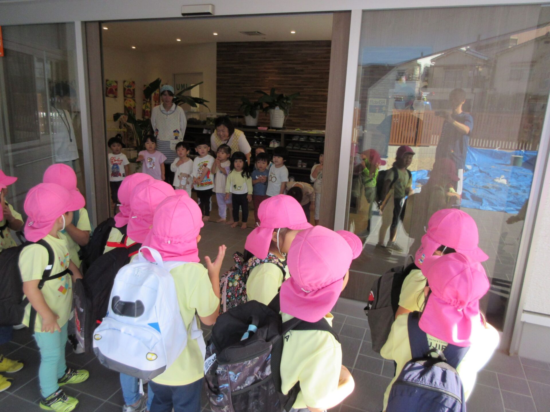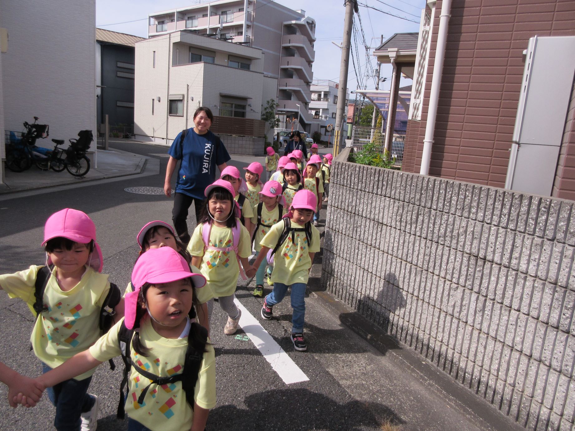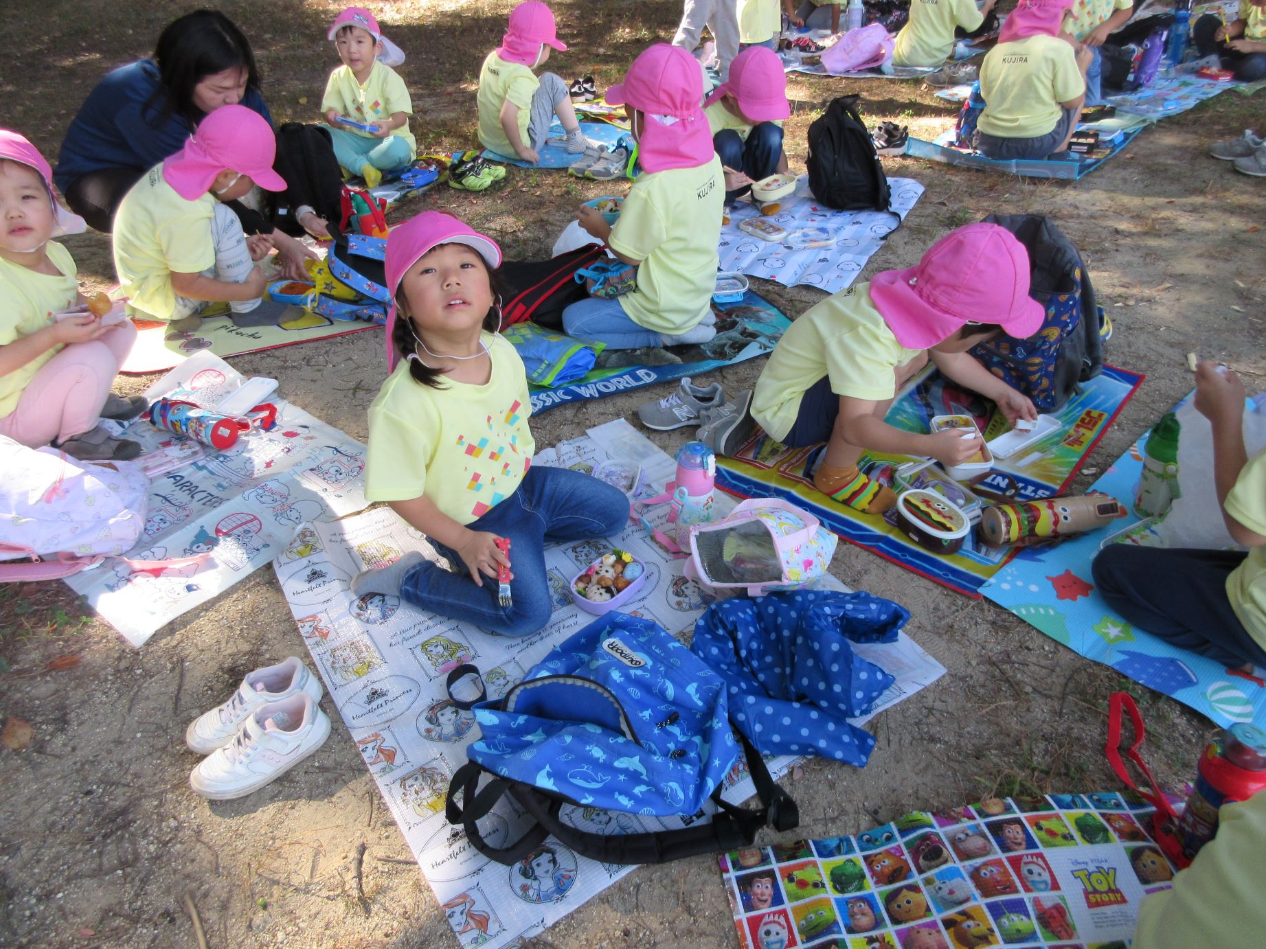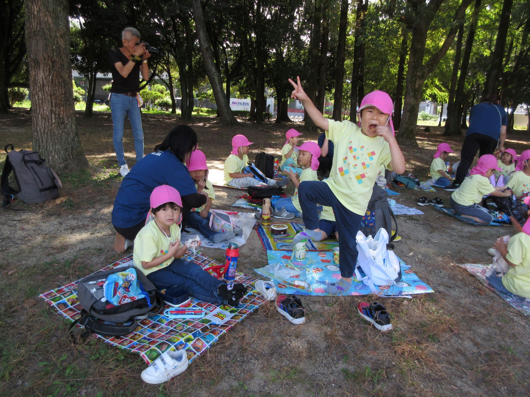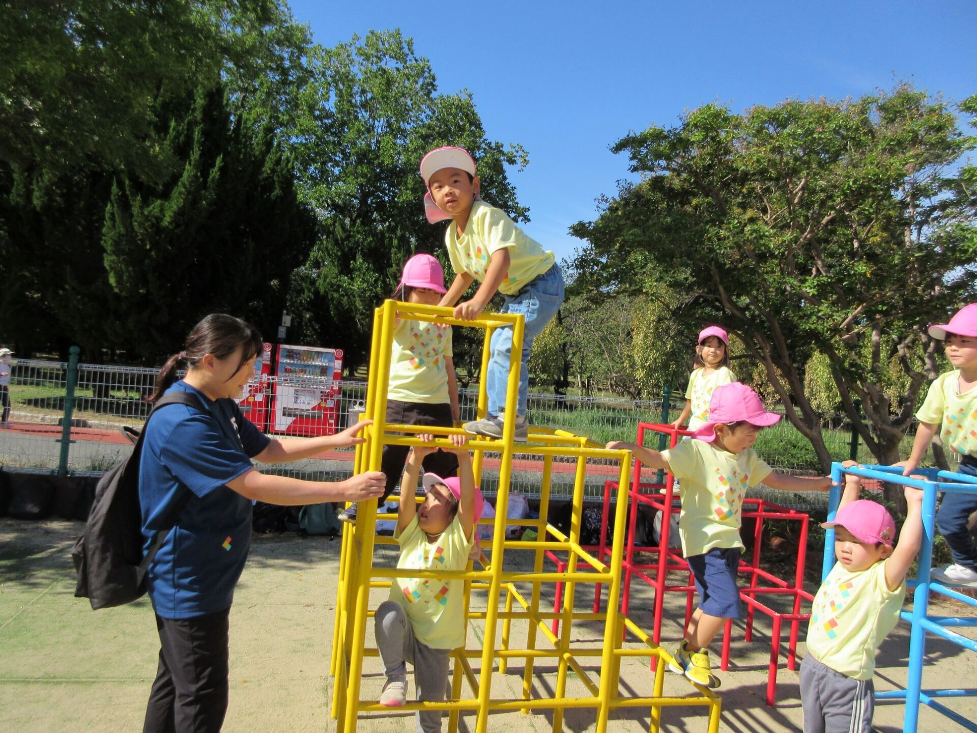 2024.10.31 お知らせ ブログ 久宝寺緑地まで歩いたよ(そら組) 10月25日(金)、4歳そら組の遠足の日を迎えました。2歳あめ組さんが、お見送りです。 そら組の部屋の窓には、みんなの作った「てるてる坊主」がお見送りです。 これから約40分の道のりです。 大きな歩道橋もわたりました。風が気持ちよくて、いい眺めです。 久宝寺緑地のもくもく元気広場に到着。 先生から、大事なお約束のお話がありました。 それっ。遊びに行こう! これは、シーソーですね。 SL(蒸気機関車) 自分の遊びたい遊具に走っていきました。 ジャングルジムにもたくさん集まりました。 大きな滑り台です。 なんども何度も滑りました。 木陰に移動して、これから楽しみにしていたお弁当の時間です。 お弁当を食べる準備です。 「おいしそう!」「作ってくれて、ありがとう。」 お弁当が終わったら、おやつの時間です。 なぜだか、木の周りに集まって、小さな枝でパチパチパチ! 何をしていたんでしょう? お弁当のあと、もう一度、滑り台で遊びました。 いよいよ園に帰ります。最後まで、元気にあるくぞ~!お~! 少し疲れましたが、最後まで歩いて帰ってきました。楽しかったです。また行きたいね。 一覧へ戻る