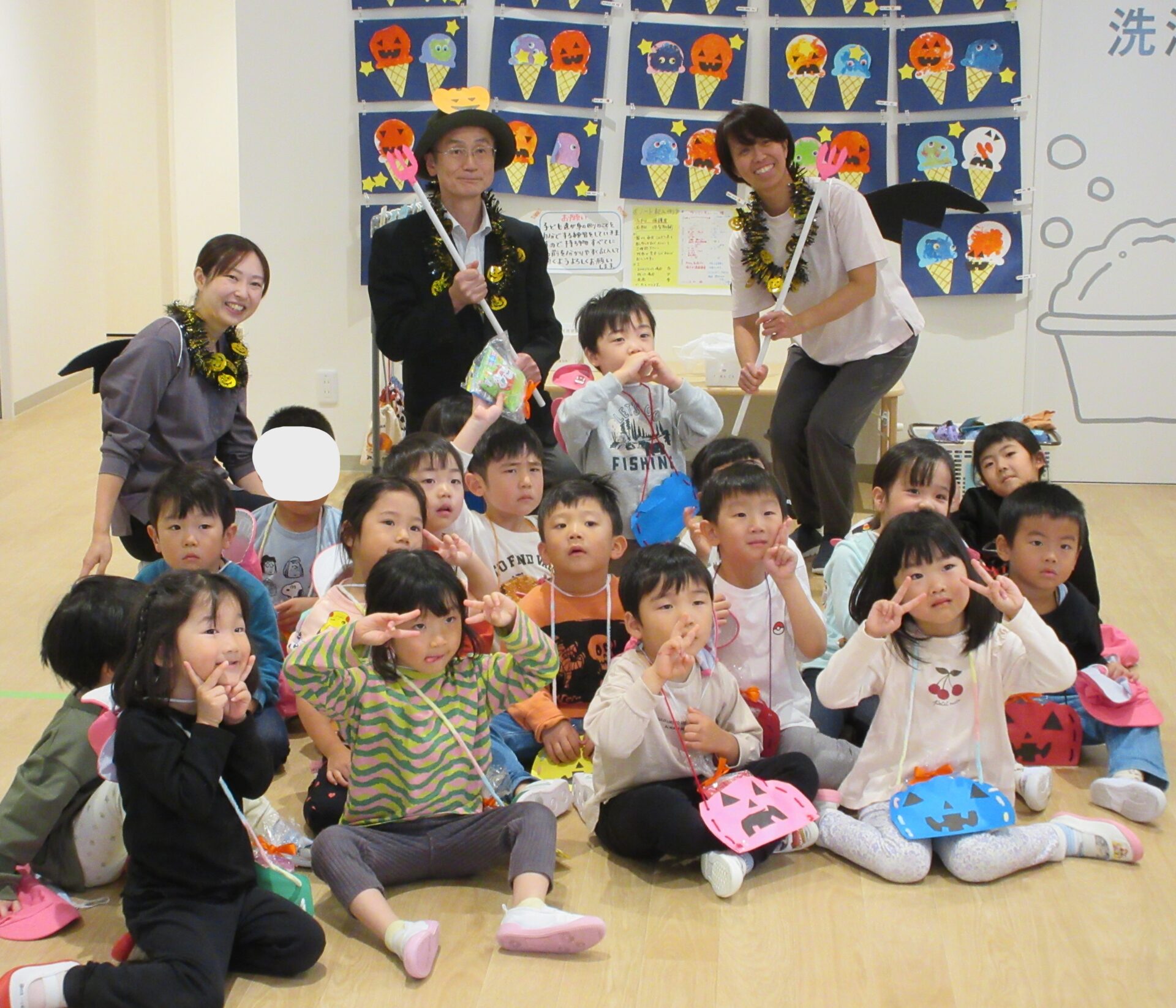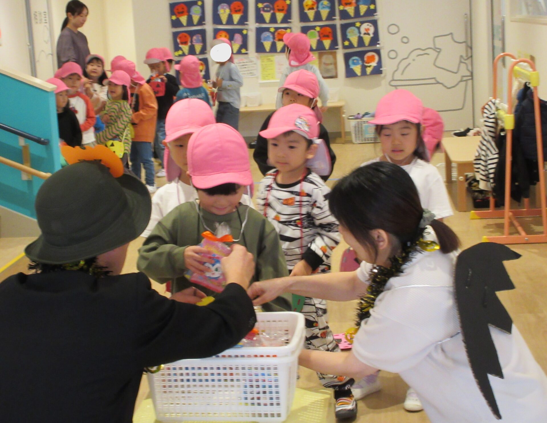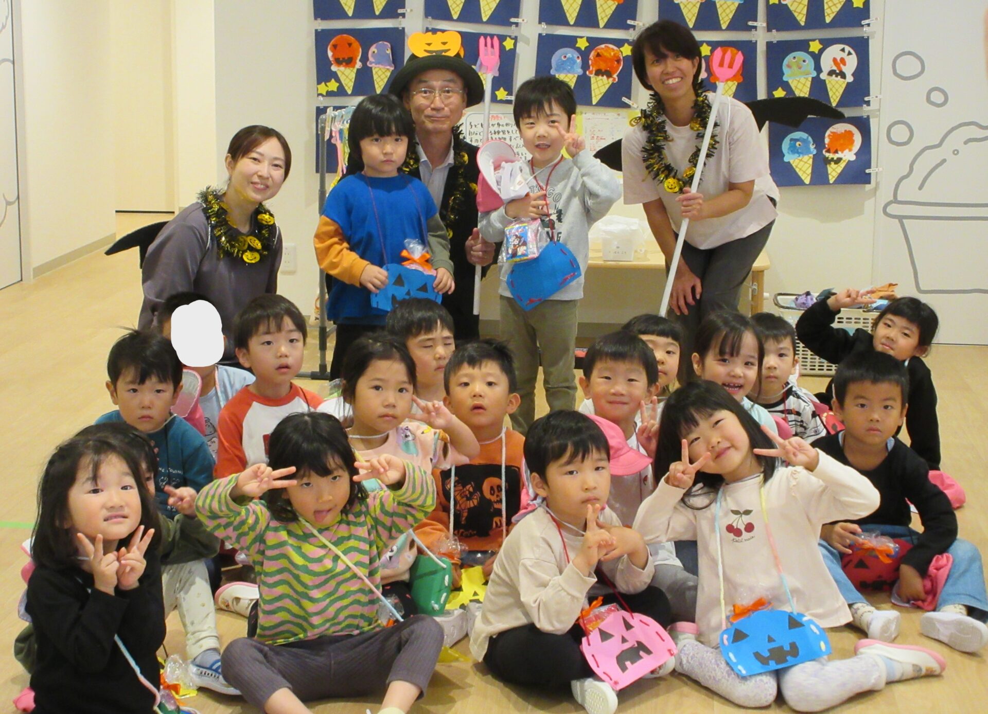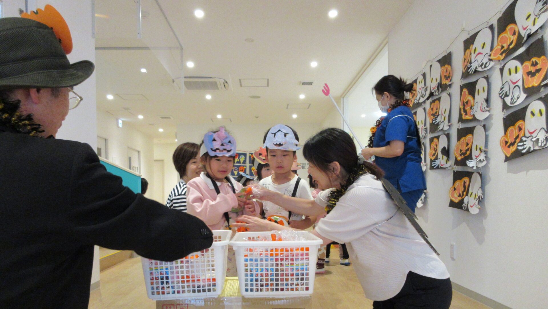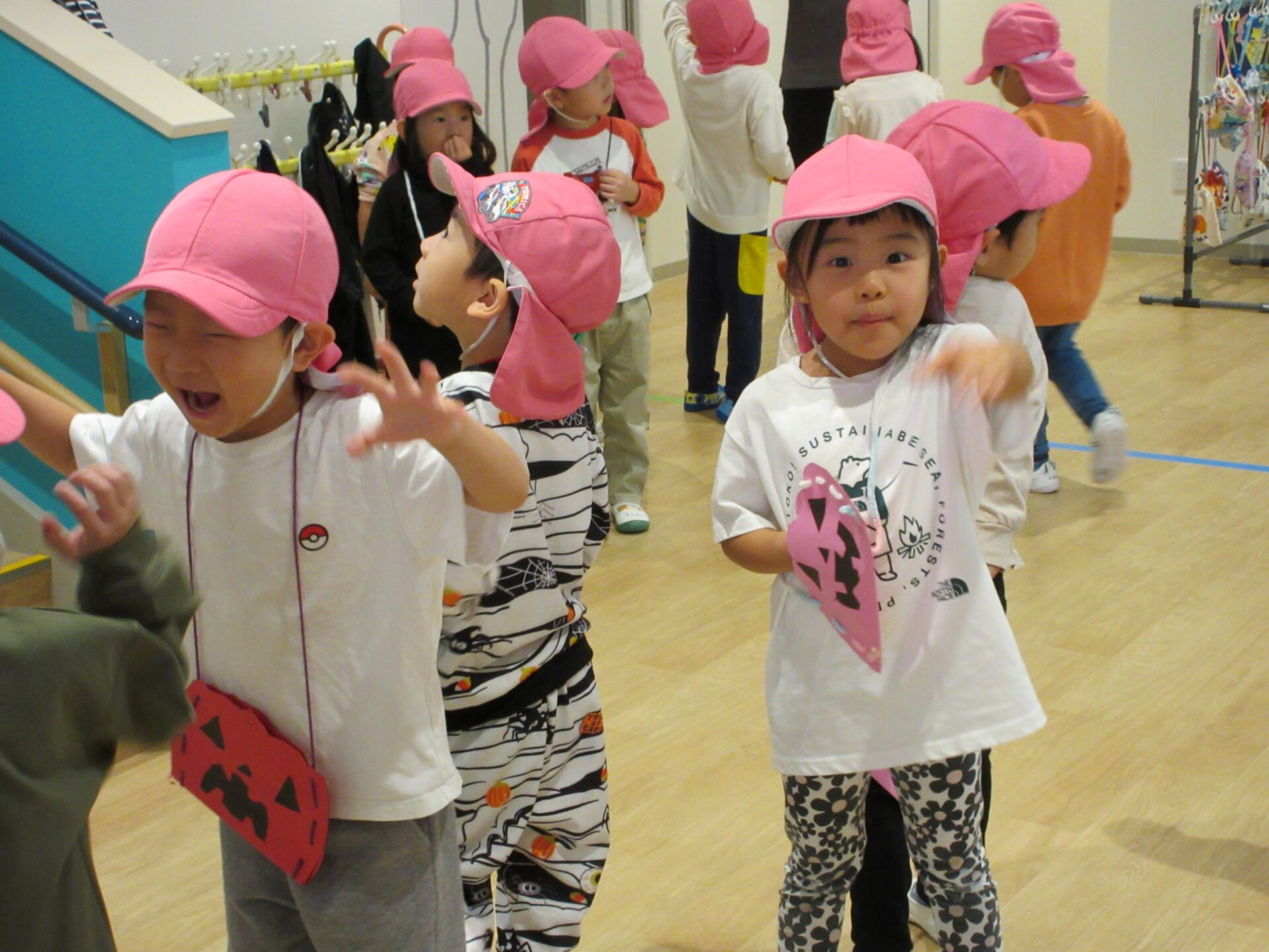 2024.11.08 お知らせ ブログ 👻トリック・オア・トリート🍬🦇(にじ組・そら組) 10/31(木)はハロウィンでした♪ こども園でも、ハロウィンの楽しい雰囲気を味わいましたよ👻 頭におばけやかぼちゃのお面と、かぼちゃのカバンをつけてにじ組さんが階段を降りてきましたよ♪みんな似合っていますね(*^^*) おやおや!?園長先生や、事務所の先生もハロウィンの仮装をしています!かぼちゃ男爵?コウモリ?悪魔かな!? 「とりっく おあ とりーと!」と言って、順番にお菓子をもらいましたよ♪ お菓子をもらえてうれしそうな笑顔です(^^) みんな楽しそうですね♪ 次はそら組さんです!そら組さんも素敵なハロウィンバックをつけています♪上手に毛糸を通していますね✨ お菓子をもらうときの合言葉「とりっく おあ とりーと! おかしをくれなきゃ いたずらしちゃうぞ👻」とお話する子どもたちも♪ はい!ポーズ📸 午後のおやつはハロウィンクッキーでした🍪おいしそうに食べていましたよ! 一覧へ戻る
