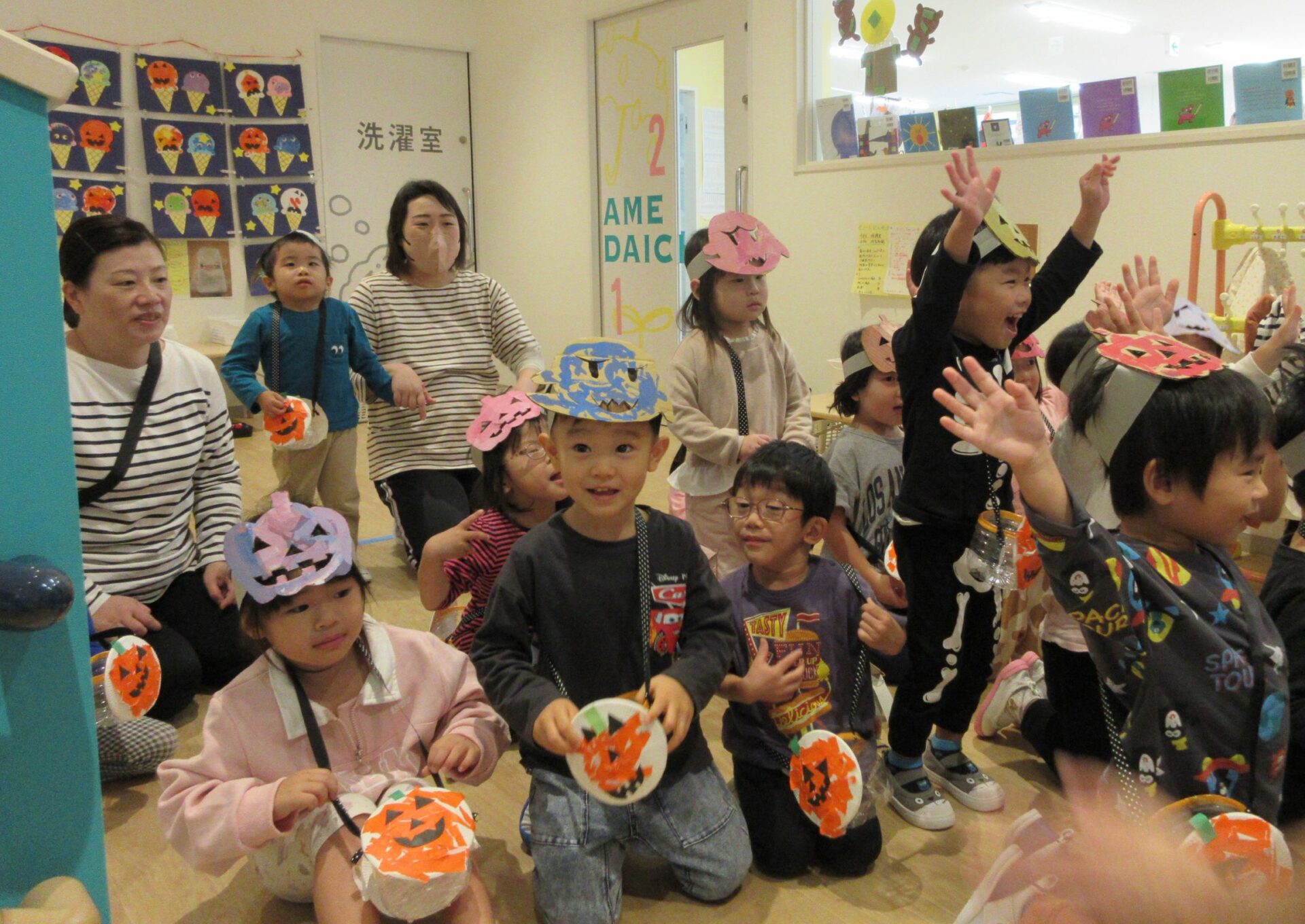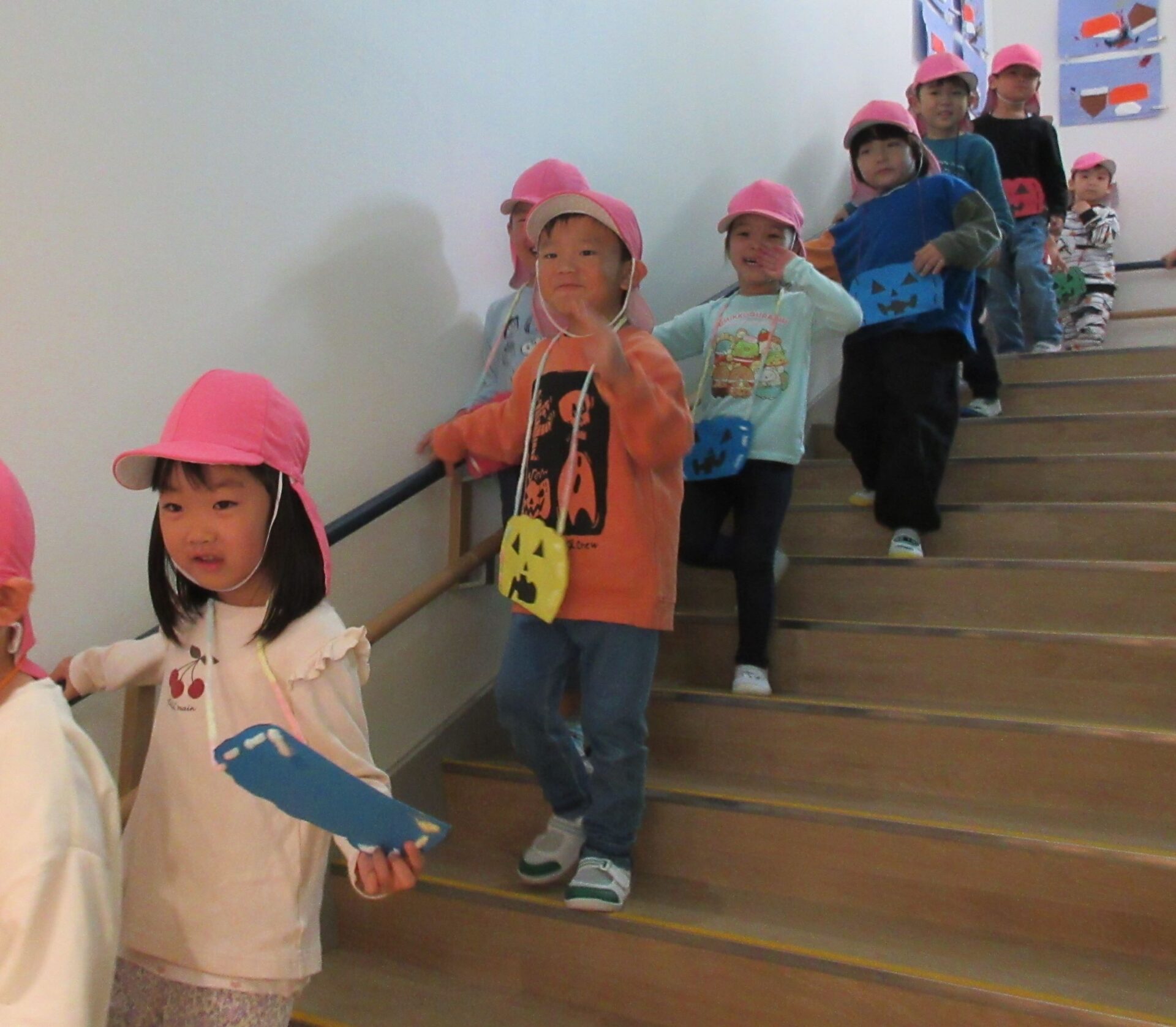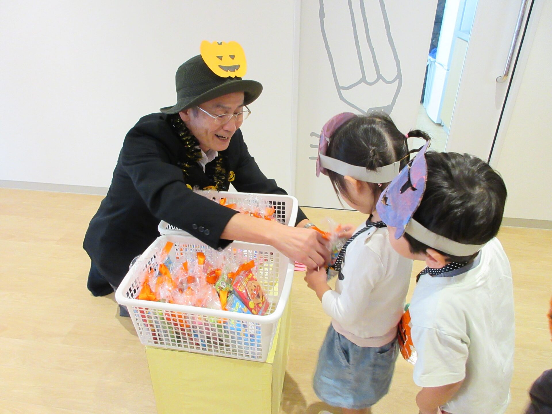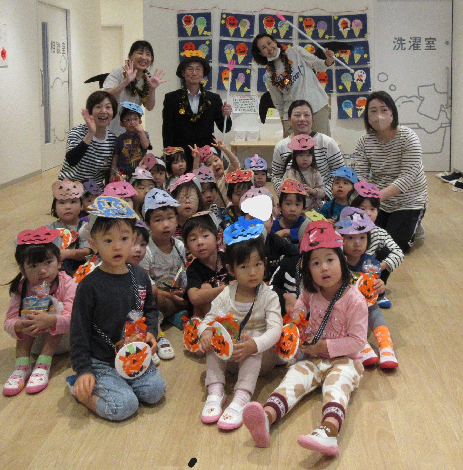 2024.11.08 お知らせ ブログ 👻トリック・オア・トリート🍬🦇(にじ組・そら組) 10/31(木)はハロウィンでした♪ こども園でも、ハロウィンの楽しい雰囲気を味わいましたよ👻 頭におばけやかぼちゃのお面と、かぼちゃのカバンをつけてにじ組さんが階段を降りてきましたよ♪みんな似合っていますね(*^^*) おやおや!?園長先生や、事務所の先生もハロウィンの仮装をしています!かぼちゃ男爵?コウモリ?悪魔かな!? 「とりっく おあ とりーと!」と言って、順番にお菓子をもらいましたよ♪ お菓子をもらえてうれしそうな笑顔です(^^) みんな楽しそうですね♪ 次はそら組さんです!そら組さんも素敵なハロウィンバックをつけています♪上手に毛糸を通していますね✨ お菓子をもらうときの合言葉「とりっく おあ とりーと! おかしをくれなきゃ いたずらしちゃうぞ👻」とお話する子どもたちも♪ はい!ポーズ📸 午後のおやつはハロウィンクッキーでした🍪おいしそうに食べていましたよ! 一覧へ戻る