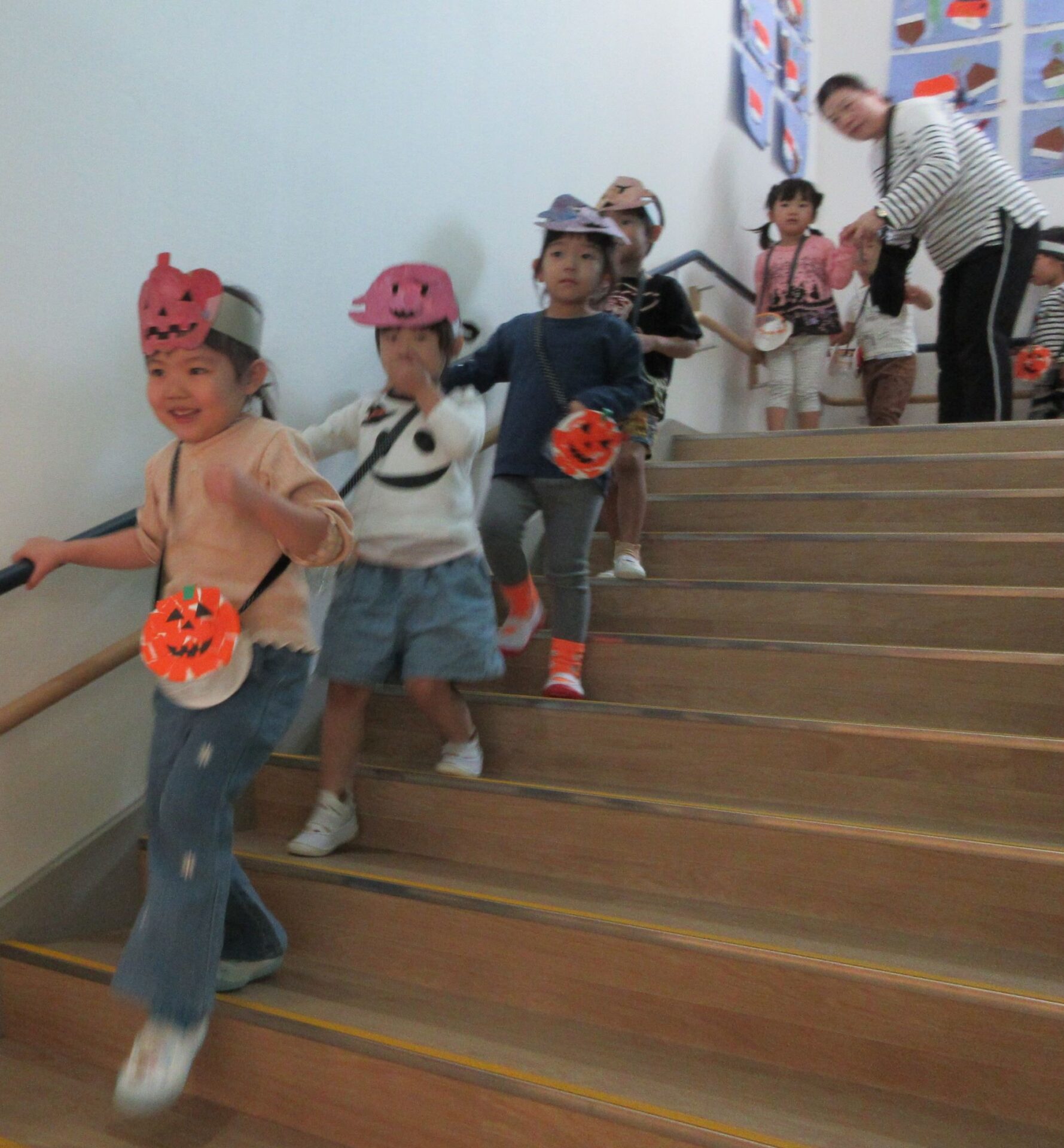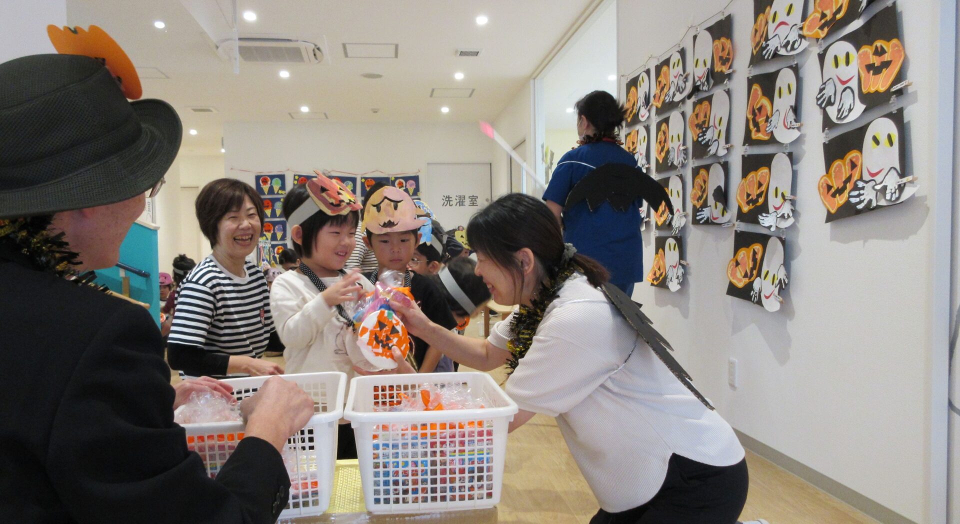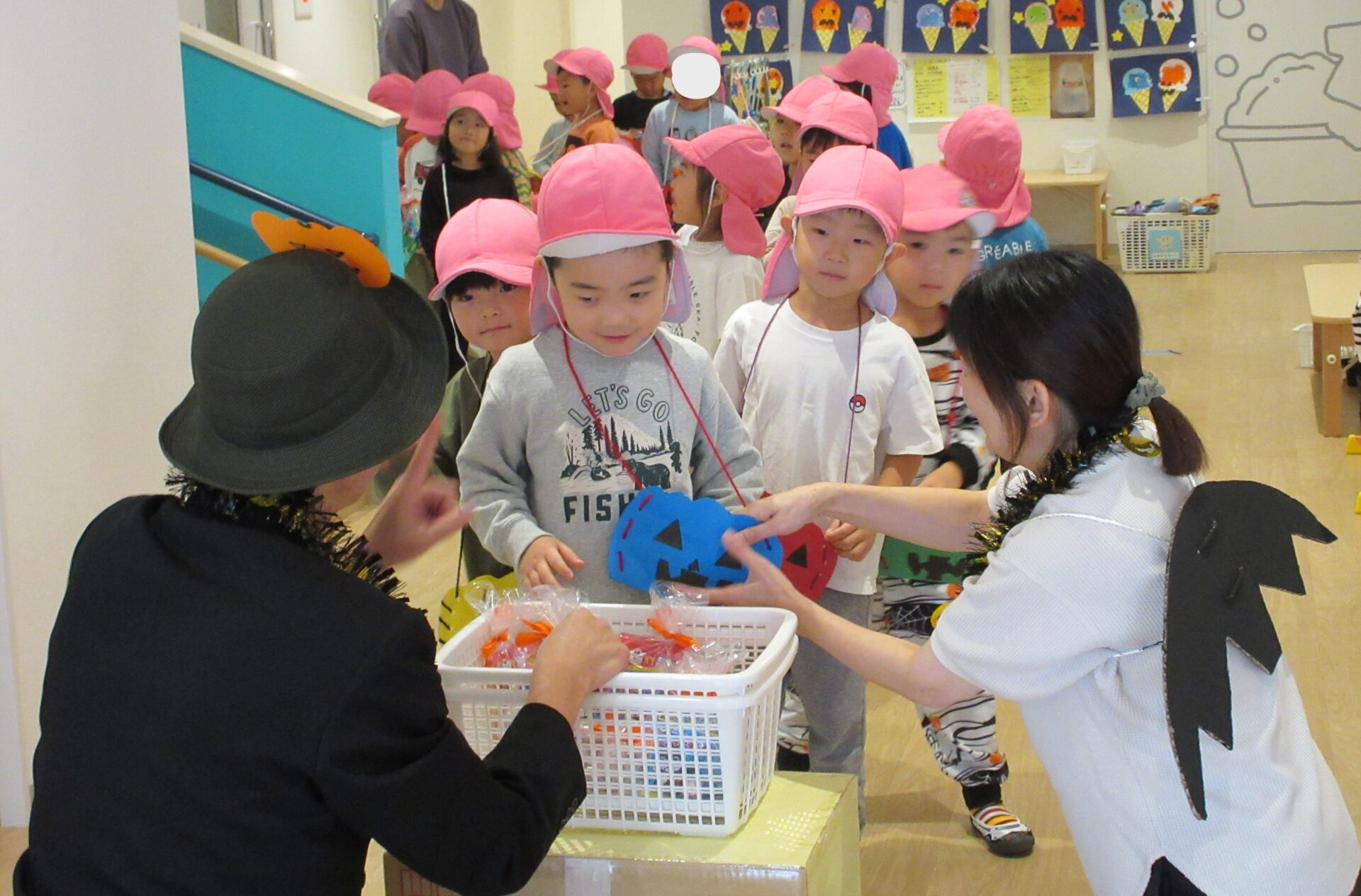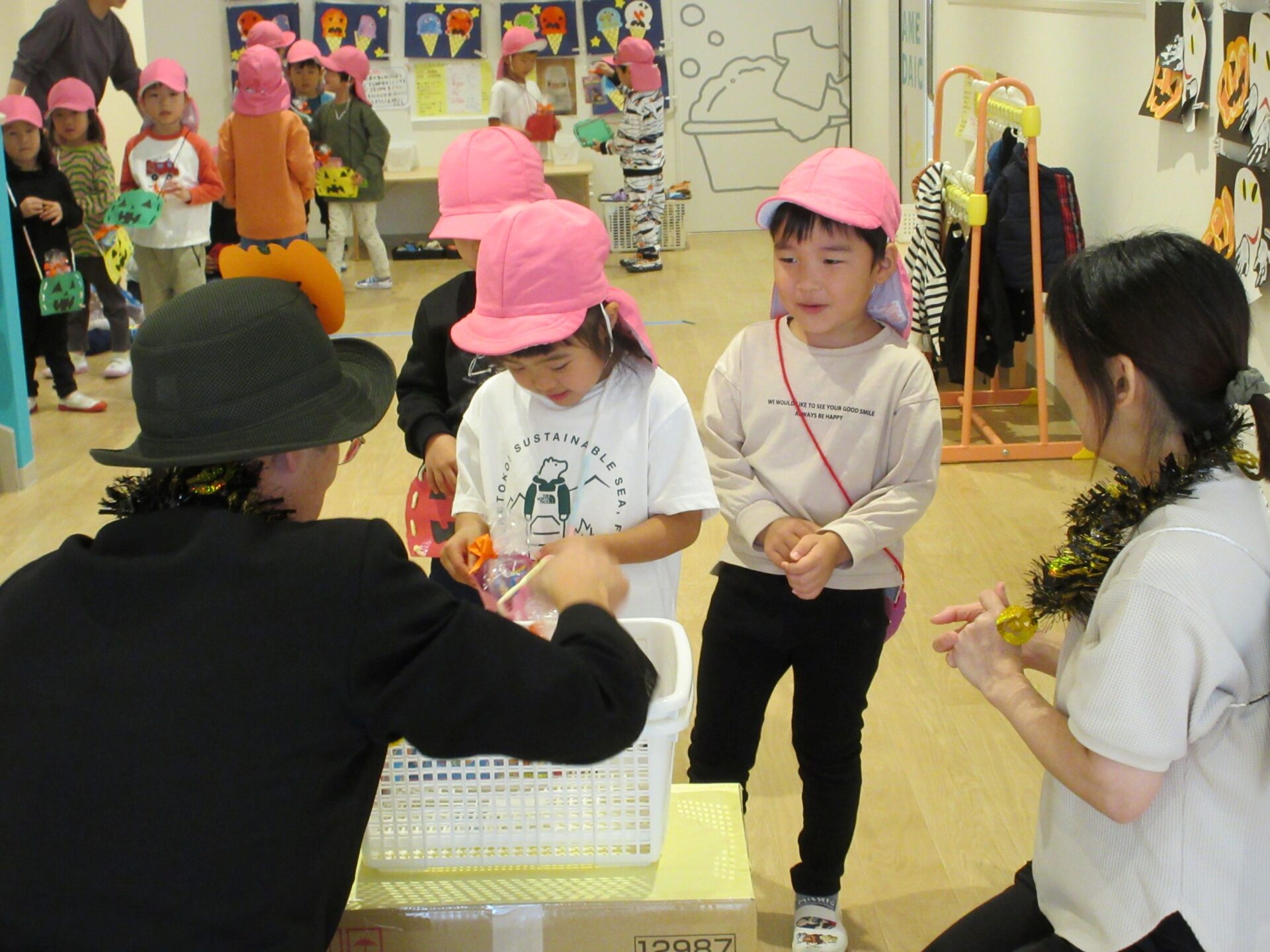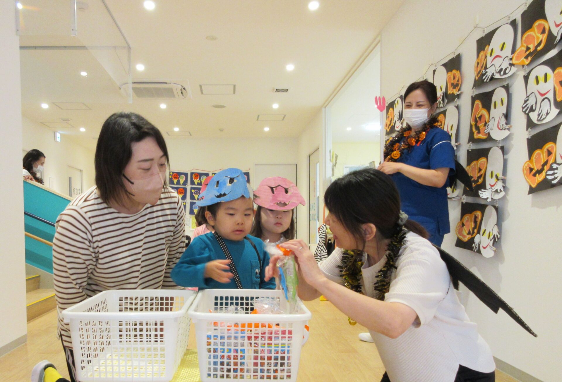 2024.11.08 お知らせ ブログ 👻トリック・オア・トリート🍬🦇(にじ組・そら組) 10/31(木)はハロウィンでした♪ こども園でも、ハロウィンの楽しい雰囲気を味わいましたよ👻 頭におばけやかぼちゃのお面と、かぼちゃのカバンをつけてにじ組さんが階段を降りてきましたよ♪みんな似合っていますね(*^^*) おやおや!?園長先生や、事務所の先生もハロウィンの仮装をしています!かぼちゃ男爵?コウモリ?悪魔かな!? 「とりっく おあ とりーと!」と言って、順番にお菓子をもらいましたよ♪ お菓子をもらえてうれしそうな笑顔です(^^) みんな楽しそうですね♪ 次はそら組さんです!そら組さんも素敵なハロウィンバックをつけています♪上手に毛糸を通していますね✨ お菓子をもらうときの合言葉「とりっく おあ とりーと! おかしをくれなきゃ いたずらしちゃうぞ👻」とお話する子どもたちも♪ はい!ポーズ📸 午後のおやつはハロウィンクッキーでした🍪おいしそうに食べていましたよ! 一覧へ戻る