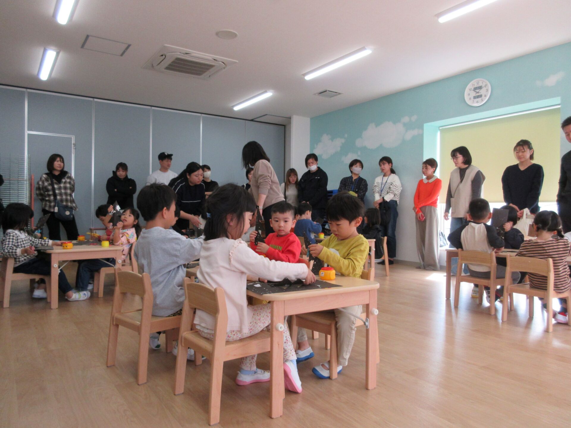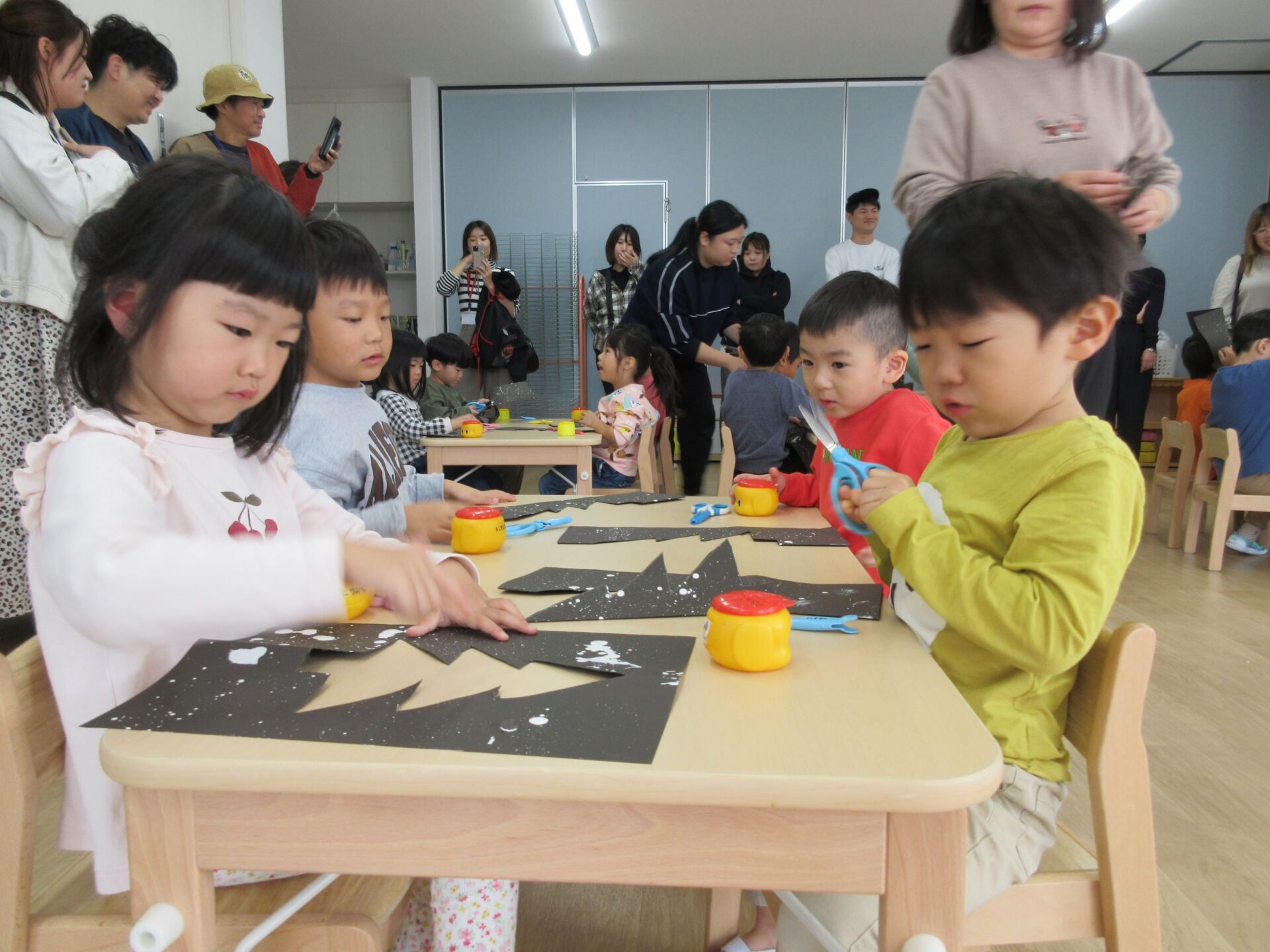 11月12日(火)参観日に、12月の製作でクリスマスツリー作りをしました。ハサミで2枚一緒にツリーや星を切ったり折り紙をしたりしましたよ。