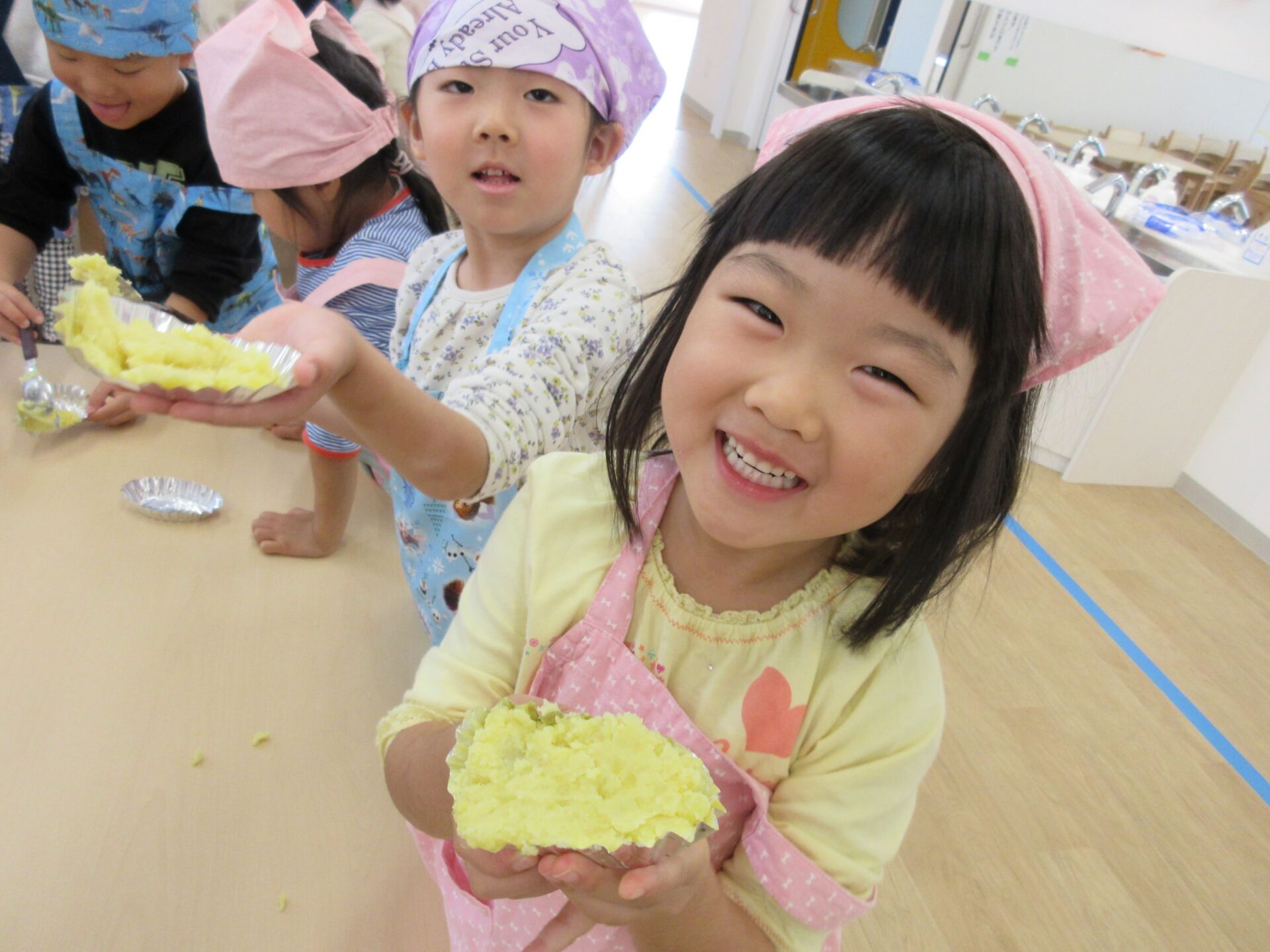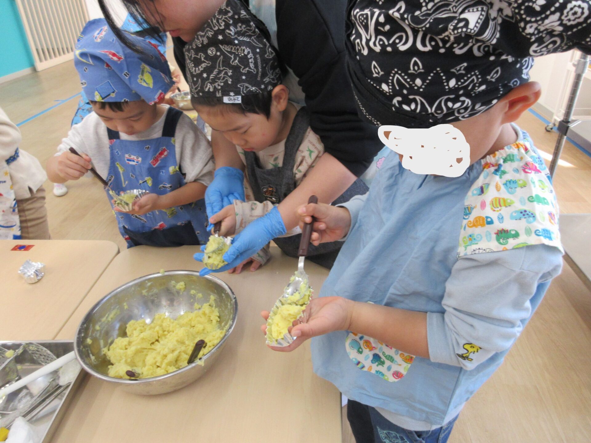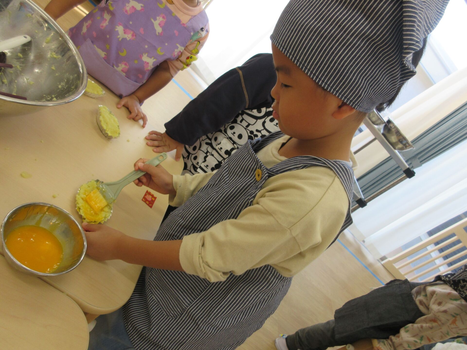 そして、14日(木)は楽しみにしていたクッキング♪今回はスイートポテトづくりに挑戦です。マッシャーを使ってお芋をつぶして、お砂糖や牛乳を入れますよ。