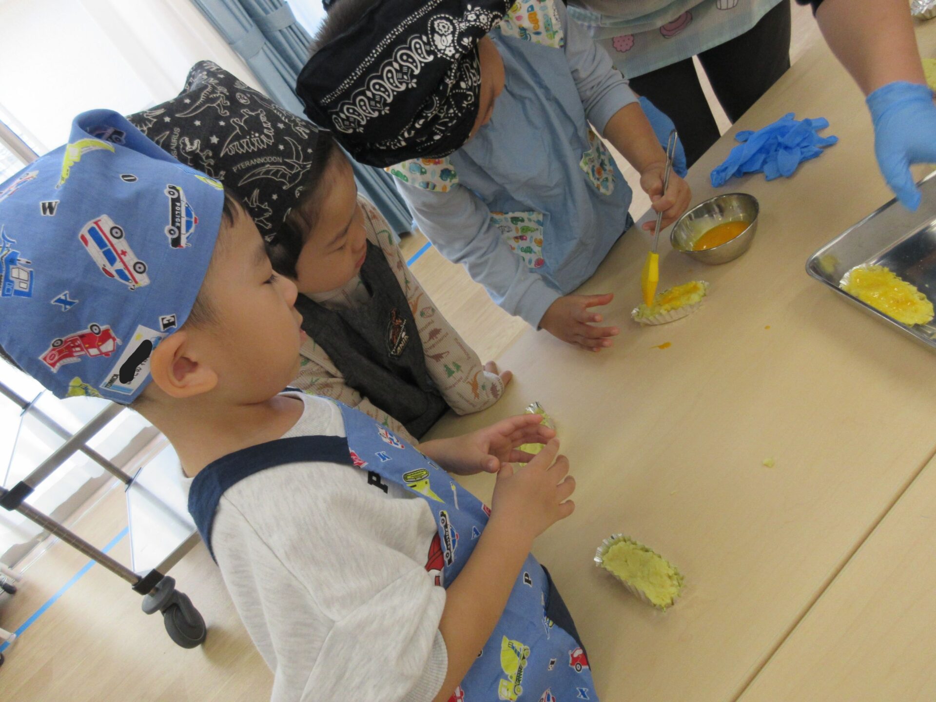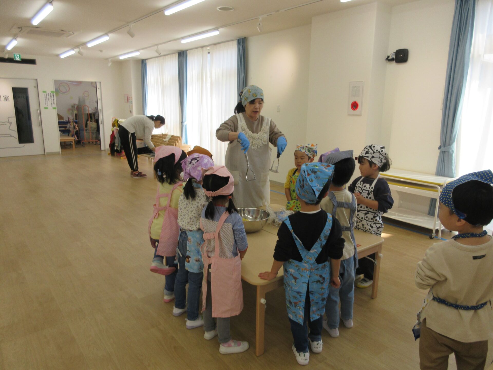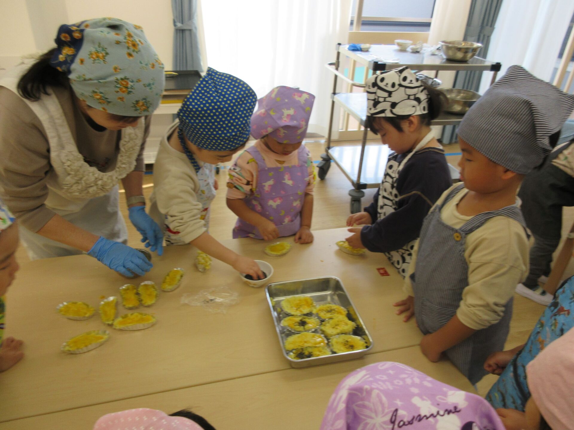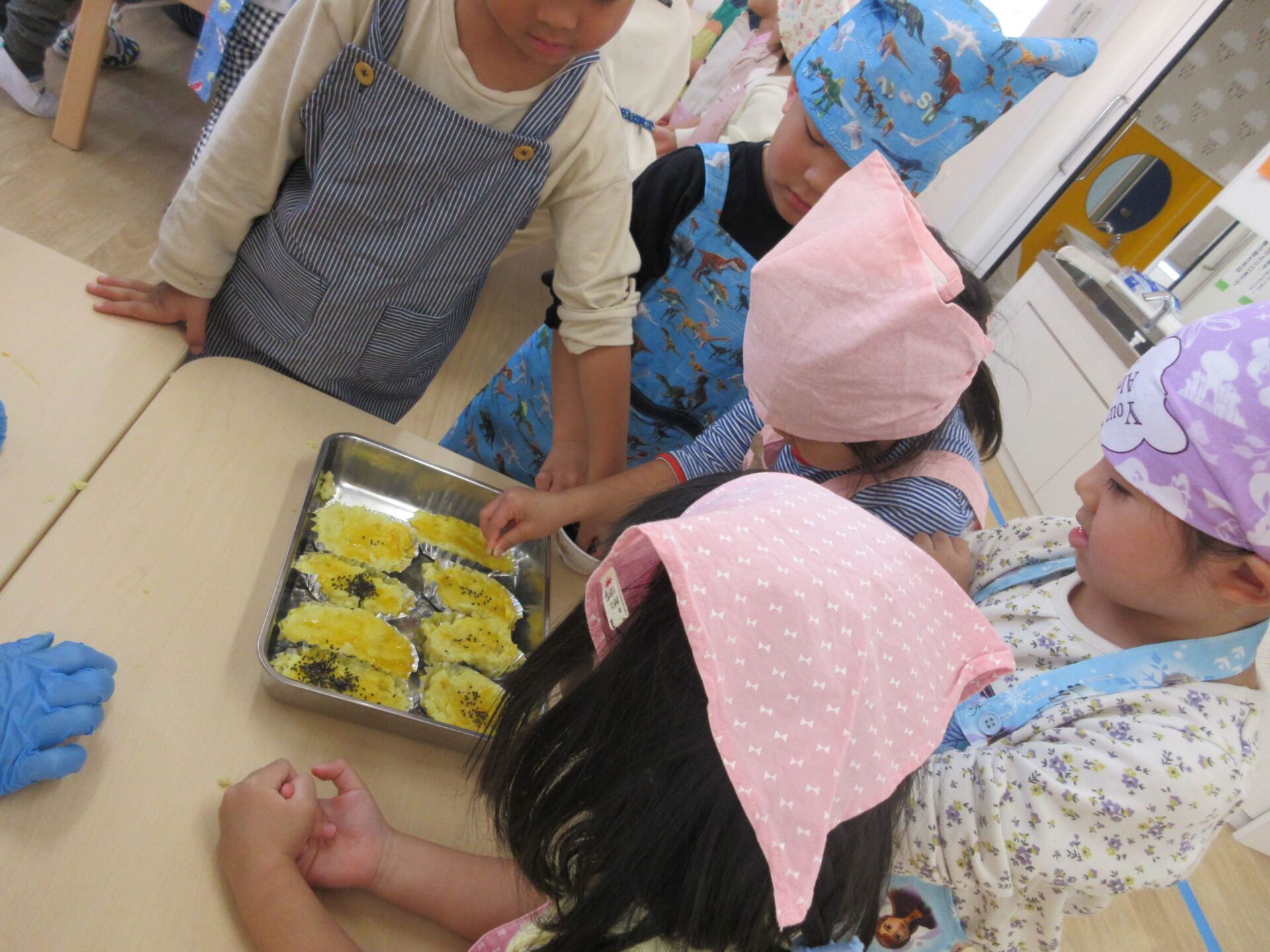そして、14日(木)は楽しみにしていたクッキング♪今回はスイートポテトづくりに挑戦です。マッシャーを使ってお芋をつぶして、お砂糖や牛乳を入れますよ。