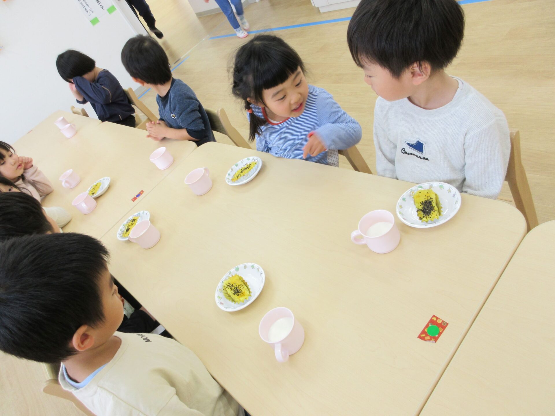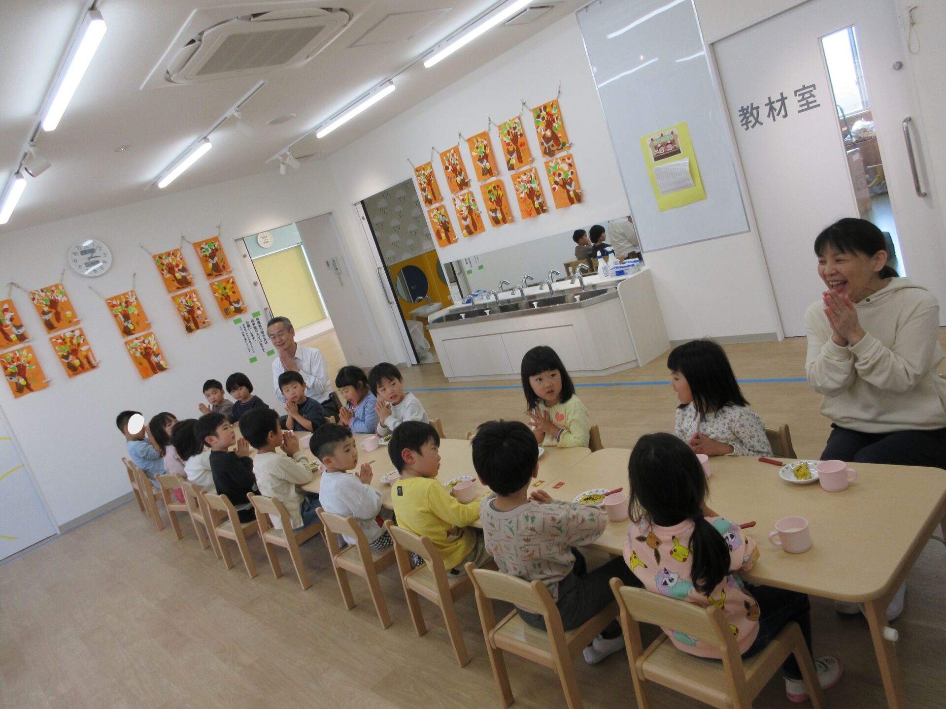 3時のおやつの時間に、園長先生と塚田先生を招待してみーんなでいただきまーす!「おいしい!」「甘い」とってもおいしかったようでお代わりするみんな。次は何をつくりましょうか?
