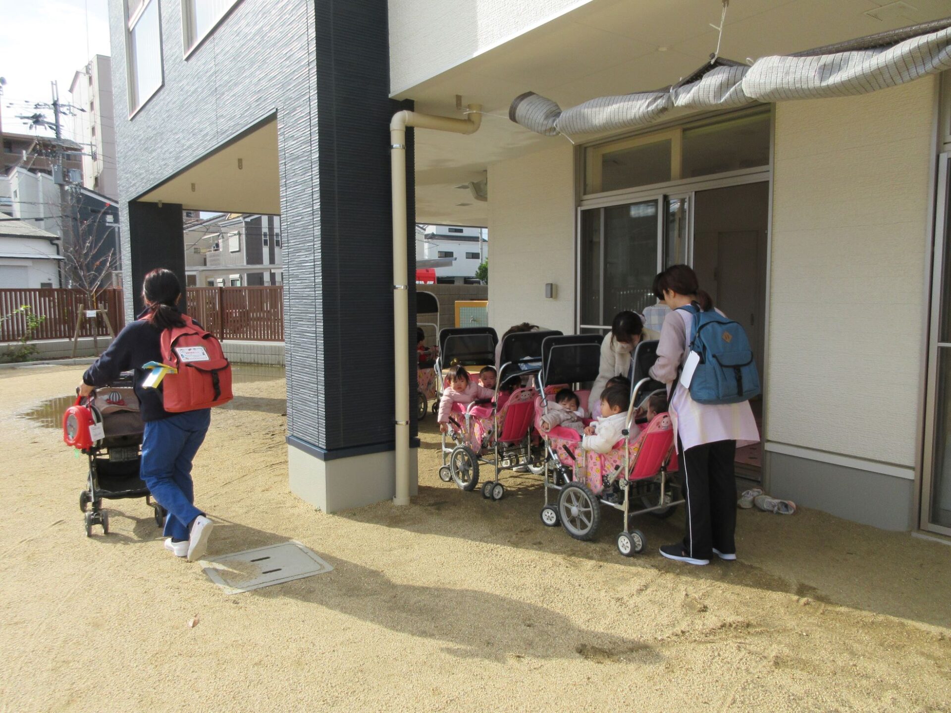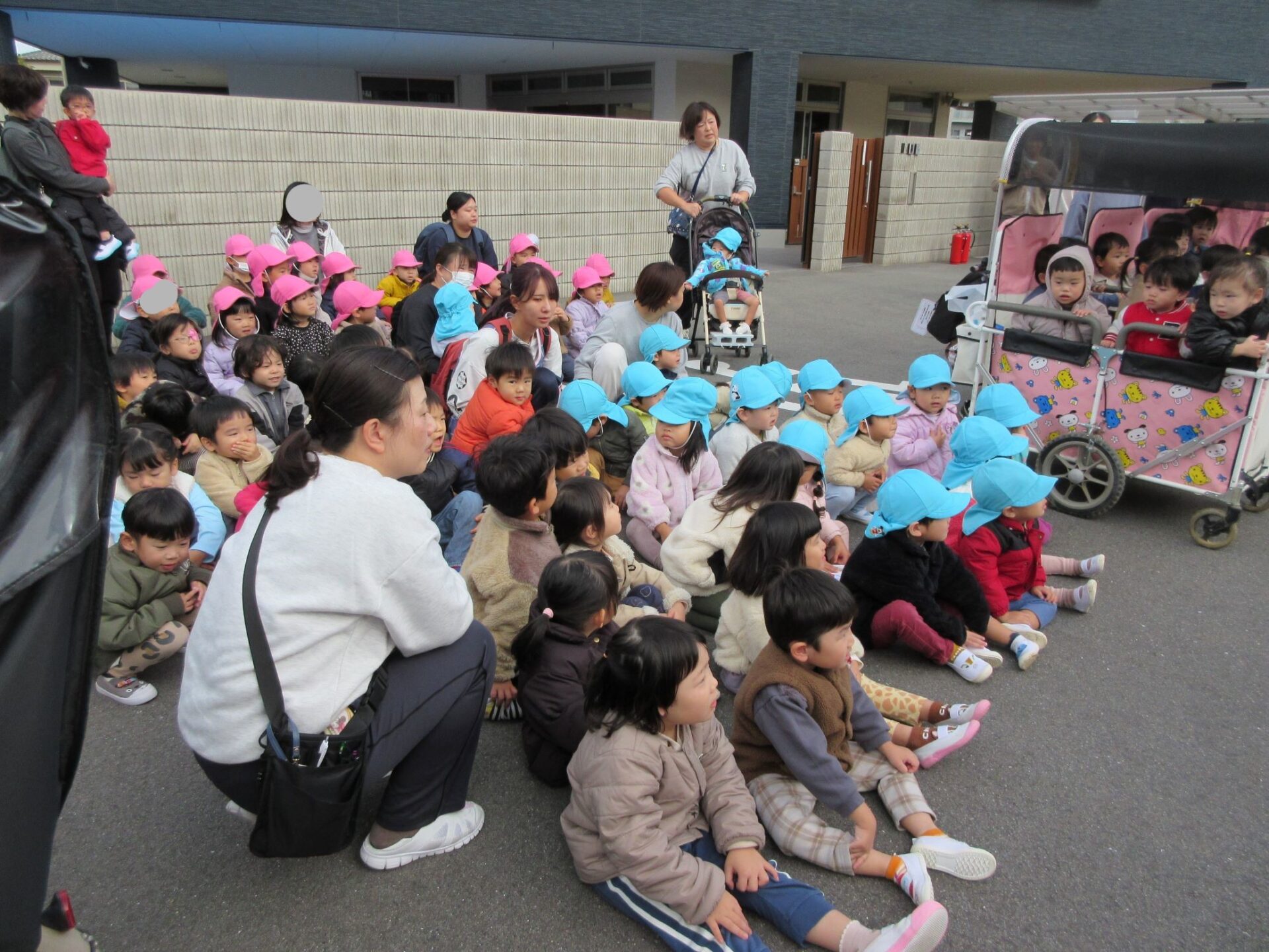 1階のクラスは、園庭側の窓から外に出ました。2階のクラスは、非常階段を下りて、集合場所の駐車場に向かいました。