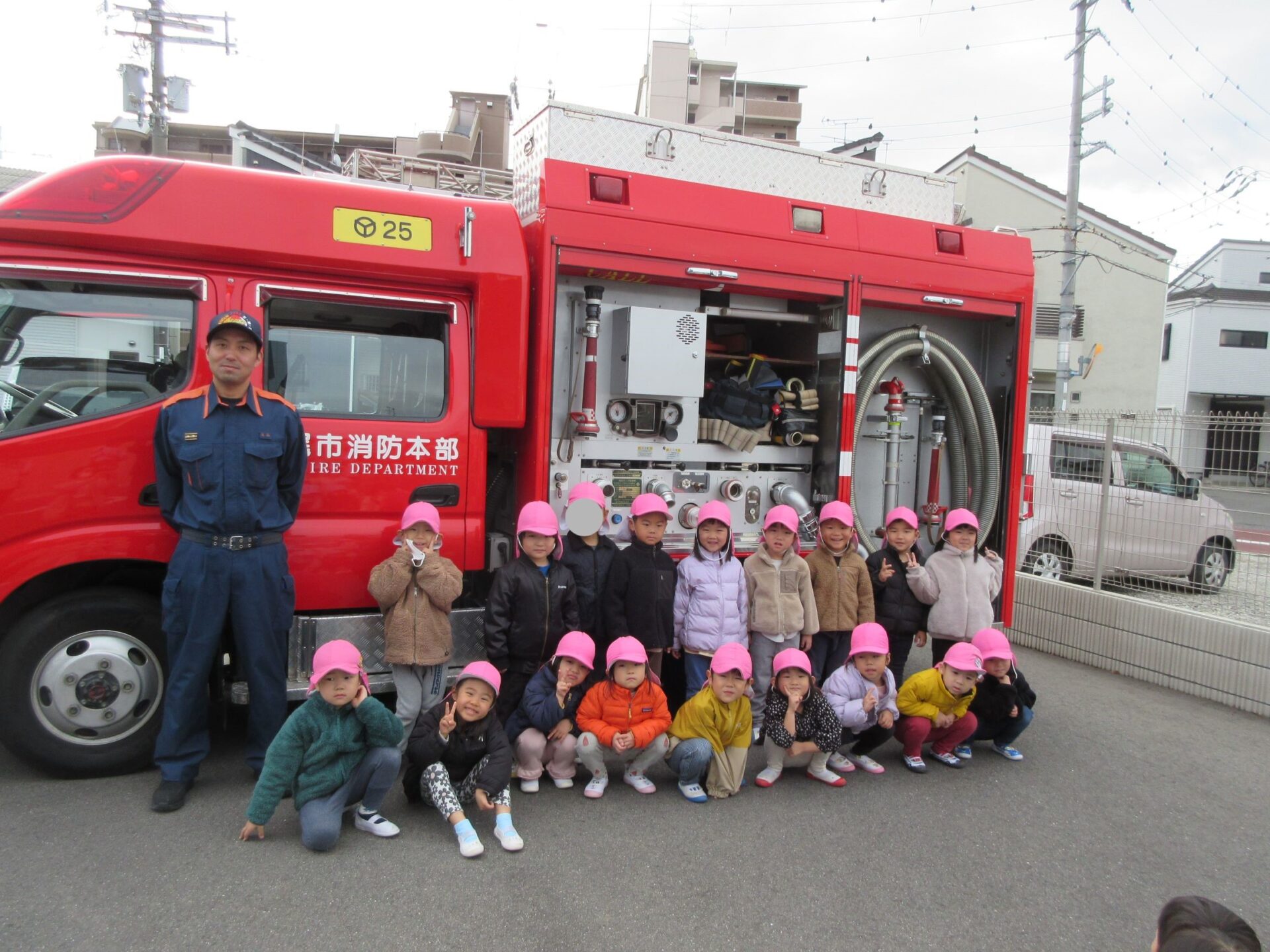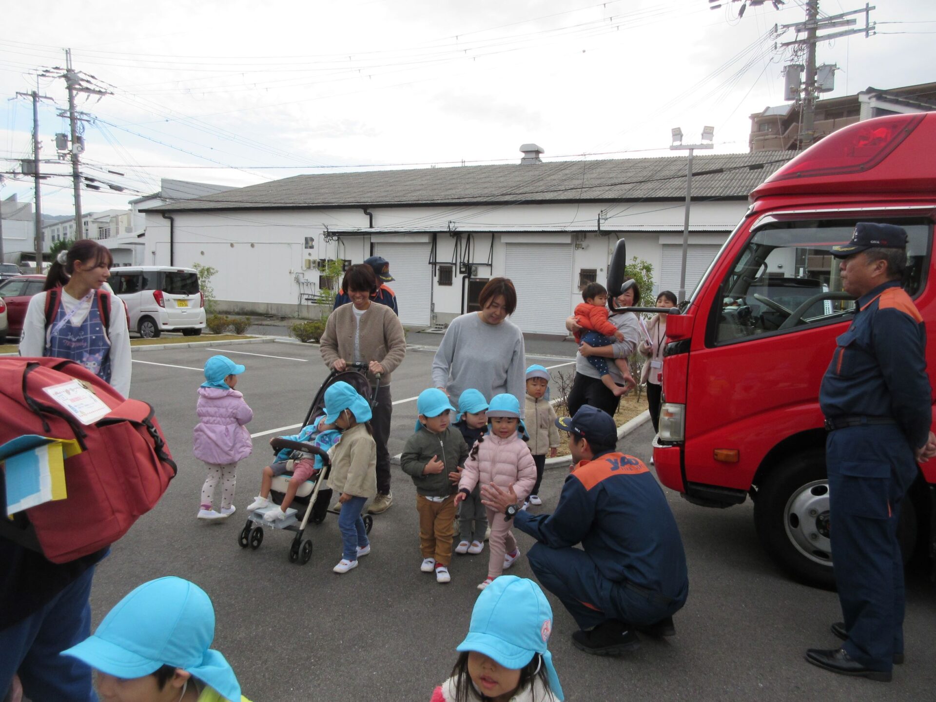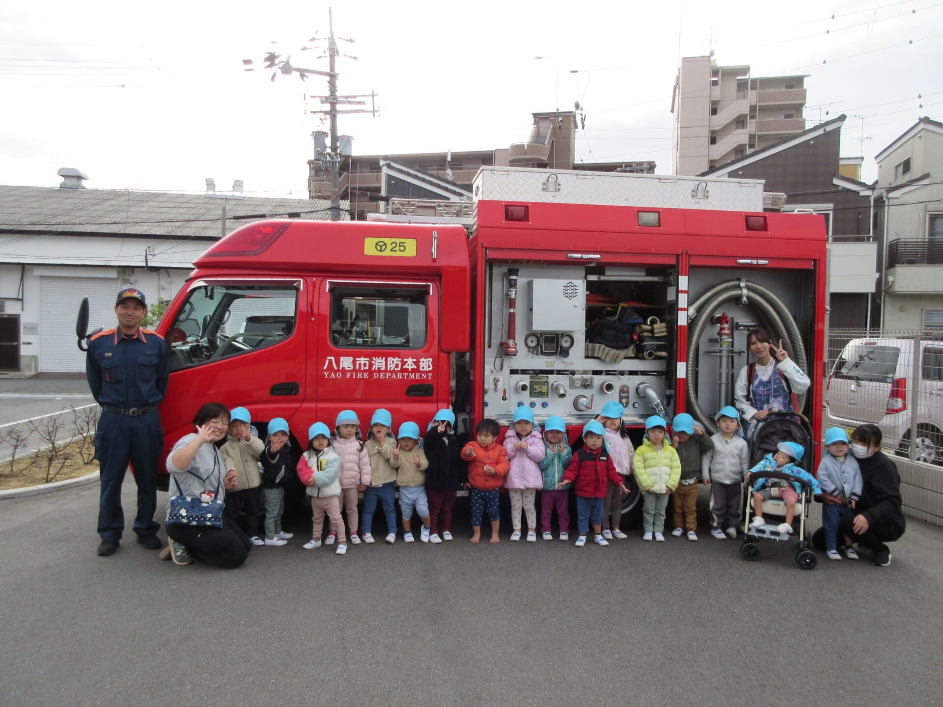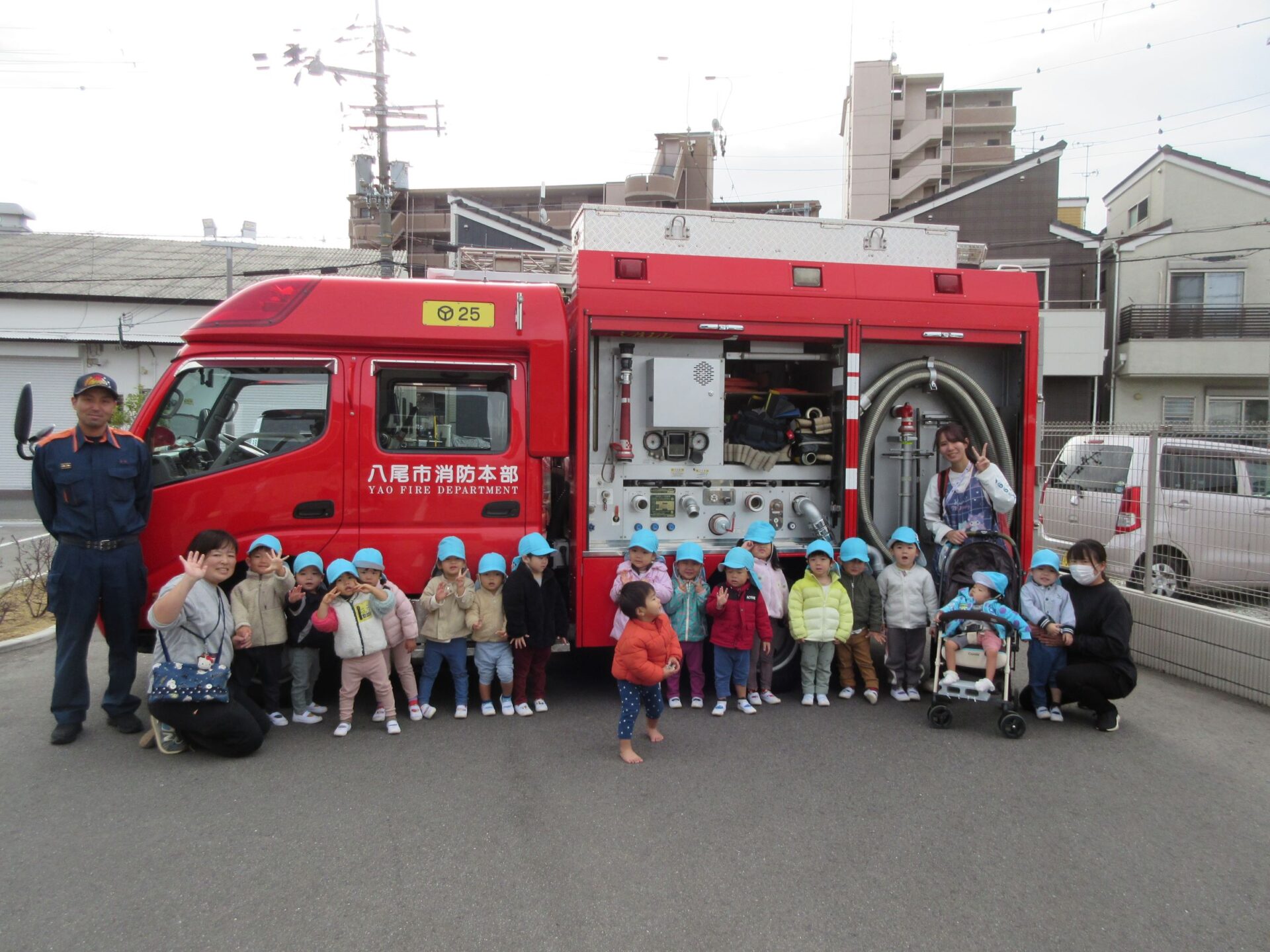 消防士さんにお礼をみんなで伝えて、そのあと、記念の写真を撮りました。はじめに、1歳だいち組。