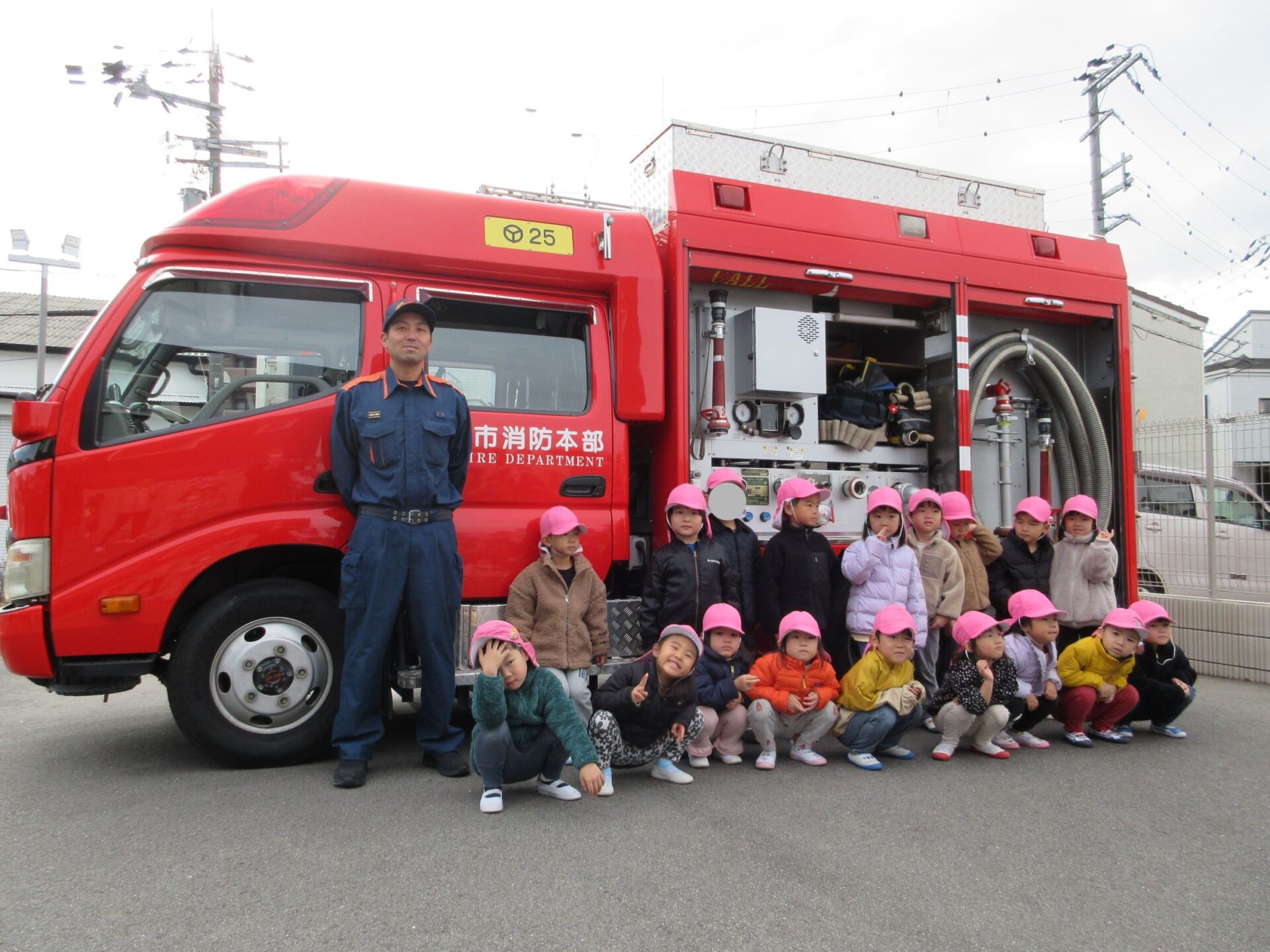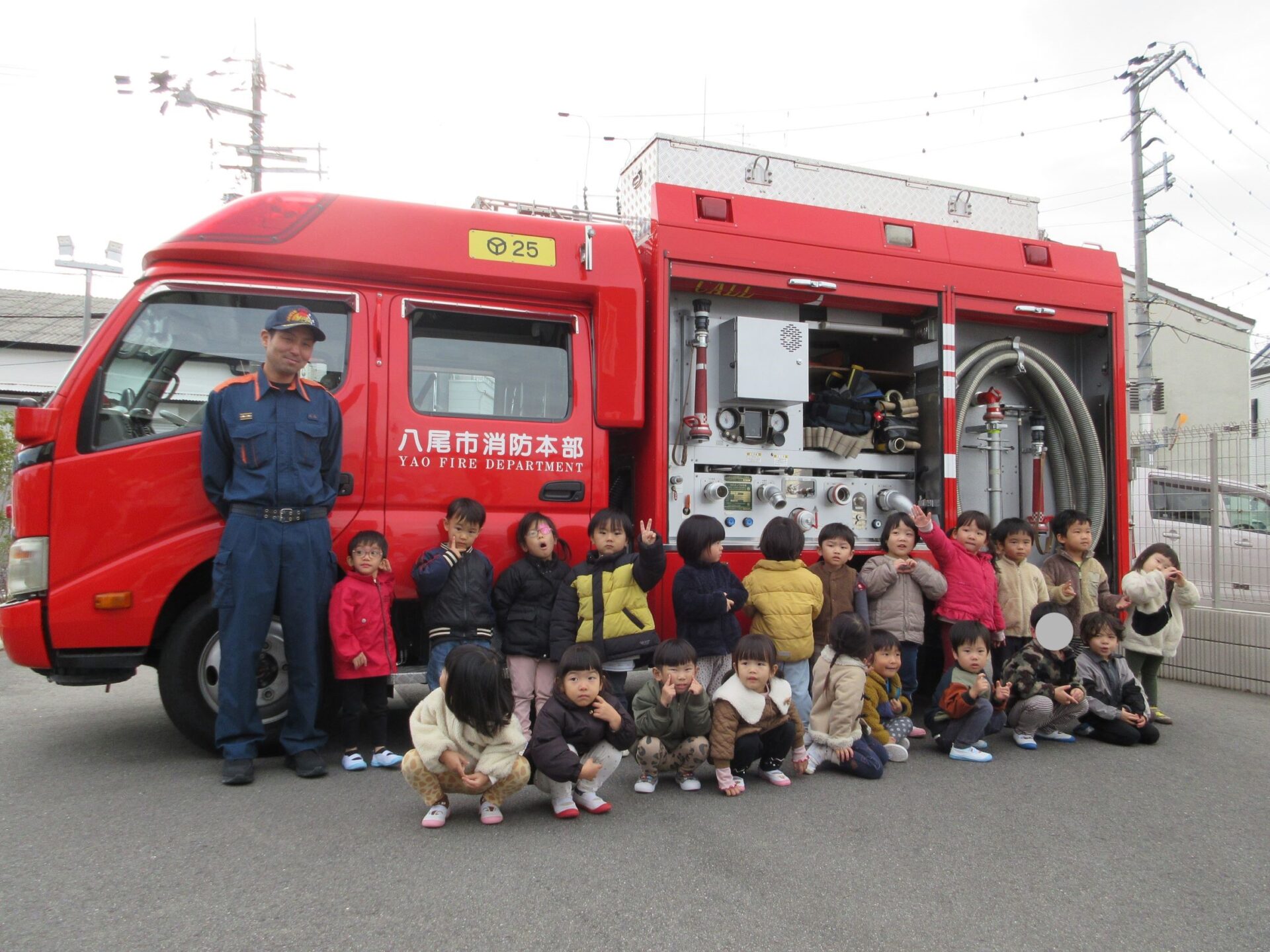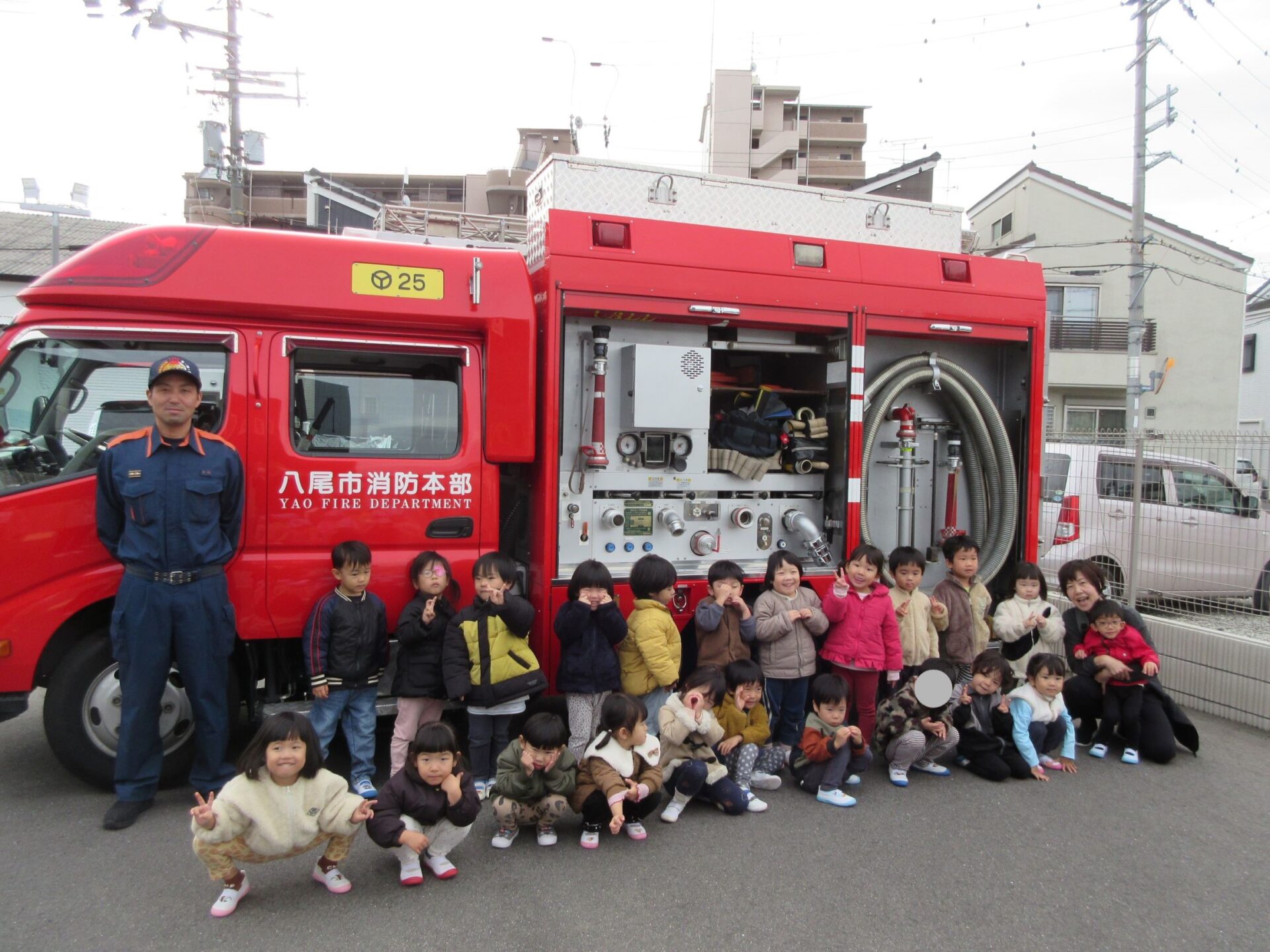 消防士さんにお礼をみんなで伝えて、そのあと、記念の写真を撮りました。はじめに、1歳だいち組。