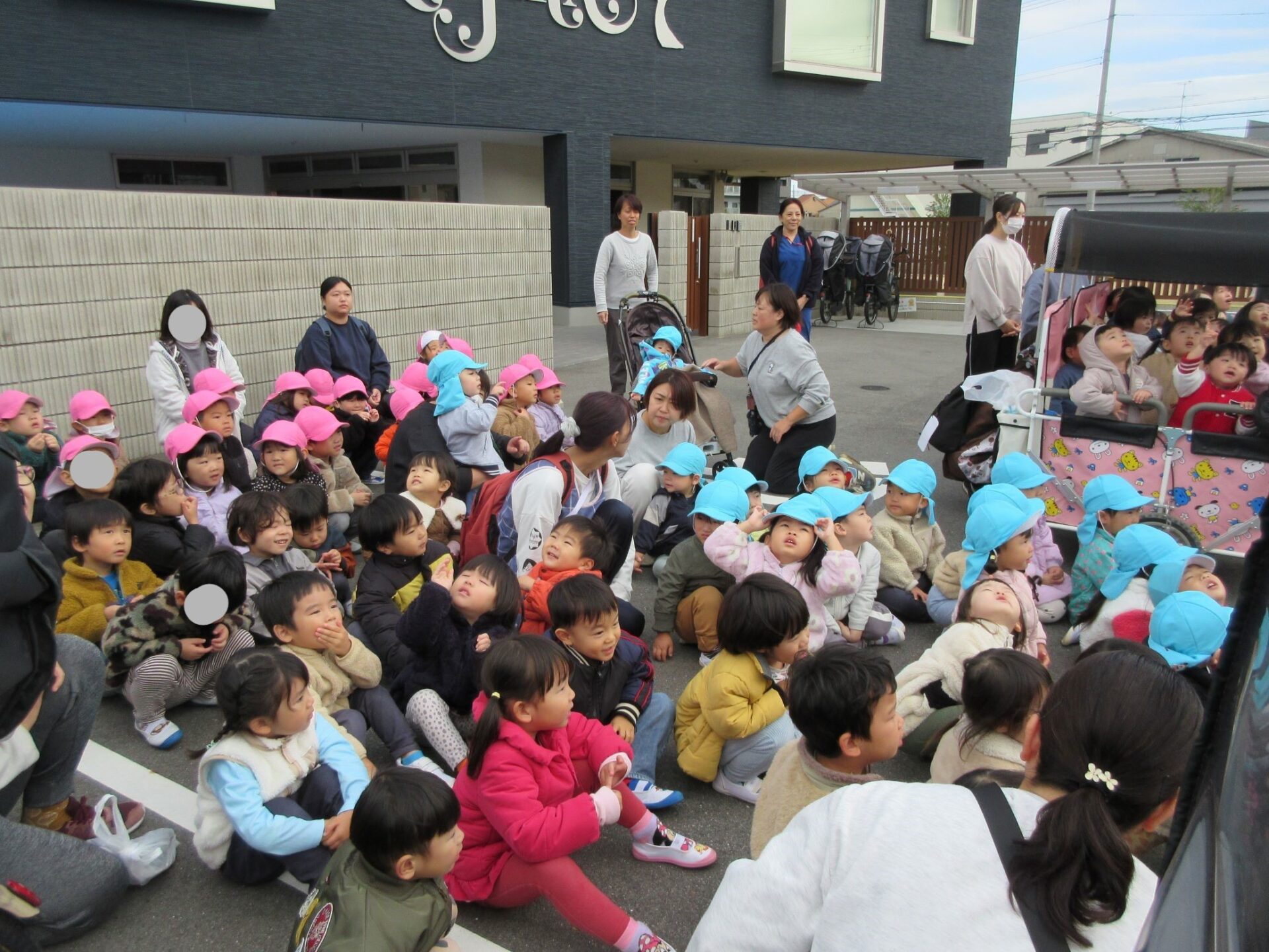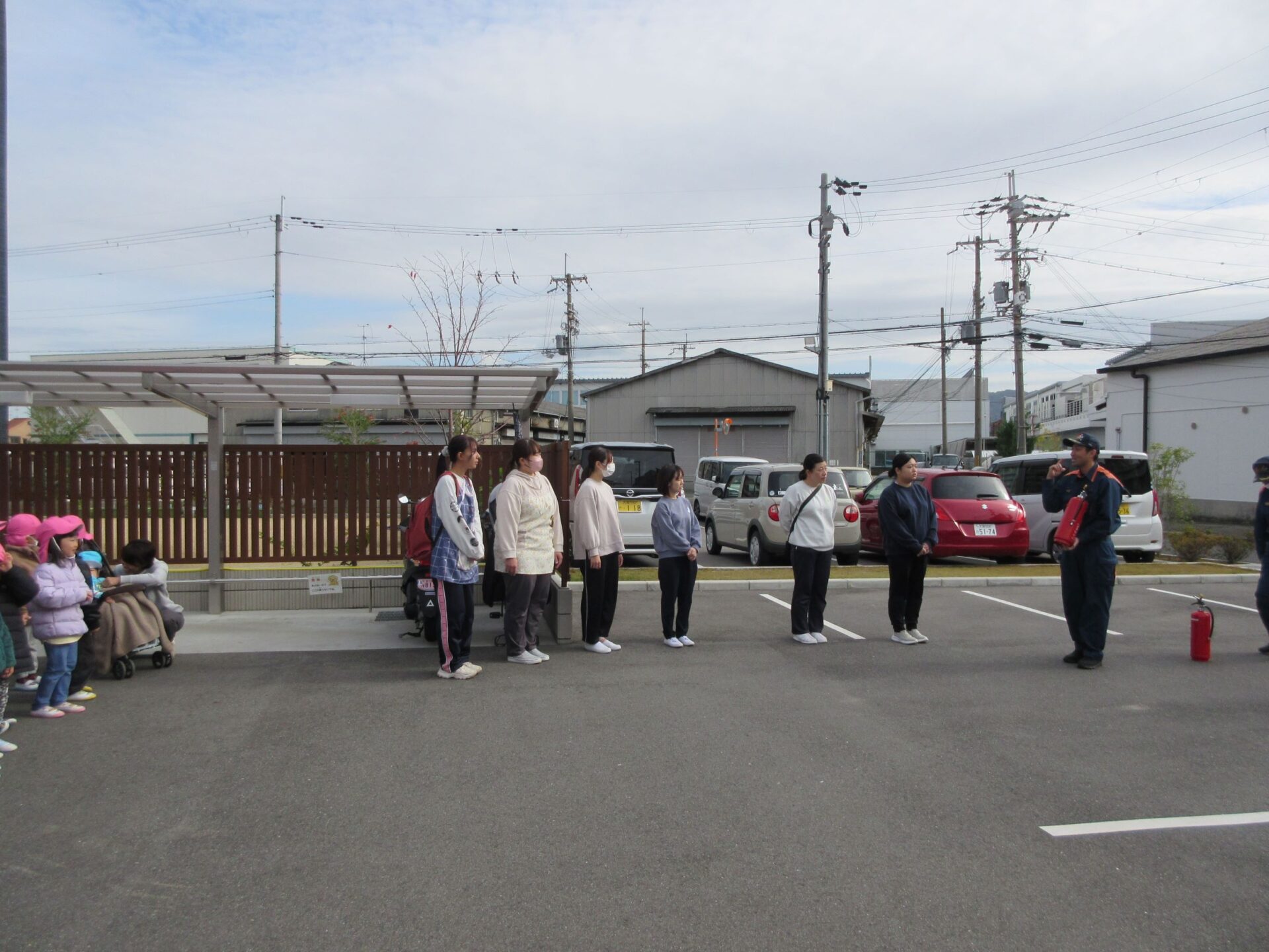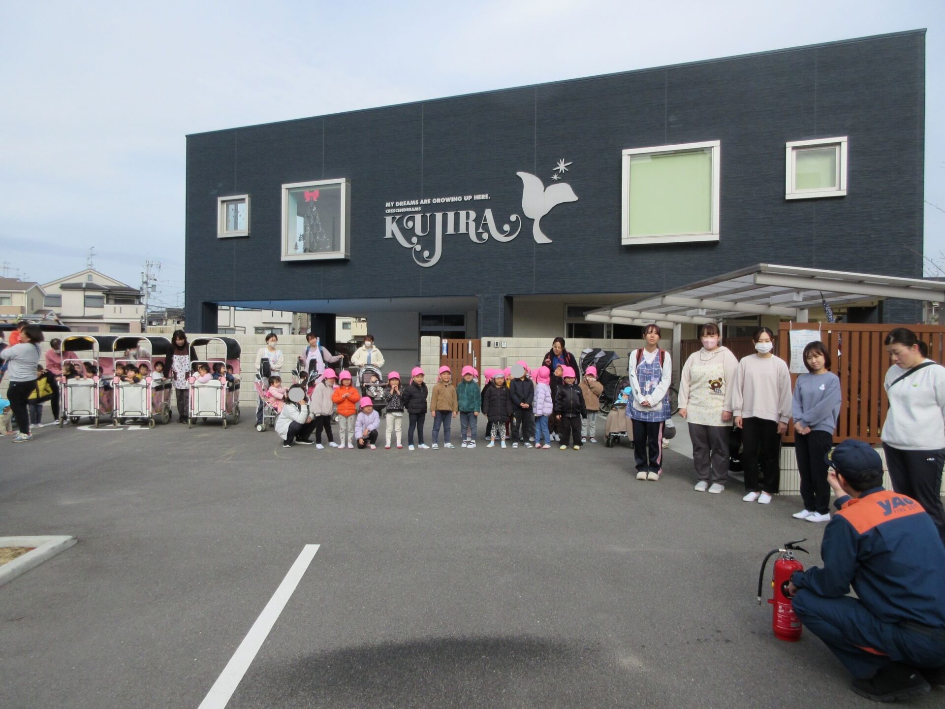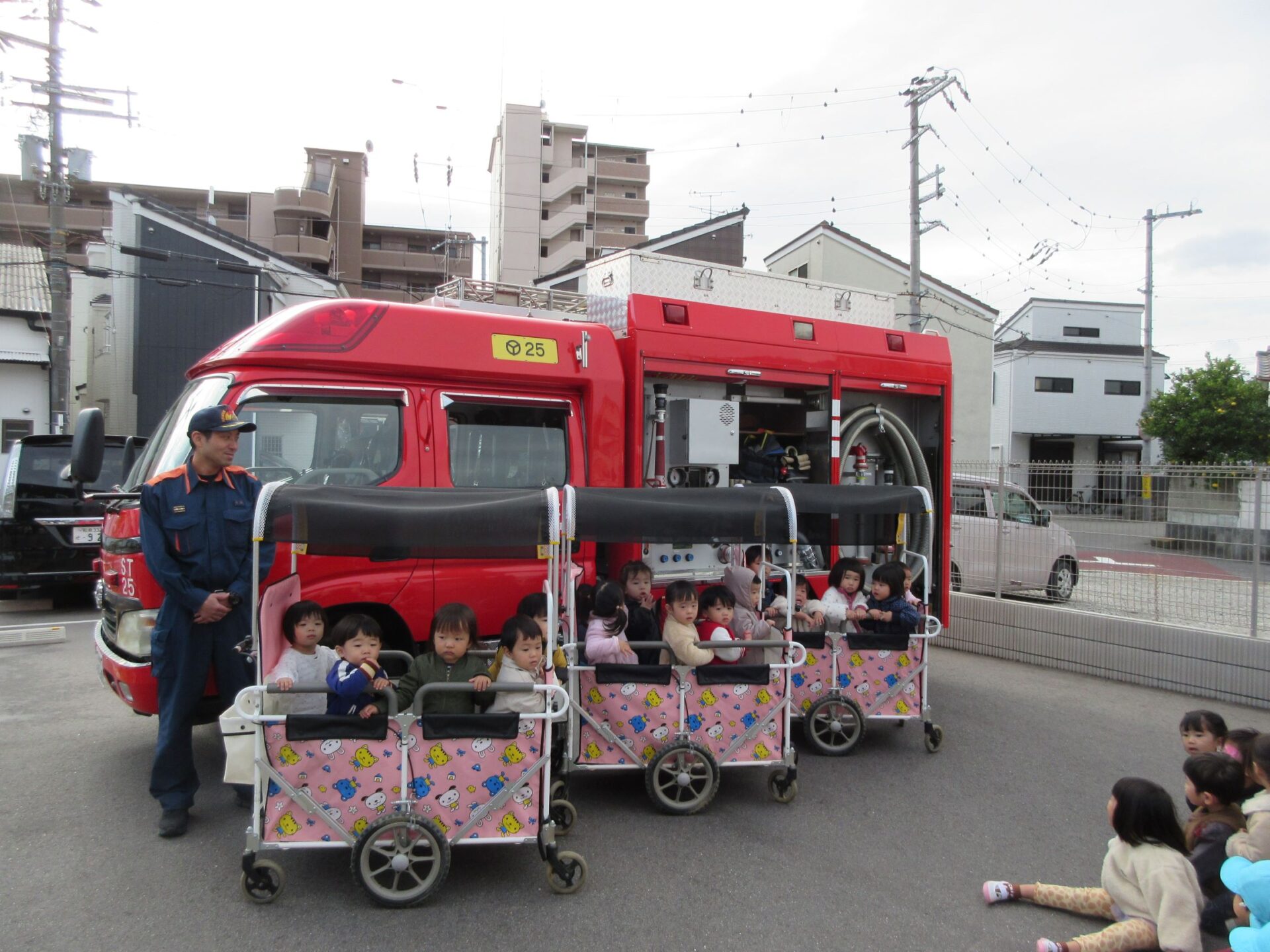 消防士さんにお礼をみんなで伝えて、そのあと、記念の写真を撮りました。はじめに、1歳だいち組。