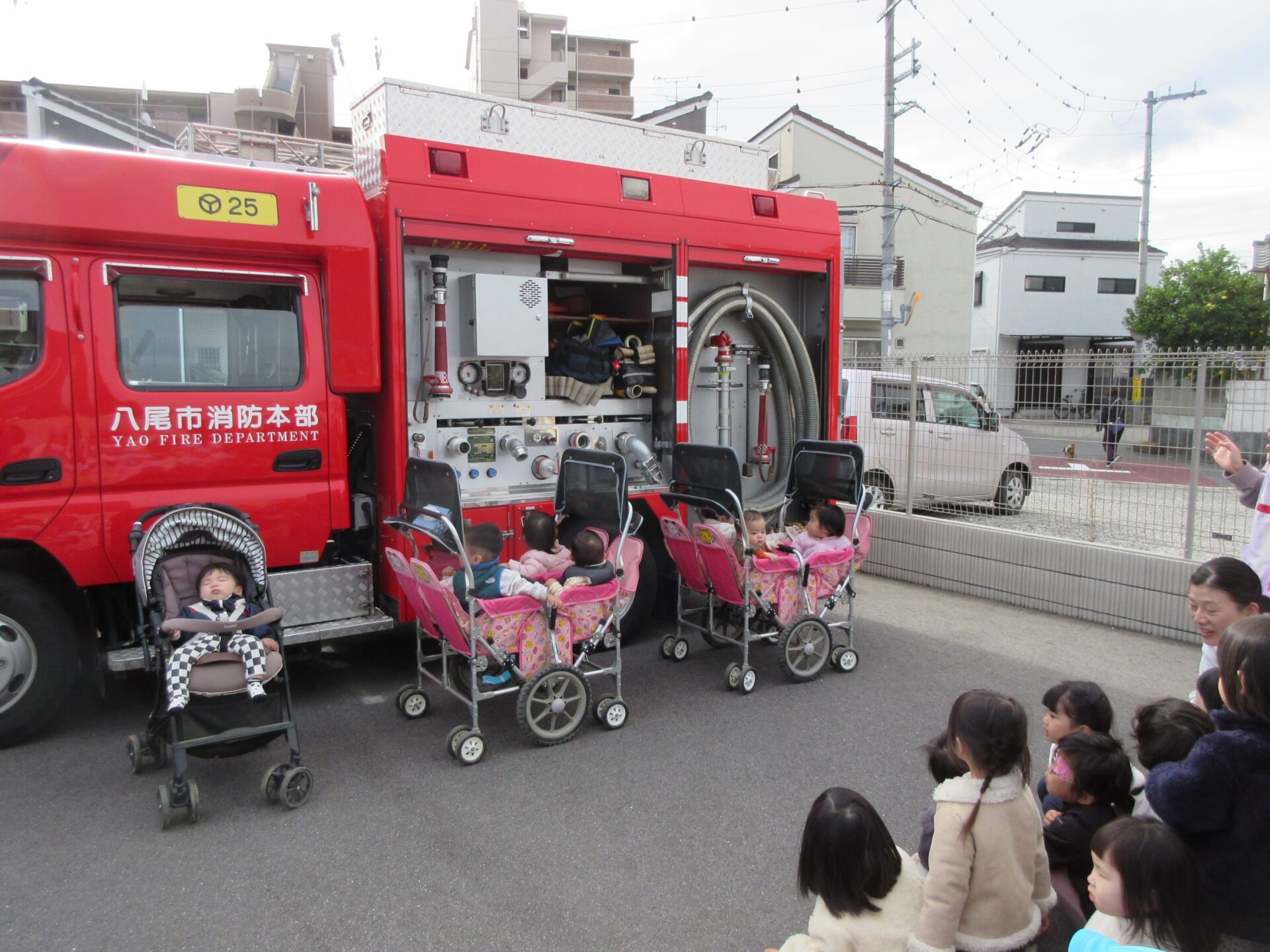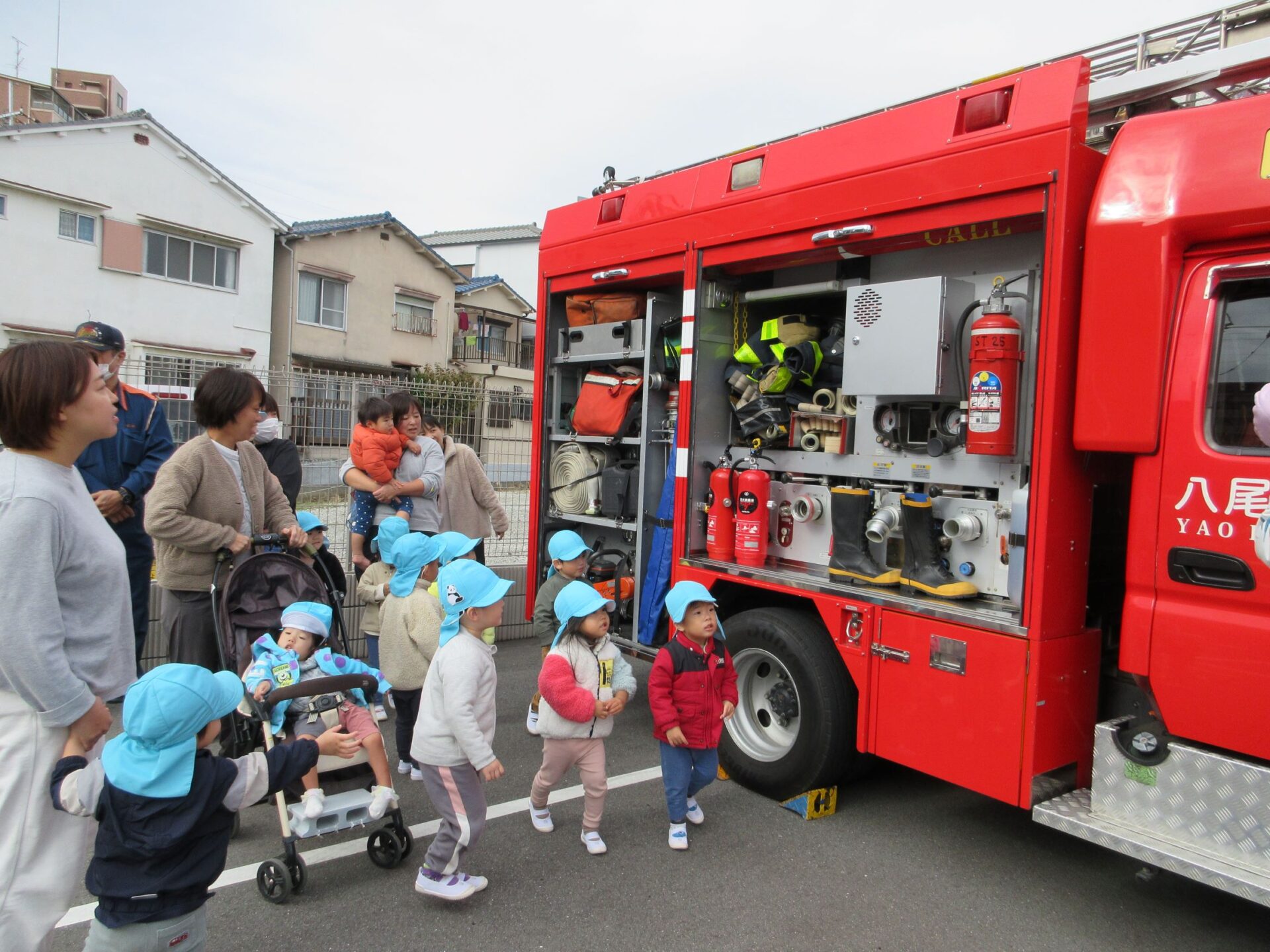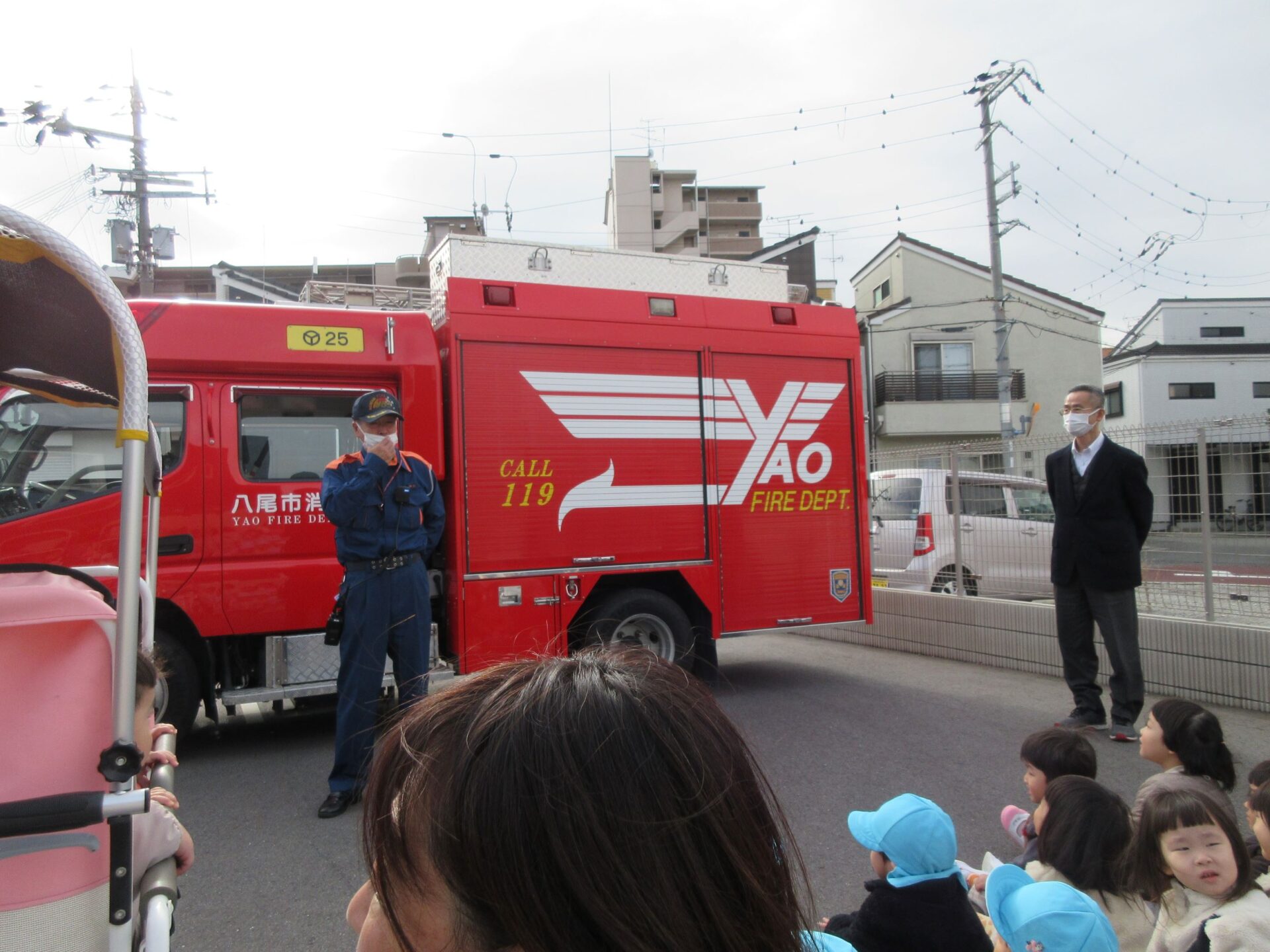 11月27日(水)、避難訓練を行いました。この日は、八尾市消防本部山本出張所から、消防士さんが消防車に乗って来てくださいました。