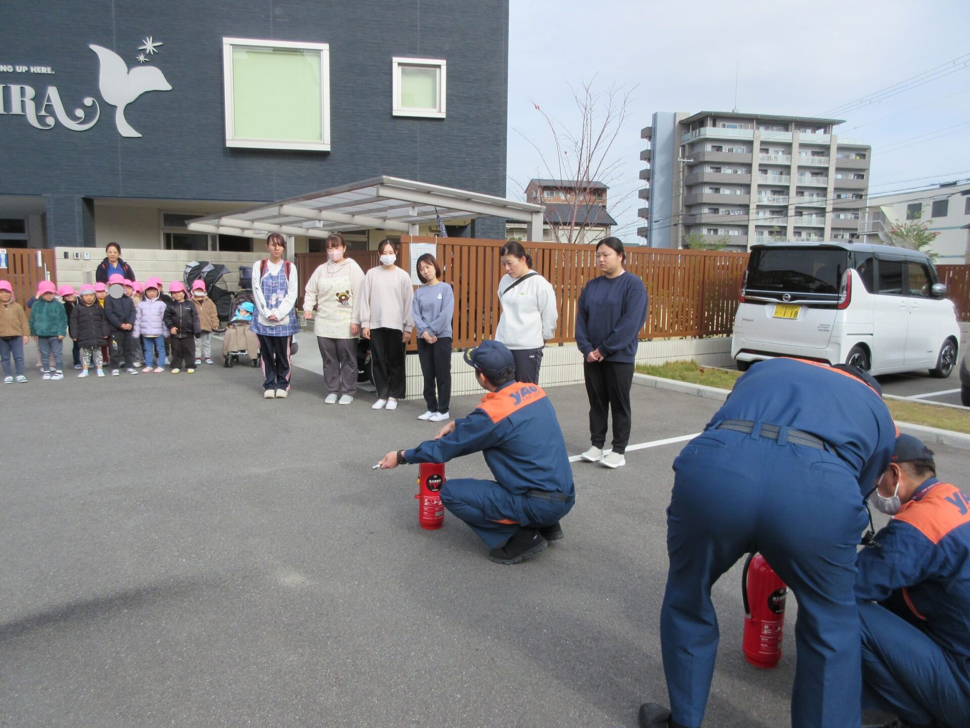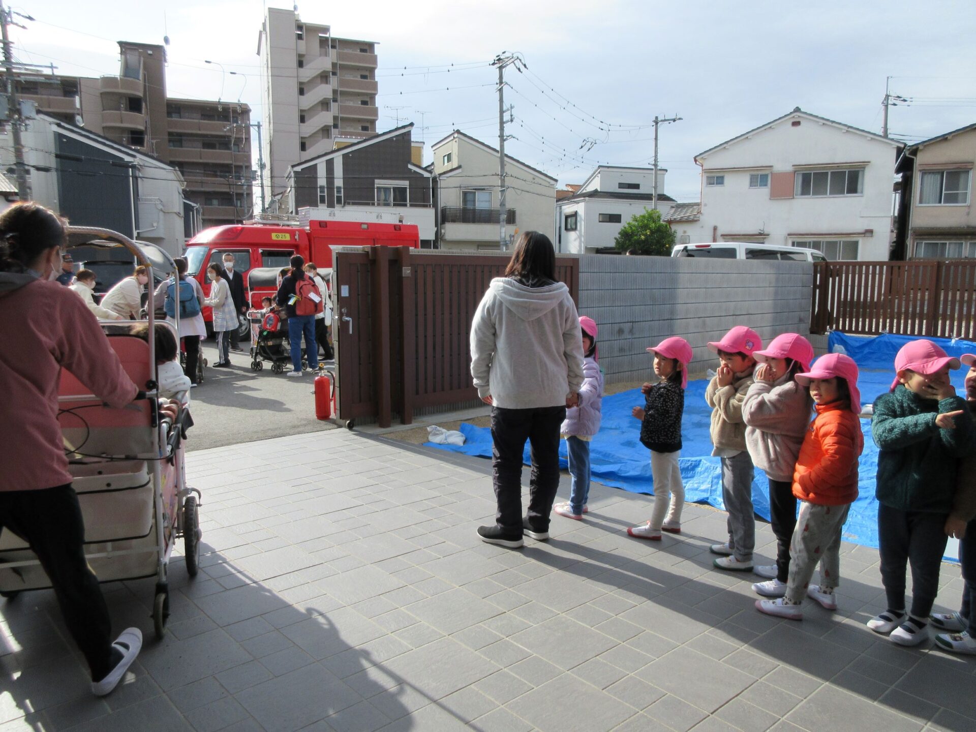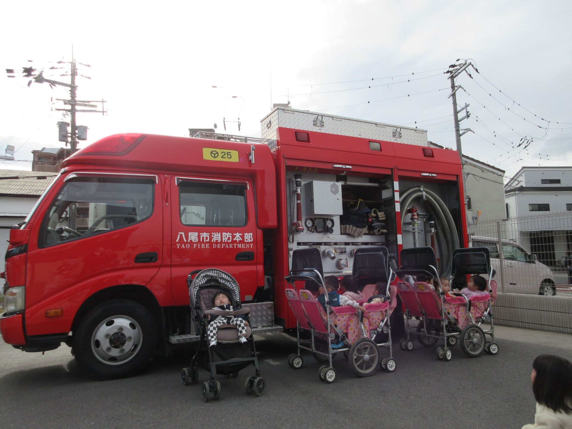 11月27日(水)、避難訓練を行いました。この日は、八尾市消防本部山本出張所から、消防士さんが消防車に乗って来てくださいました。