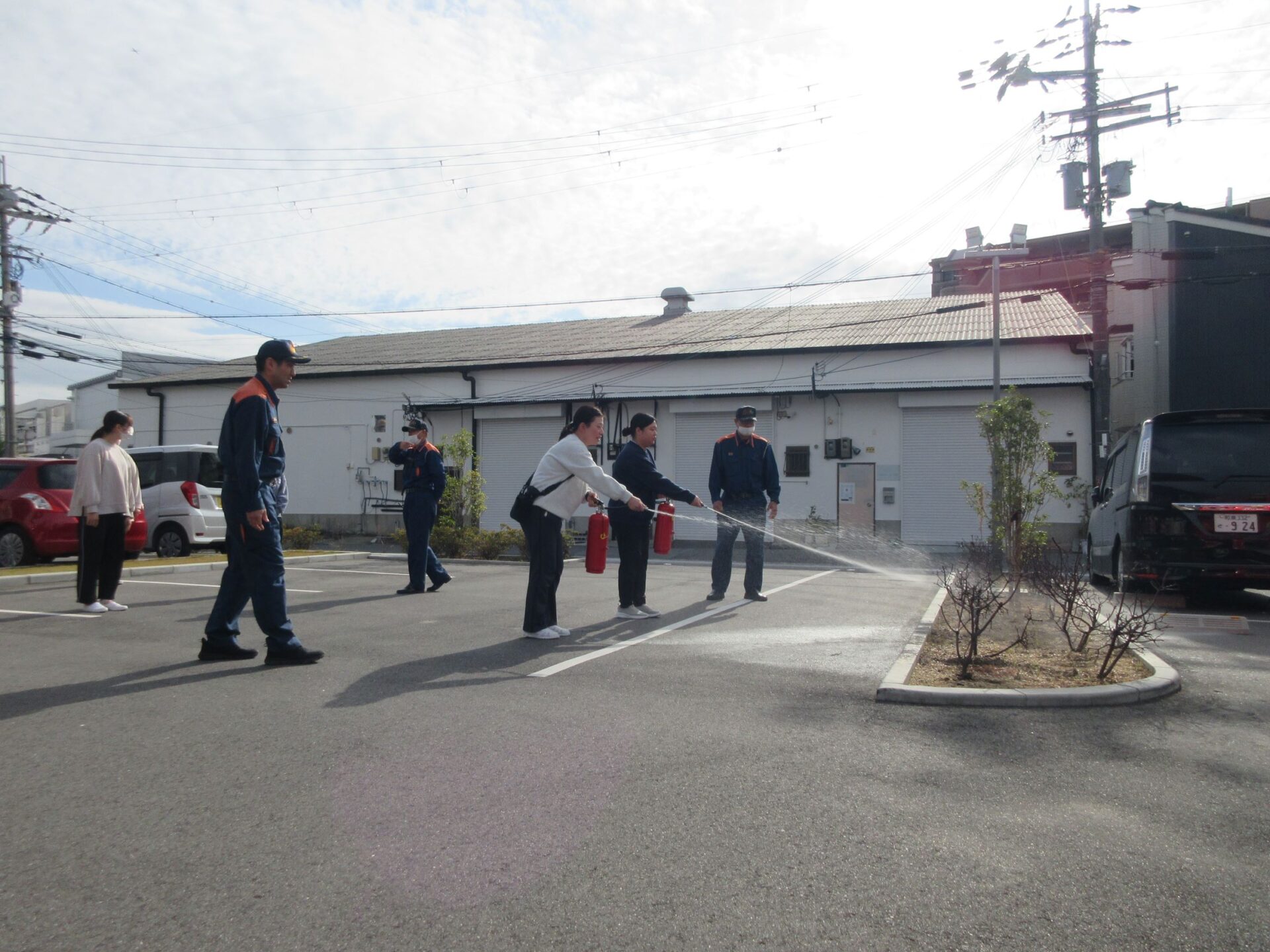 本当は、粉が出るけど、今日は訓練なので、水が出ています。消防士さんからは、「自分の背丈よりも高い炎が出ている場合は、消火は難しいので通報と避難を優先してください。」と言われていました。