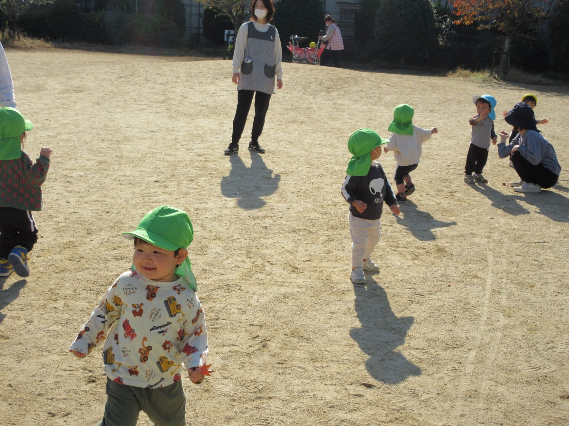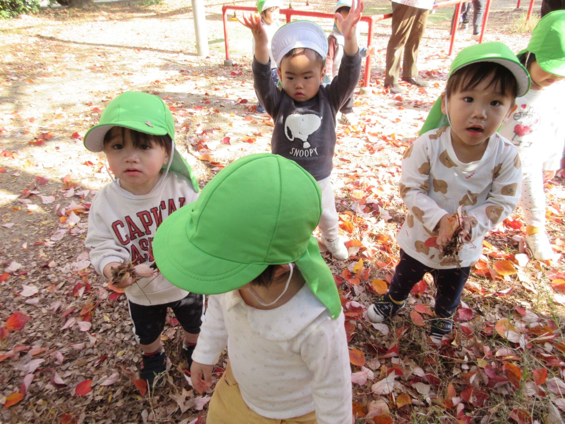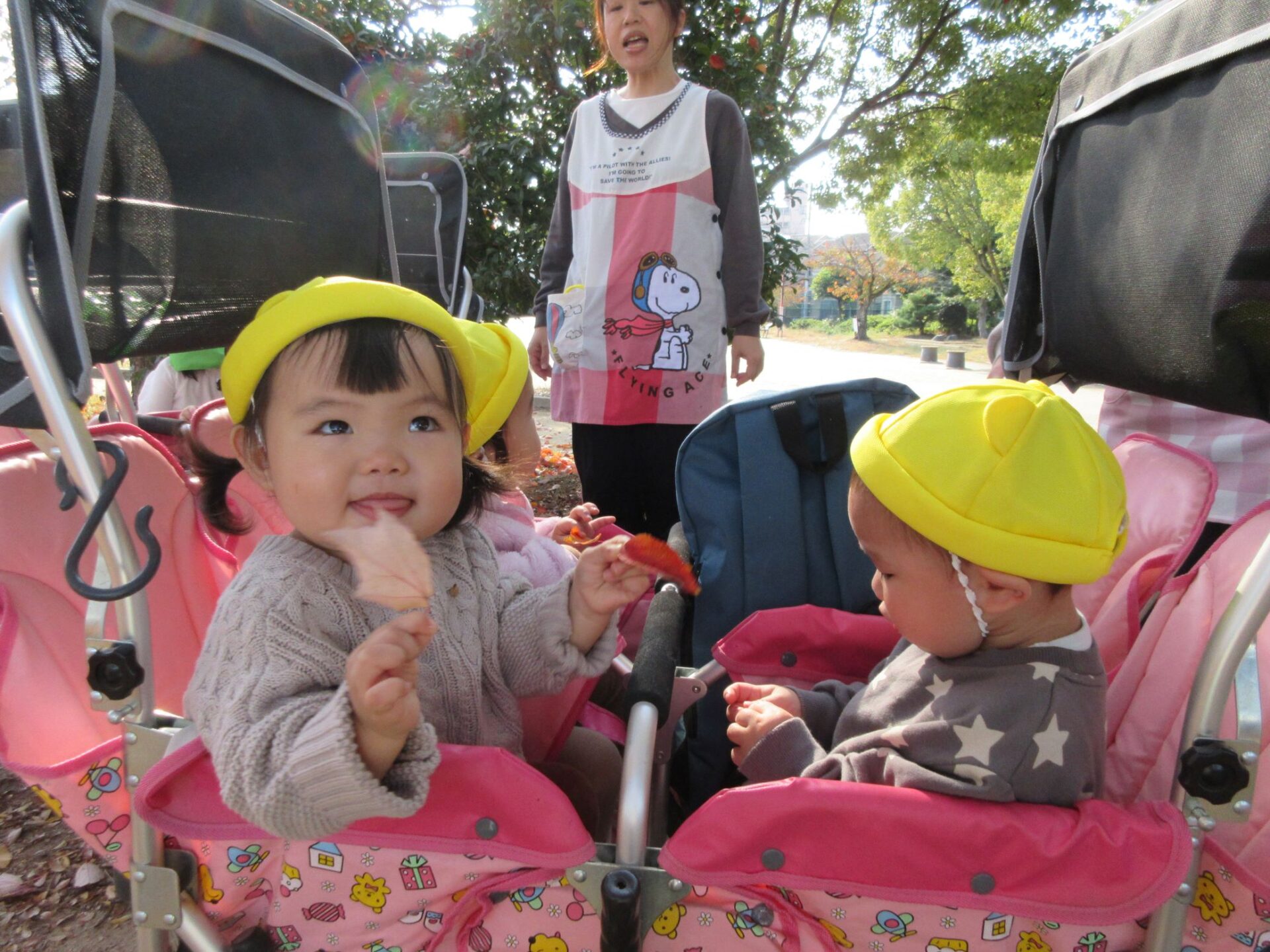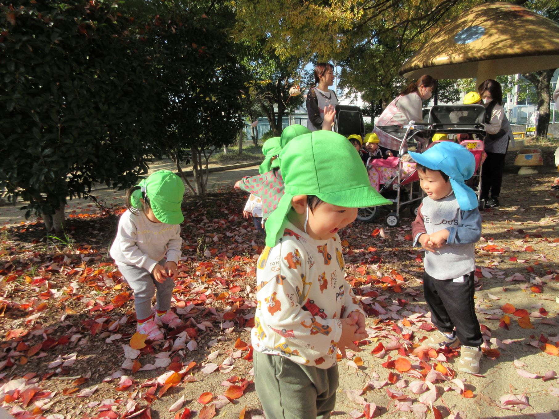 2024.12.09 お知らせ ブログ 美園公園におさんぽ(うみ組・だいち組) 12/3(火)今日はお天気が良かったので、美園公園におさんぽです! 美園公園に到着♪紅葉が綺麗ですね。あれれ?あそこに誰かいますよ。 うみぐみさんが、先に到着していました!一緒にあそぼ~ よーいどん!元気に走りますよ。 木にタッチ! 見つけた紅葉を持ってます。 イスにちょこん♪ 先生も一緒に座って良いですか? 赤い葉っぱがいっぱい! ぱらぱら~きれいだね! お土産に葉っぱを持ってます。 楽しかったですね、また行きましょうね! 一覧へ戻る