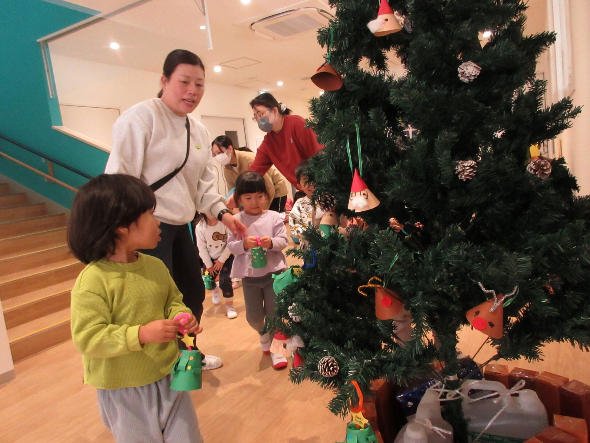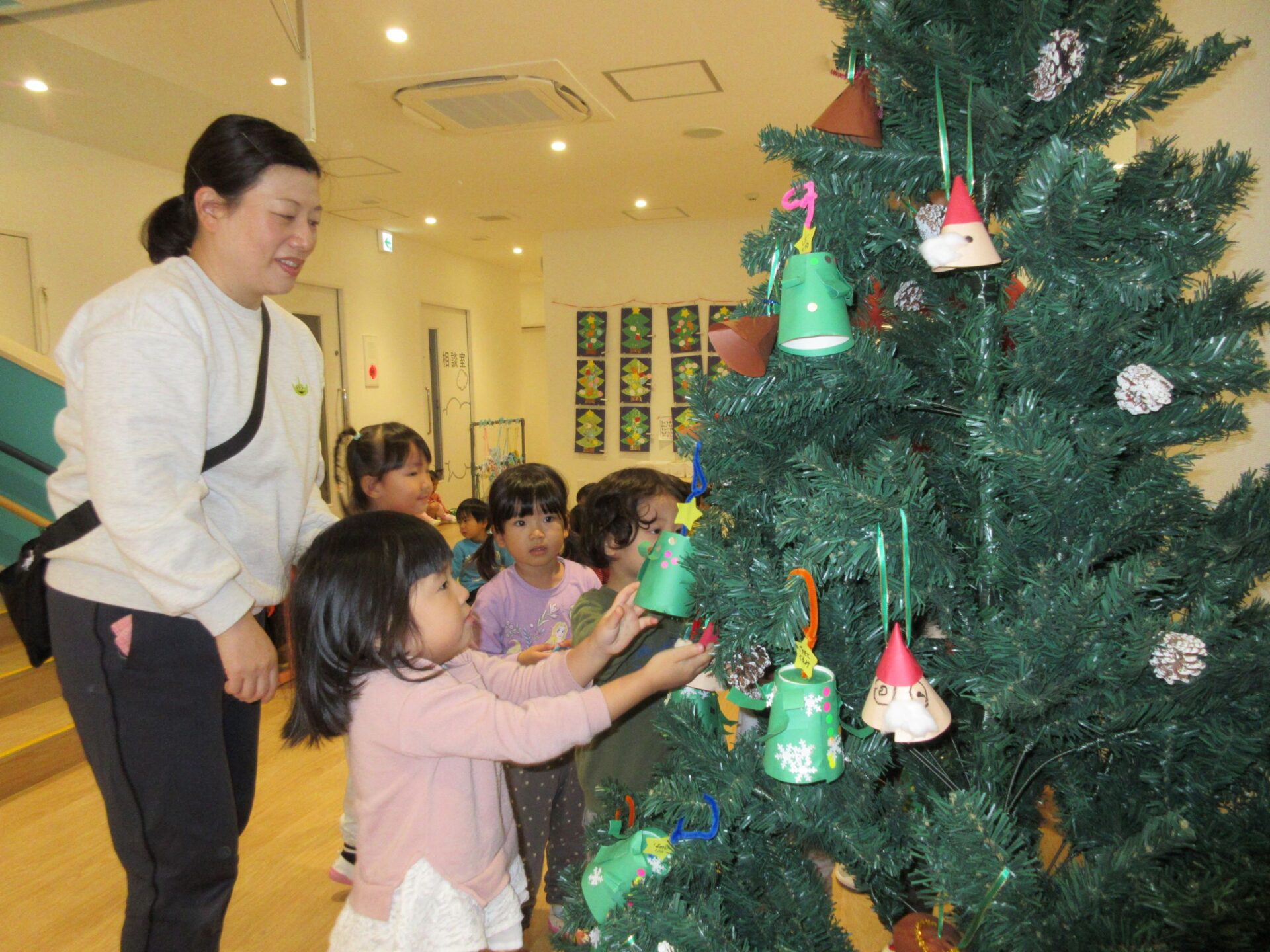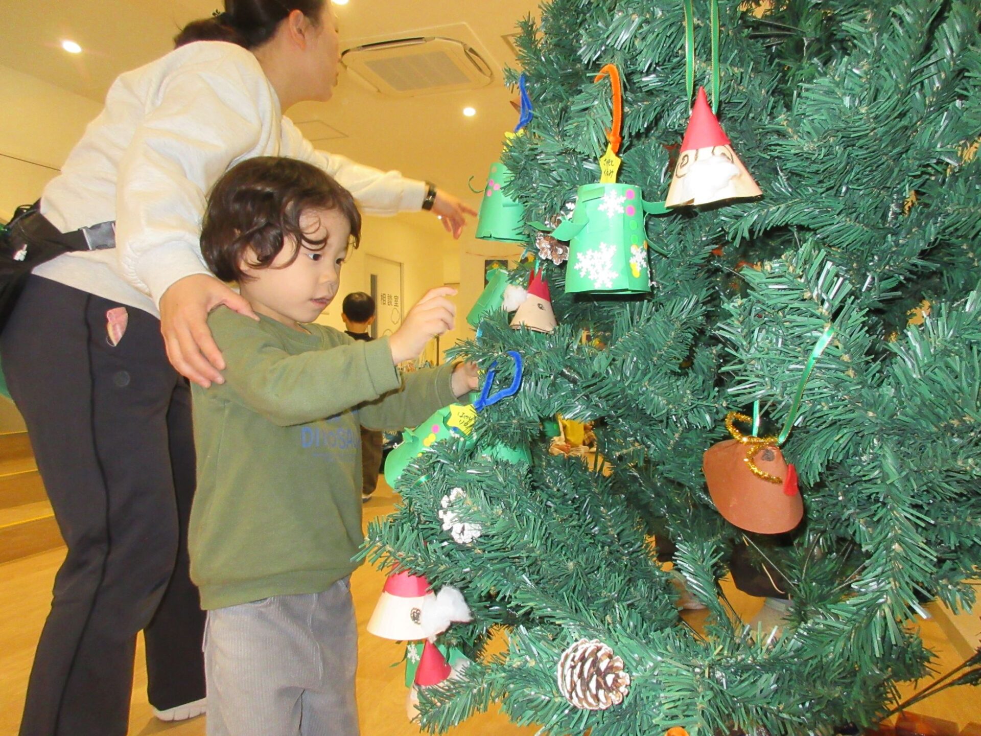 2024.12.16 お知らせ ブログ もうすぐクリスマス🎄(にじ組) クリスマスツリーにオーナメントを飾りました♪ 紙コップを土台に、クリスマスツリーを製作しました🎄可愛く出来ましたね! みんな「どこにかざろうかなぁ~」とクリスマスツリーを見ています👀✨ ここにしようかな♪私はここに飾ろう~♪ 上手にツリーに飾れました✨ たくさん飾りがついてウキウキです♪ みんなの製作したオーナメントを飾り、素敵なクリスマスツリーになりました✨送迎時にご覧くださいね! 一覧へ戻る