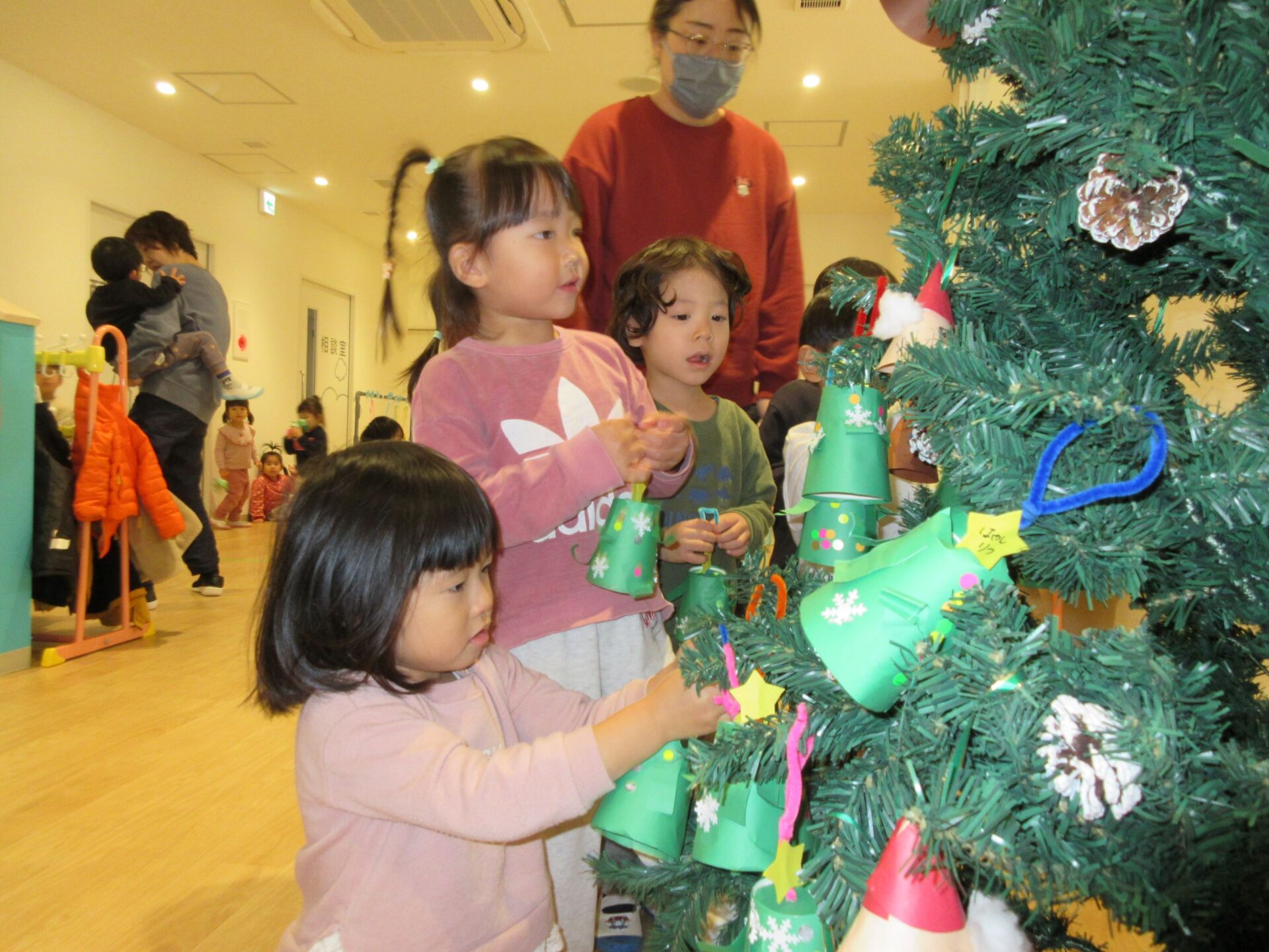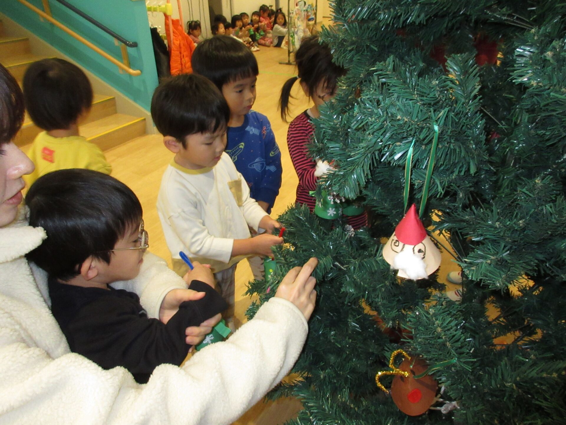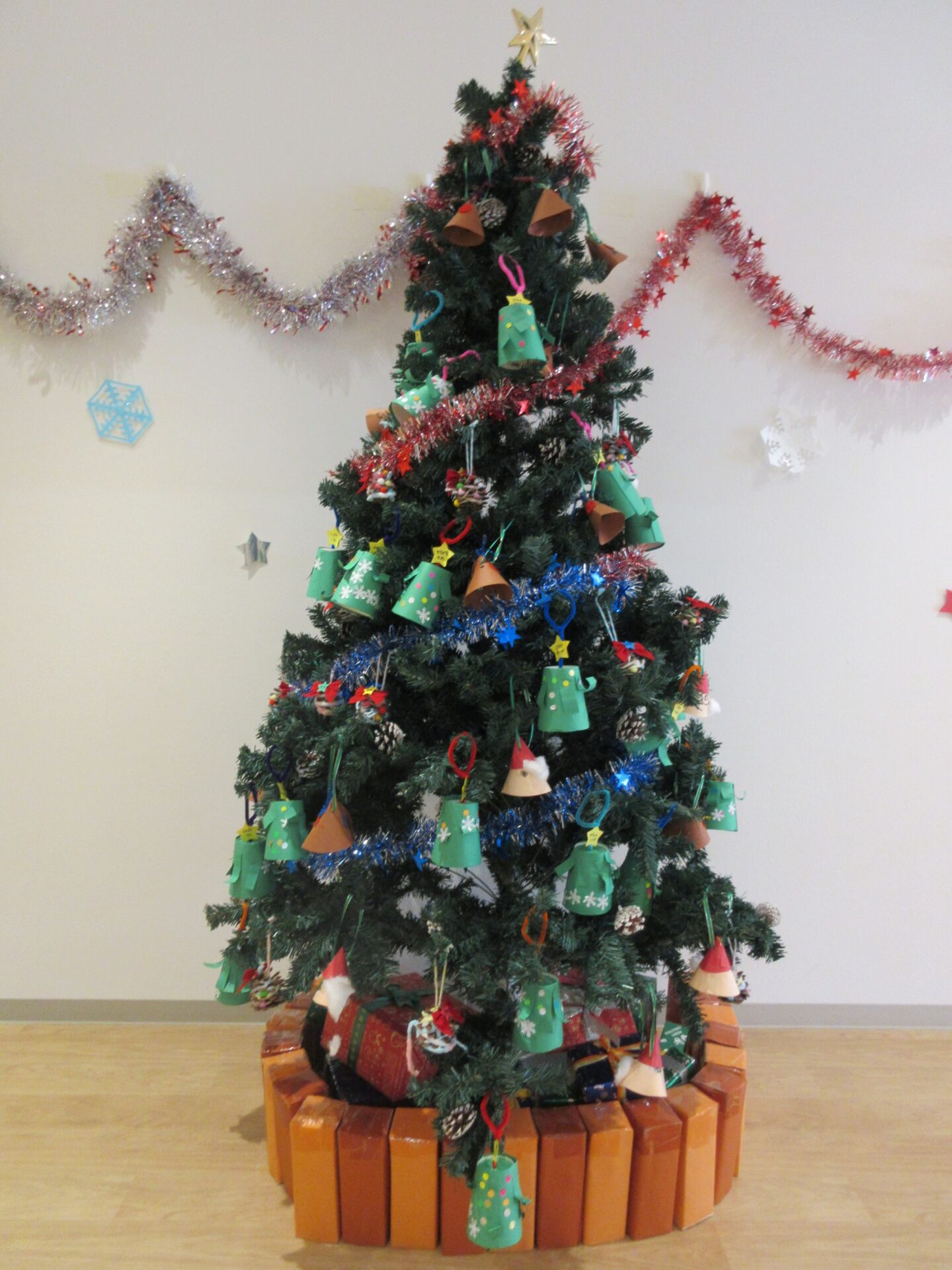 2024.12.16 お知らせ ブログ もうすぐクリスマス🎄(にじ組) クリスマスツリーにオーナメントを飾りました♪ 紙コップを土台に、クリスマスツリーを製作しました🎄可愛く出来ましたね! みんな「どこにかざろうかなぁ~」とクリスマスツリーを見ています👀✨ ここにしようかな♪私はここに飾ろう~♪ 上手にツリーに飾れました✨ たくさん飾りがついてウキウキです♪ みんなの製作したオーナメントを飾り、素敵なクリスマスツリーになりました✨送迎時にご覧くださいね! 一覧へ戻る