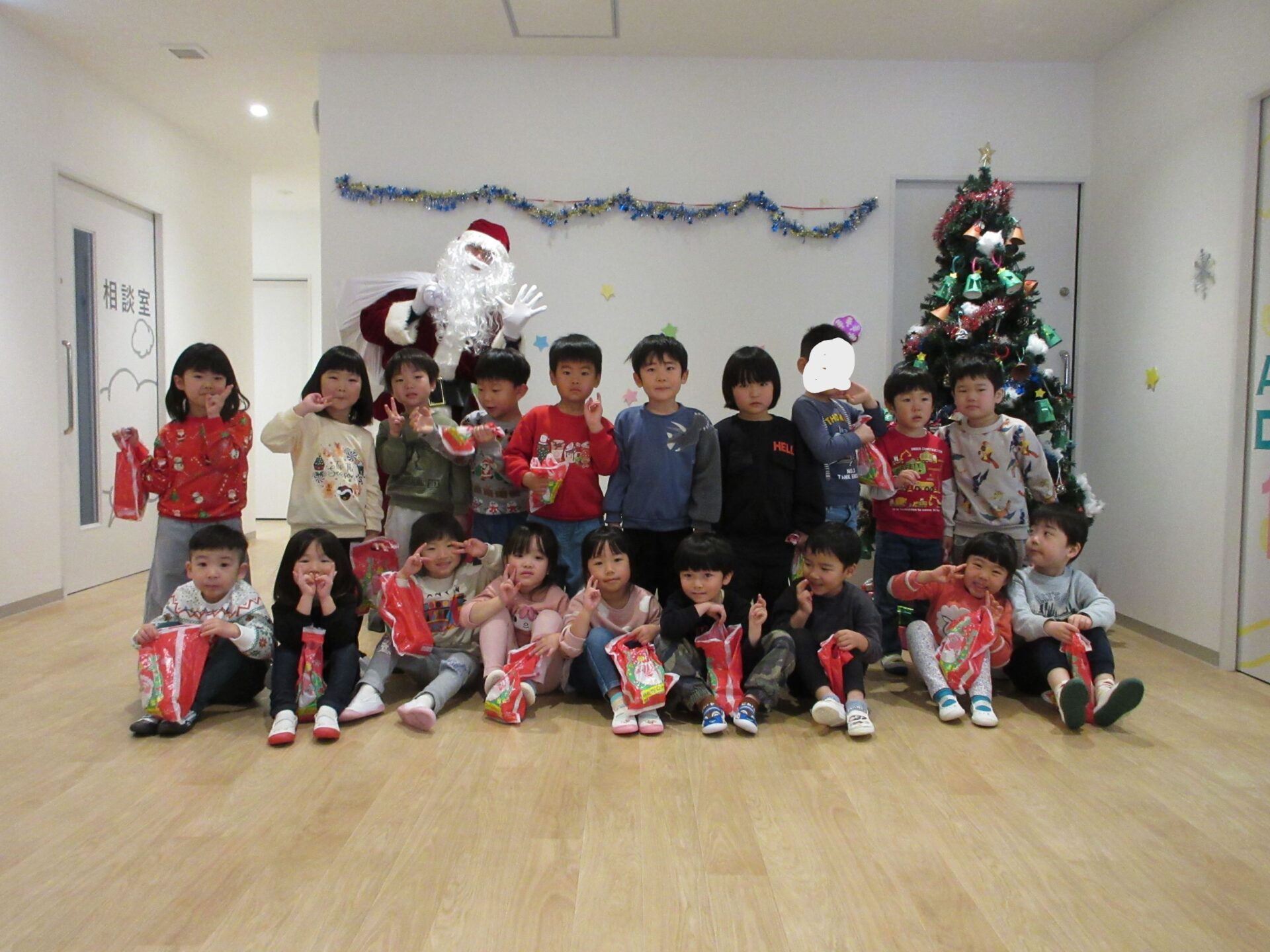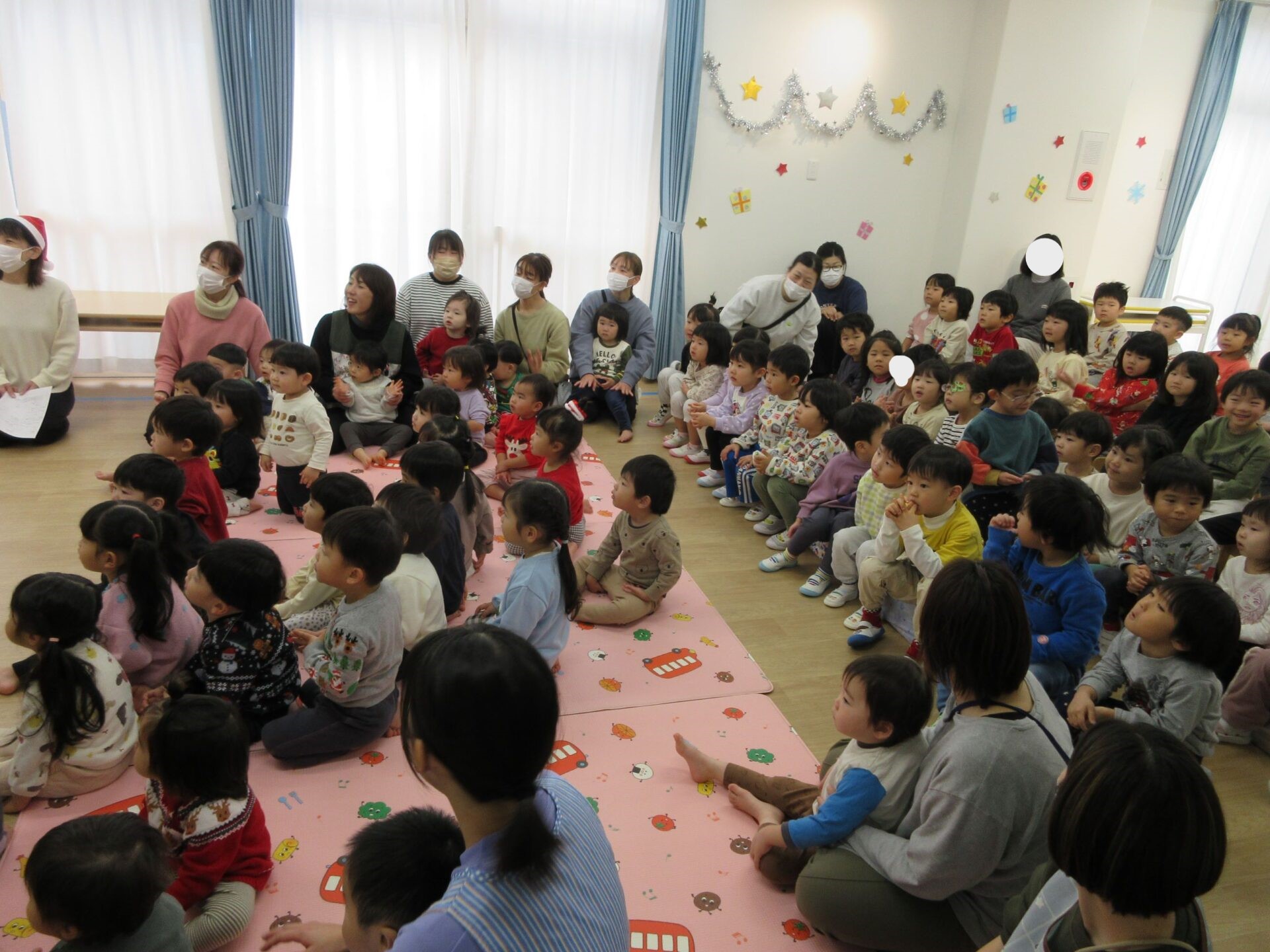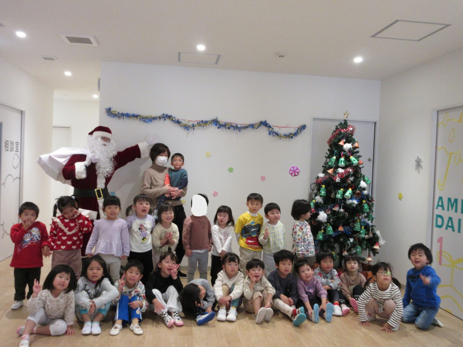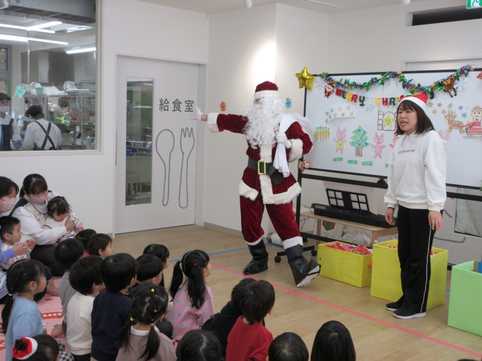 2024.12.25 お知らせ ブログ クリスマス会🎄サンタさんが来たよ! 12月23日、今日はくじらこども園でクリスマス会です♪先生たちが「ウサギ野原のクリスマス」のペープサートをしてくれましたよ。 「楽しいね~」みんな真剣に見ています。 じゃじゃーん!!サンタクロースさんの登場です!!びっくりしているお友だちもいましたが、みんなにこにこで迎えていましたよ。 この笑顔!嬉しそう! クリスマスツリーと一緒に記念撮影♪うみぐみさんです。 だいち組です。あれ?いつの間にかサンタさんがいましたよ! あめ組さんです。みんなサンタさんに気づいたかな? にじ組さん、みんなにこり。 そら組さんはもうプレゼントを受け取っていますね!何が入っているのかな? だいち組さんのみんなも、プレゼント♪ 何かな?何かな?ワクワク うみ組さんのみんなも目を輝かせて見ていますね!メリークリスマス!みんなのお家にもサンタさん来てくれるかな? 一覧へ戻る