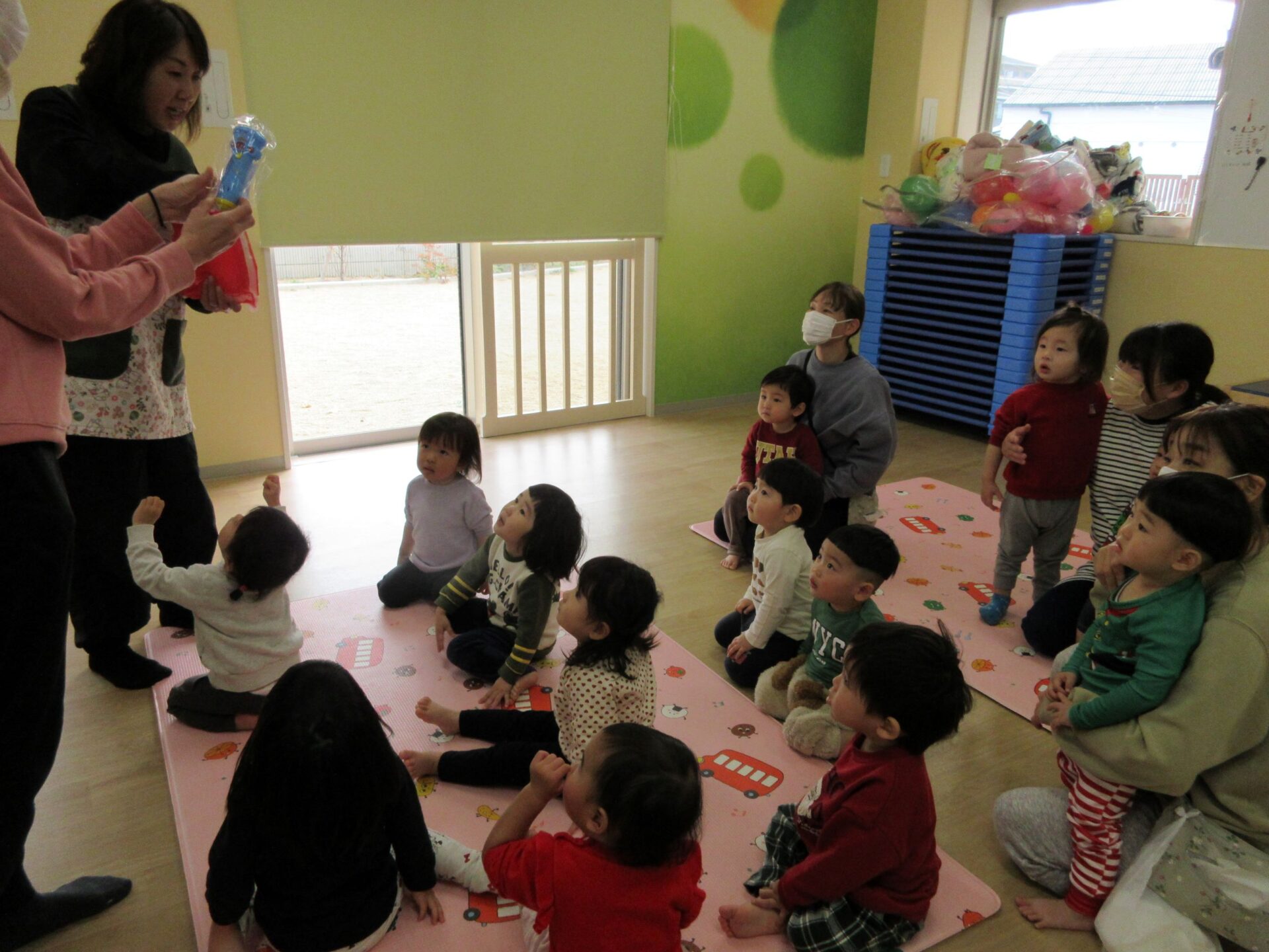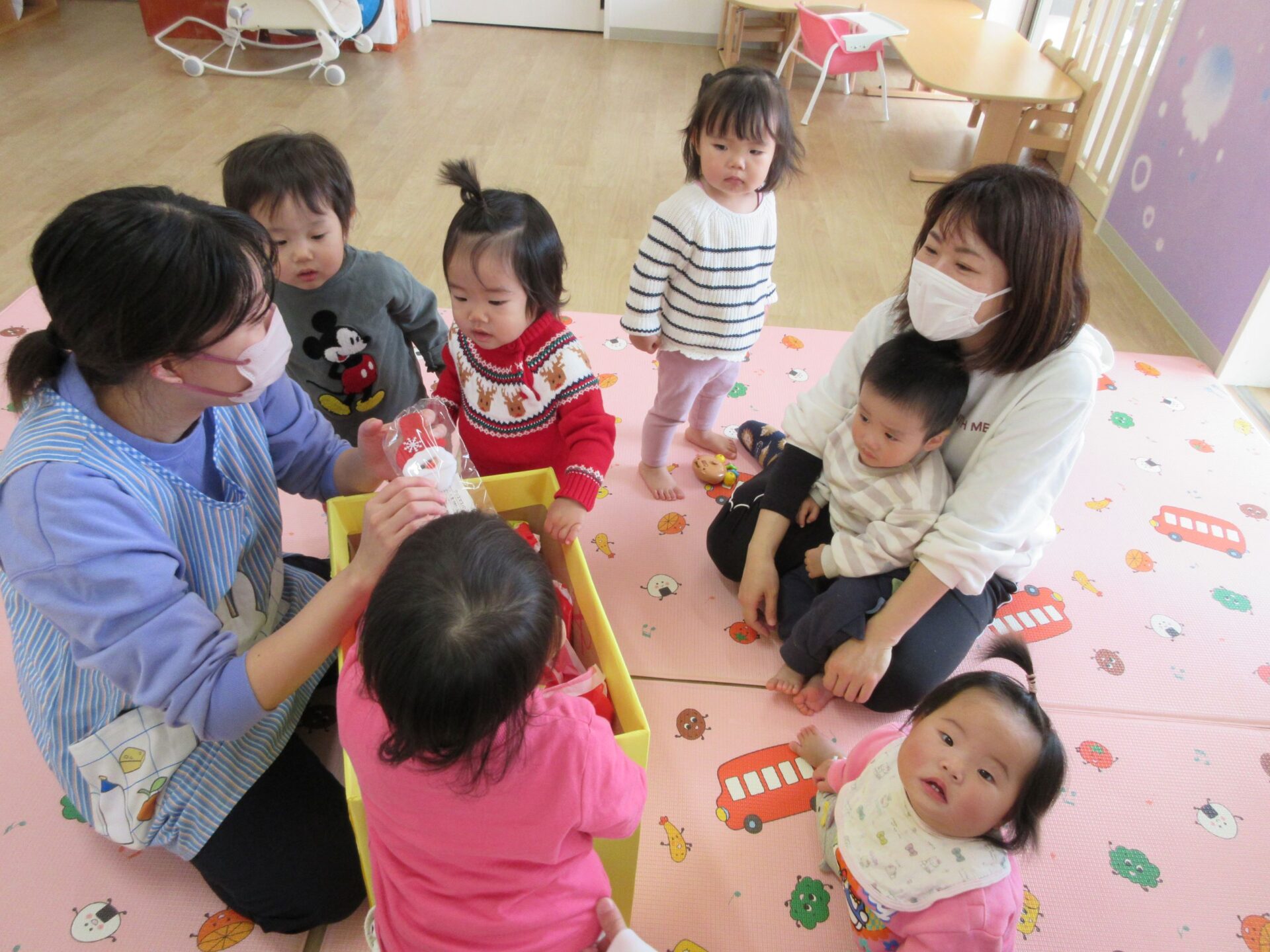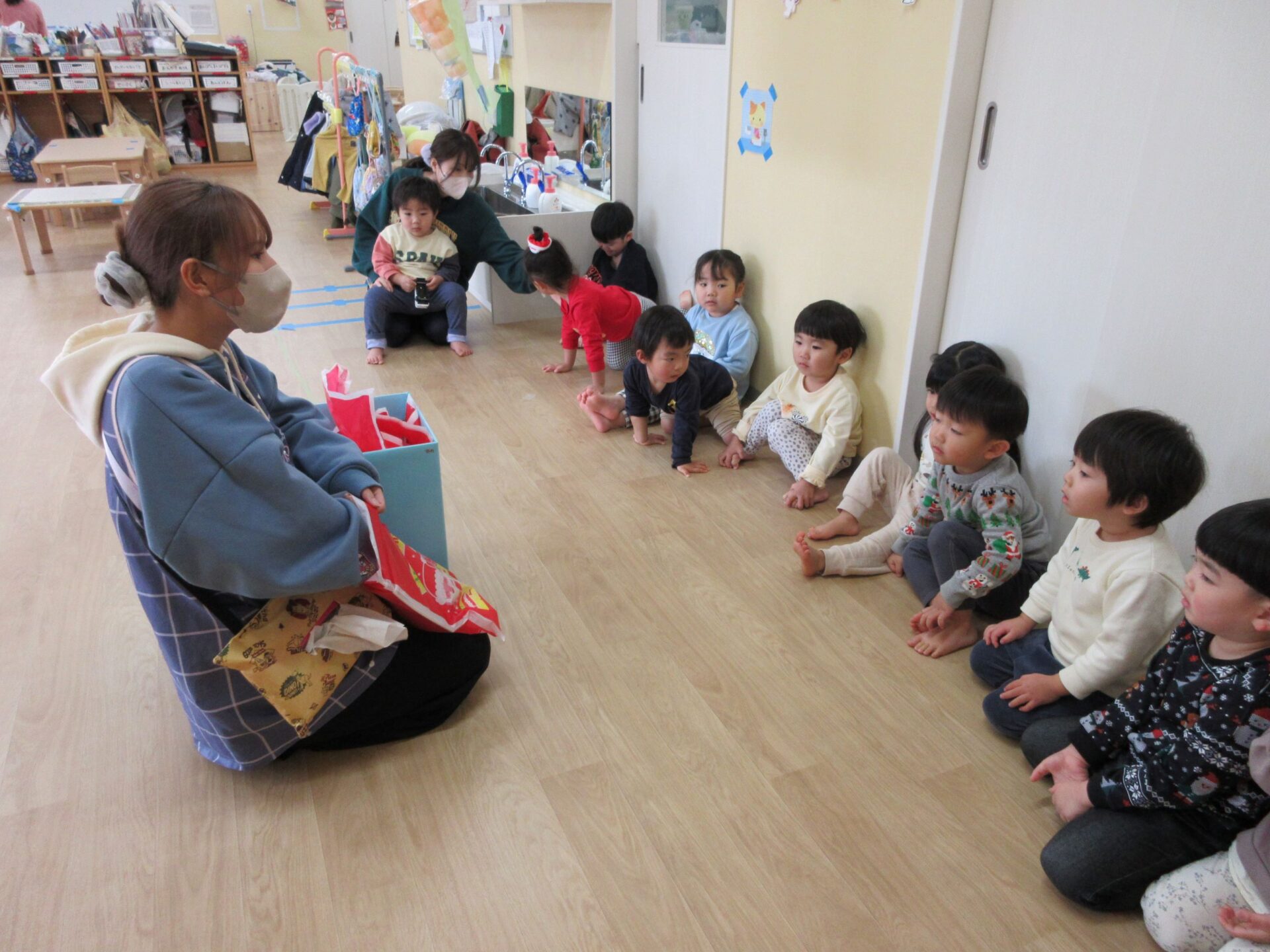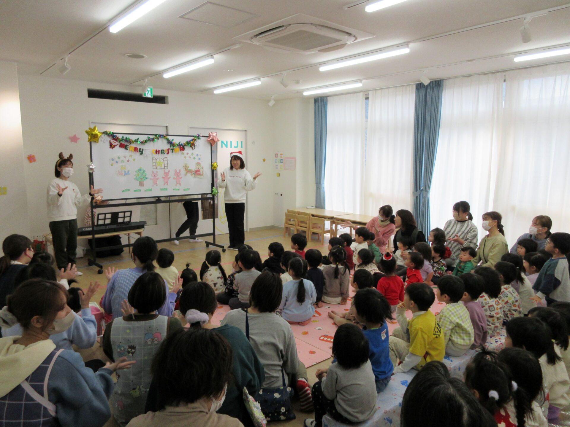 2024.12.25 お知らせ ブログ クリスマス会🎄サンタさんが来たよ! 12月23日、今日はくじらこども園でクリスマス会です♪先生たちが「ウサギ野原のクリスマス」のペープサートをしてくれましたよ。 「楽しいね~」みんな真剣に見ています。 じゃじゃーん!!サンタクロースさんの登場です!!びっくりしているお友だちもいましたが、みんなにこにこで迎えていましたよ。 この笑顔!嬉しそう! クリスマスツリーと一緒に記念撮影♪うみぐみさんです。 だいち組です。あれ?いつの間にかサンタさんがいましたよ! あめ組さんです。みんなサンタさんに気づいたかな? にじ組さん、みんなにこり。 そら組さんはもうプレゼントを受け取っていますね!何が入っているのかな? だいち組さんのみんなも、プレゼント♪ 何かな?何かな?ワクワク うみ組さんのみんなも目を輝かせて見ていますね!メリークリスマス!みんなのお家にもサンタさん来てくれるかな? 一覧へ戻る