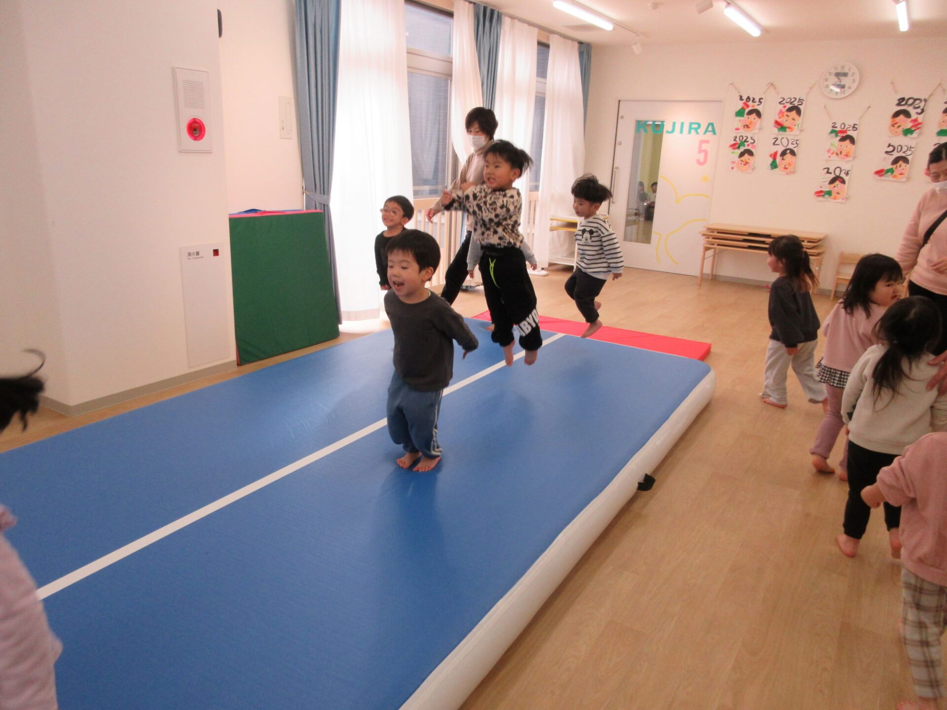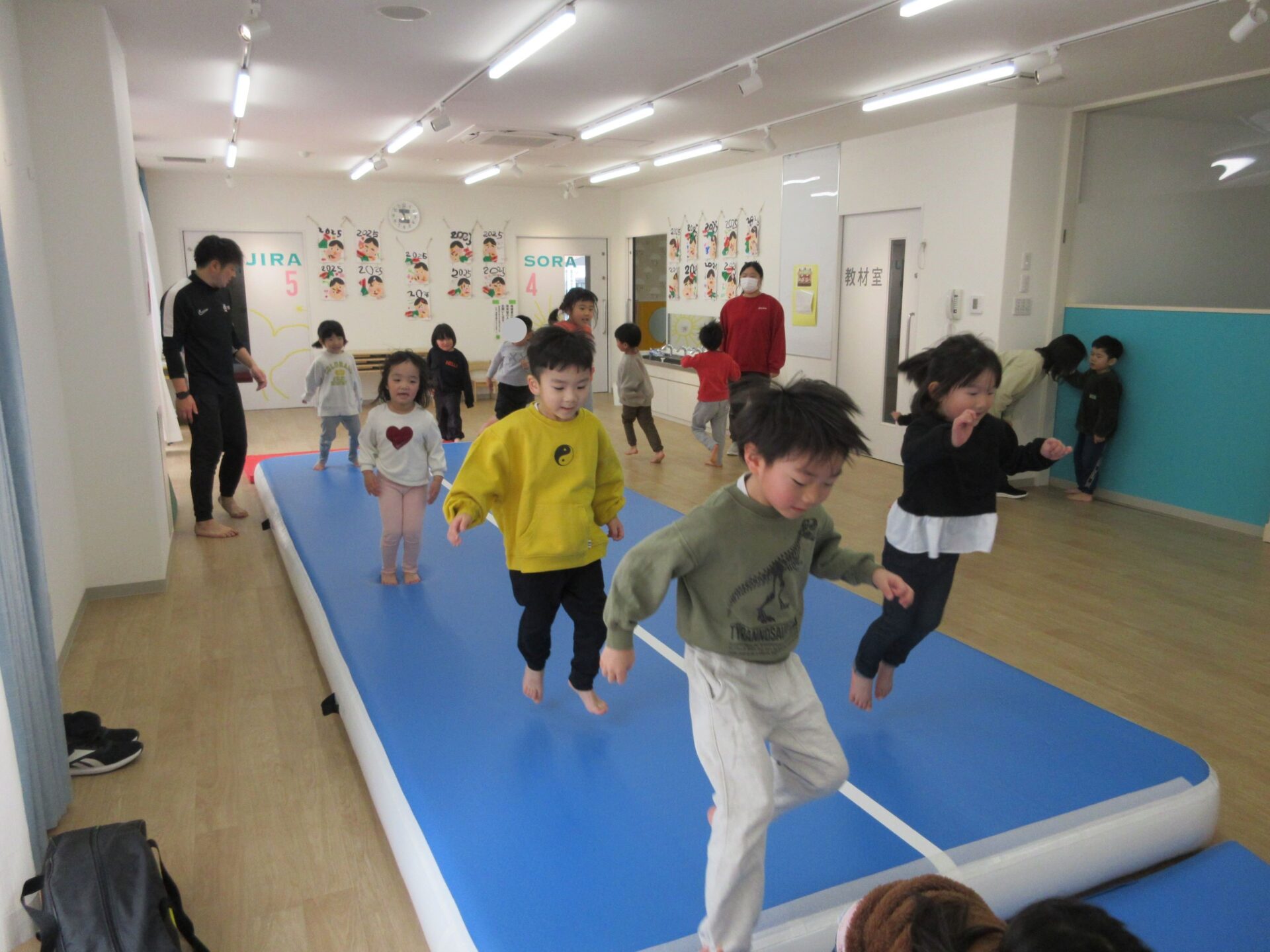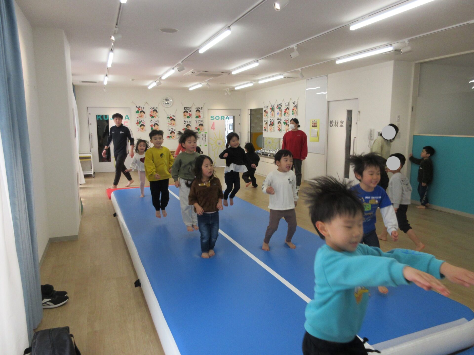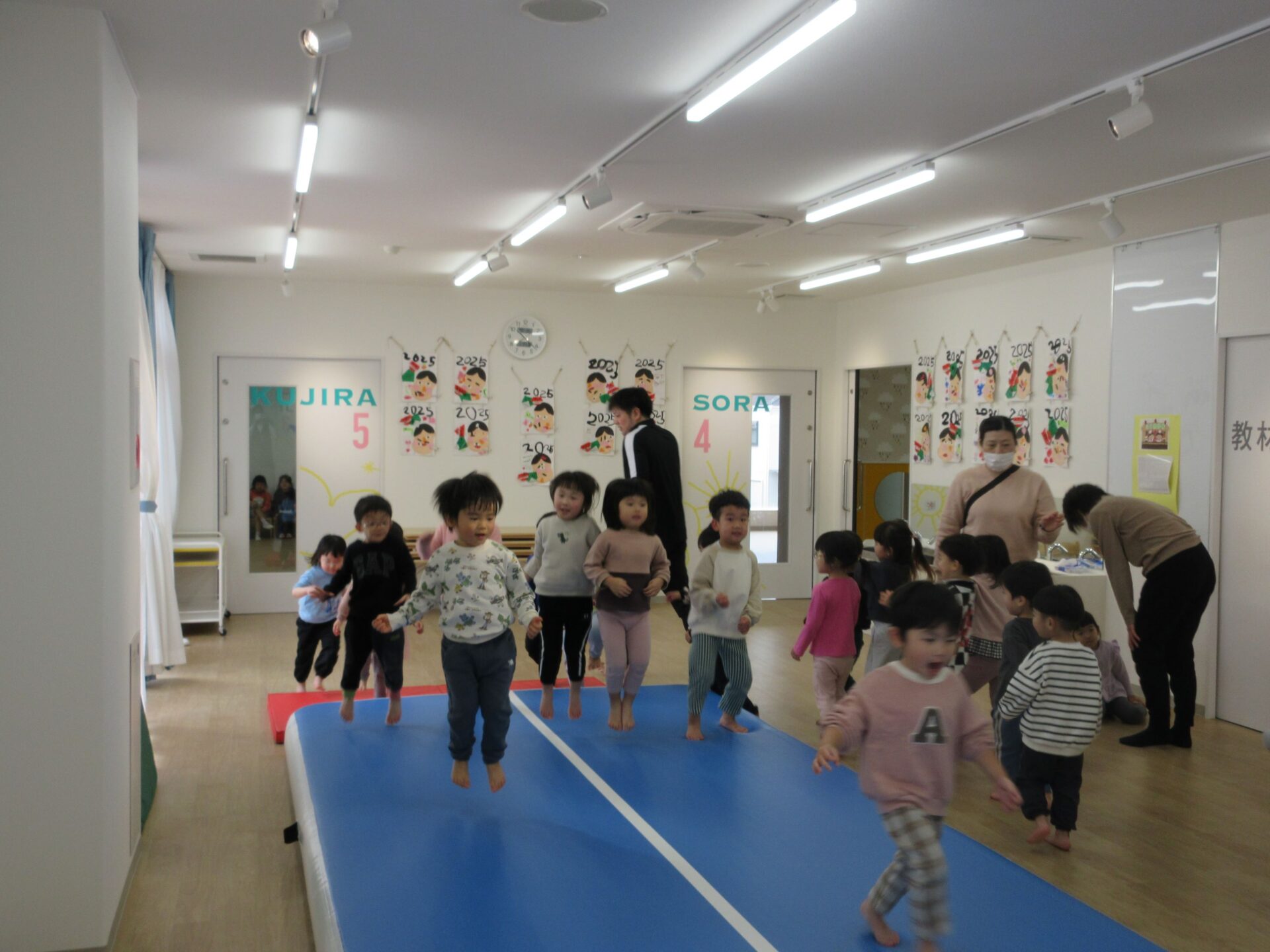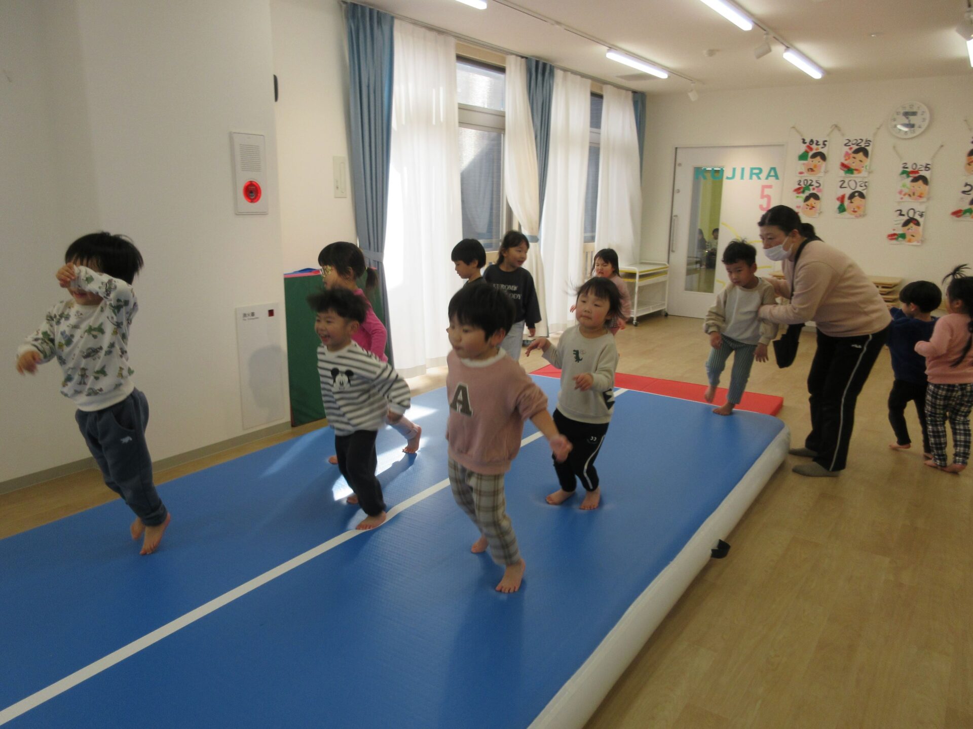 1月17日(金)、新年1回目の運動遊び教室、みんなすっかり慣れてきました。はじめに、3歳にじ組の時間です。今回は、先生が大きなふわふわマットを用意してくださいました。