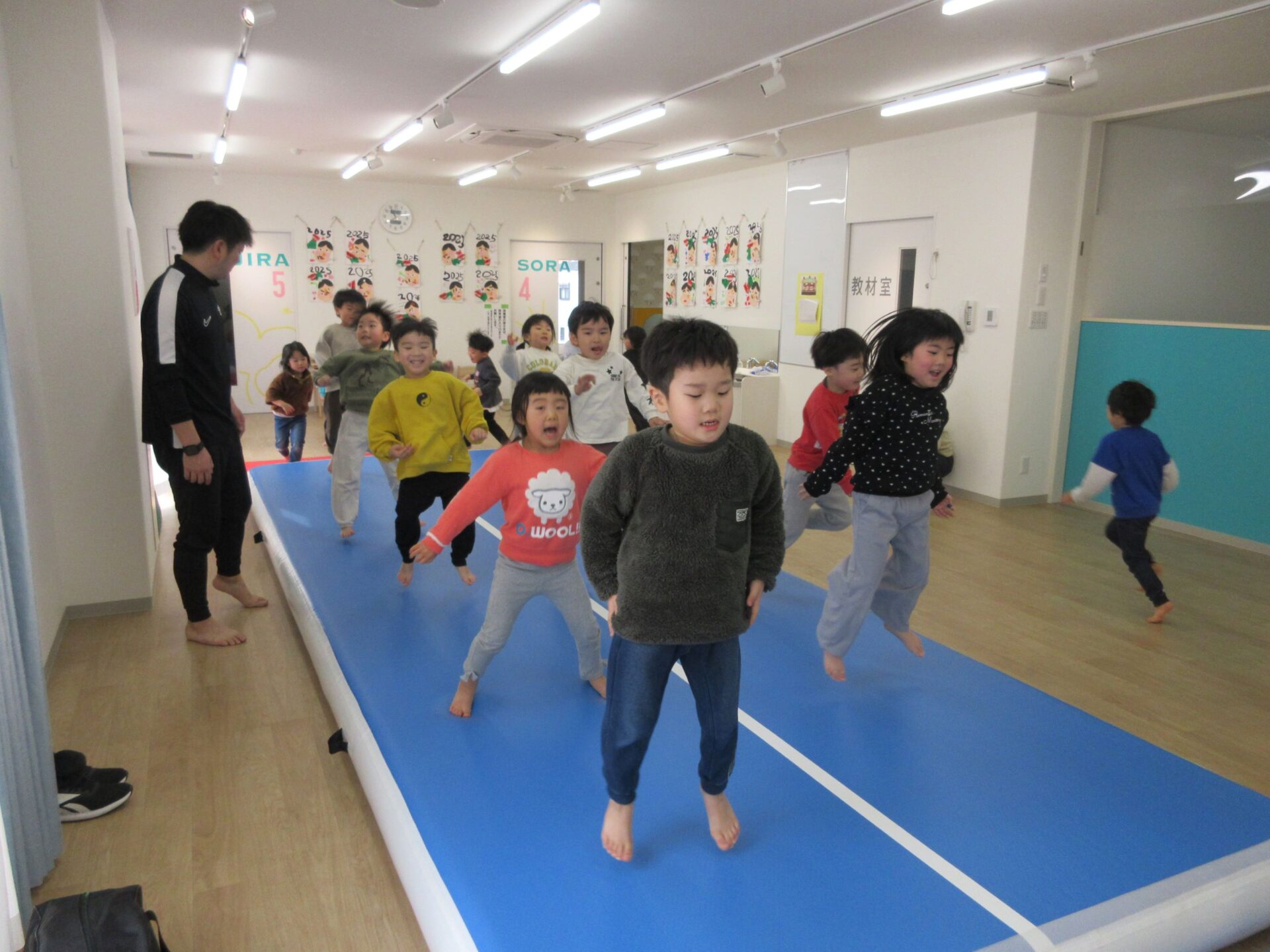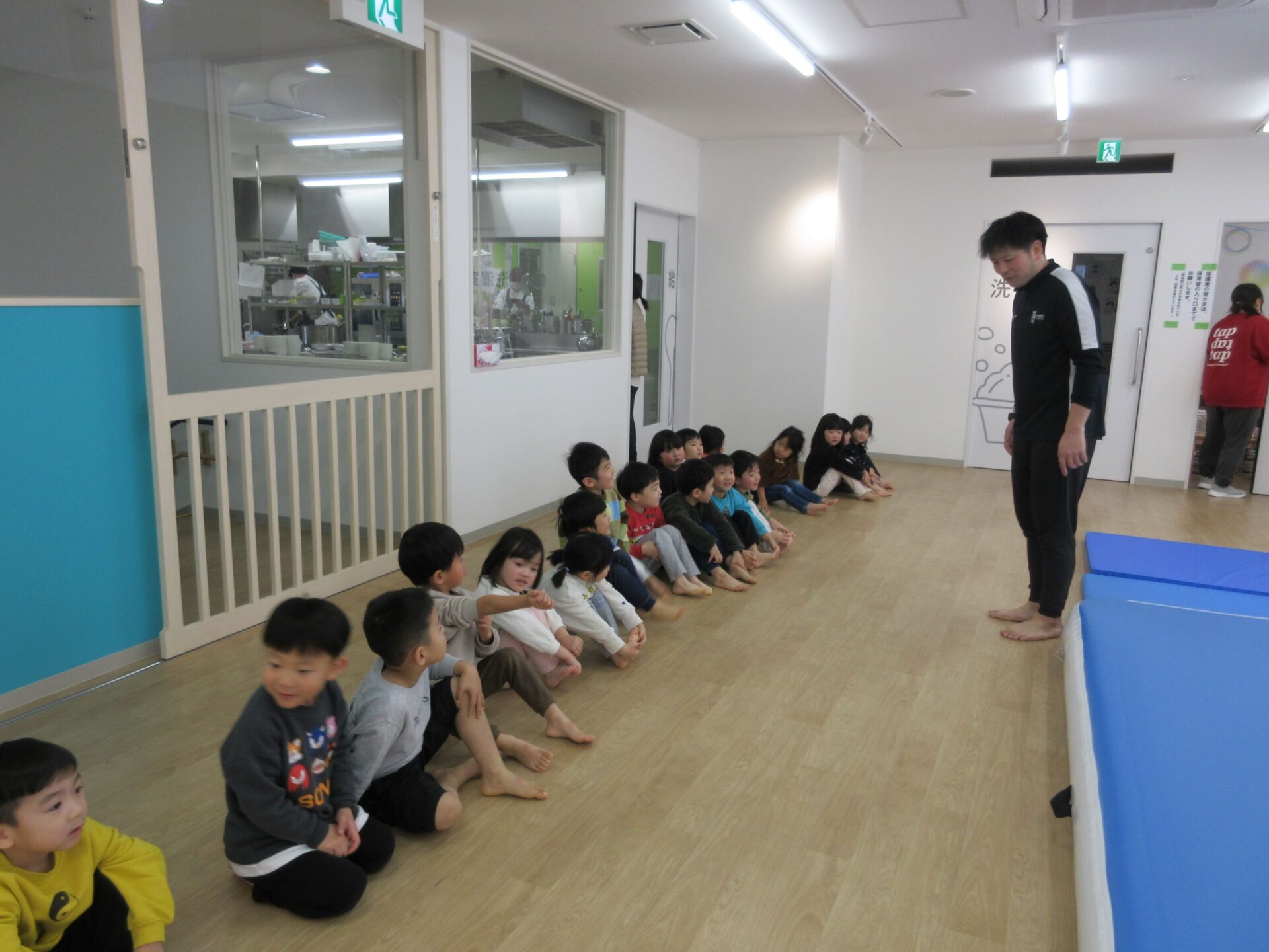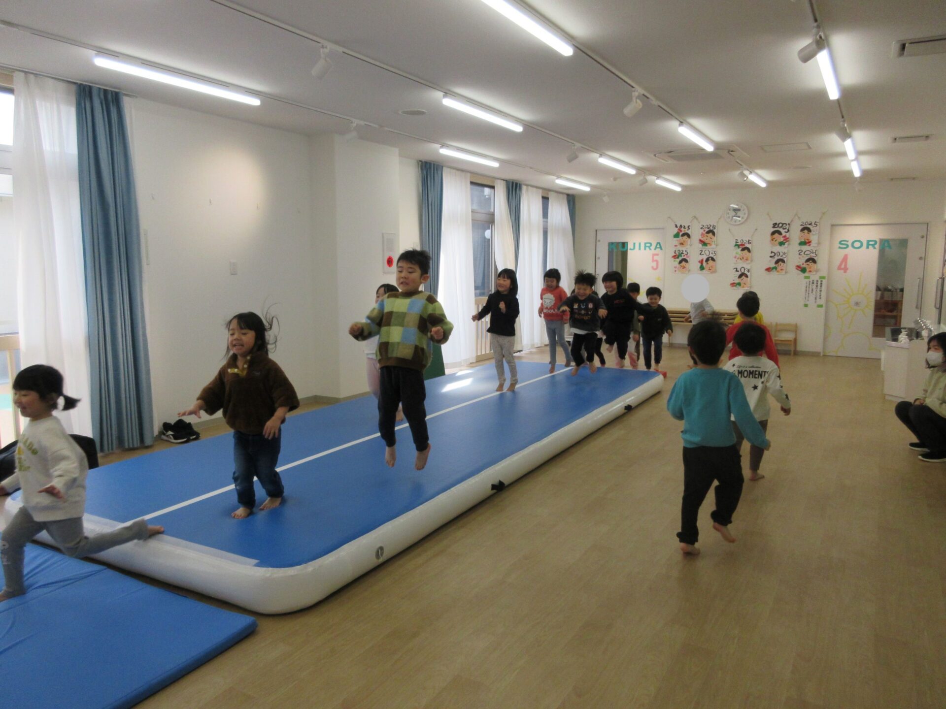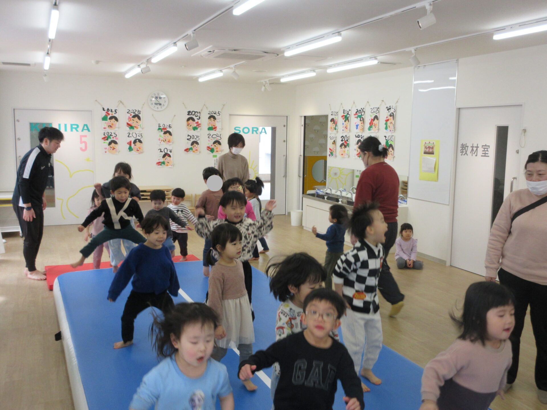1月17日(金)、新年1回目の運動遊び教室、みんなすっかり慣れてきました。はじめに、3歳にじ組の時間です。今回は、先生が大きなふわふわマットを用意してくださいました。