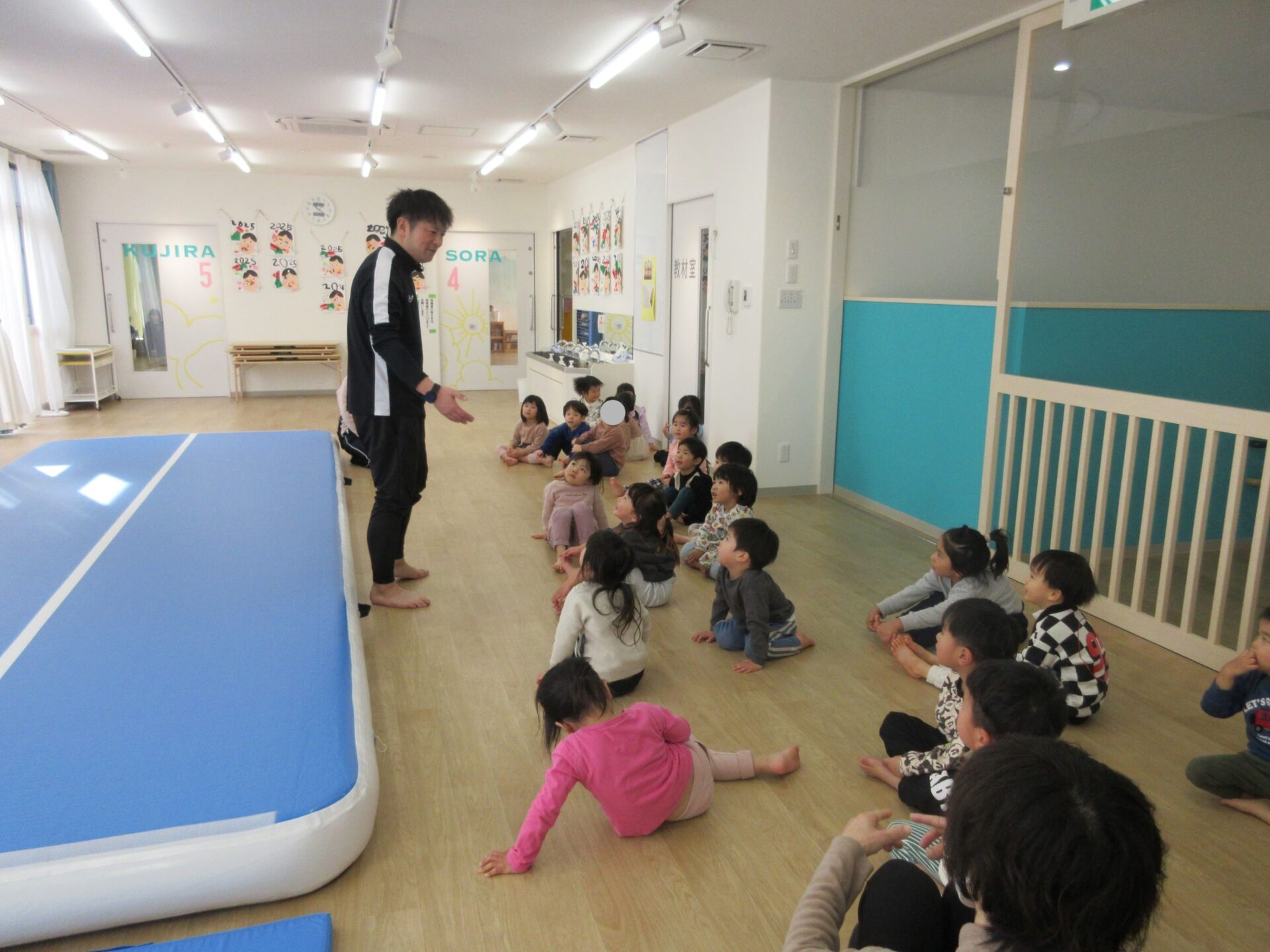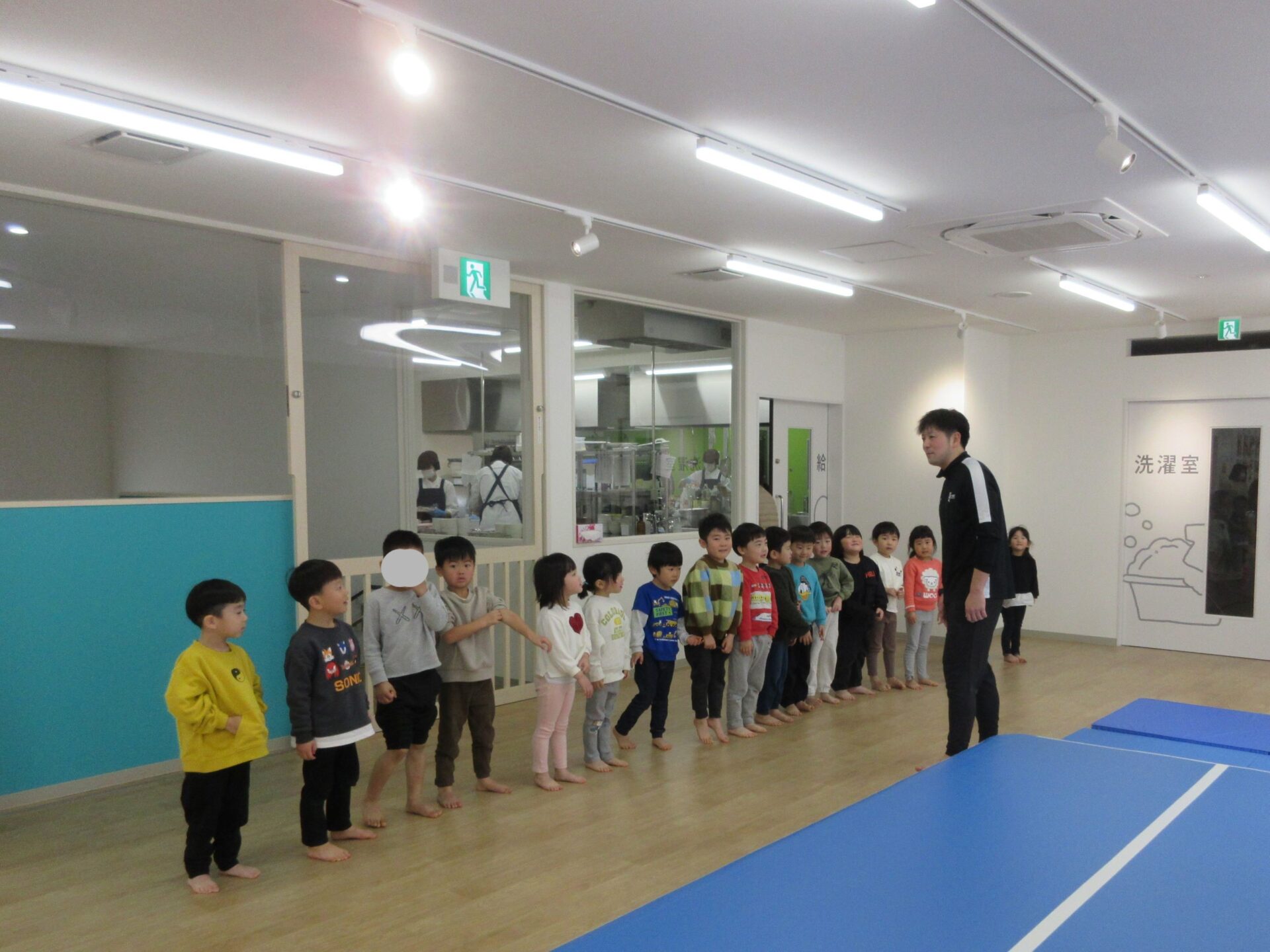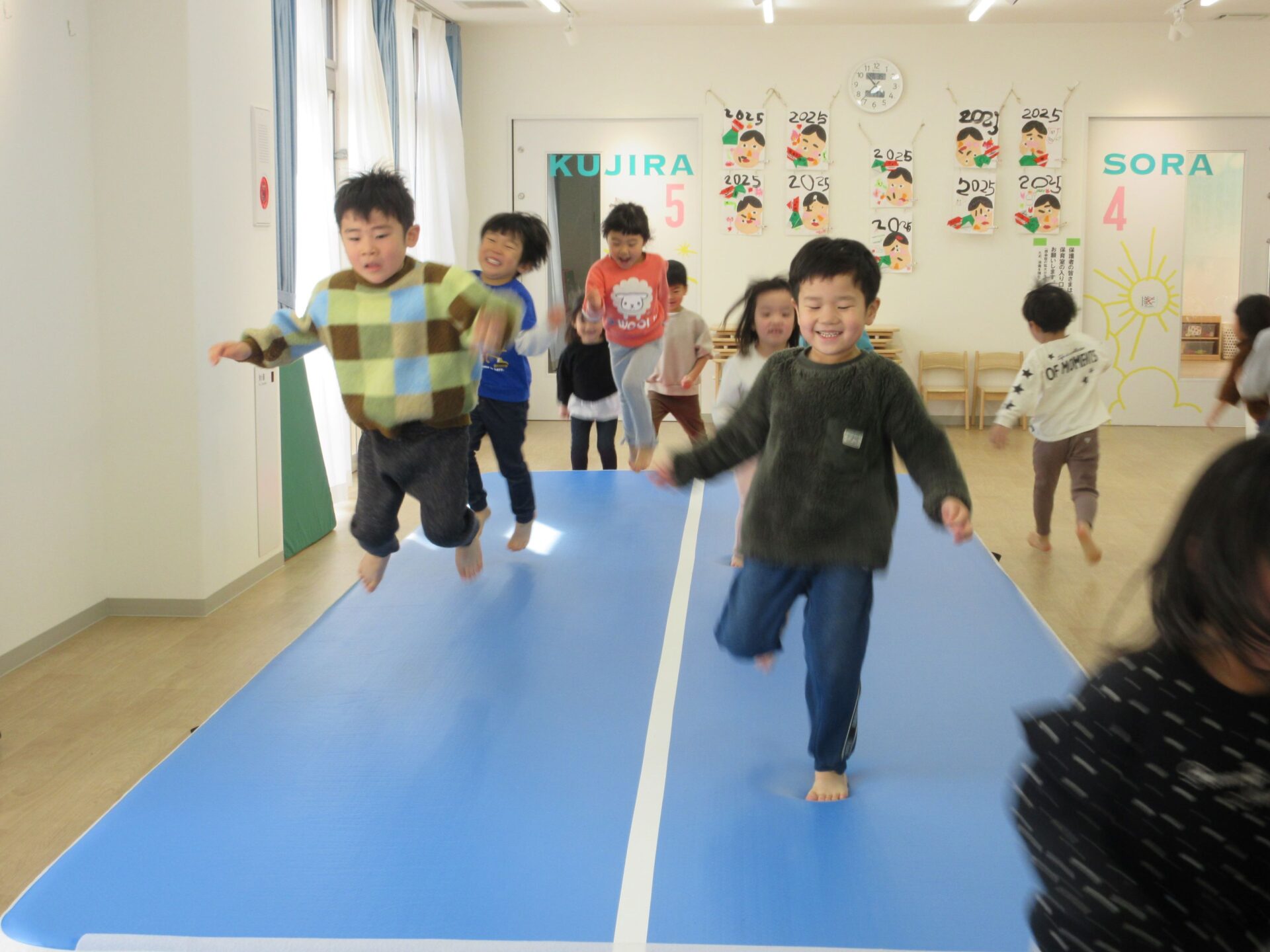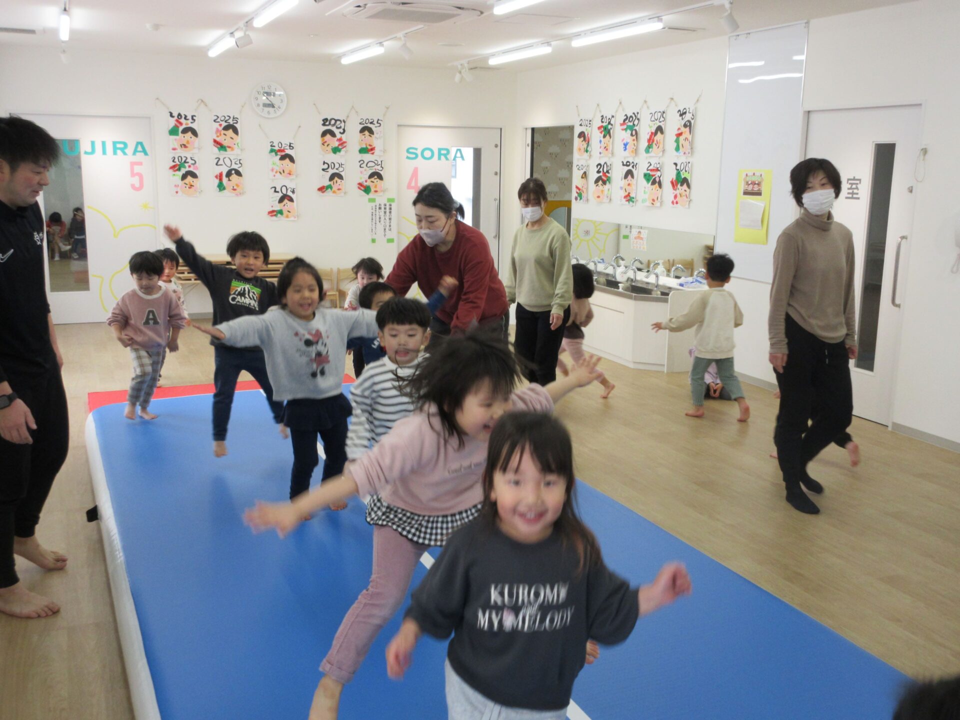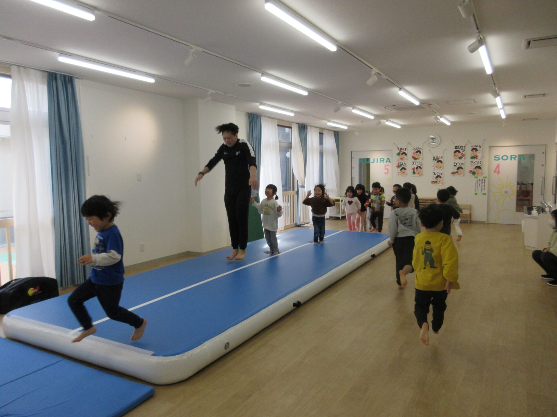 1月17日(金)、新年1回目の運動遊び教室、みんなすっかり慣れてきました。はじめに、3歳にじ組の時間です。今回は、先生が大きなふわふわマットを用意してくださいました。