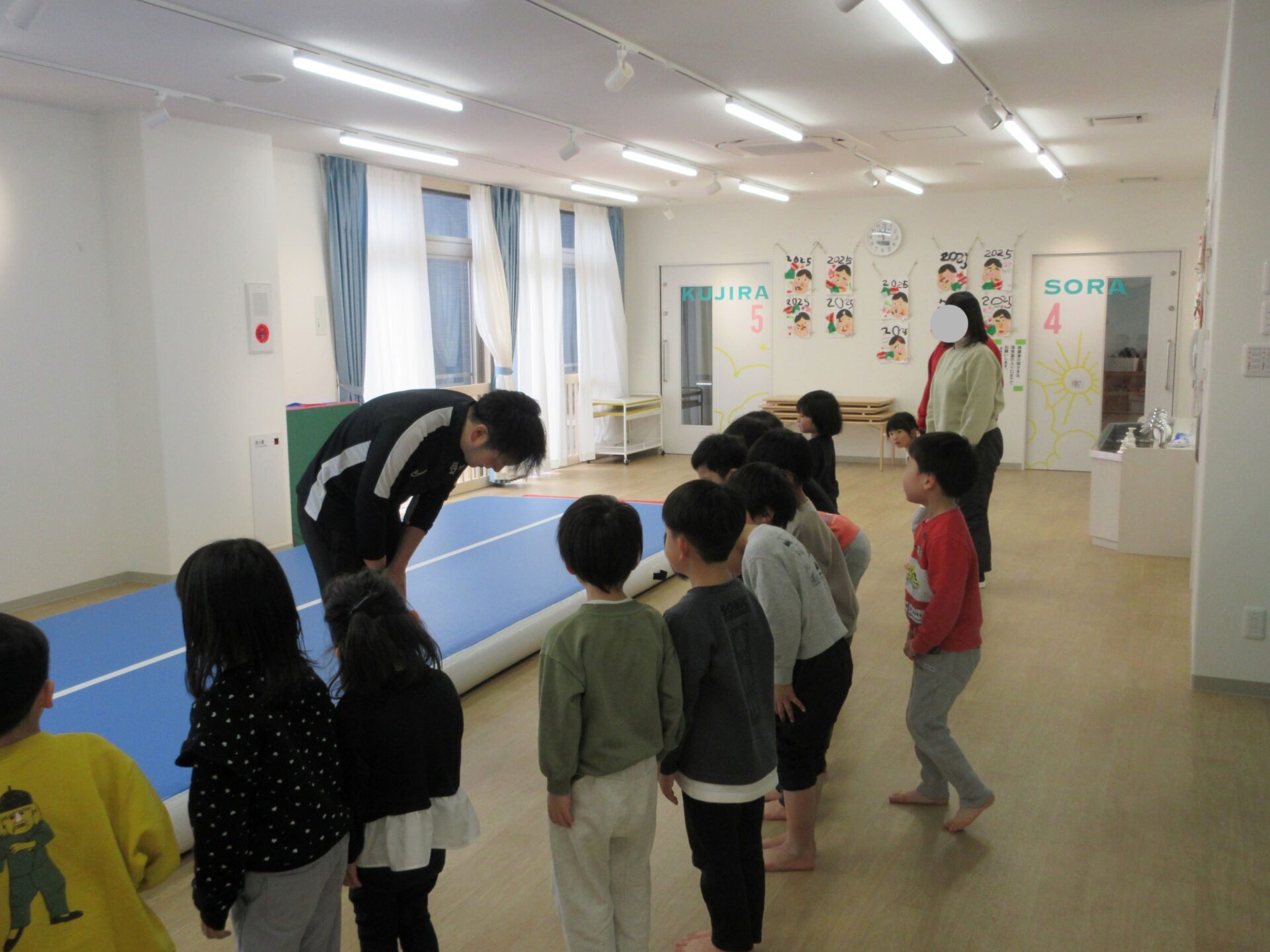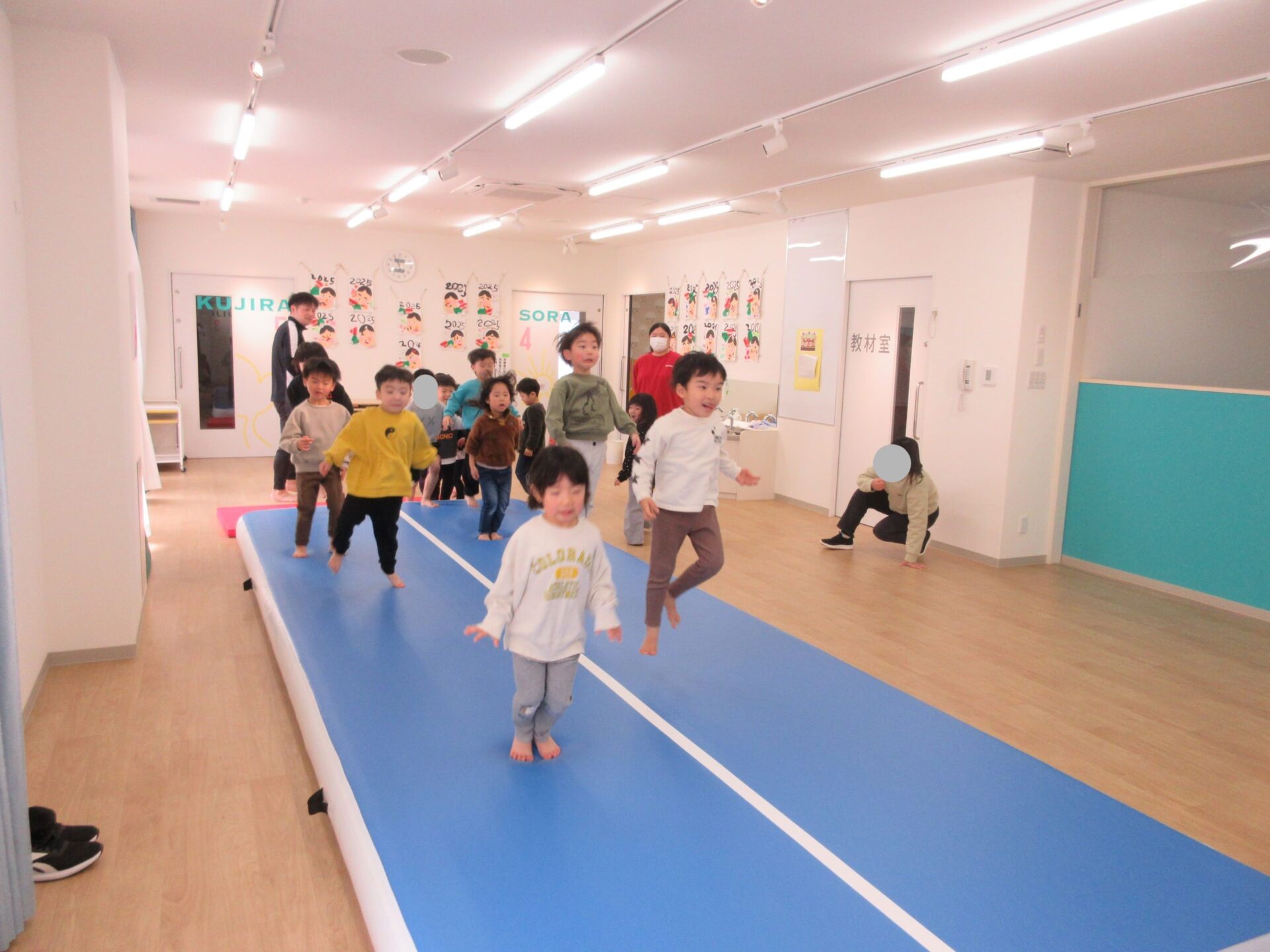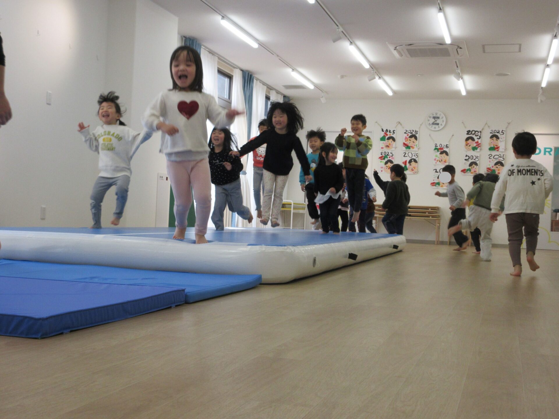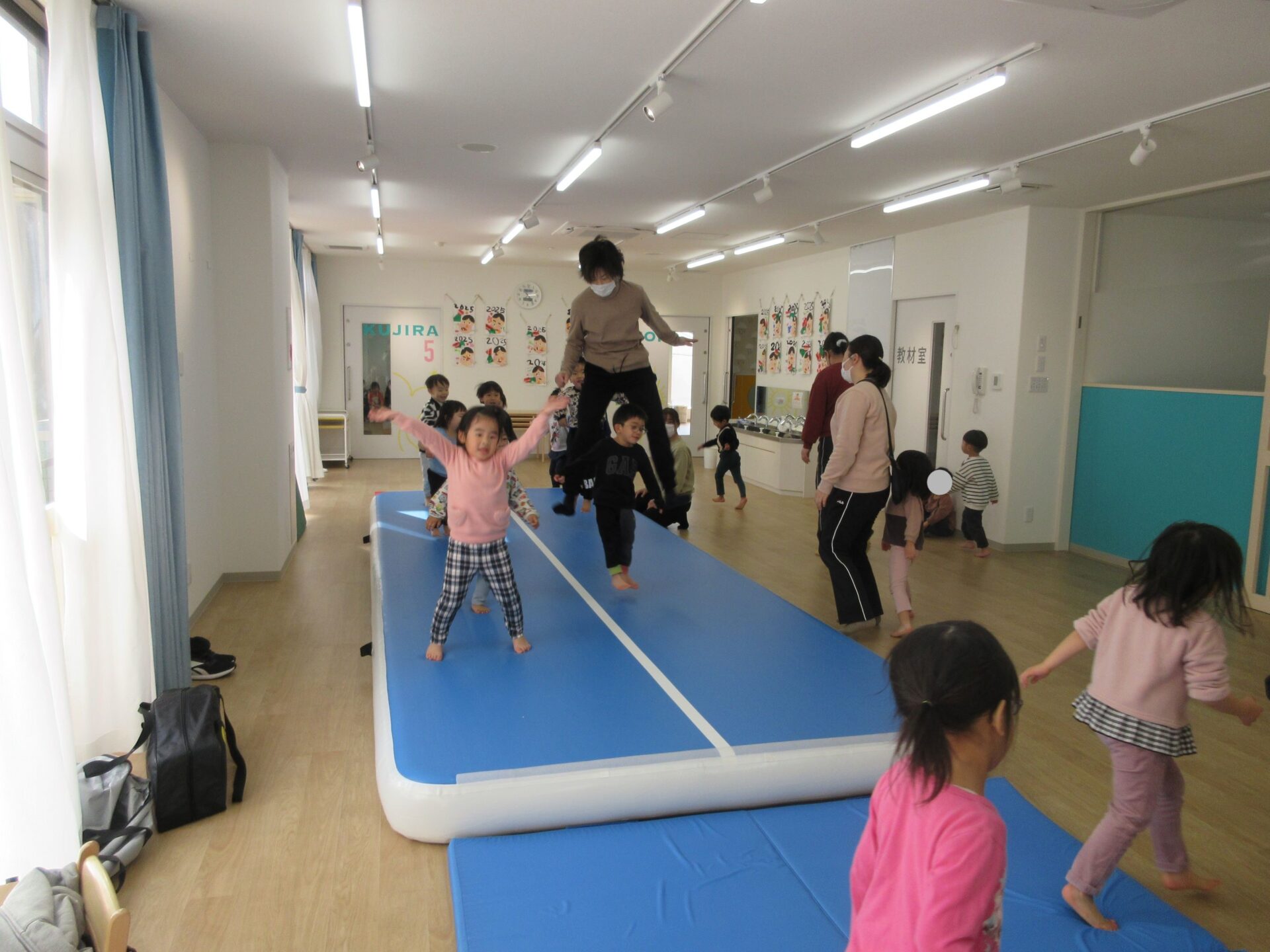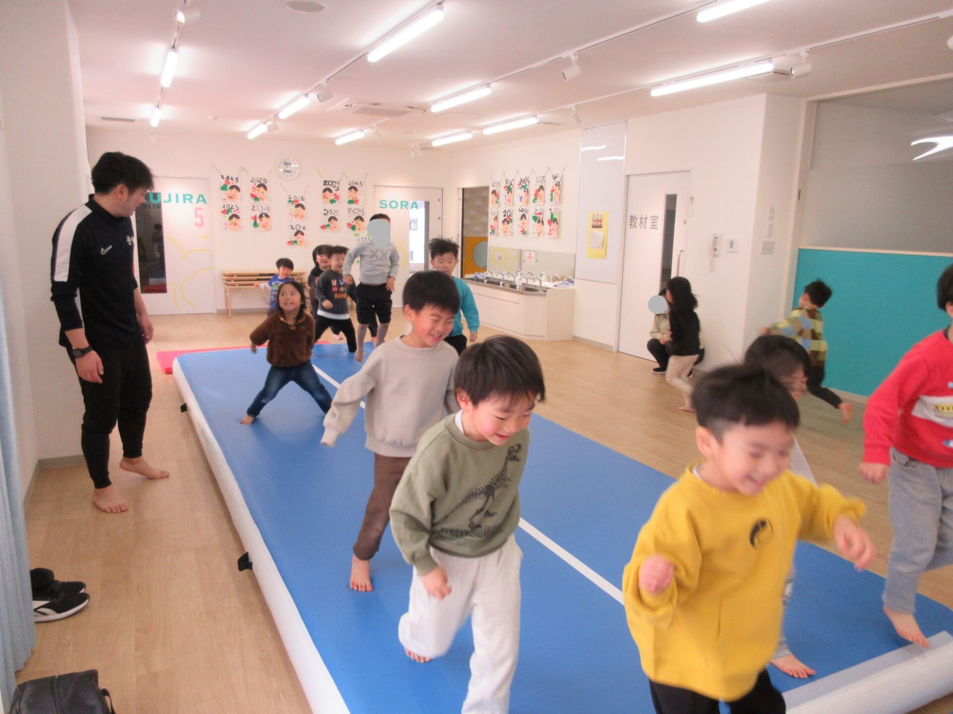 1月17日(金)、新年1回目の運動遊び教室、みんなすっかり慣れてきました。はじめに、3歳にじ組の時間です。今回は、先生が大きなふわふわマットを用意してくださいました。