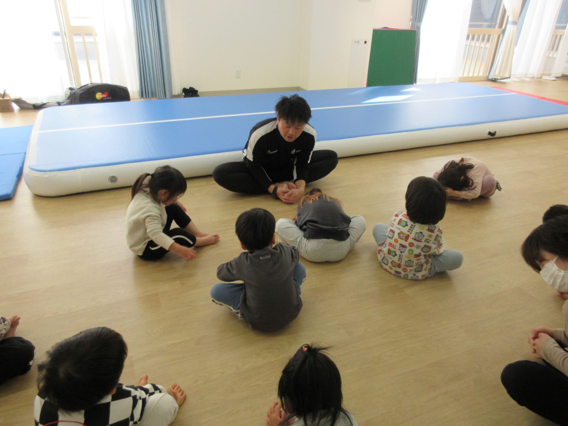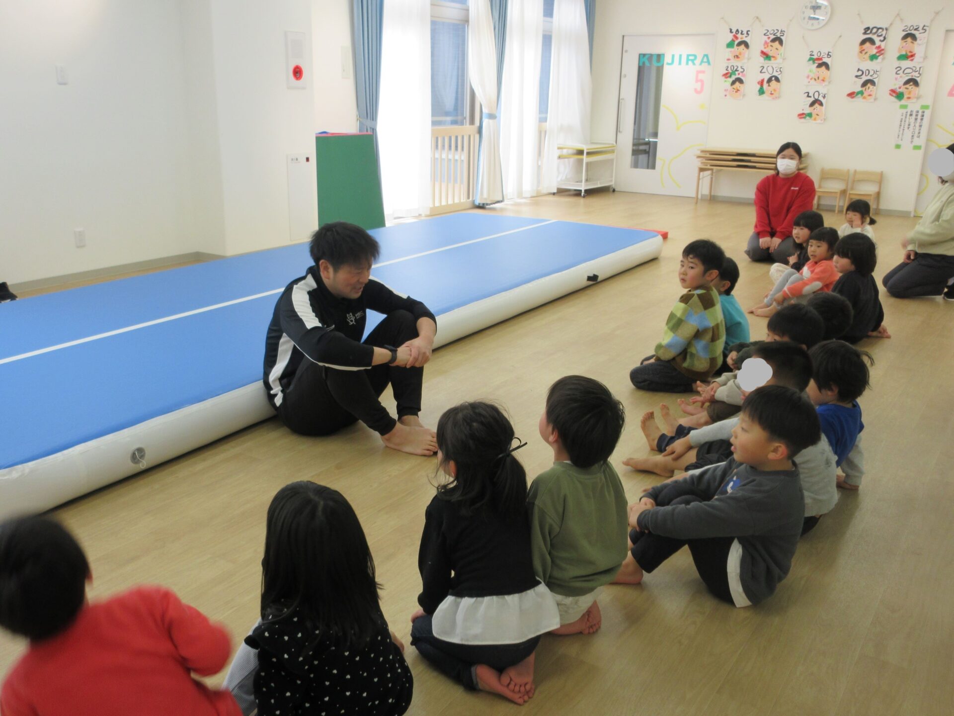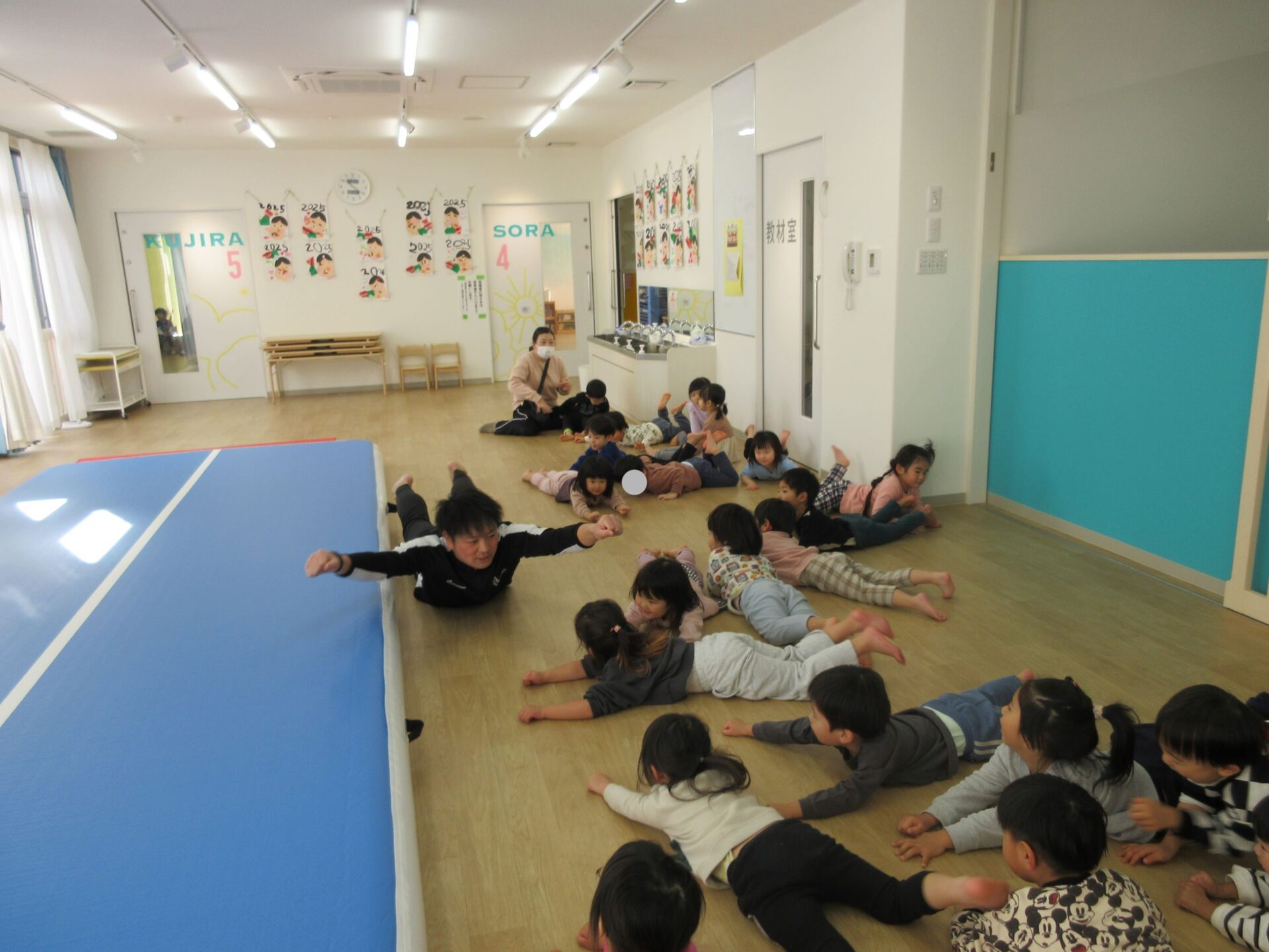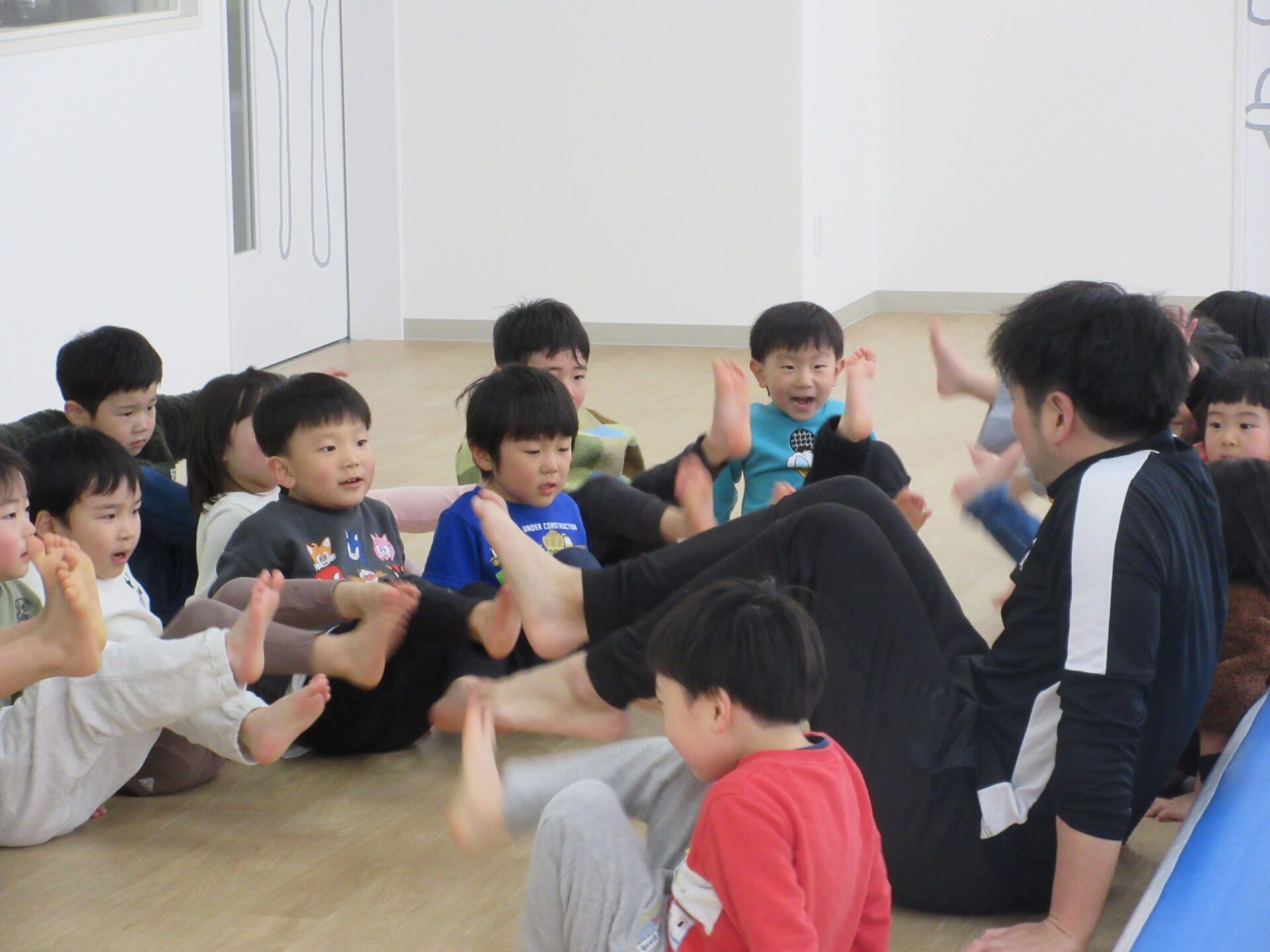 1月17日(金)、新年1回目の運動遊び教室、みんなすっかり慣れてきました。はじめに、3歳にじ組の時間です。今回は、先生が大きなふわふわマットを用意してくださいました。