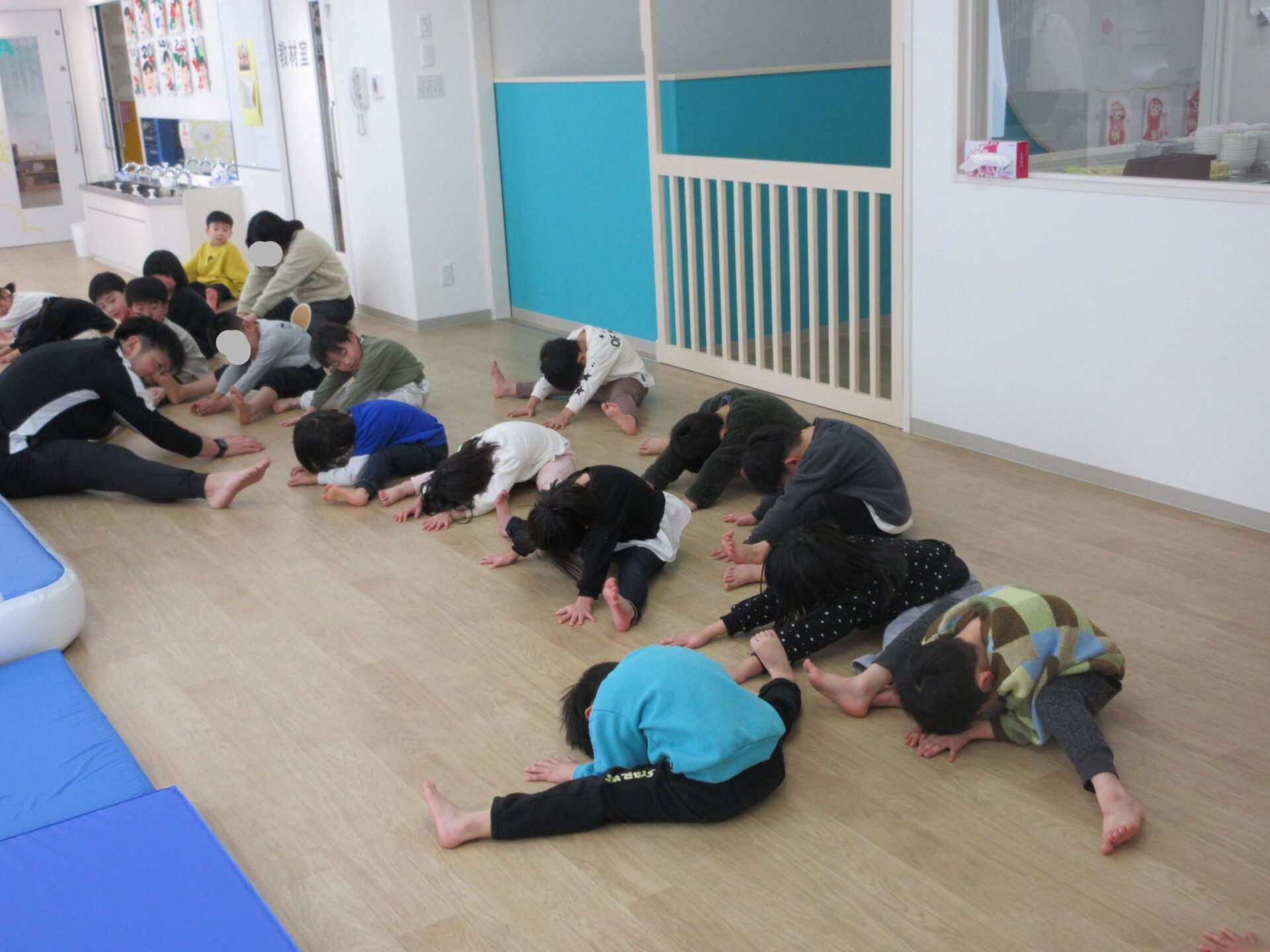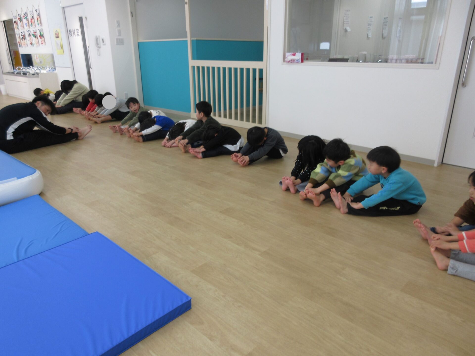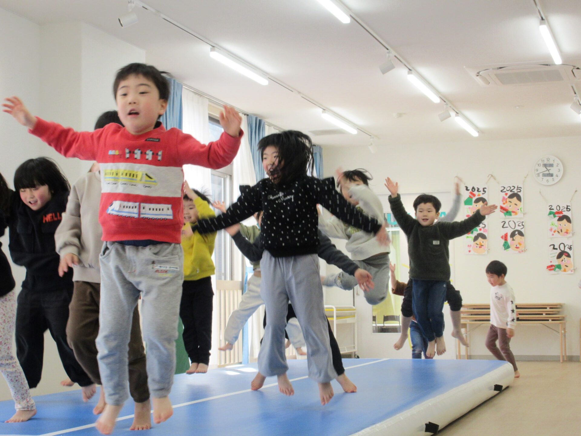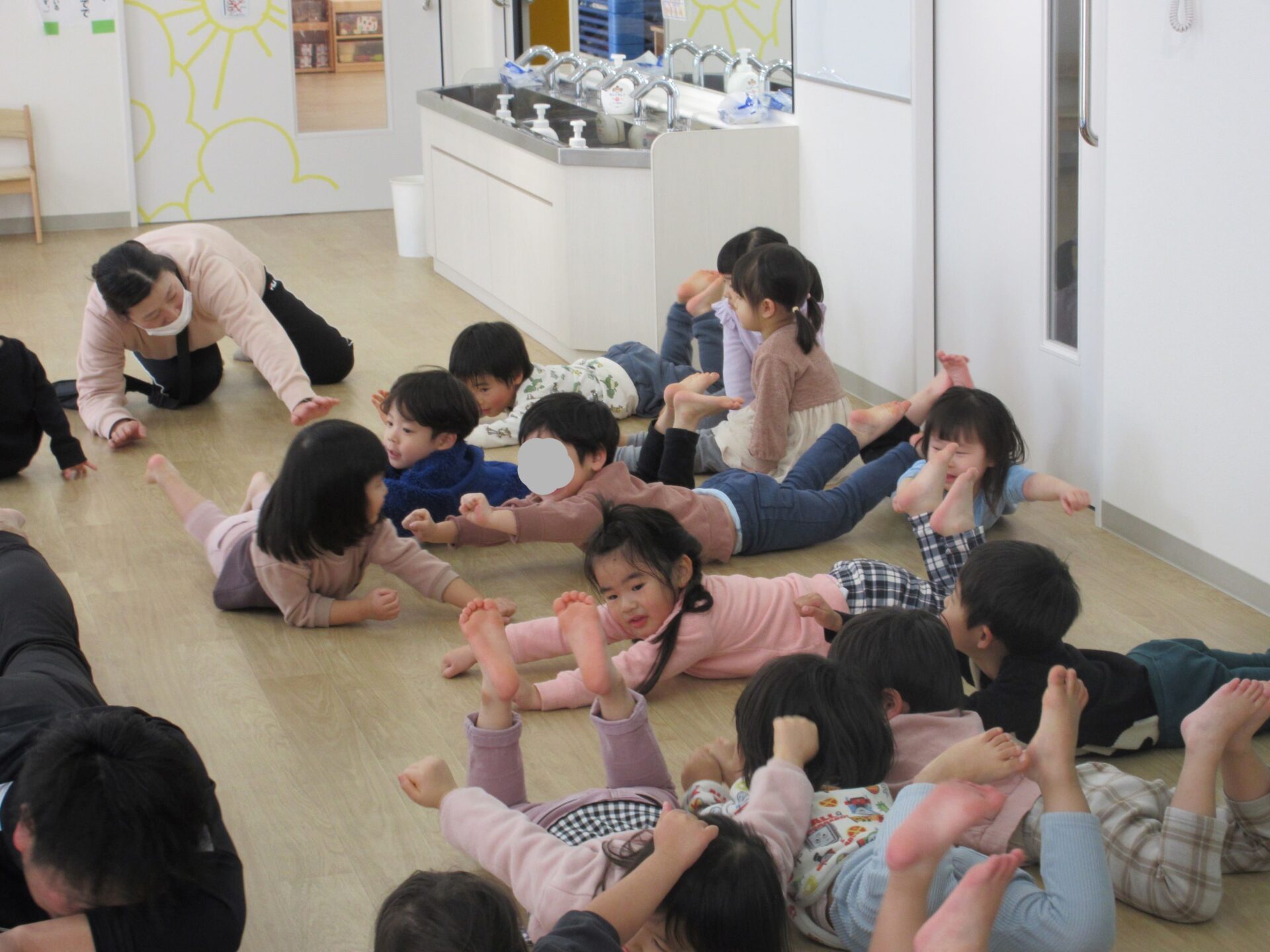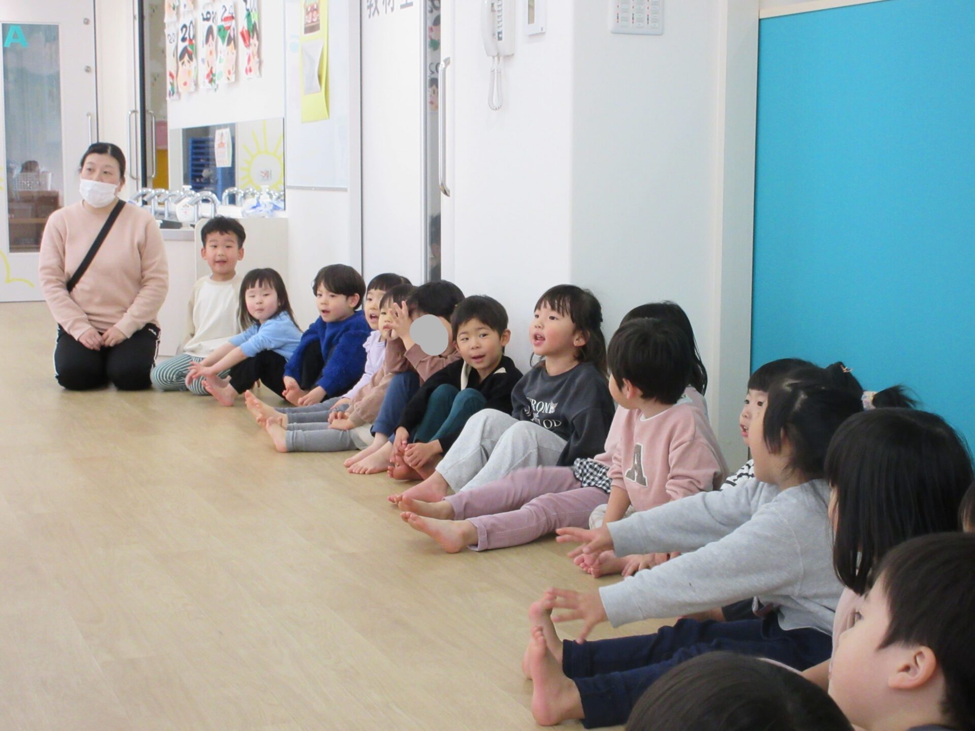 1月17日(金)、新年1回目の運動遊び教室、みんなすっかり慣れてきました。はじめに、3歳にじ組の時間です。今回は、先生が大きなふわふわマットを用意してくださいました。