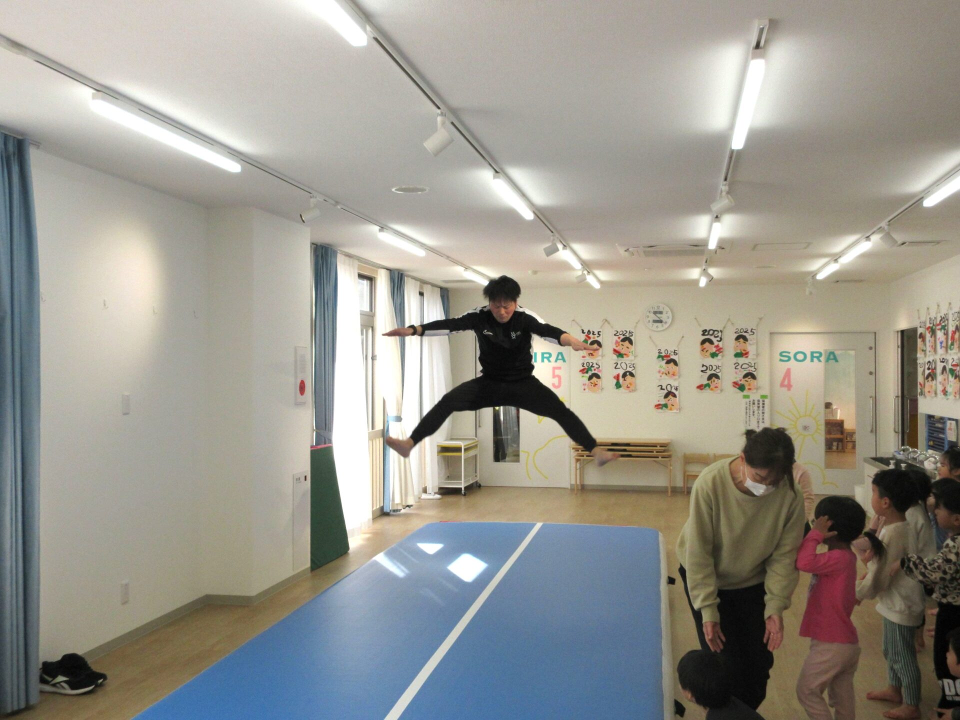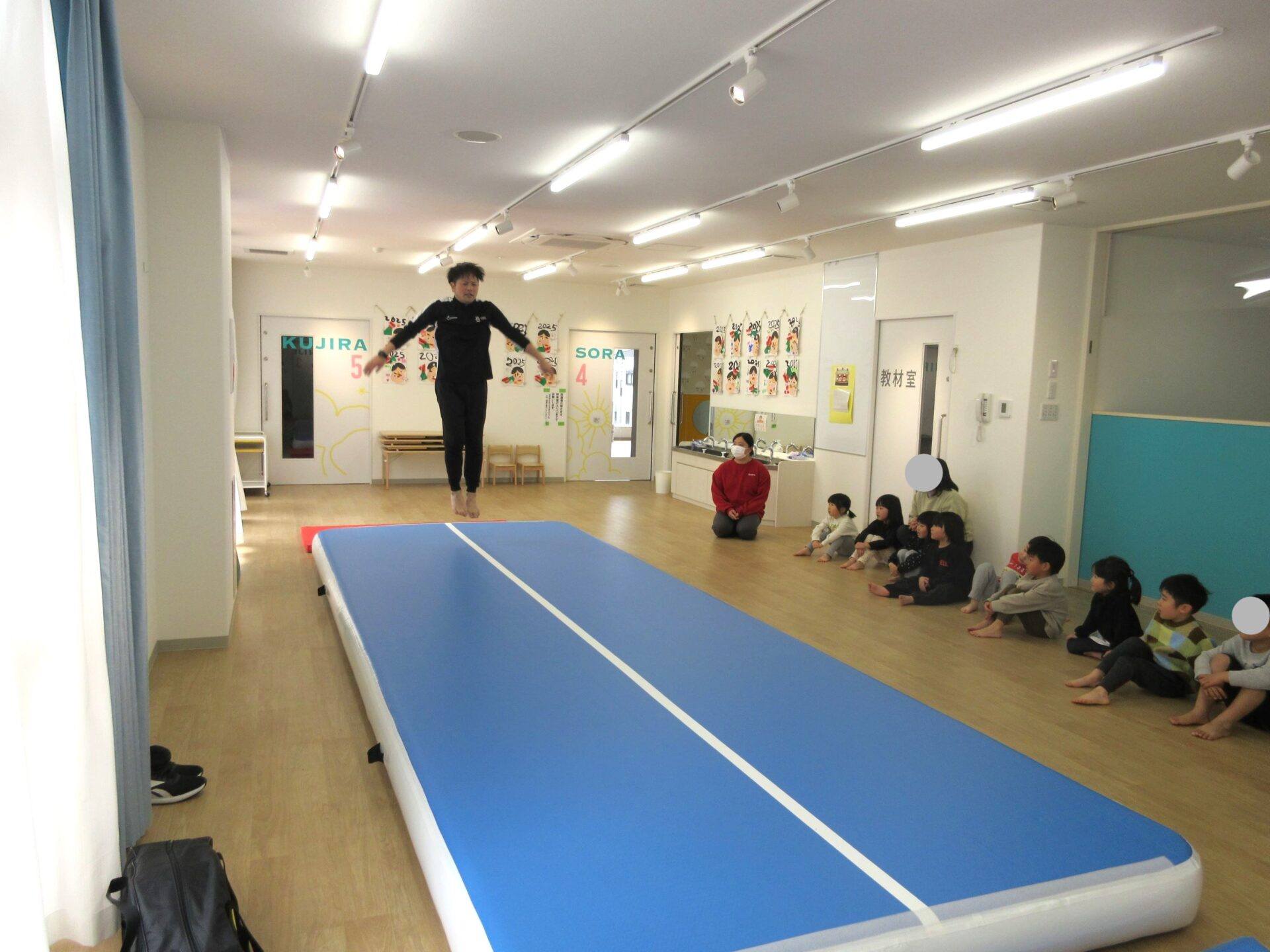 先生のお手本です。ふわふわのマットは、すごく高く跳び上がれます。