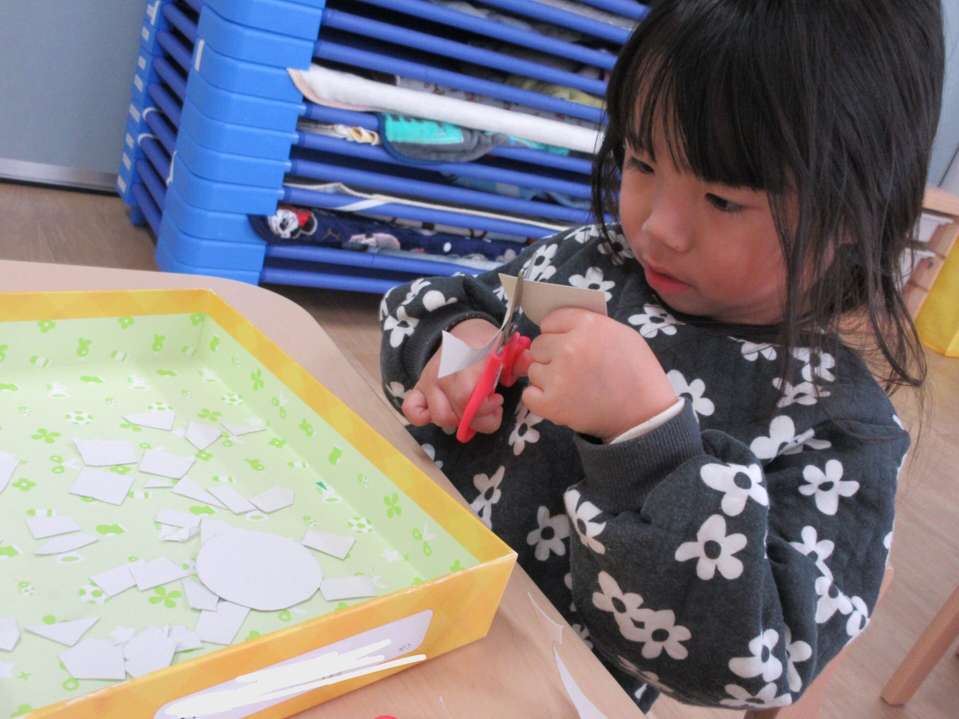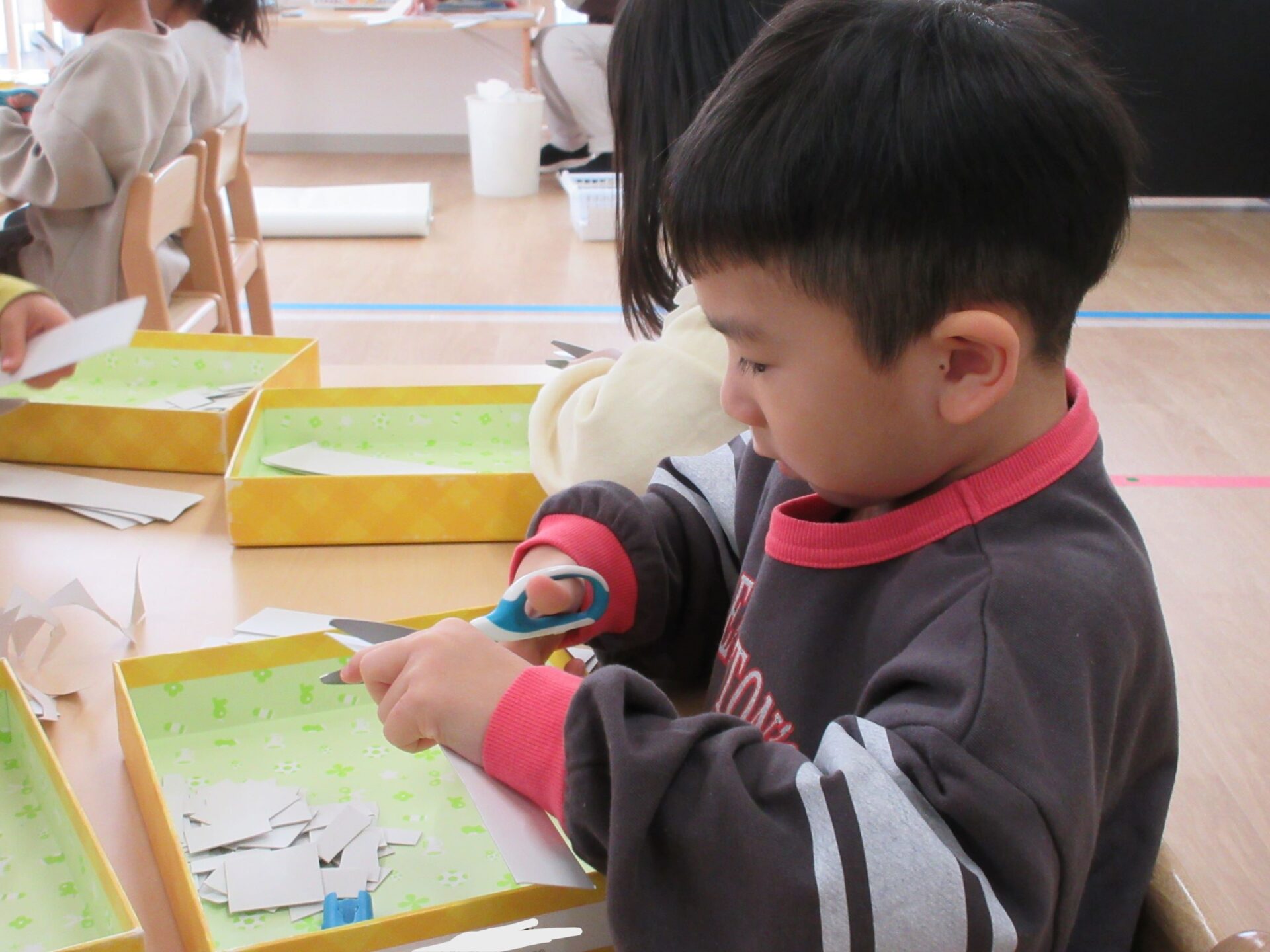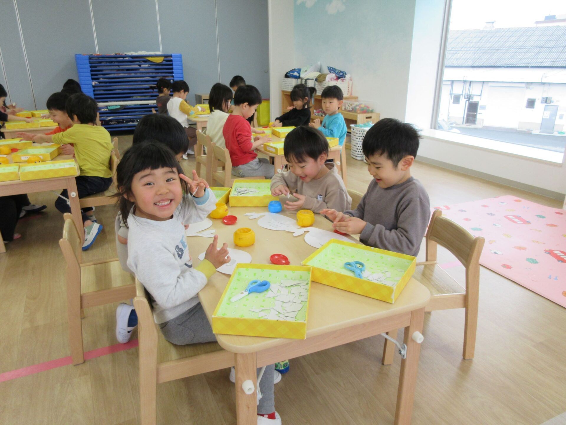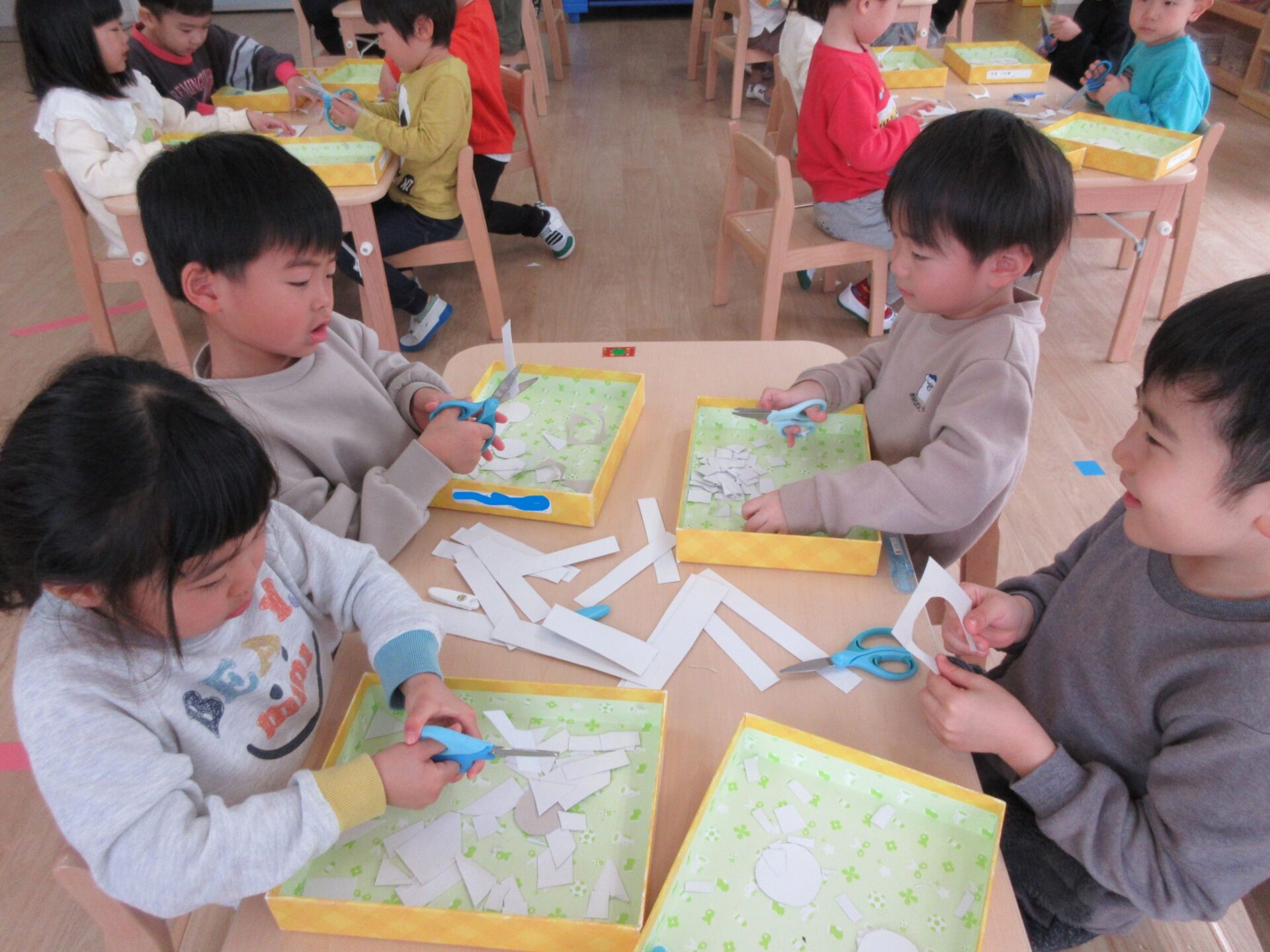 2025.02.10 お知らせ ブログ クジラの絵を製作中(そら組) 今日は久宝寺コミニティーセンターに掲示される作品を皆で作っています。 厚紙をハサミで切っていきますよ。 切る形は自由です。丸だったり、三角だったり、四角だったり。 どんな形も上手に切れますよ! 切った厚紙をお道具箱の中にためていきます。 チョキチョキ♪真剣です。 切れた厚紙をクジラの画用紙に貼っていきます。一人ひとつのクジラです。 g みんなですると楽しいですね! 糊の扱いも上手になりましたよ。さすがそら組さんですね! みんなで作ったくじらを合わせて一つの大きなクジラにします!この作品は久宝寺コミセン祭りに出品します。2月22(土)23(日)10時から15時まで、二階の集会室にて展示予定です。お楽しみに! 一覧へ戻る