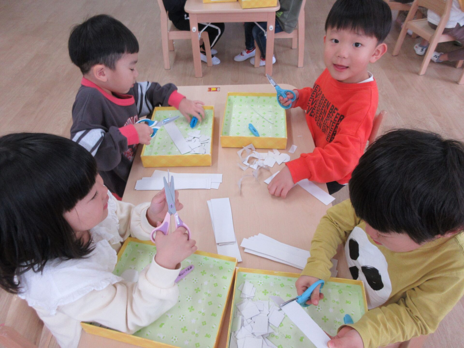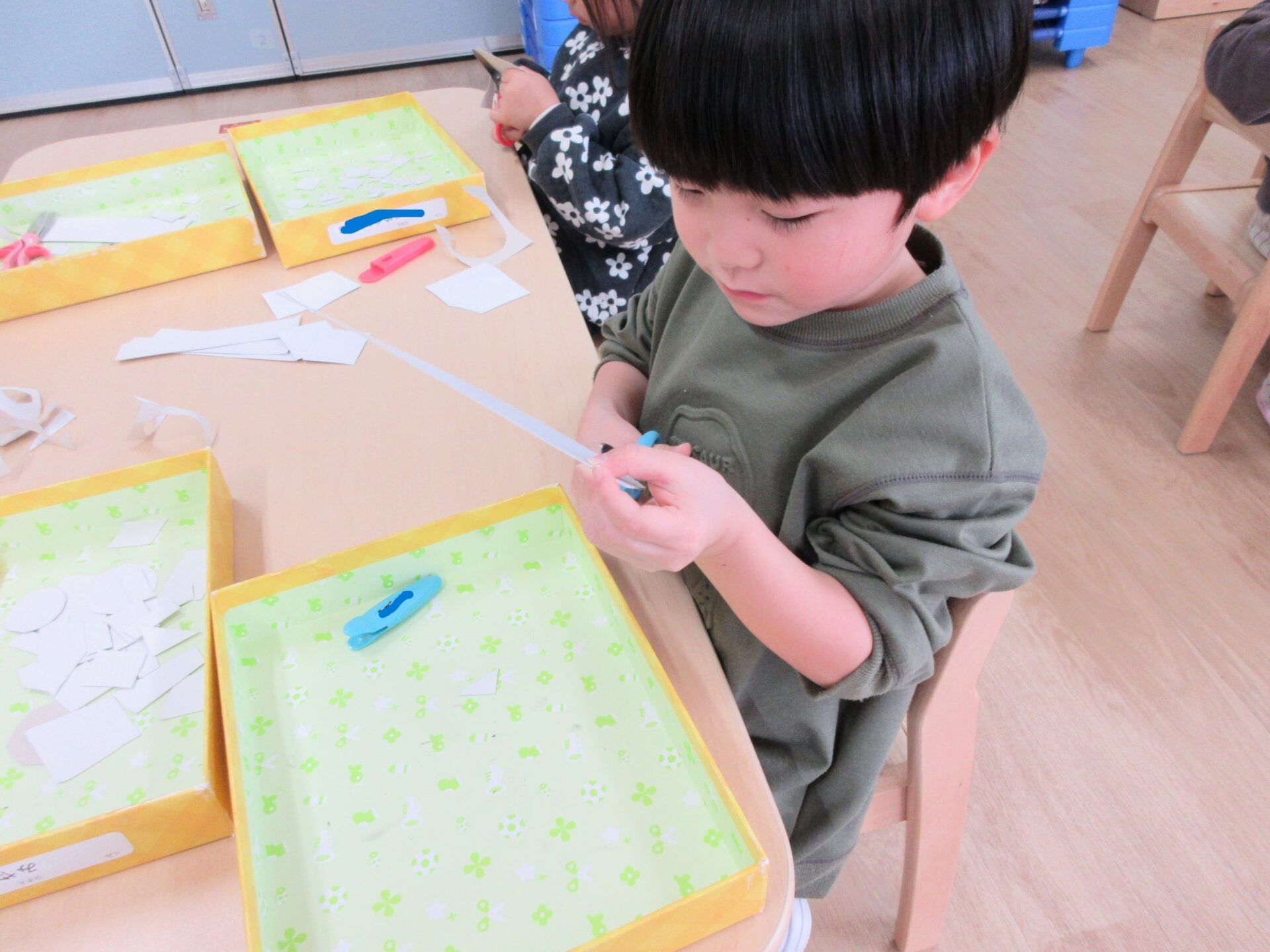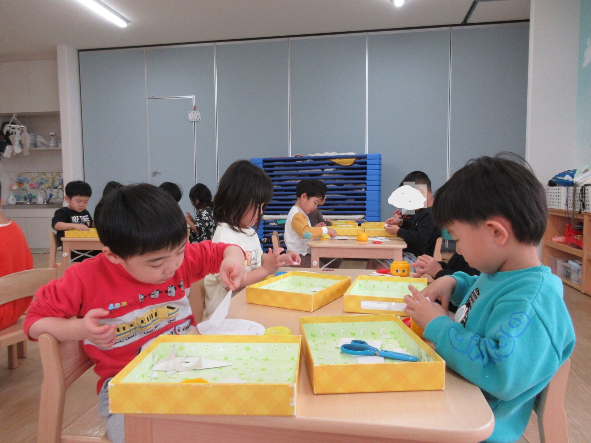 2025.02.10 お知らせ ブログ クジラの絵を製作中(そら組) 今日は久宝寺コミニティーセンターに掲示される作品を皆で作っています。 厚紙をハサミで切っていきますよ。 切る形は自由です。丸だったり、三角だったり、四角だったり。 どんな形も上手に切れますよ! 切った厚紙をお道具箱の中にためていきます。 チョキチョキ♪真剣です。 切れた厚紙をクジラの画用紙に貼っていきます。一人ひとつのクジラです。 g みんなですると楽しいですね! 糊の扱いも上手になりましたよ。さすがそら組さんですね! みんなで作ったくじらを合わせて一つの大きなクジラにします!この作品は久宝寺コミセン祭りに出品します。2月22(土)23(日)10時から15時まで、二階の集会室にて展示予定です。お楽しみに! 一覧へ戻る