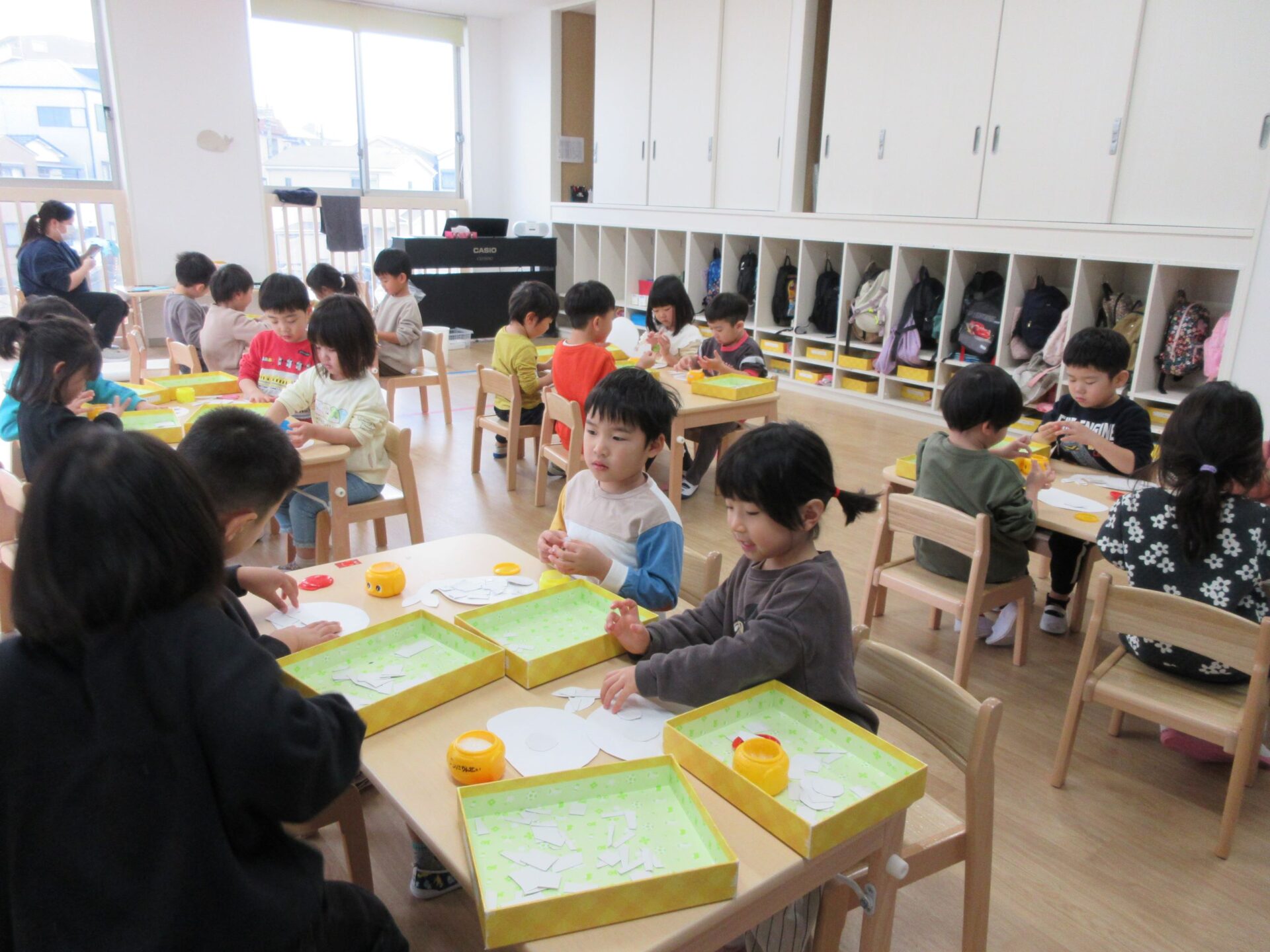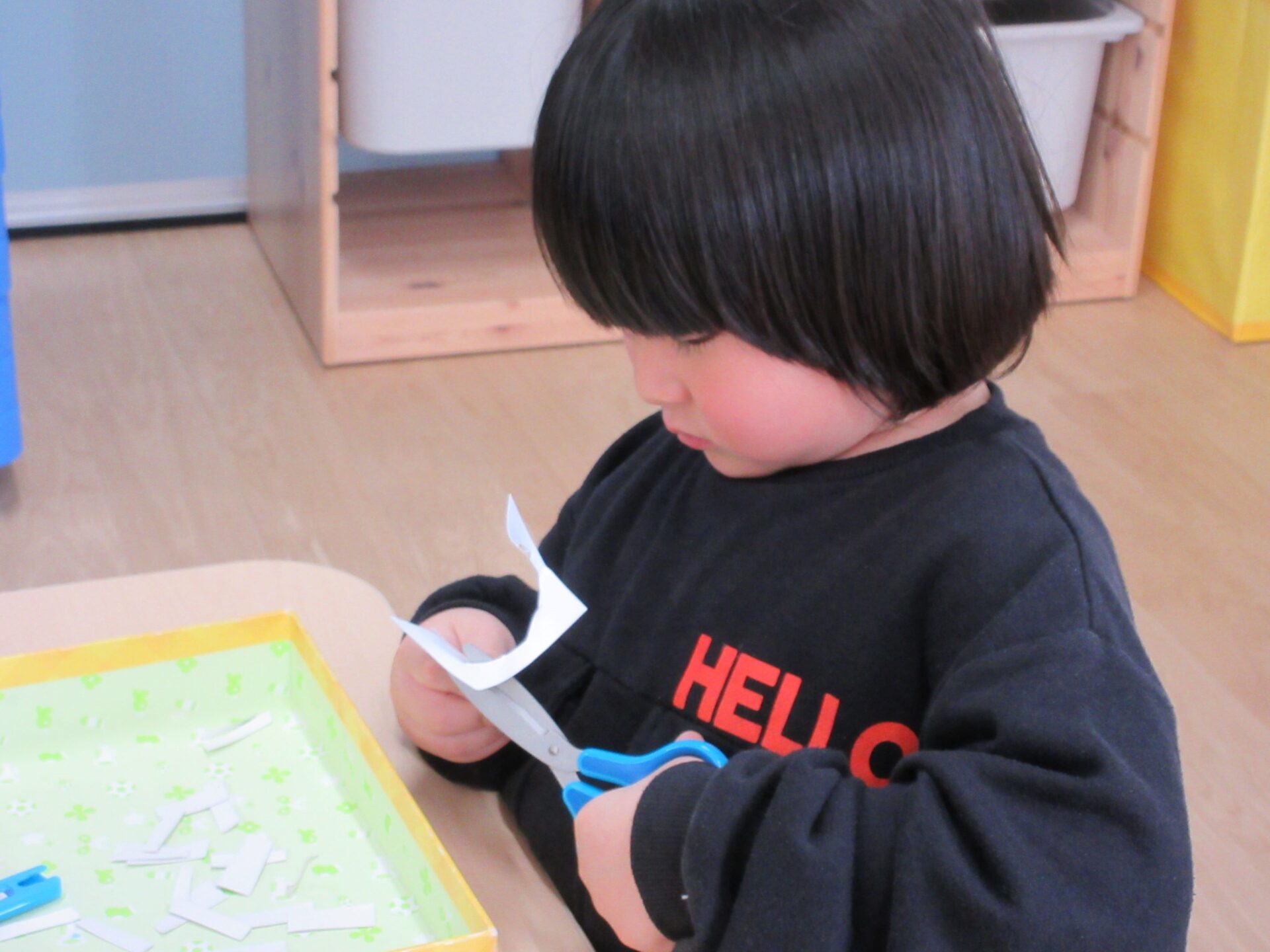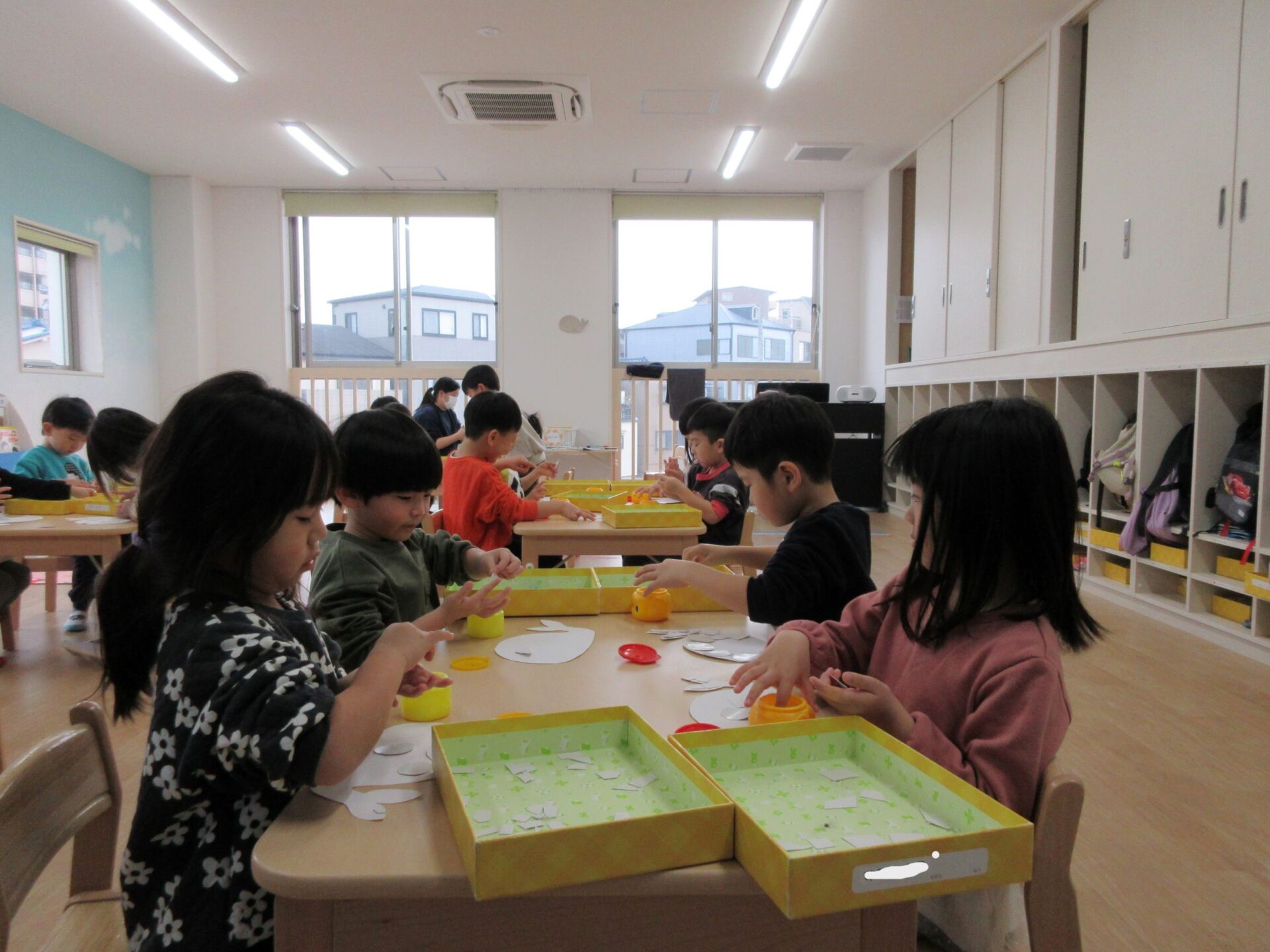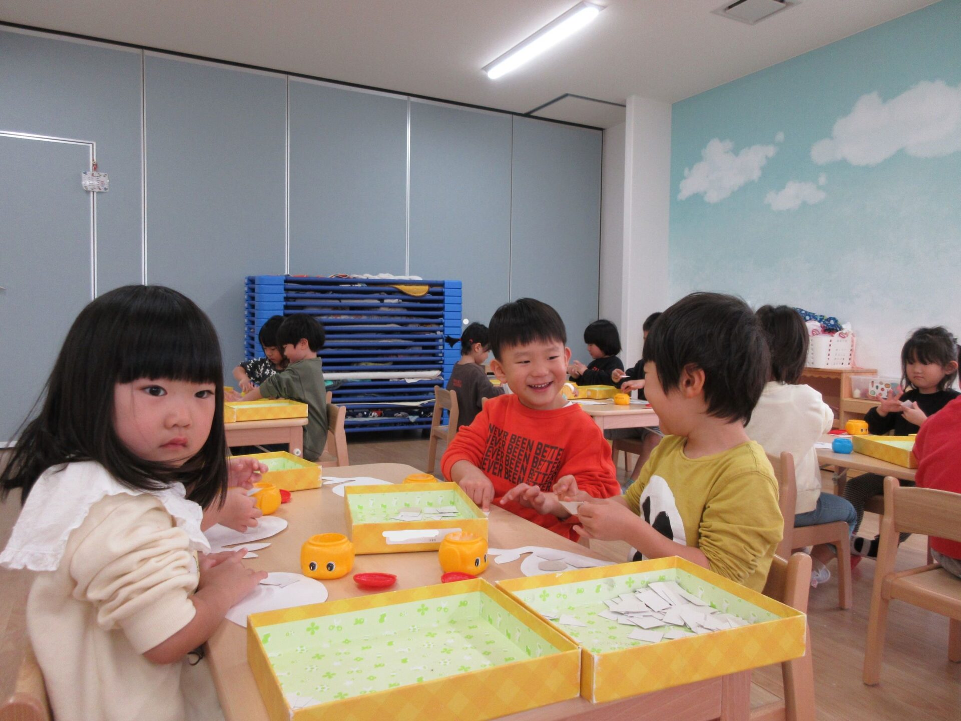 2025.02.10 お知らせ ブログ クジラの絵を製作中(そら組) 今日は久宝寺コミニティーセンターに掲示される作品を皆で作っています。 厚紙をハサミで切っていきますよ。 切る形は自由です。丸だったり、三角だったり、四角だったり。 どんな形も上手に切れますよ! 切った厚紙をお道具箱の中にためていきます。 チョキチョキ♪真剣です。 切れた厚紙をクジラの画用紙に貼っていきます。一人ひとつのクジラです。 g みんなですると楽しいですね! 糊の扱いも上手になりましたよ。さすがそら組さんですね! みんなで作ったくじらを合わせて一つの大きなクジラにします!この作品は久宝寺コミセン祭りに出品します。2月22(土)23(日)10時から15時まで、二階の集会室にて展示予定です。お楽しみに! 一覧へ戻る