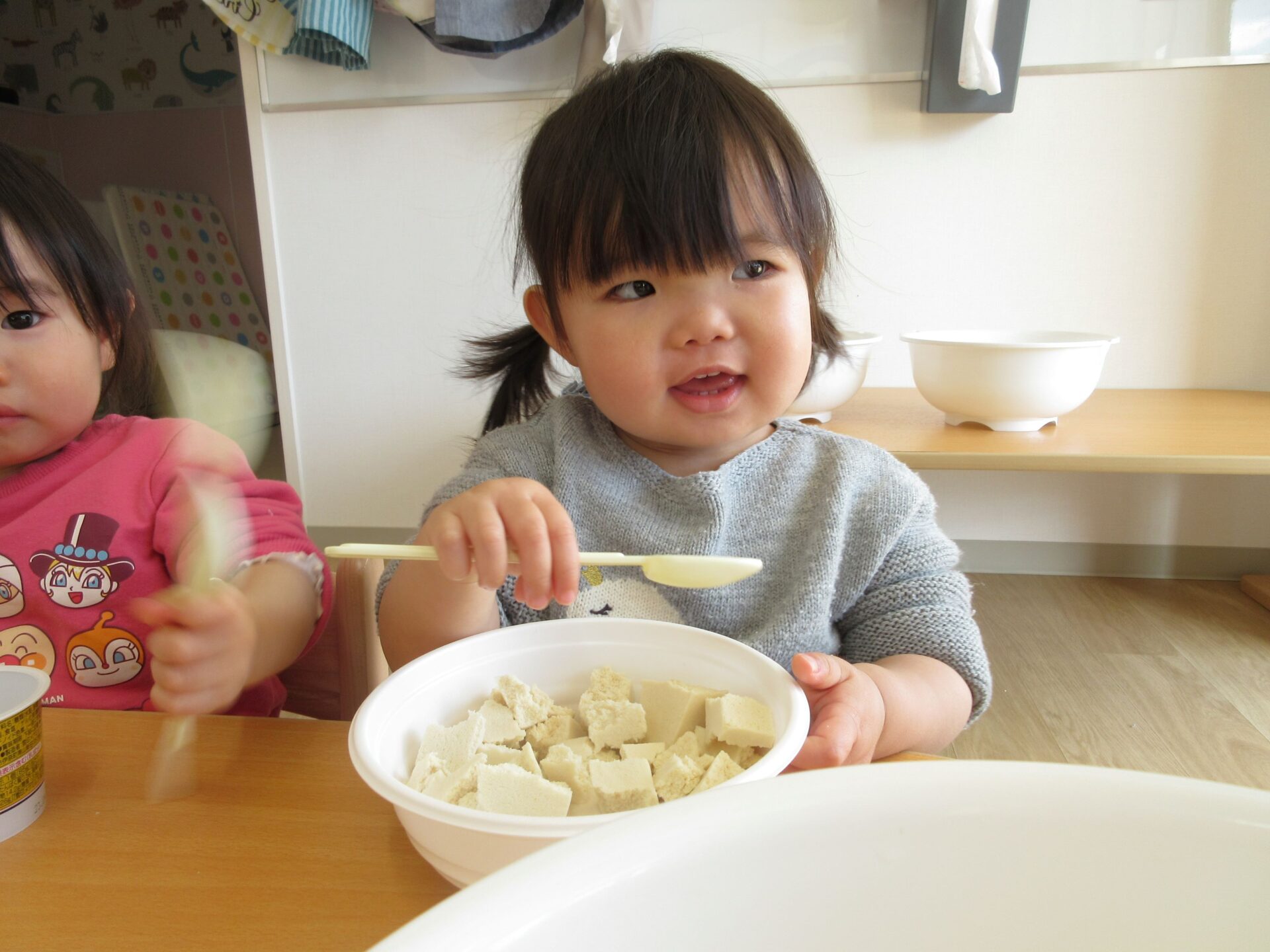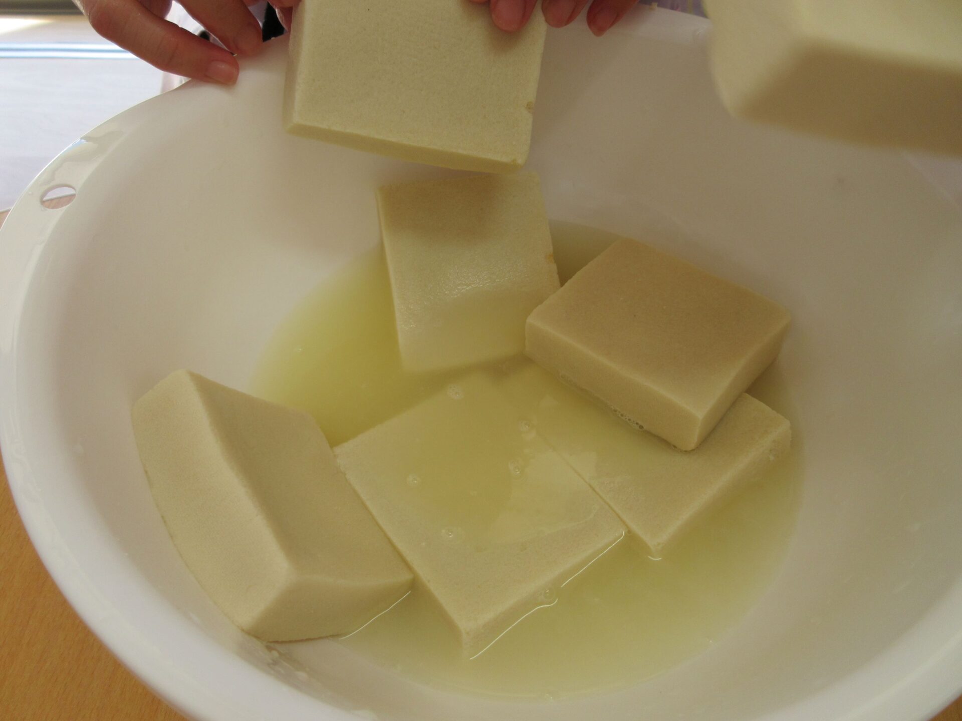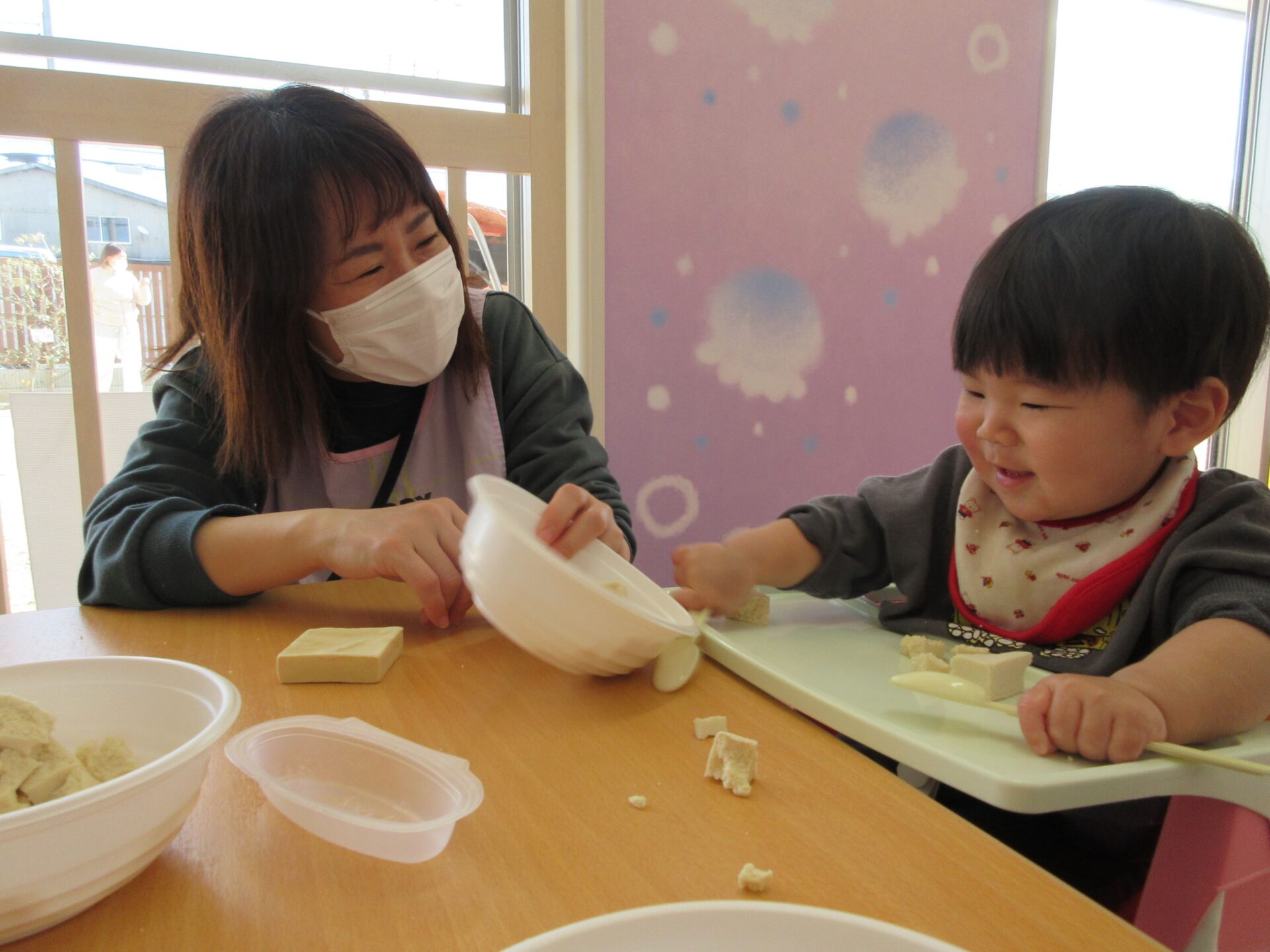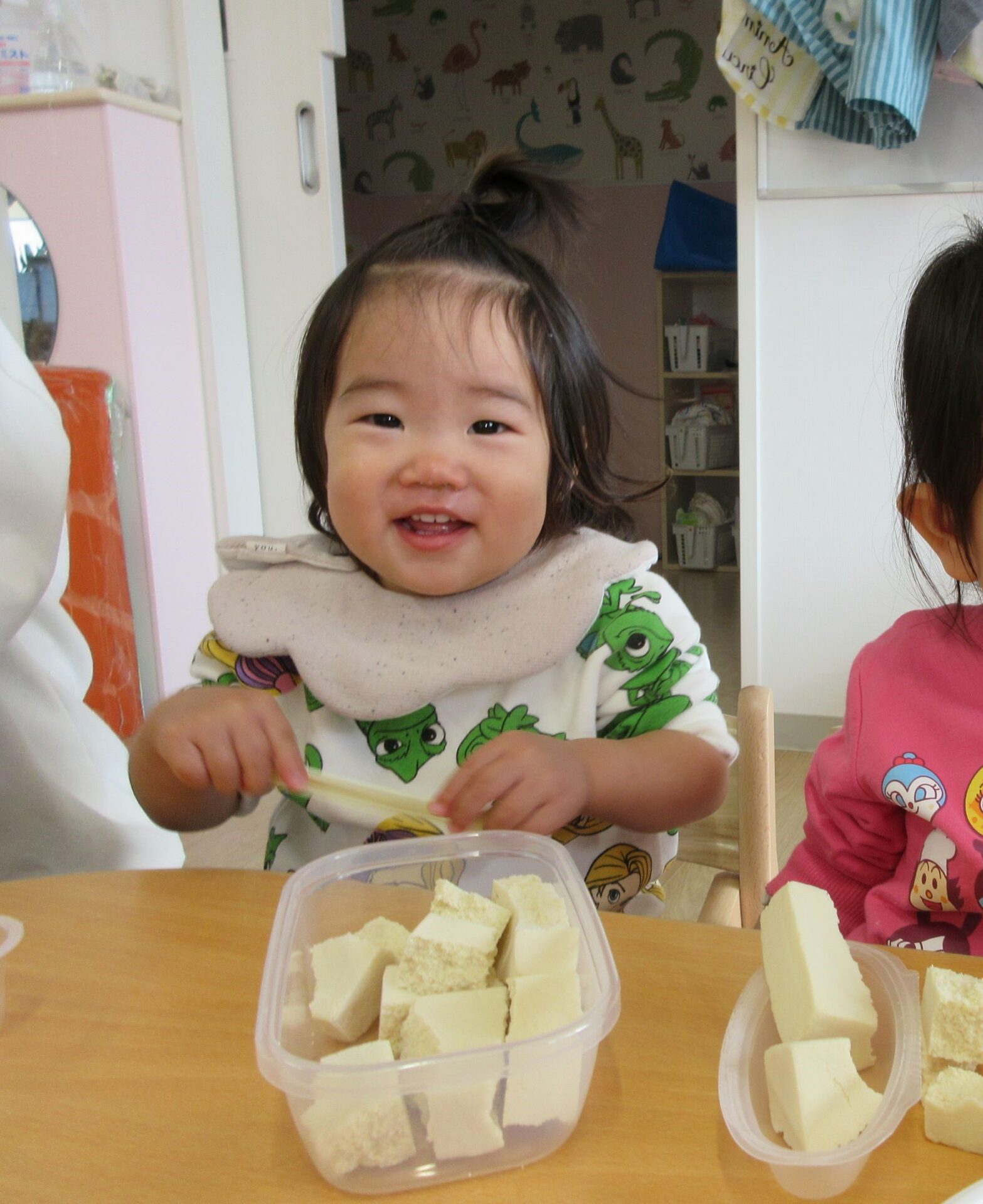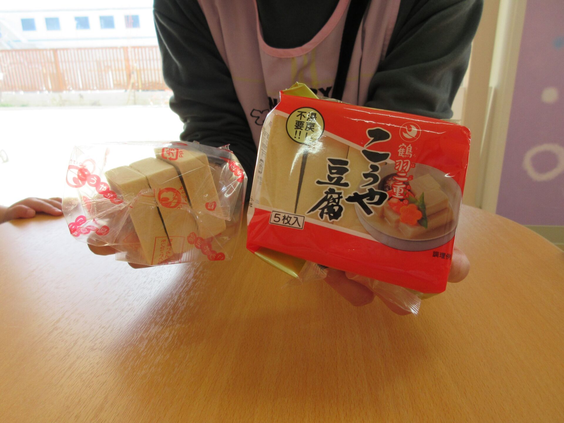 2月5日と7日に、高野豆腐の感触遊びをしました。