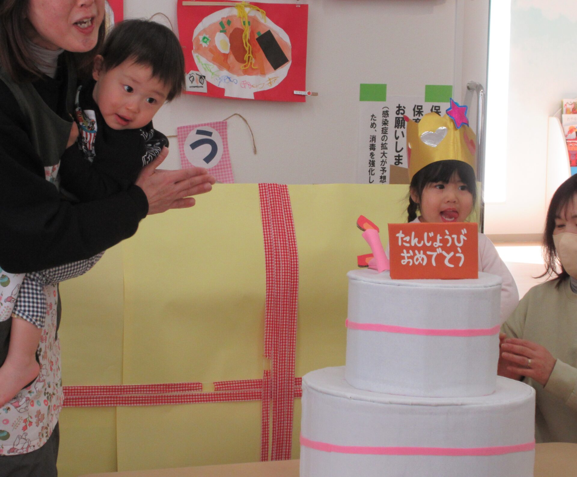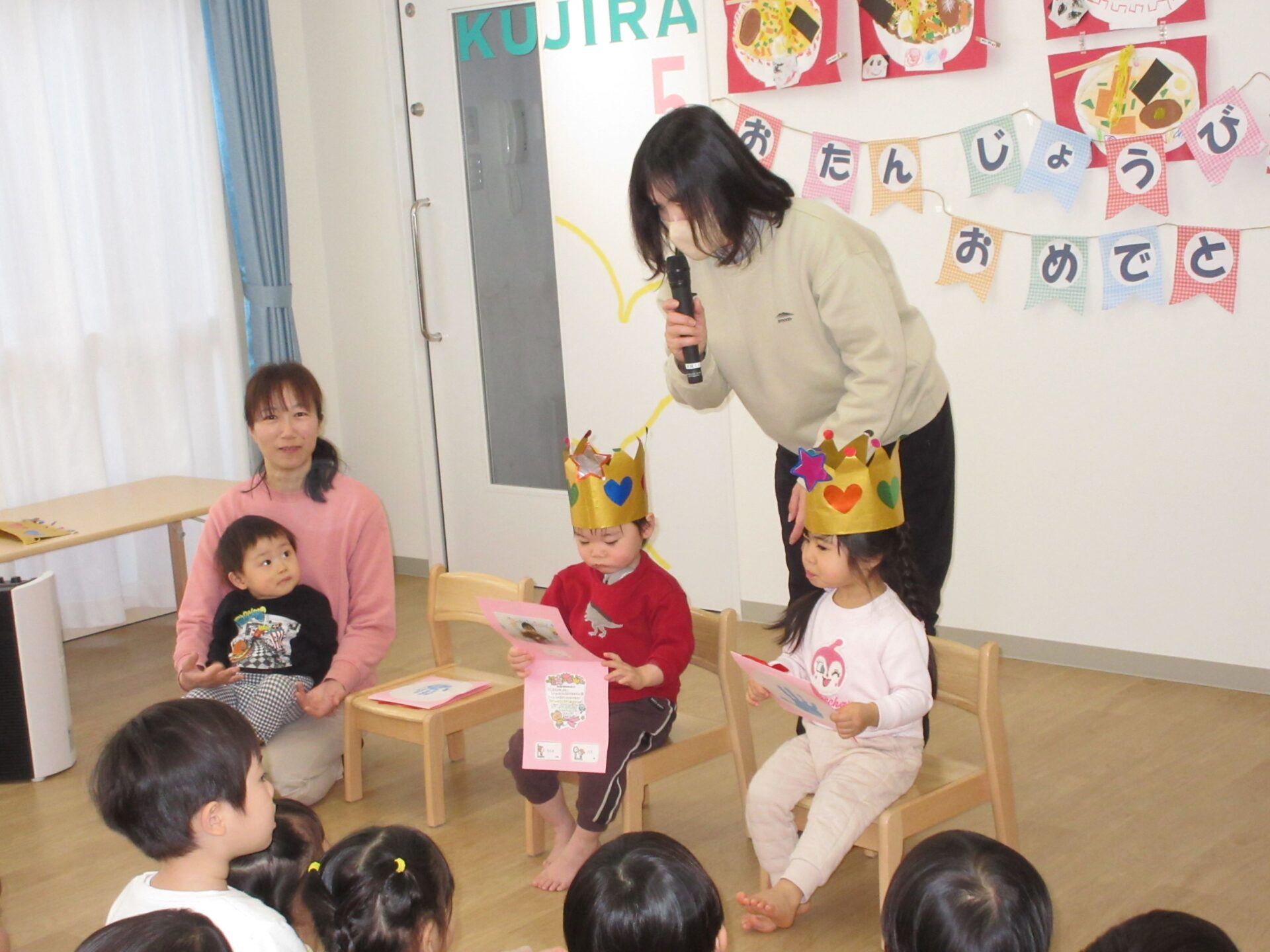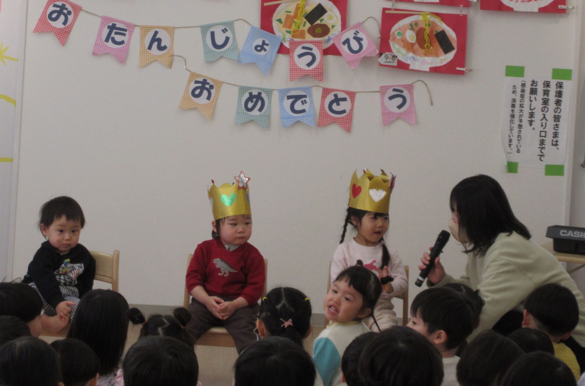2025.02.25 お知らせ ブログ 2月の誕生会🎂 2/19(水)2月生まれの誕生会がありました✨ 2月は、3名の園児が誕生日を迎えます✨ 「おなまえは?」「何歳になりましたか?」インタビューにもこたえましたよ🎤 おたんじょうカードをもらって嬉しそうですね♡ 先生からの出し物のプレゼントです!「はこのなかみはなんでしょう~?」 アンパンマンや白菜、先生などなど… いろいろなものが出てきましたよ! みんな分かったかな!? 最後はケーキが出てきました!! ケーキのろうそくに向かって「ふぅー!!」2月生まれのみんな、おたんじょうびおめでとうございます👏✨✨ 一覧へ戻る