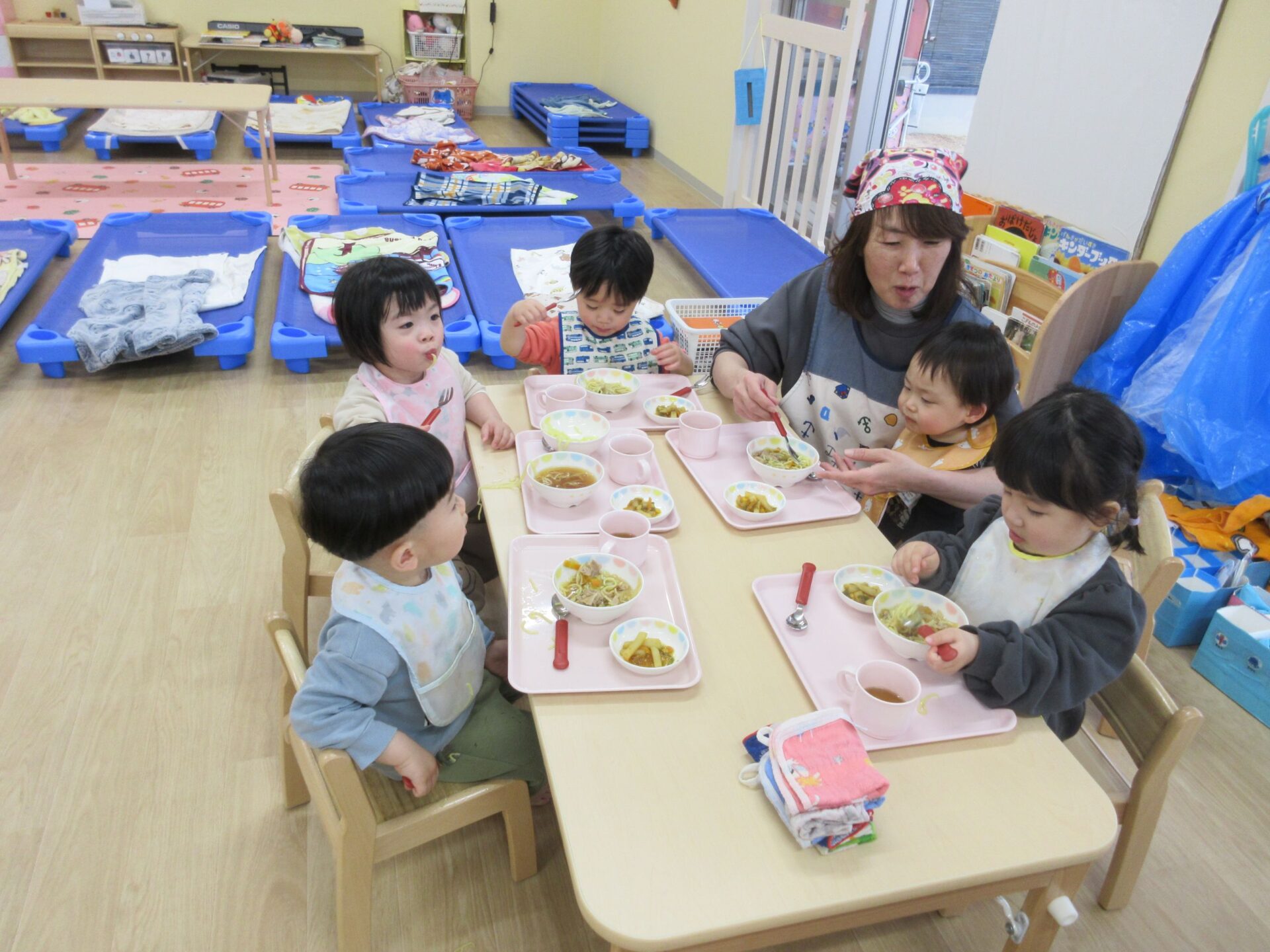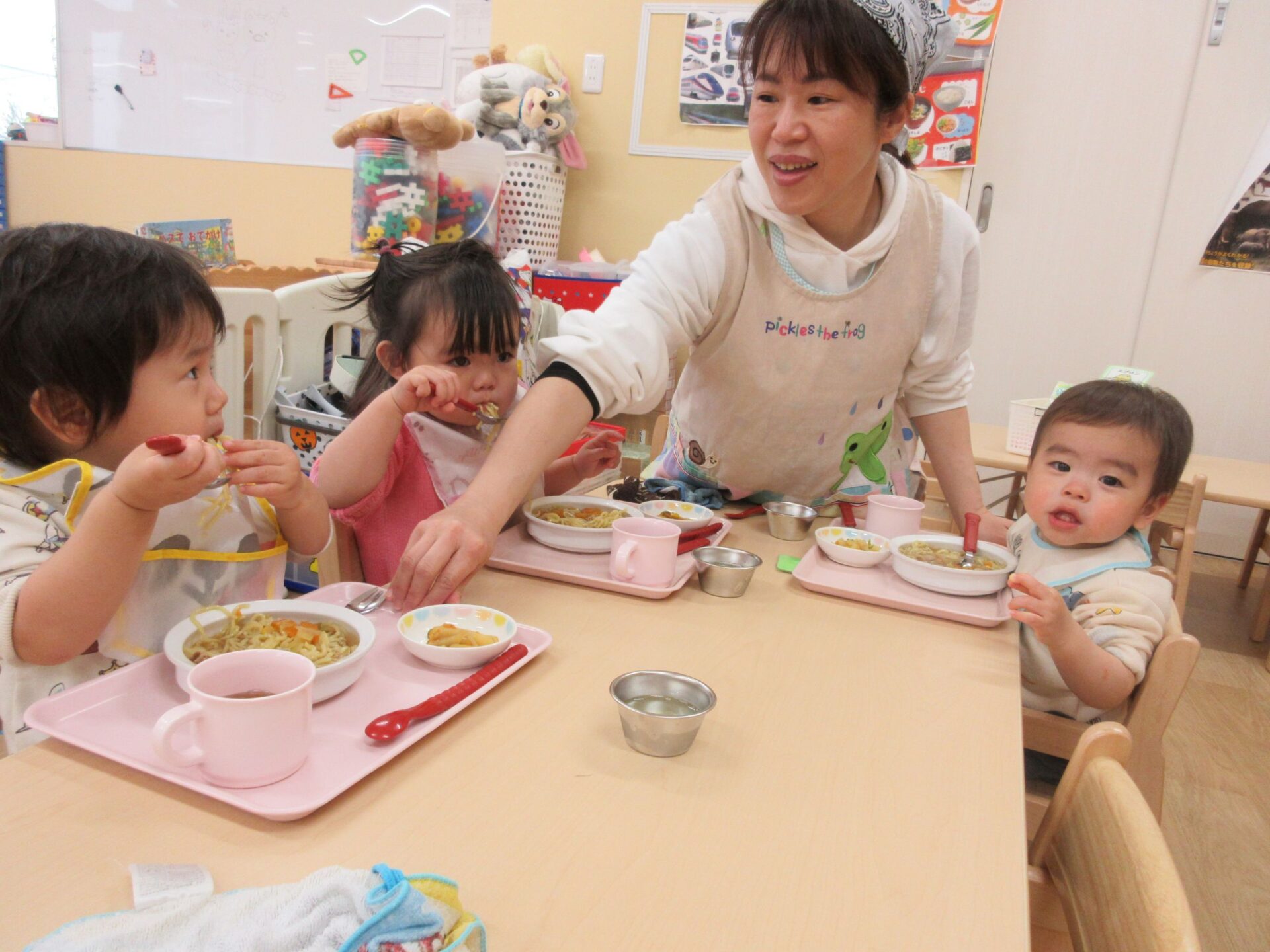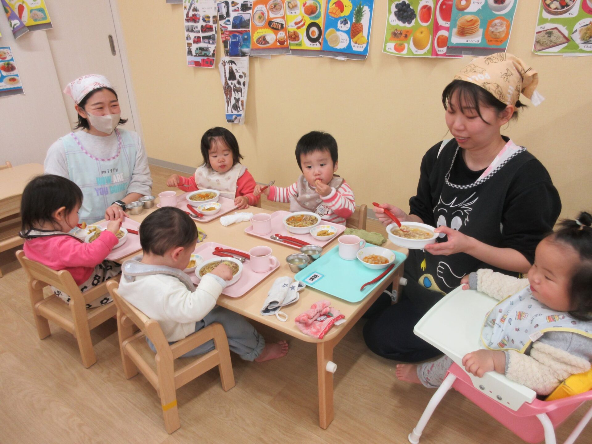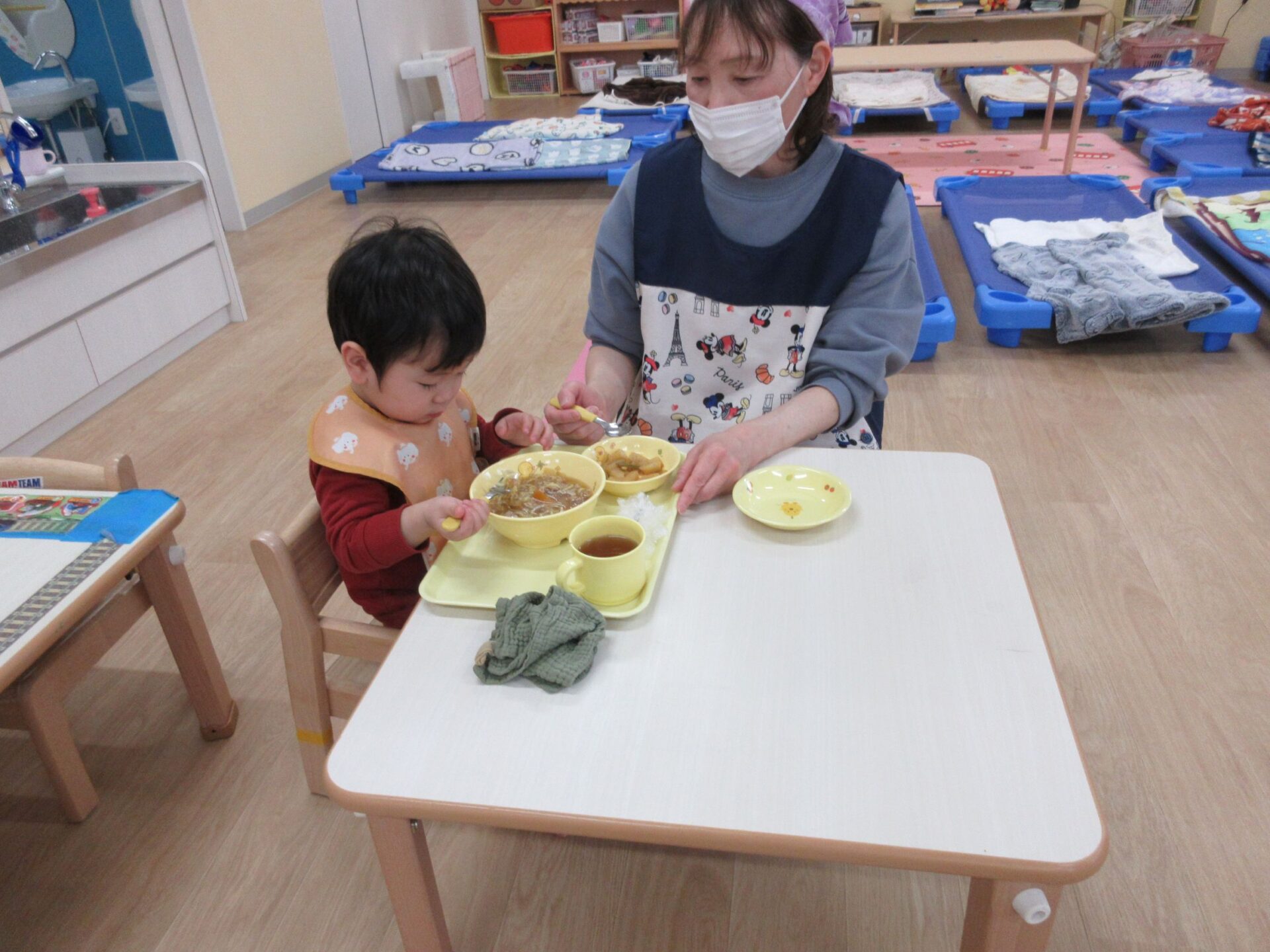 2025.03.11 お知らせ ブログ もうすぐ進級♪(うみ組、だいち組) 早いもので、もう3月ですね。今日は、うみ組さんはだいち組の保育室へ、だいち組さんはあめ組の保育室で給食を食べてみましたよ。 少し大きい机と椅子です!いつもの場所とは違うのでちょっとドキドキ! ラーメン、おいしいな♪ 4月からは、2歳あめ組になって、このお部屋ですごしますよ。楽しみですね。 0歳うみ組さんは、1歳だいち組の保育室で給食です。木の椅子が、ちょっと大きいかな。 みんな、上手に食べていて素晴らしいですね! フォークで上手に食べれますよ!すごいですね。つるつる~♪ もうすぐみんなは、1歳だいち組さん♪楽しみですね! 一覧へ戻る