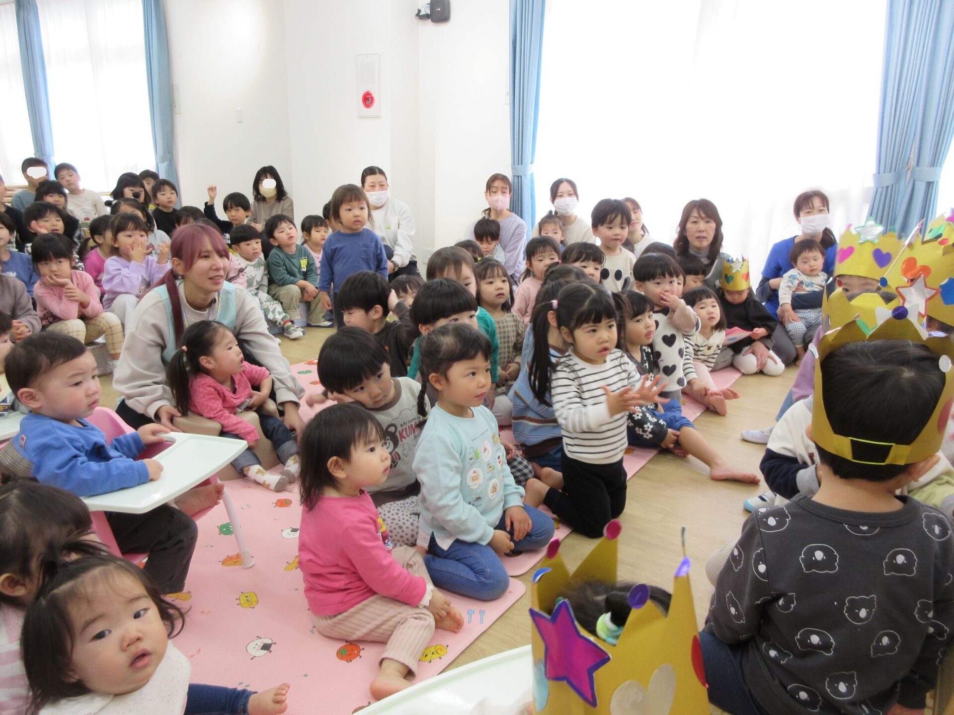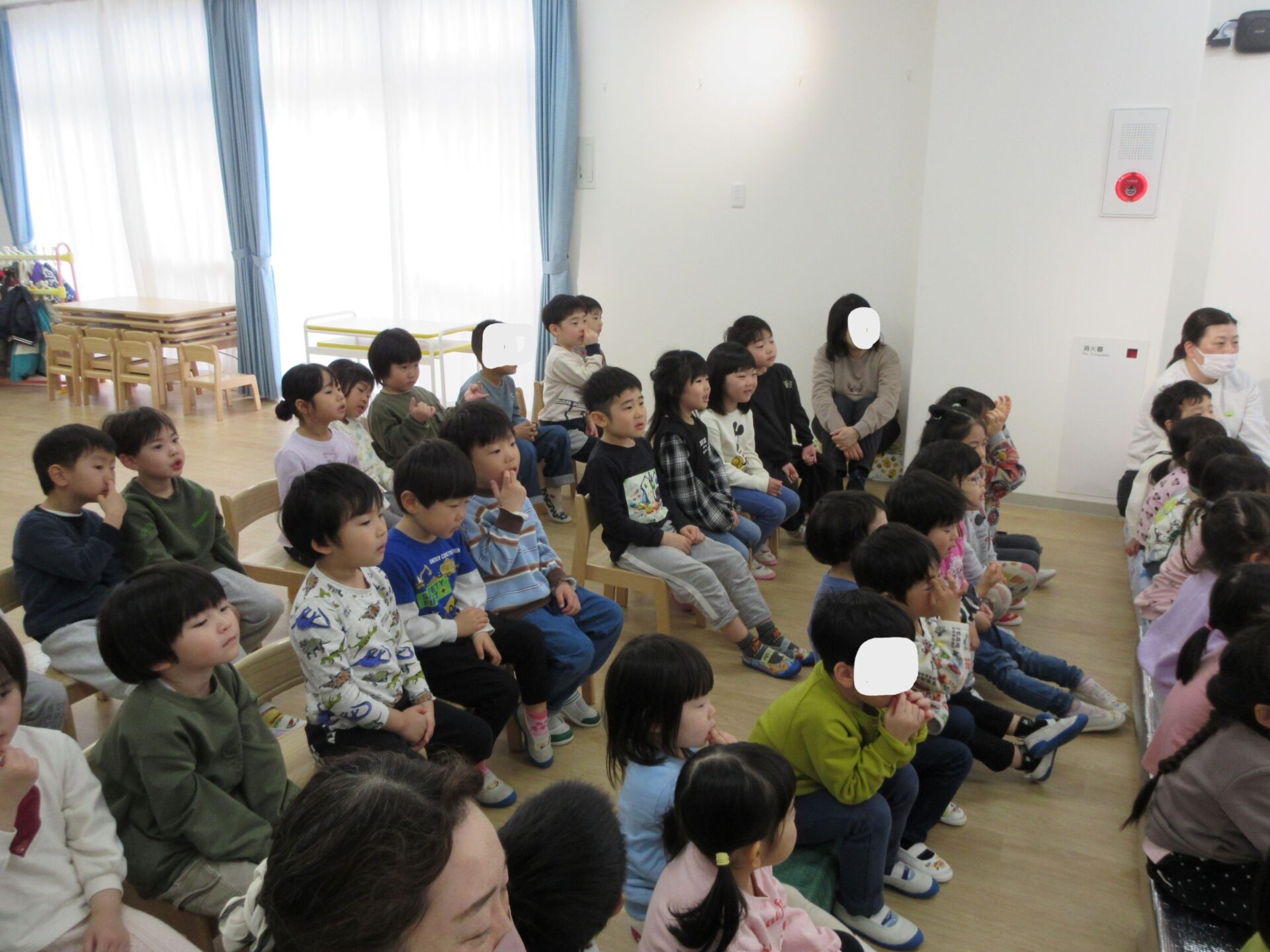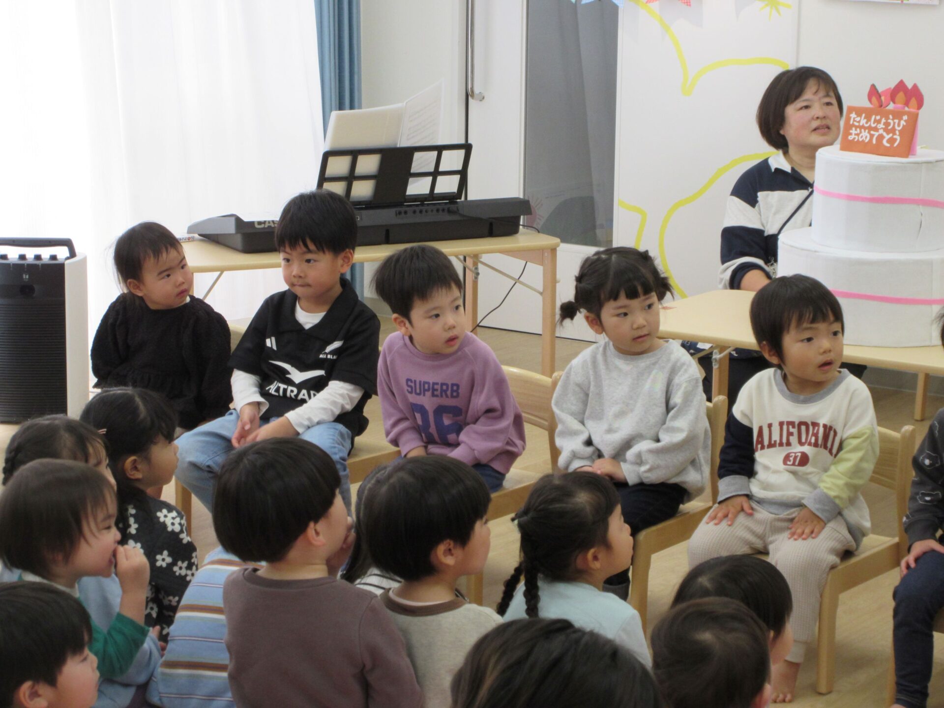 3月13日、3月のお誕生会をしました。今月、お誕生日のお友だちが皆の前に座りますよ。みんな、賢く座っていますね!