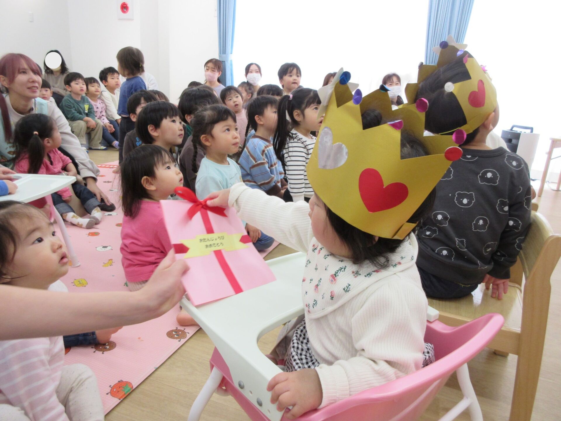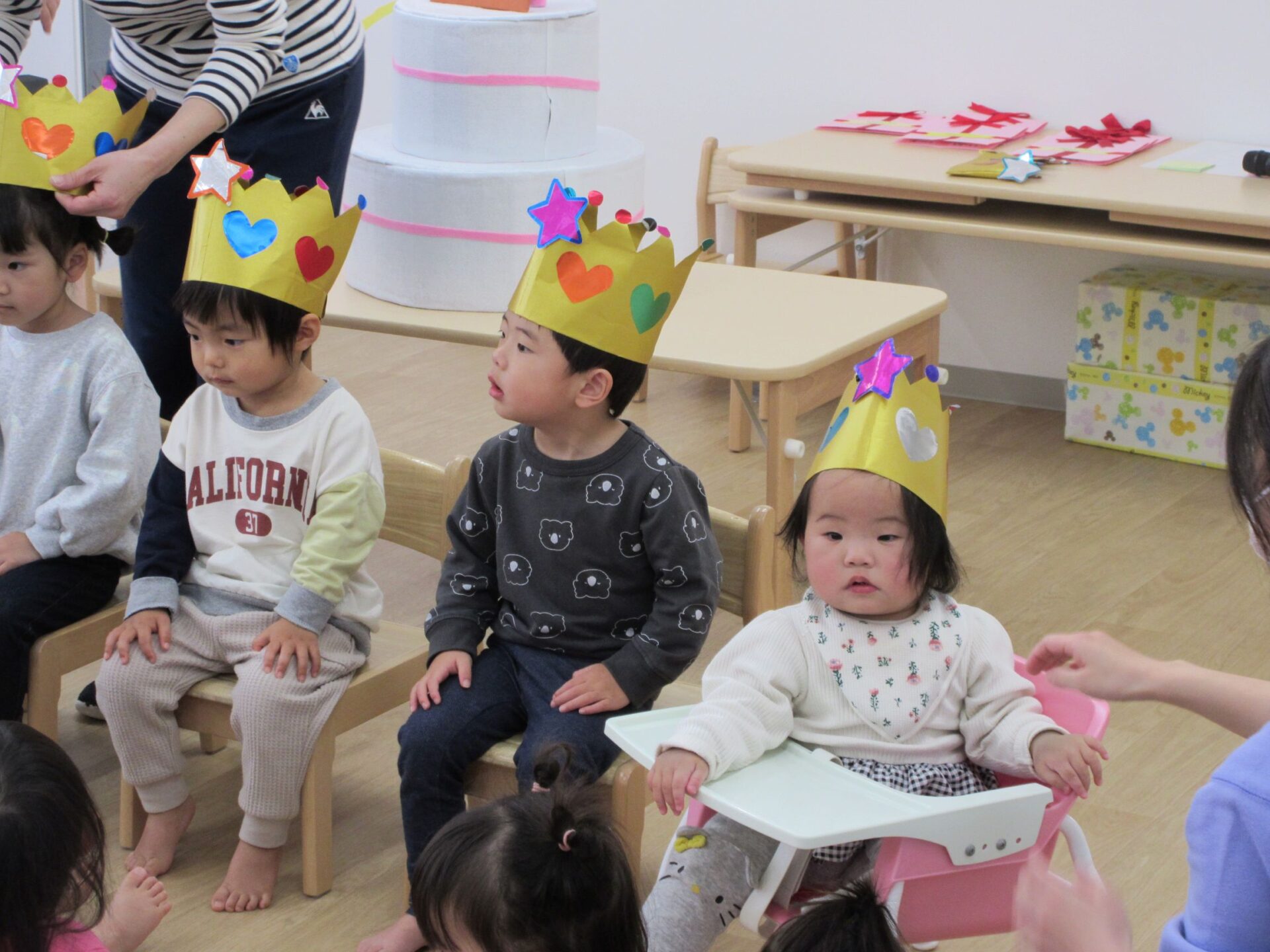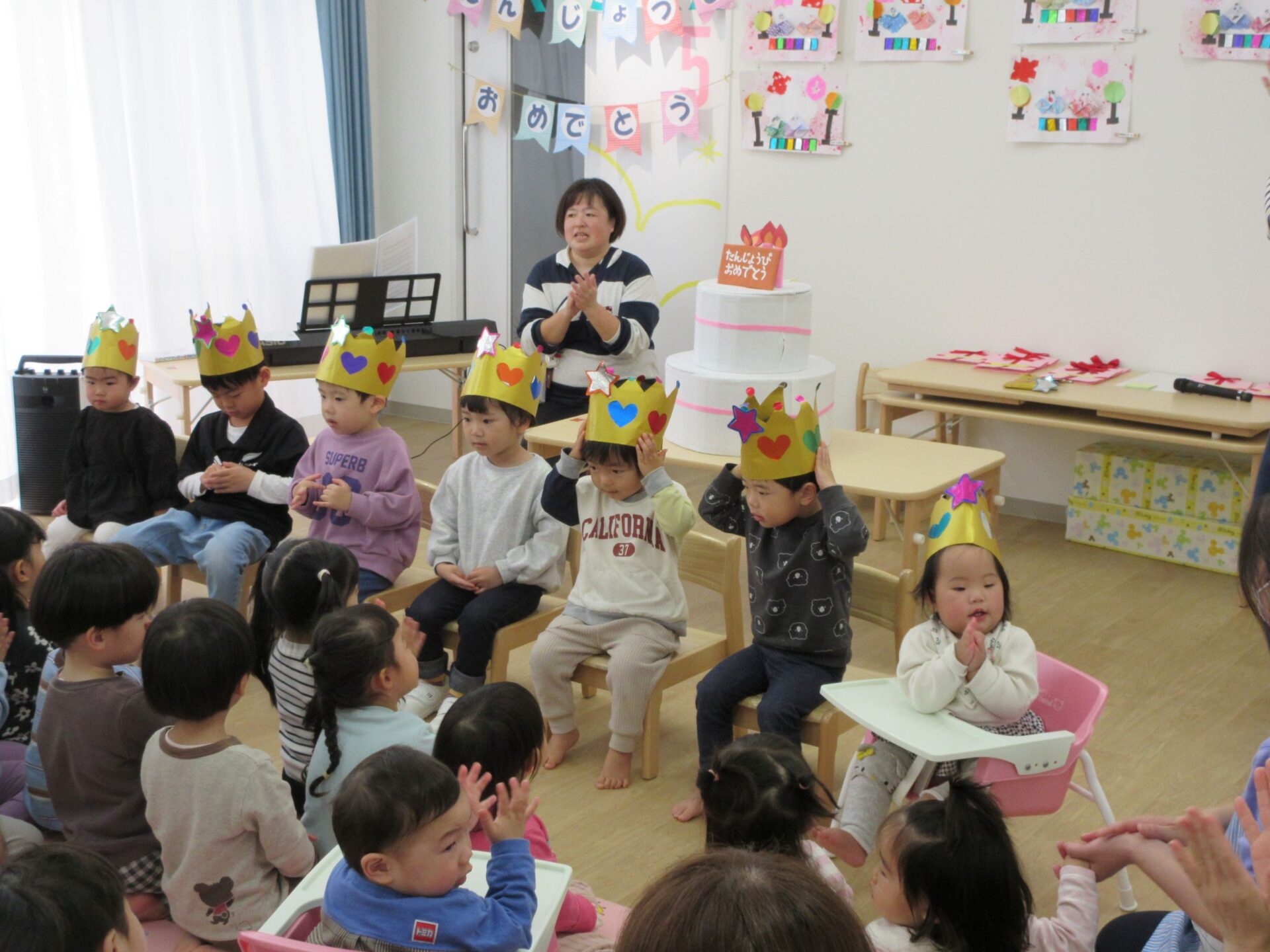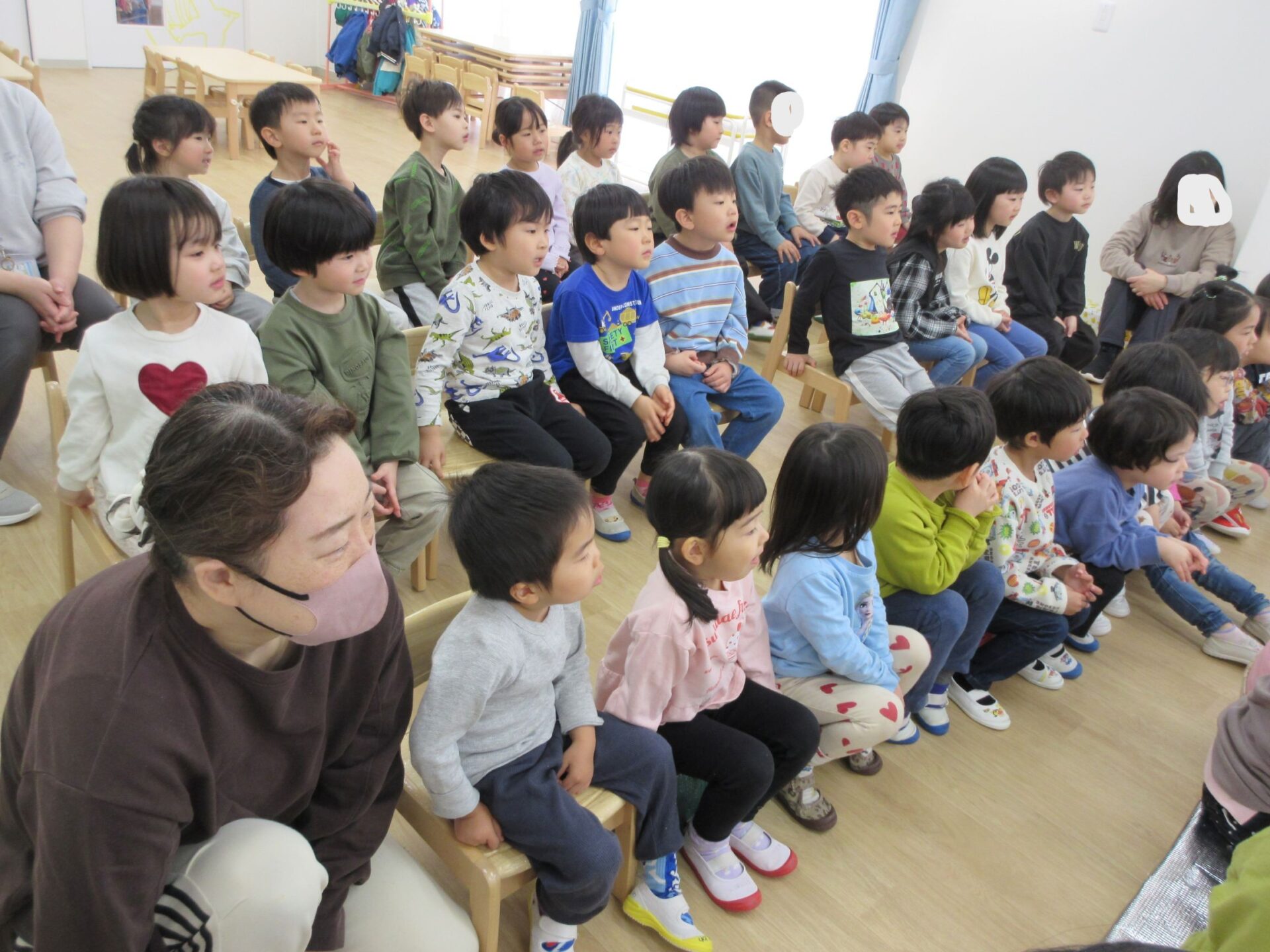 3月13日、3月のお誕生会をしました。今月、お誕生日のお友だちが皆の前に座りますよ。みんな、賢く座っていますね!