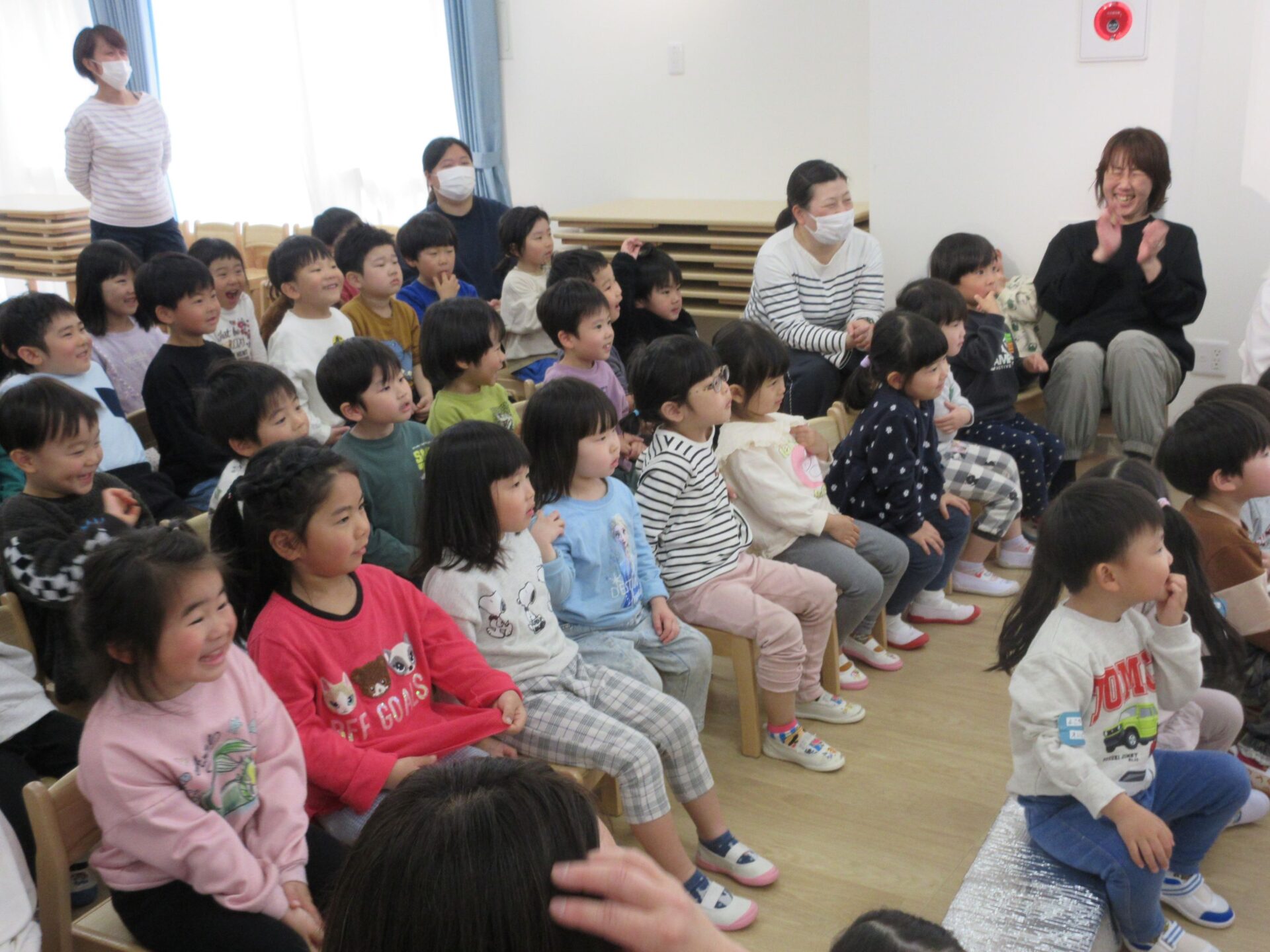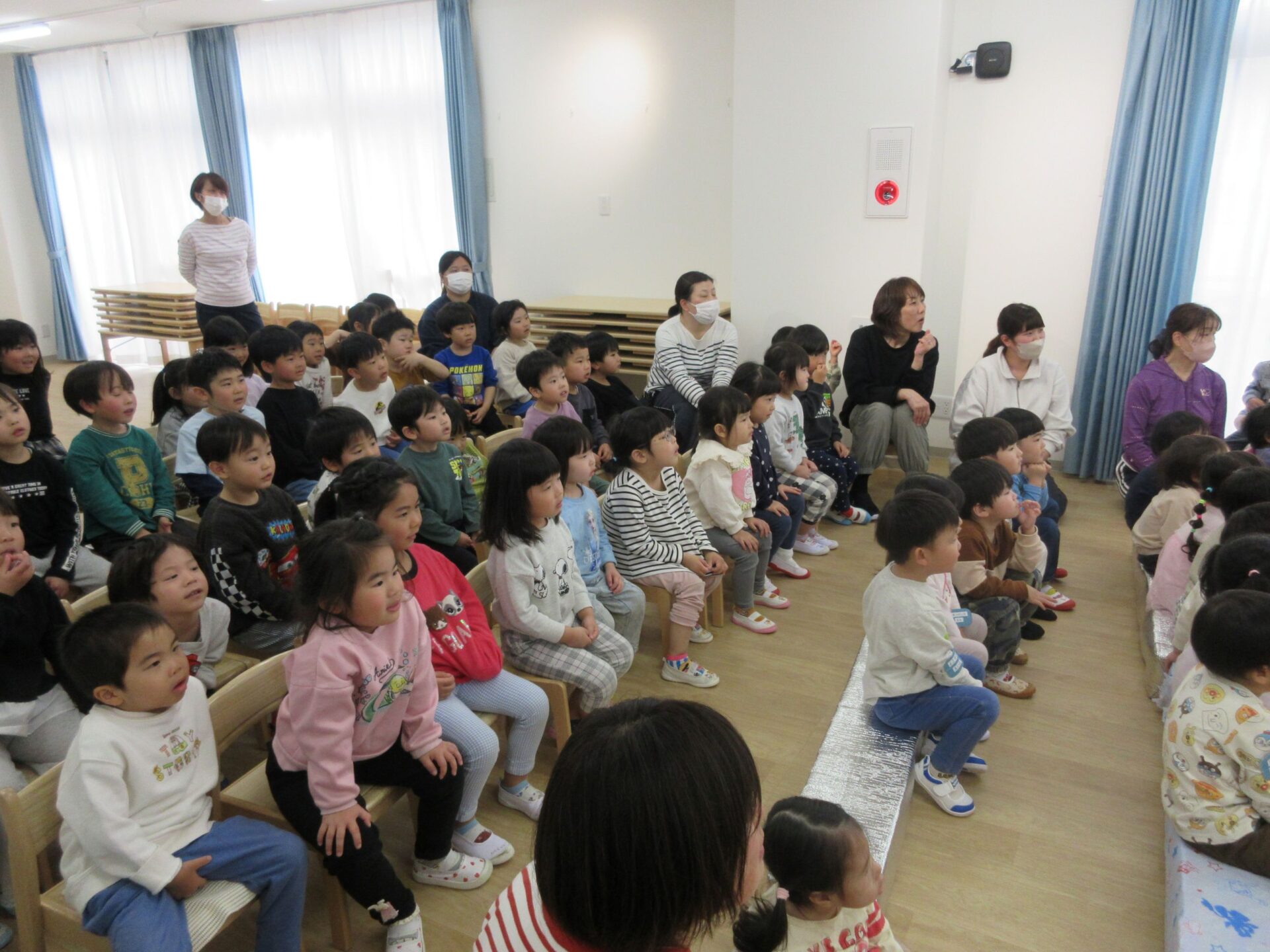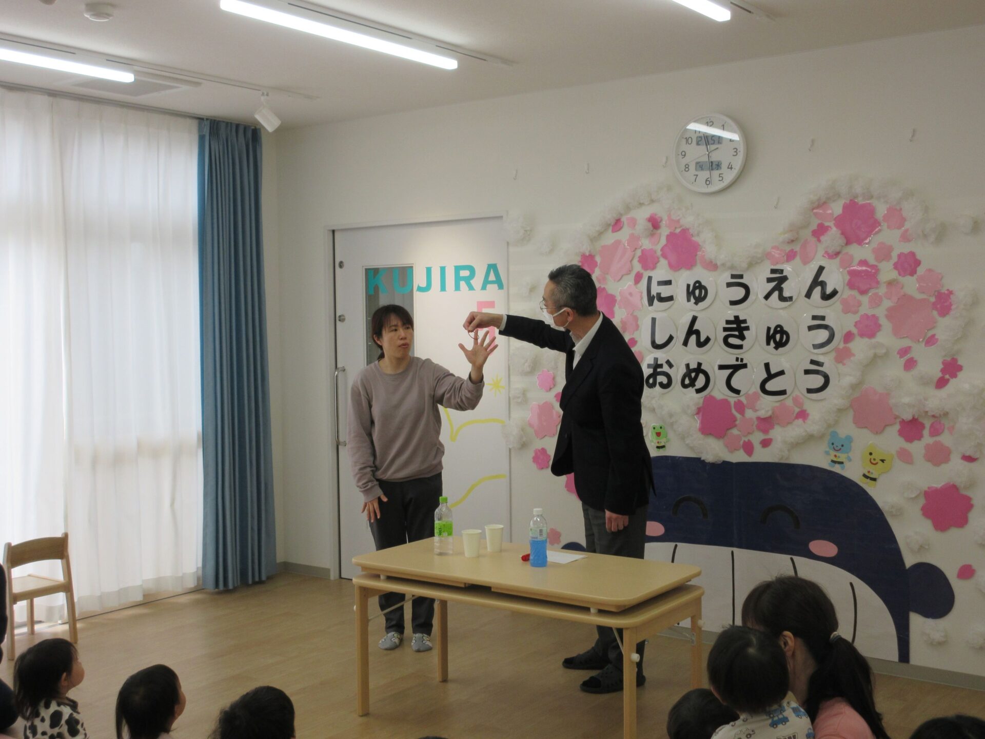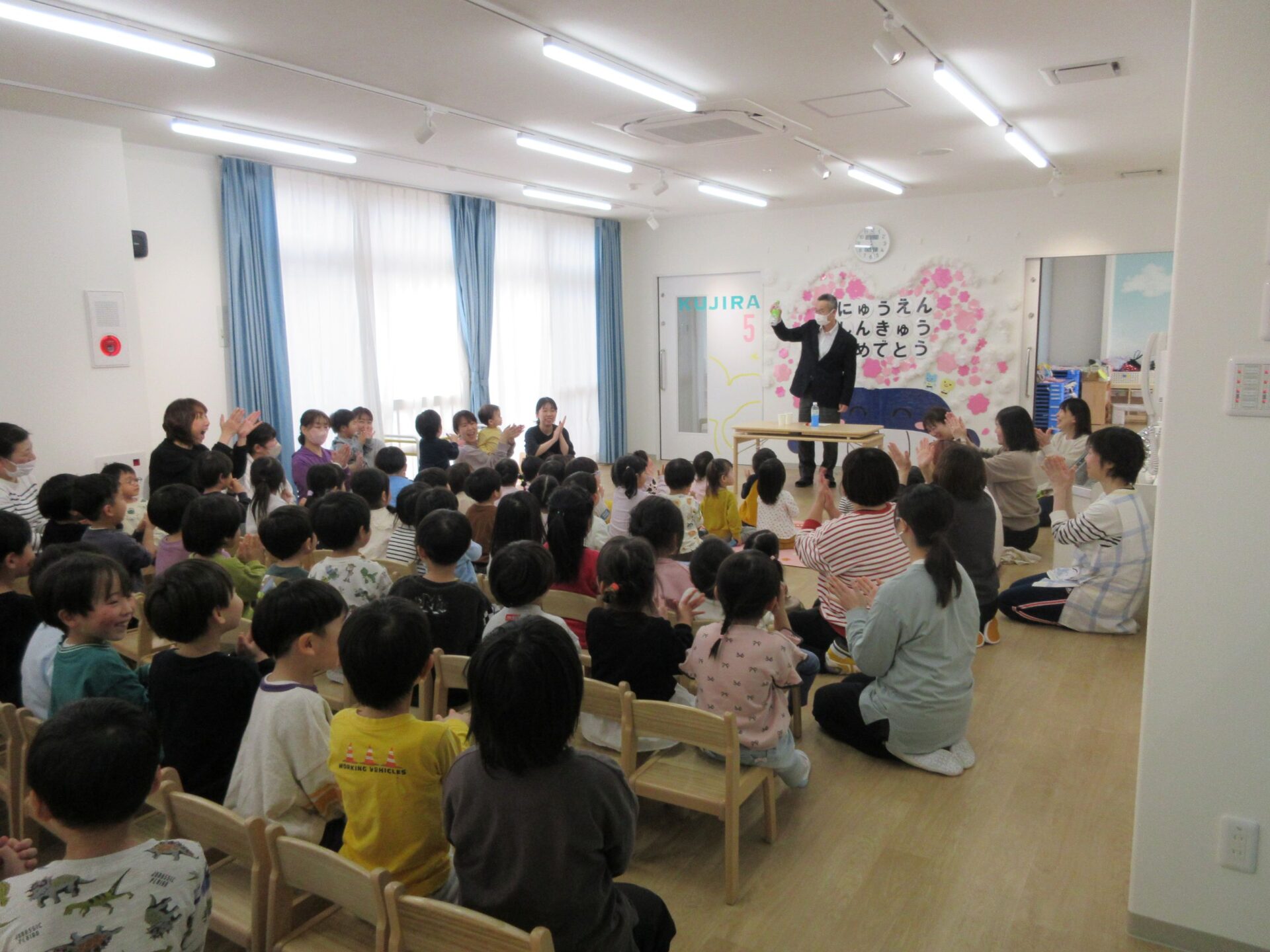 2日(水)は、2階ランチルームで進級式を行いました。新入園のお友だちは慣らし保育で降園したため、在園児だけでした。園長から、新しいクラスの先生の紹介がありました。それが終わったらお楽しみコーナー。園長の手品です。何をするんだろう?
